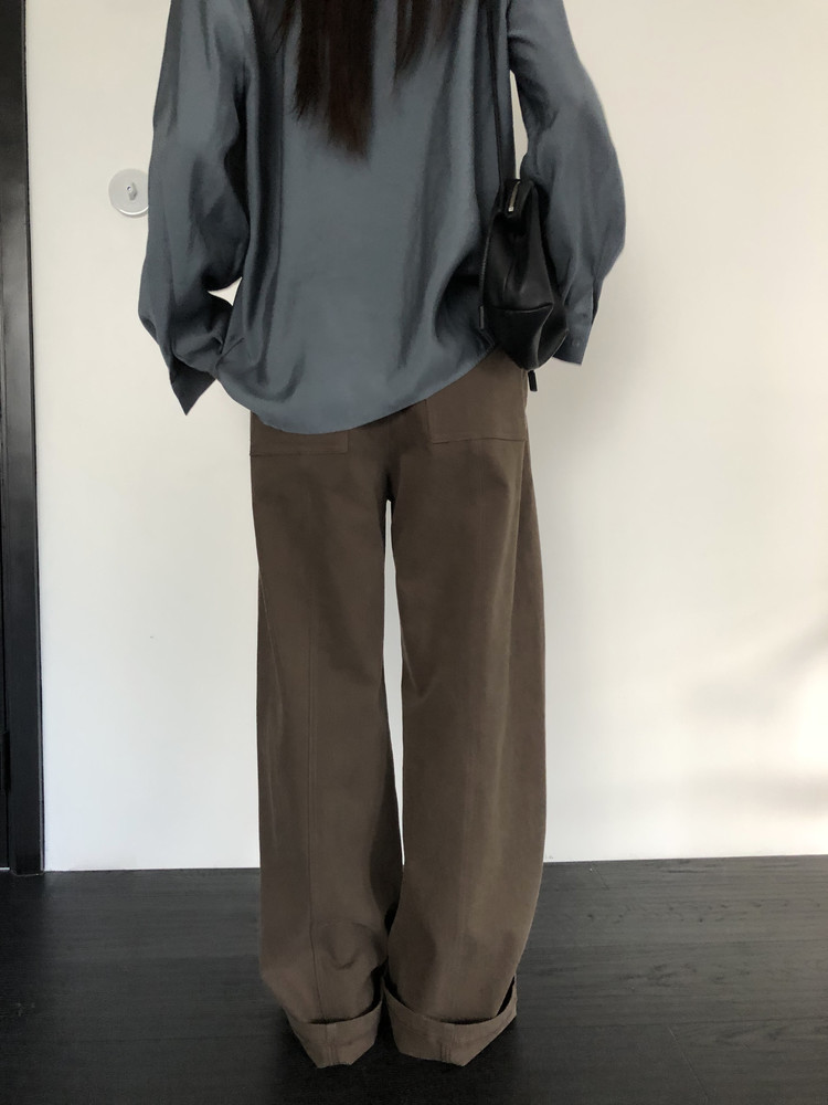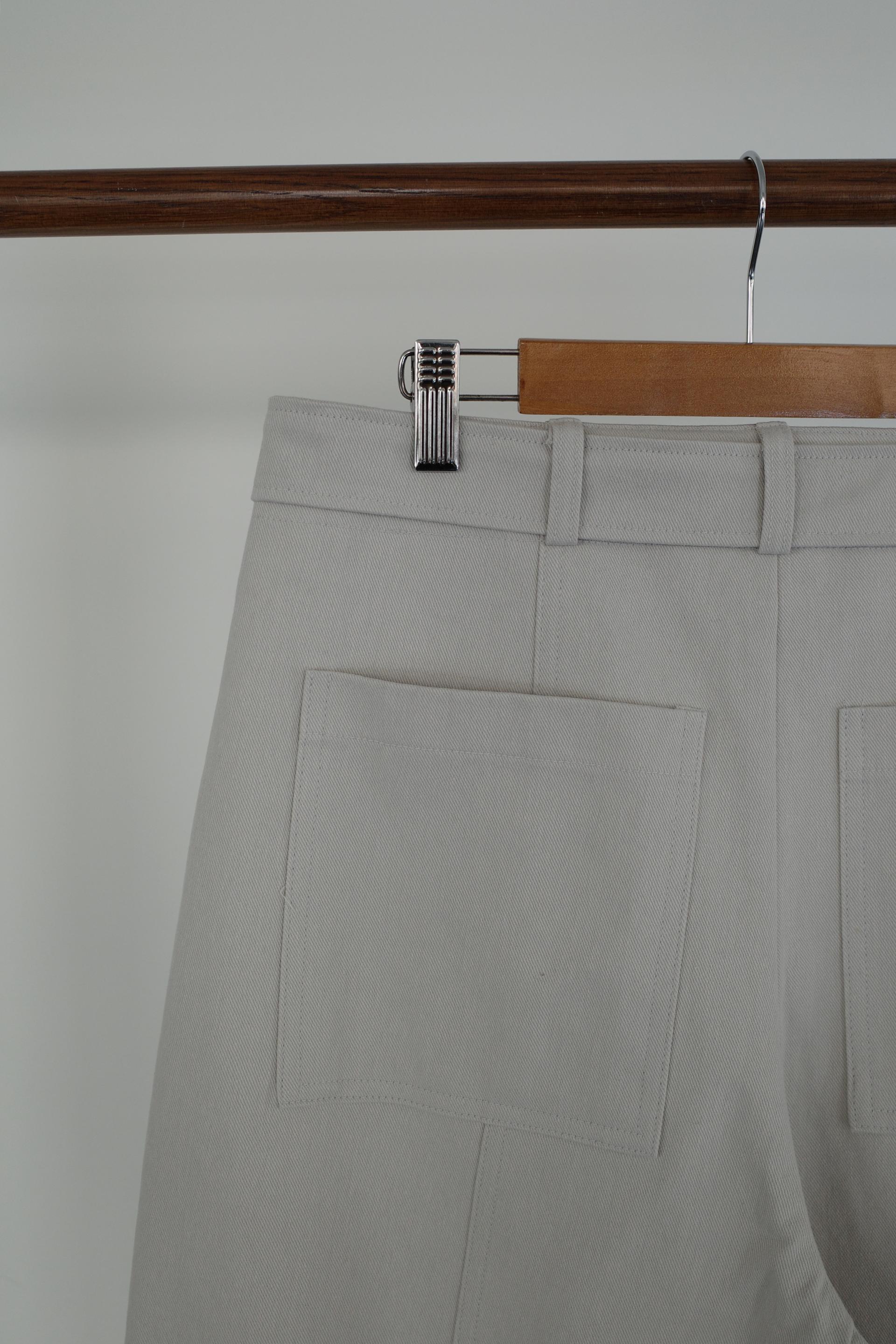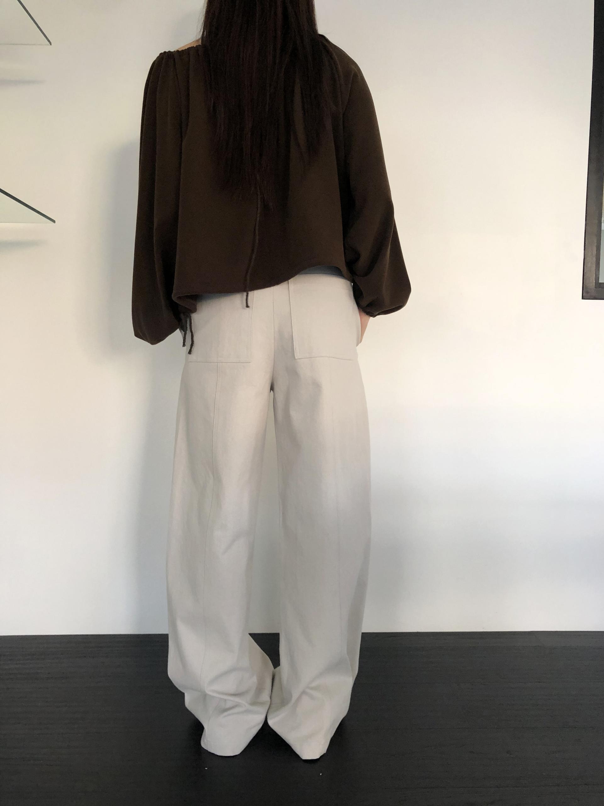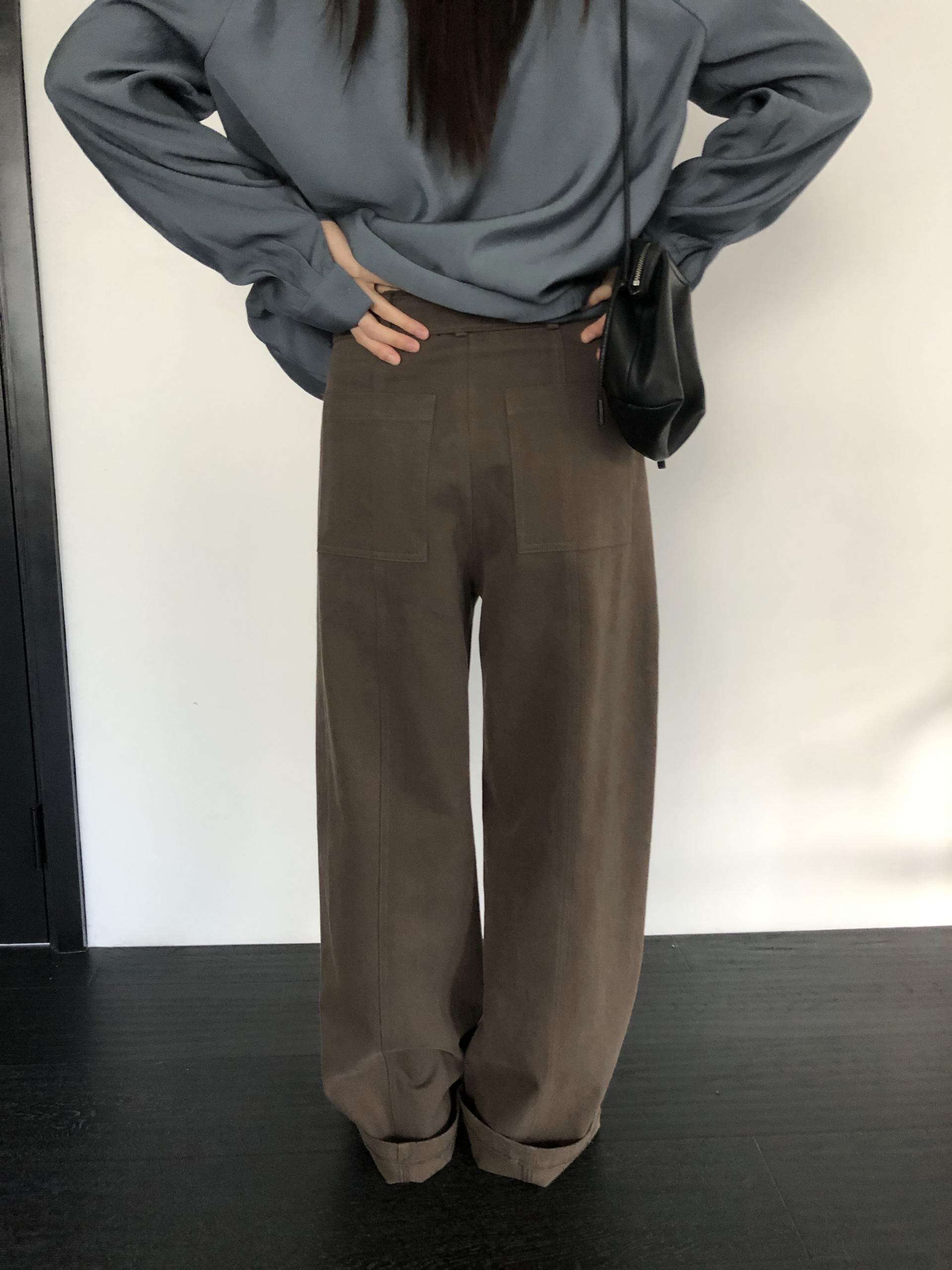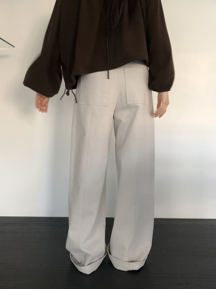 프론트에 절개선이 들어가 자연스러운 구조감이 느껴지면서, 와이드한 핏이 투박하지 않고 예쁘게 연출됩니다. 뒷라인 역시 큼직한 포켓을 따라 길게 떨어지는 절개 라인으로 다리가 더욱 곧고 길어보이며 깔끔해요.