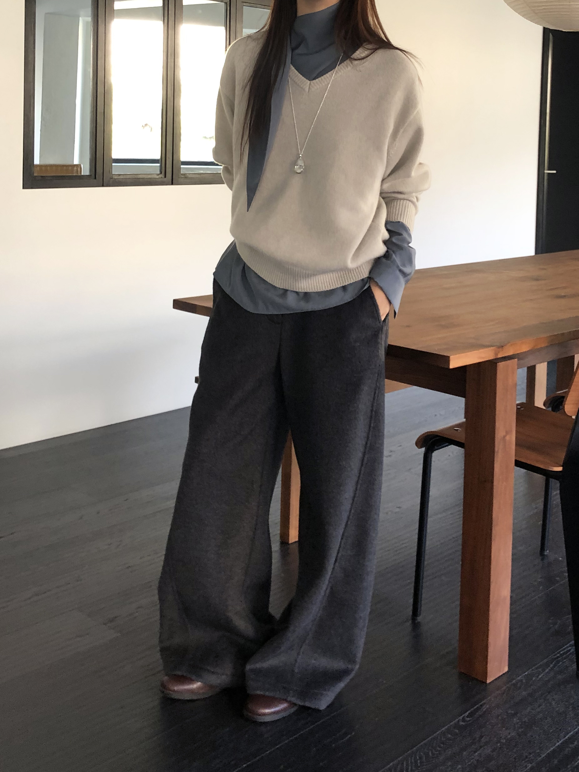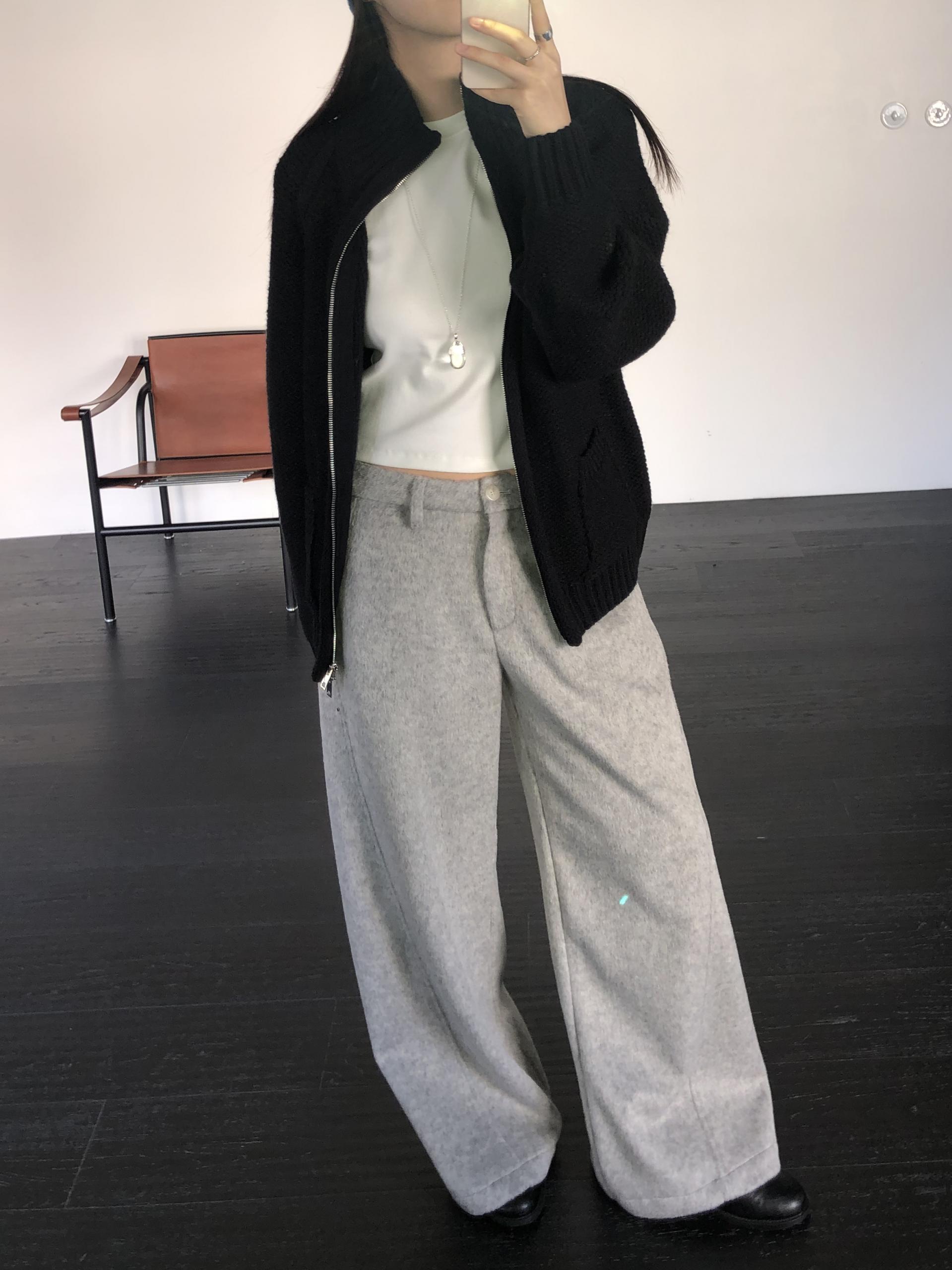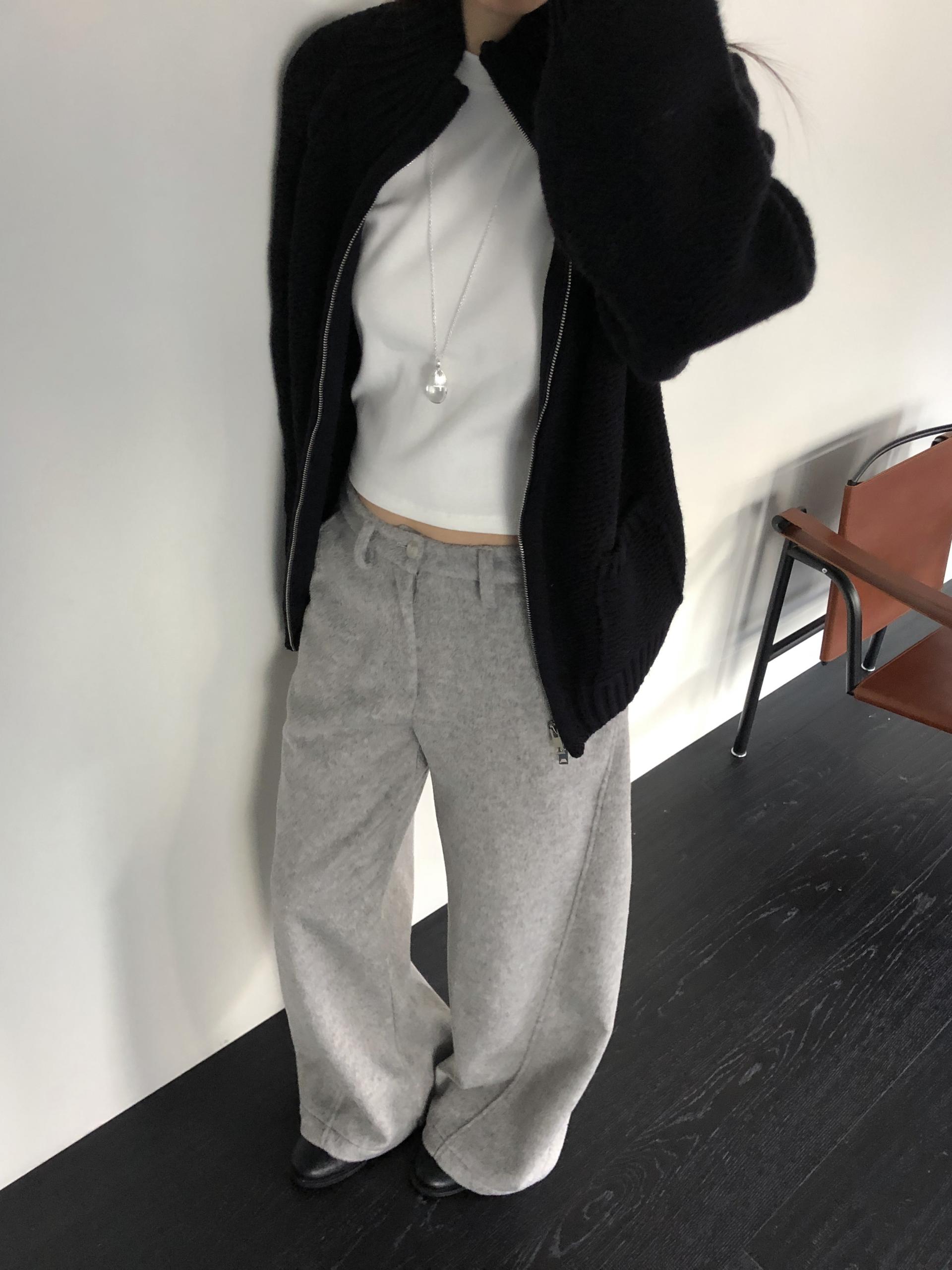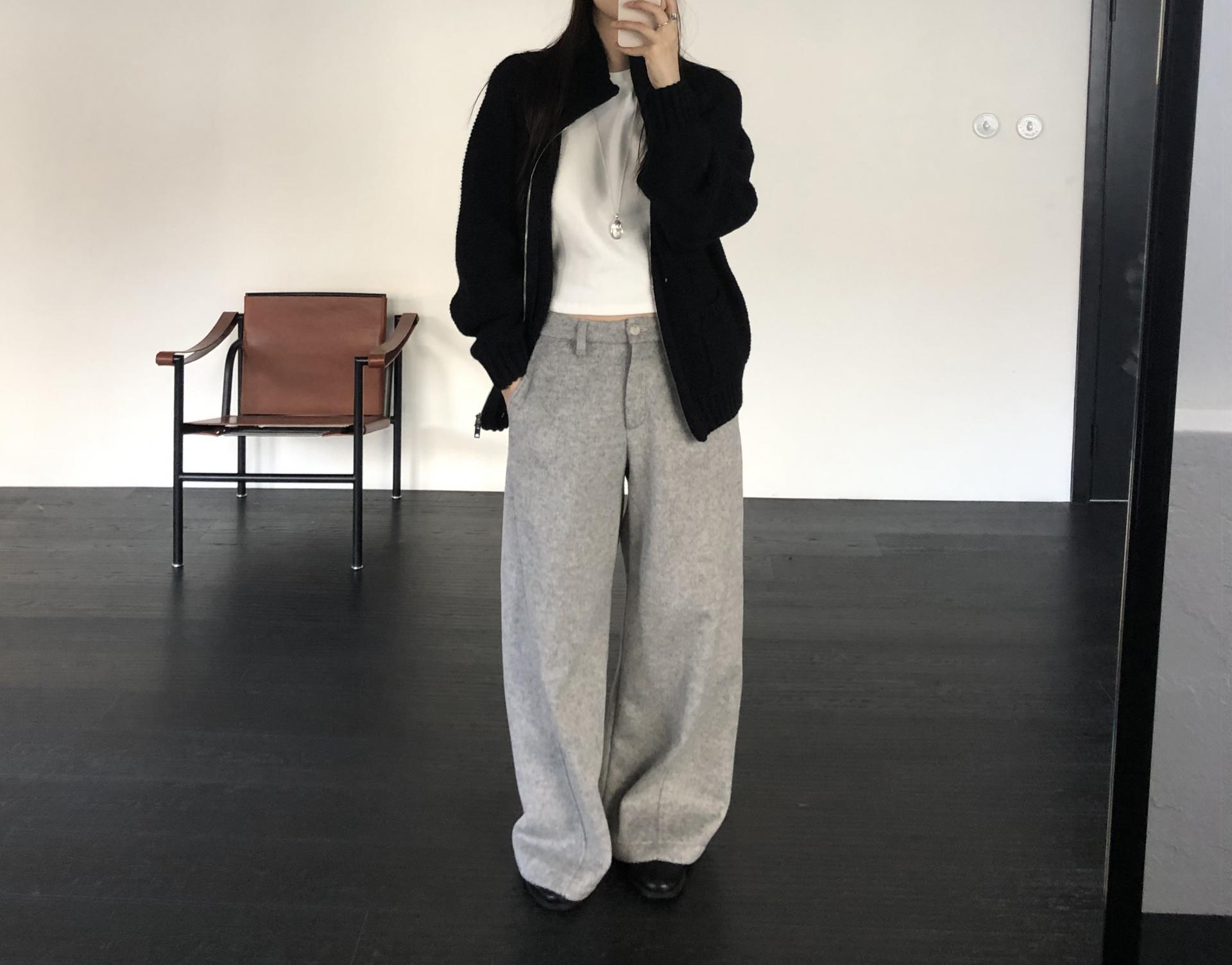 와이드 팬츠임에도 안쪽 사선으로 들어오는 절개라인 디테일 덕분에 실루엣이 과하게 부해보이거나 밋밋하지 않습니다. 와이드한 멋은 살리면서도 전체 균형을 깔끔하고 멋스럽게 정돈해줘요.