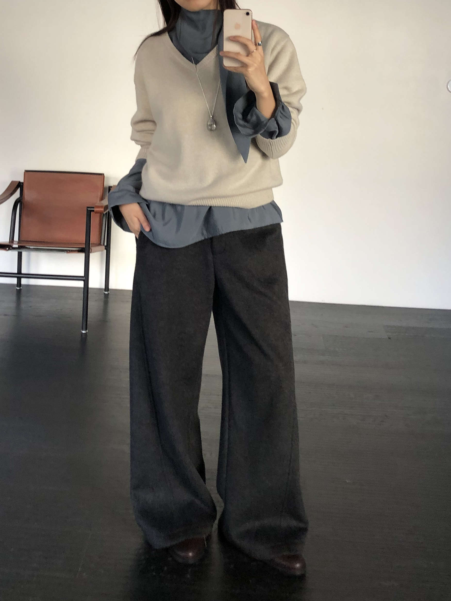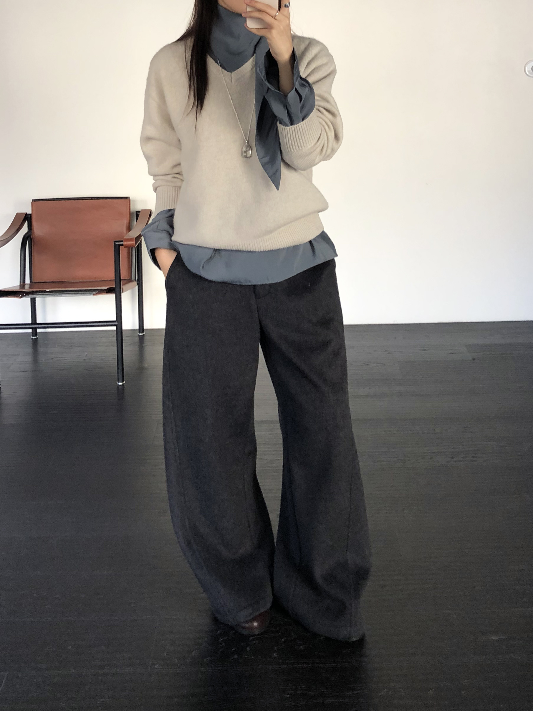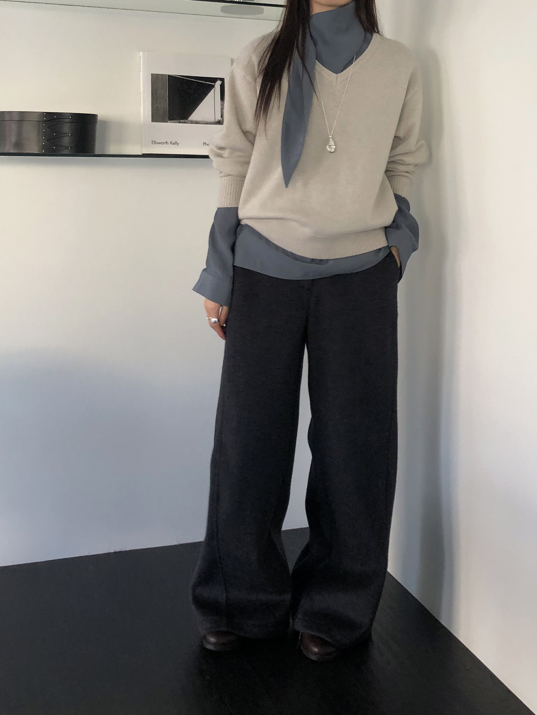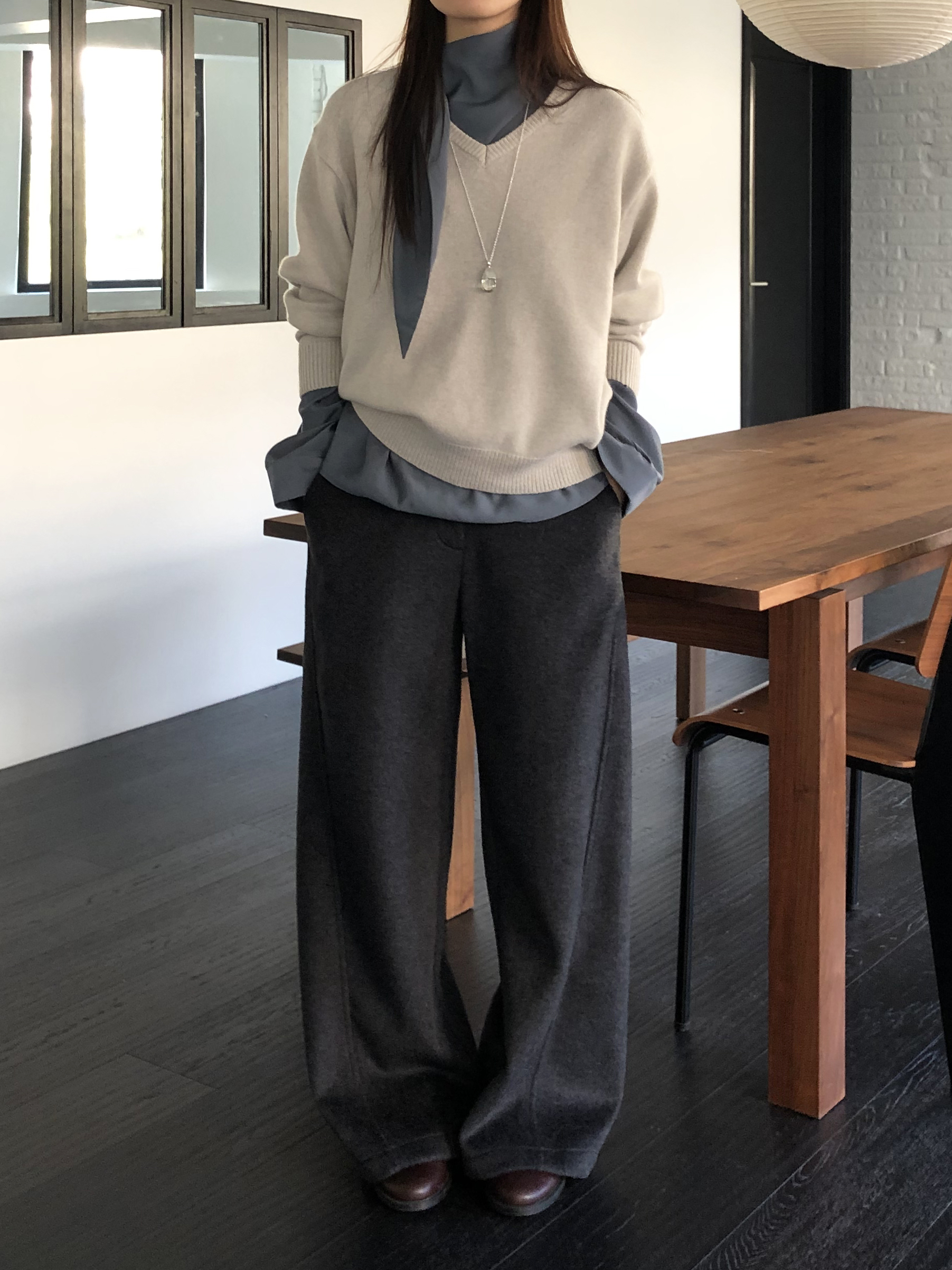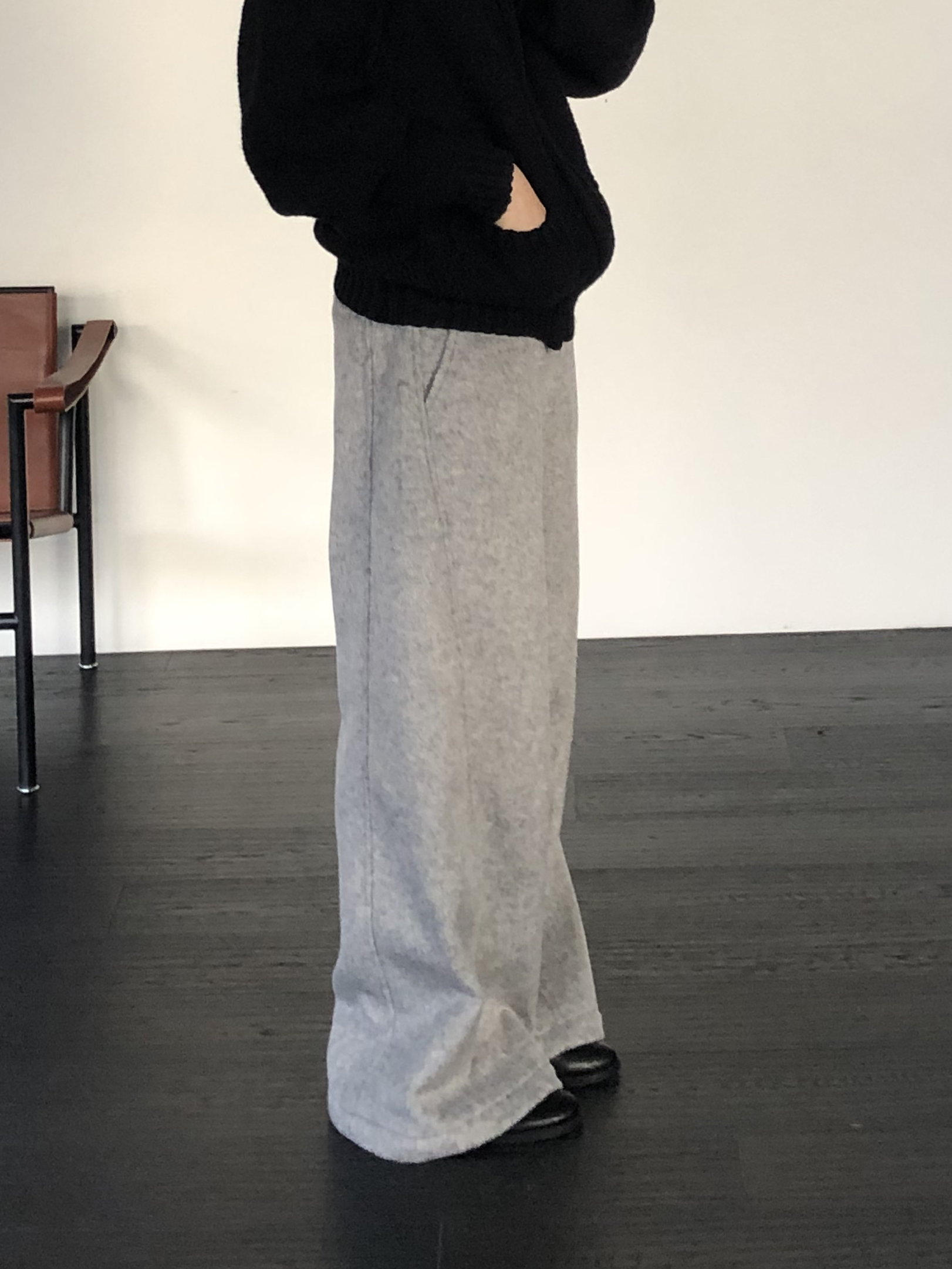 와이드 팬츠임에도 안쪽 사선으로 들어오는 절개라인 디테일 덕분에 실루엣이 과하게 부해보이거나 밋밋하지 않습니다. 와이드한 멋은 살리면서도 전체 균형을 깔끔하고 멋스럽게 정돈해줘요.