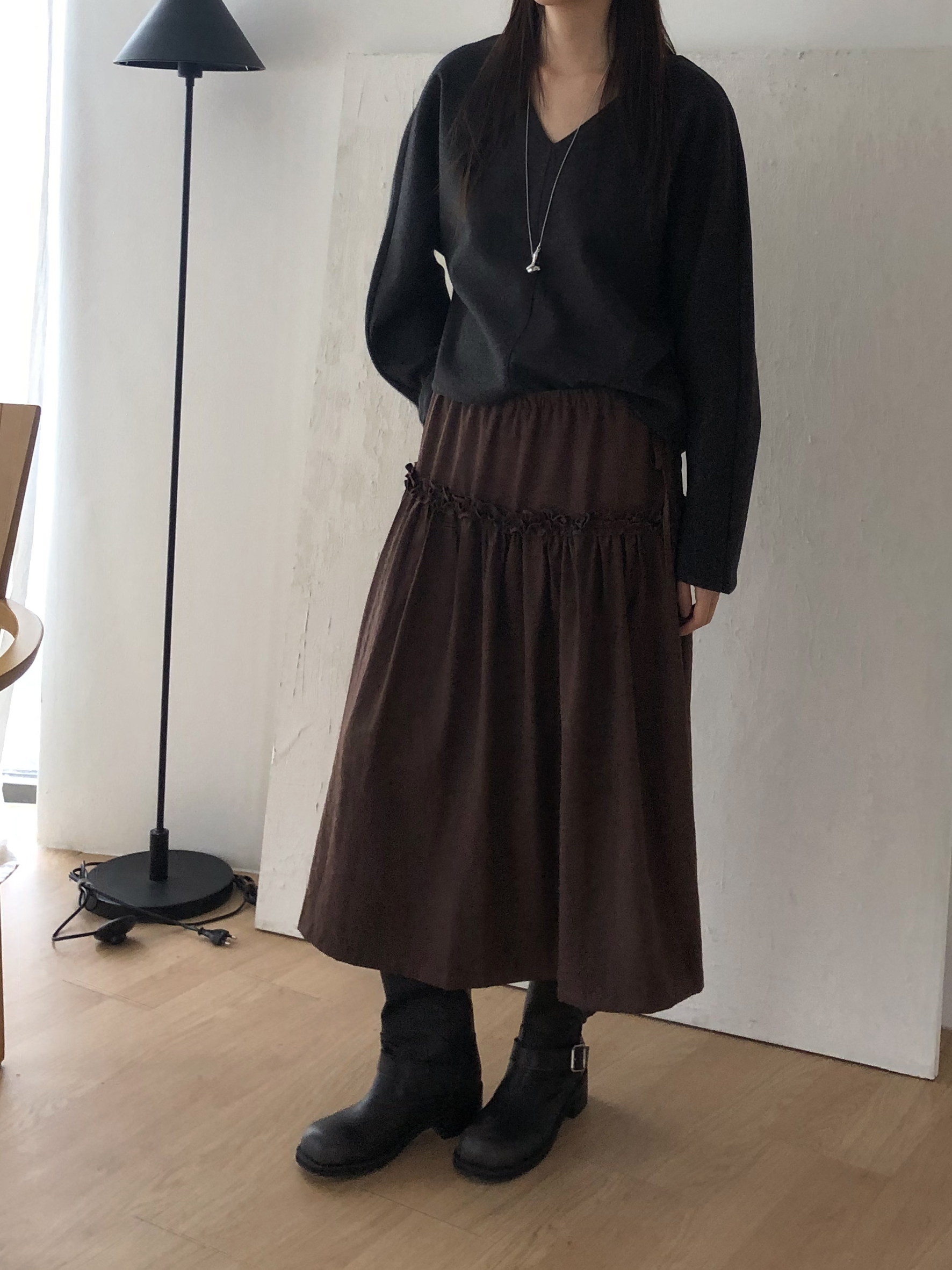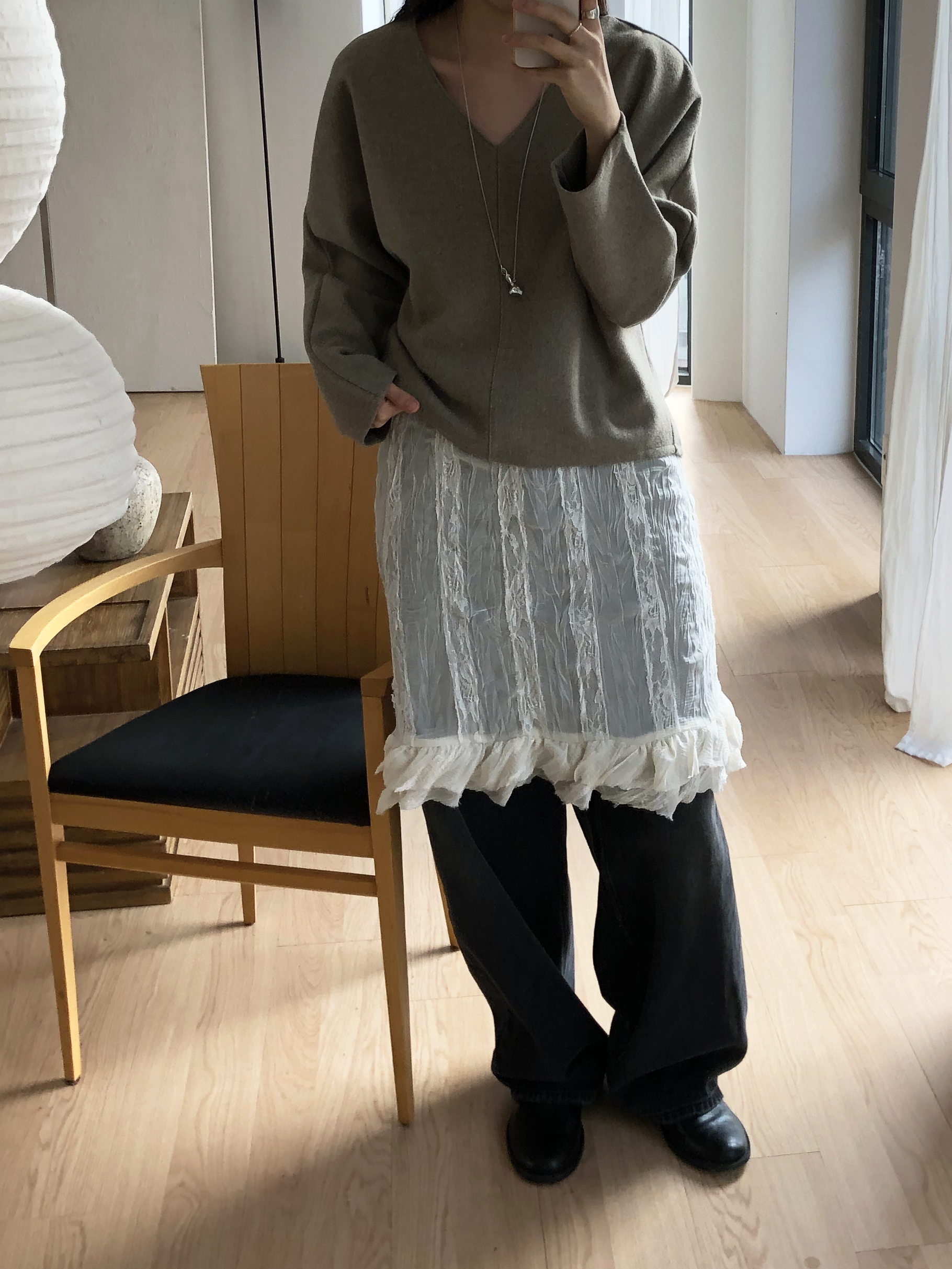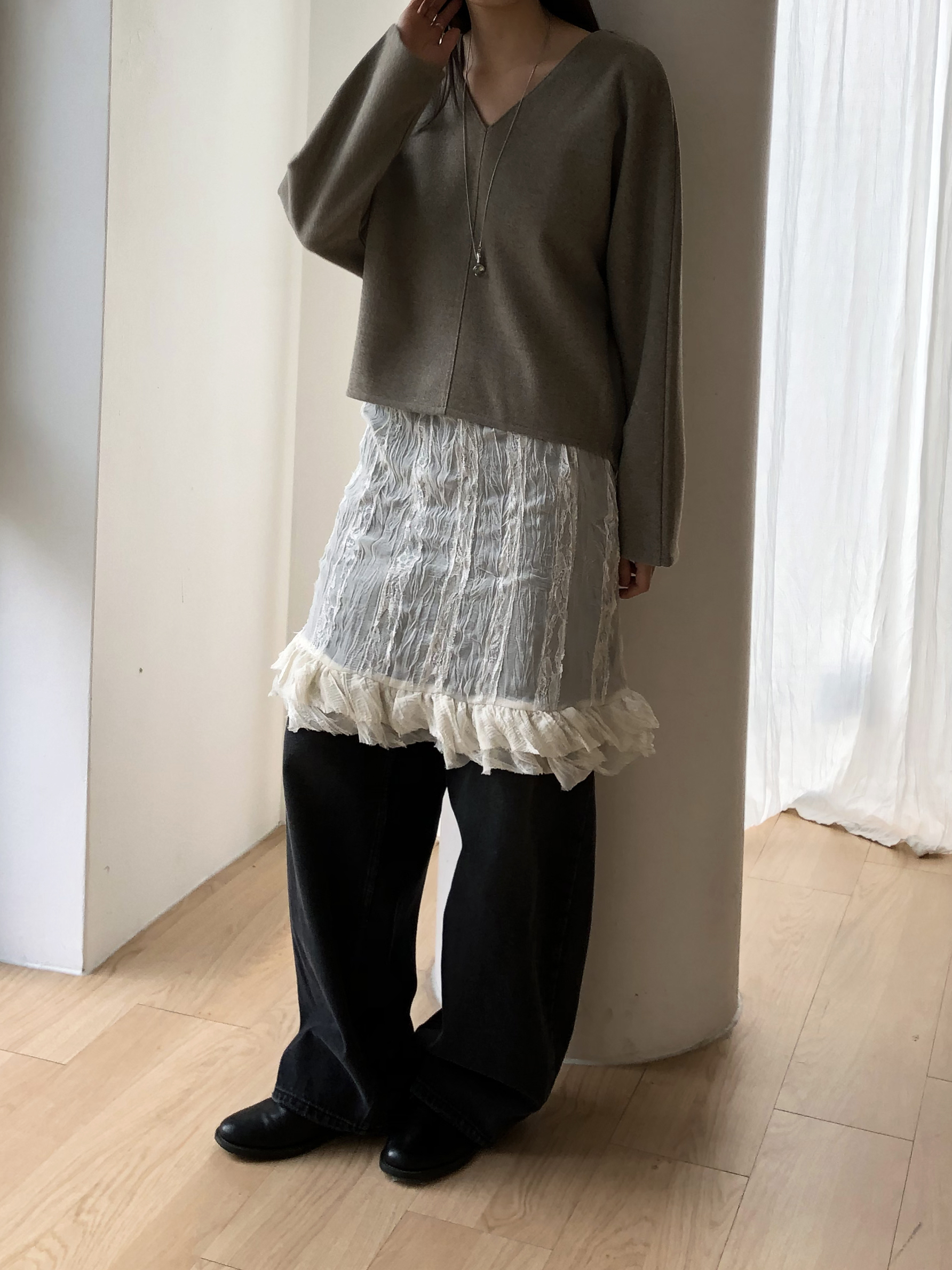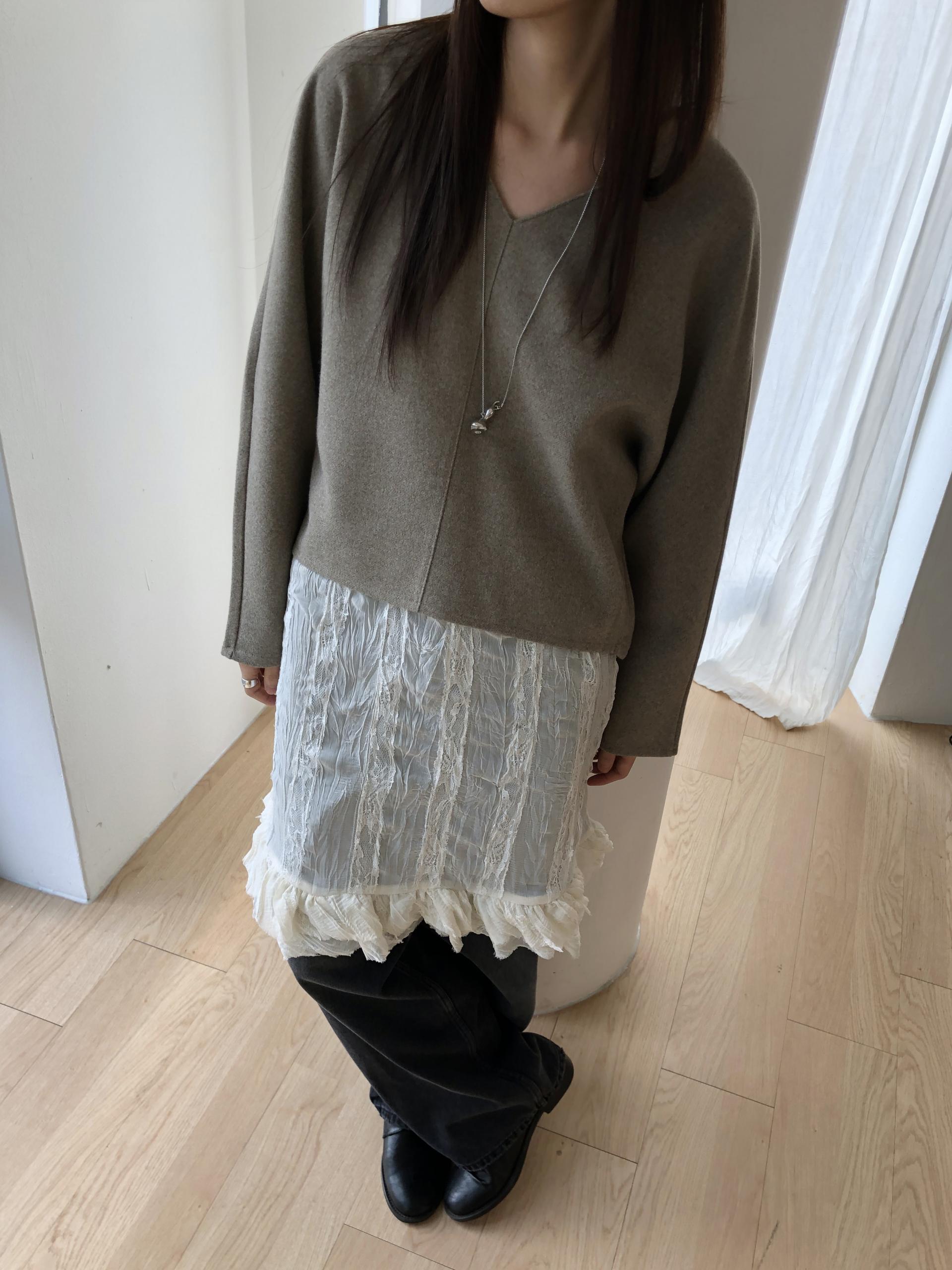 많이 깊지 않은 브이넥이라 격식있는 자리에도 함께하기 좋고, 이너 탑이나 셔츠등을 레이어드 하기에도 좋아요.