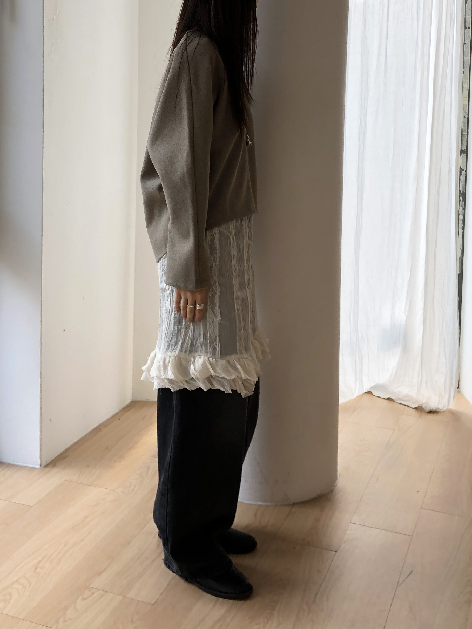 루즈한 가오리핏의 매력이 느껴지며, 소재감 자체는 탄탄한 편이라 축 늘어지지 않고 형태감이 유지됩니다.