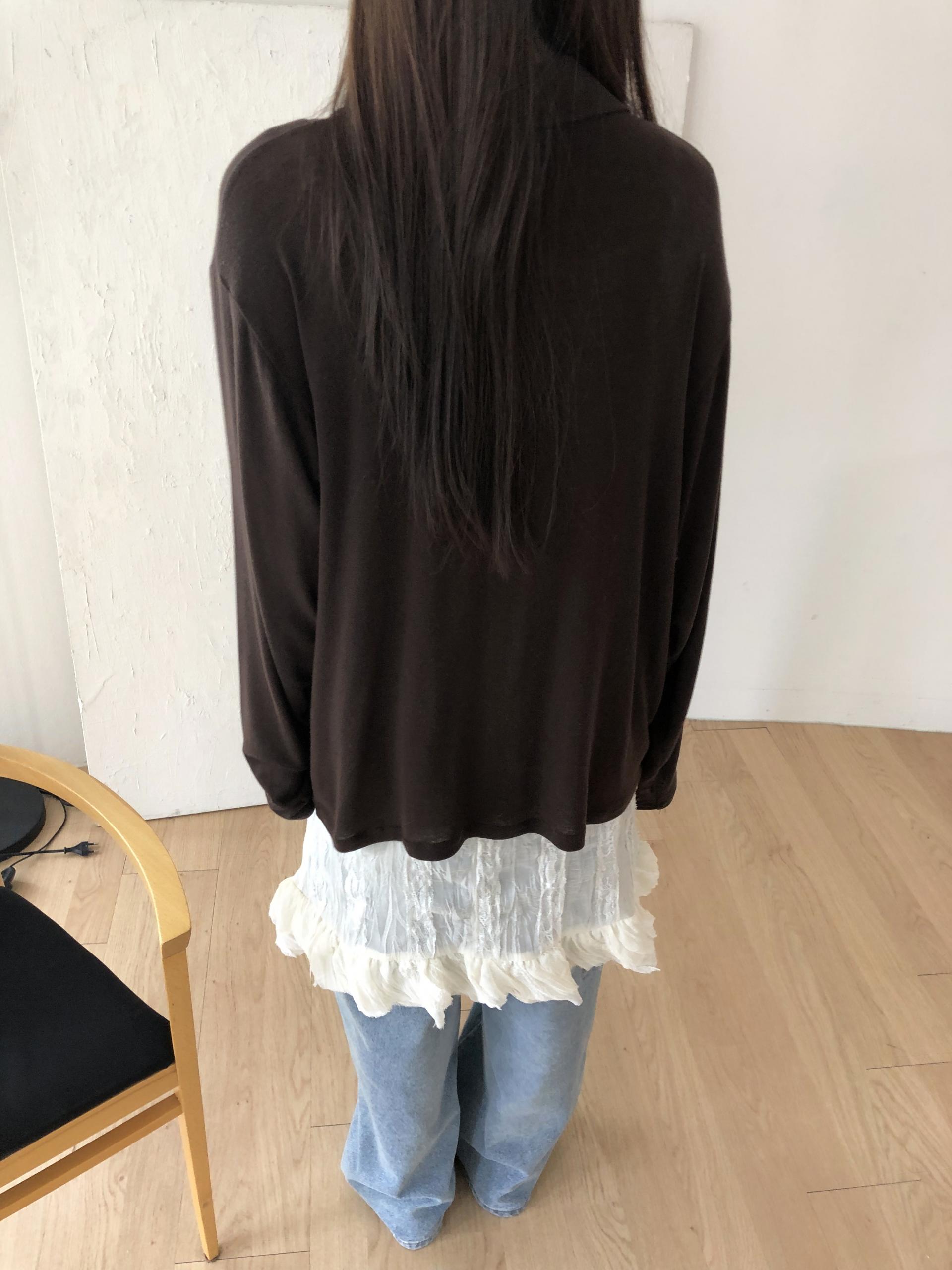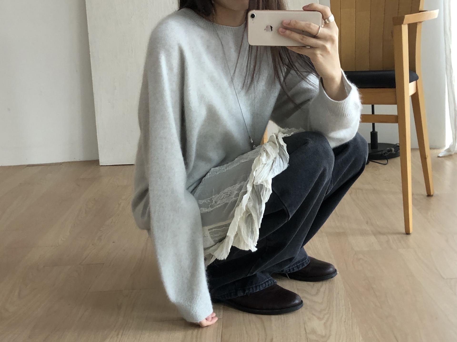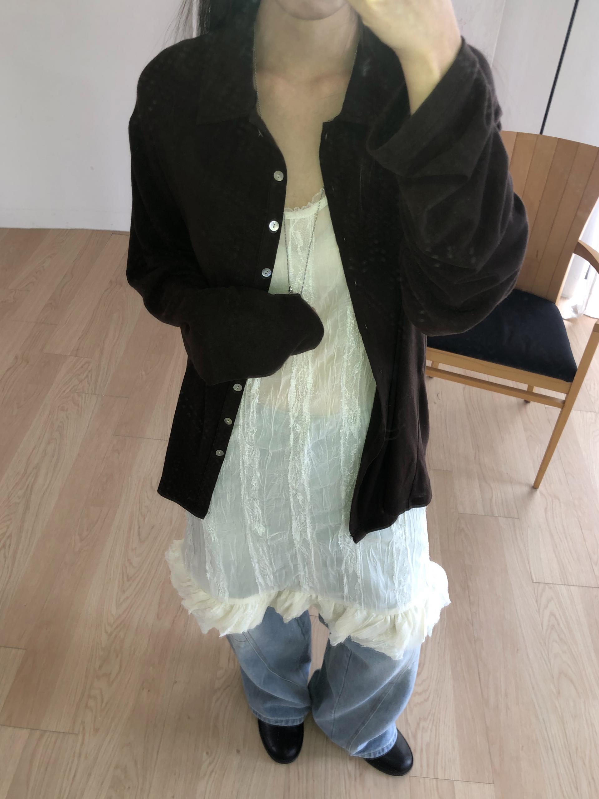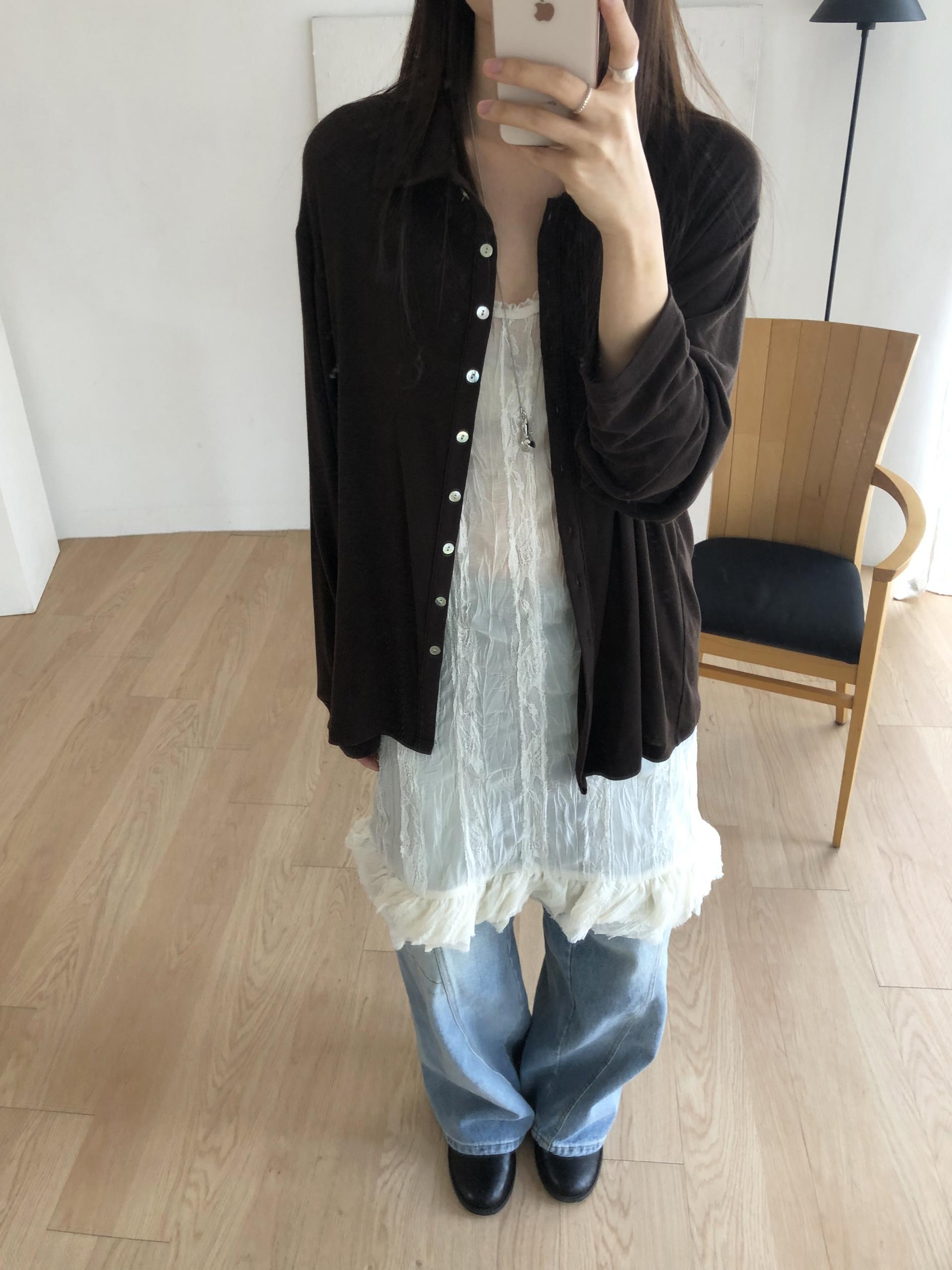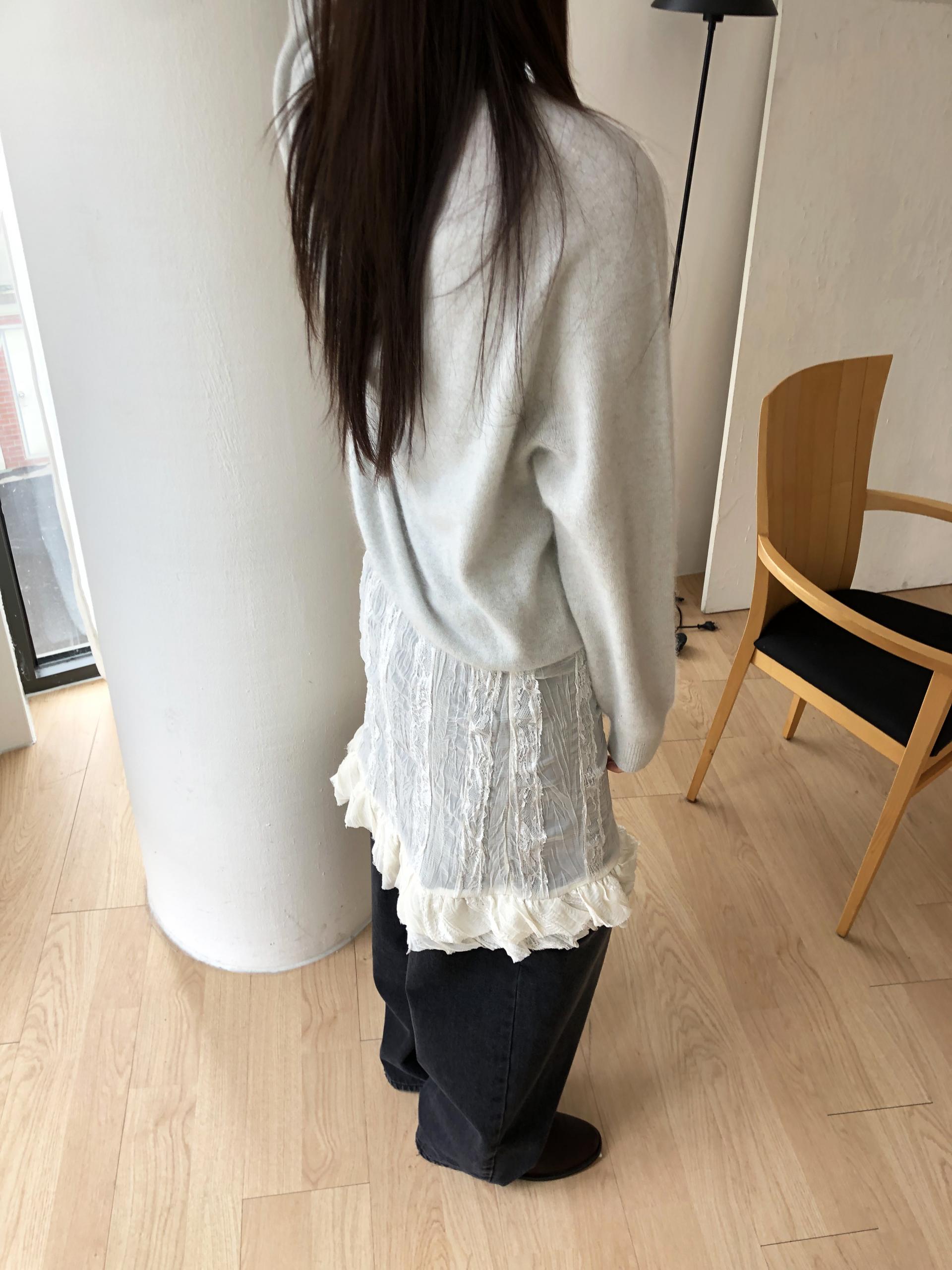 시어한 소재에 레이스를 포인트로 한 디자인으로 겹쳐입어도 부해보이지 않게 레이어링 할 수 있어 더욱 마음에 들었던 아이템이에요. 살짝 파여있는 라운드넥이라 원피스 안에 탑을 입어주어도 답답함없이 깔끔한 실루엣으로 연출됩니다.