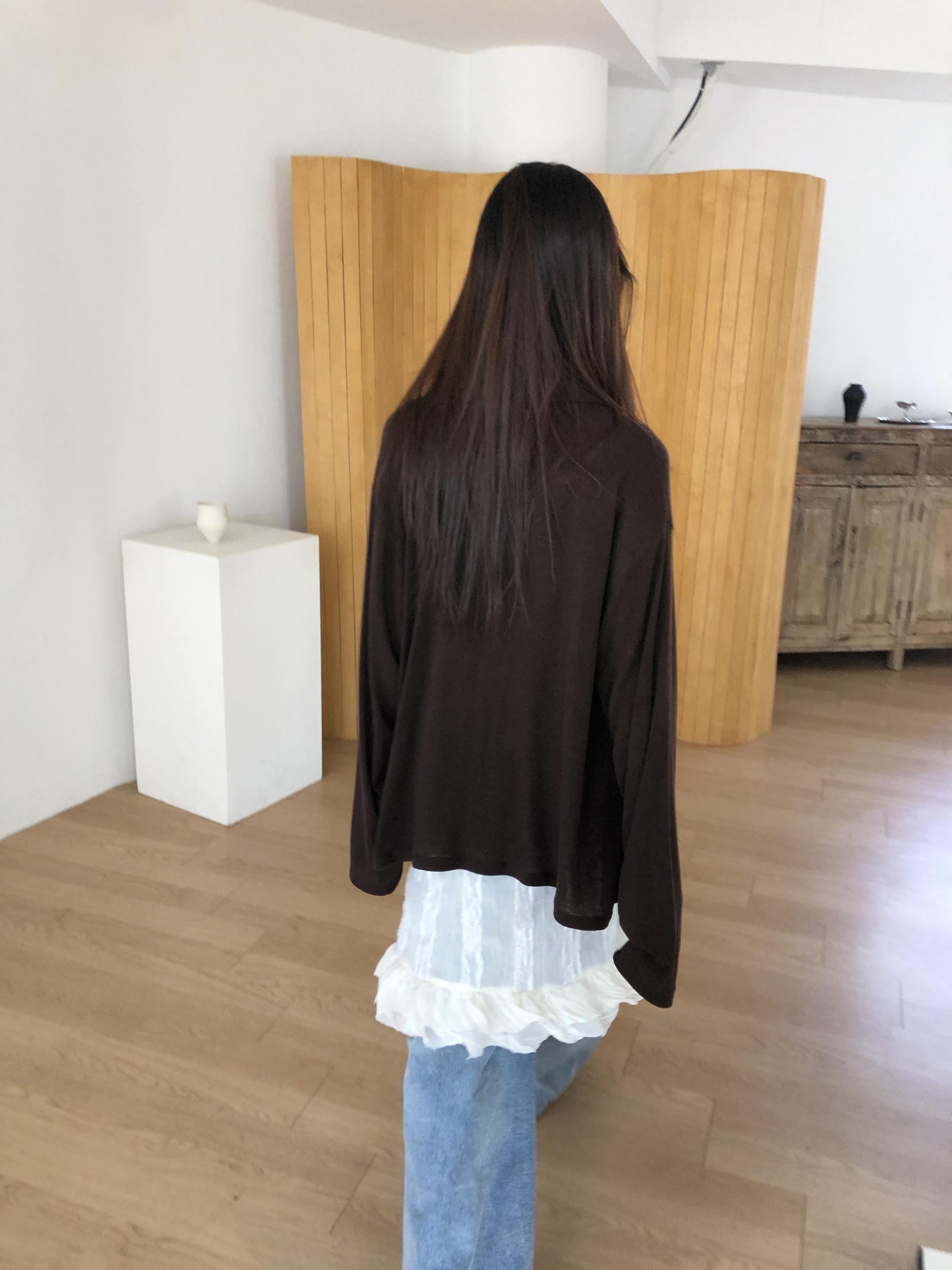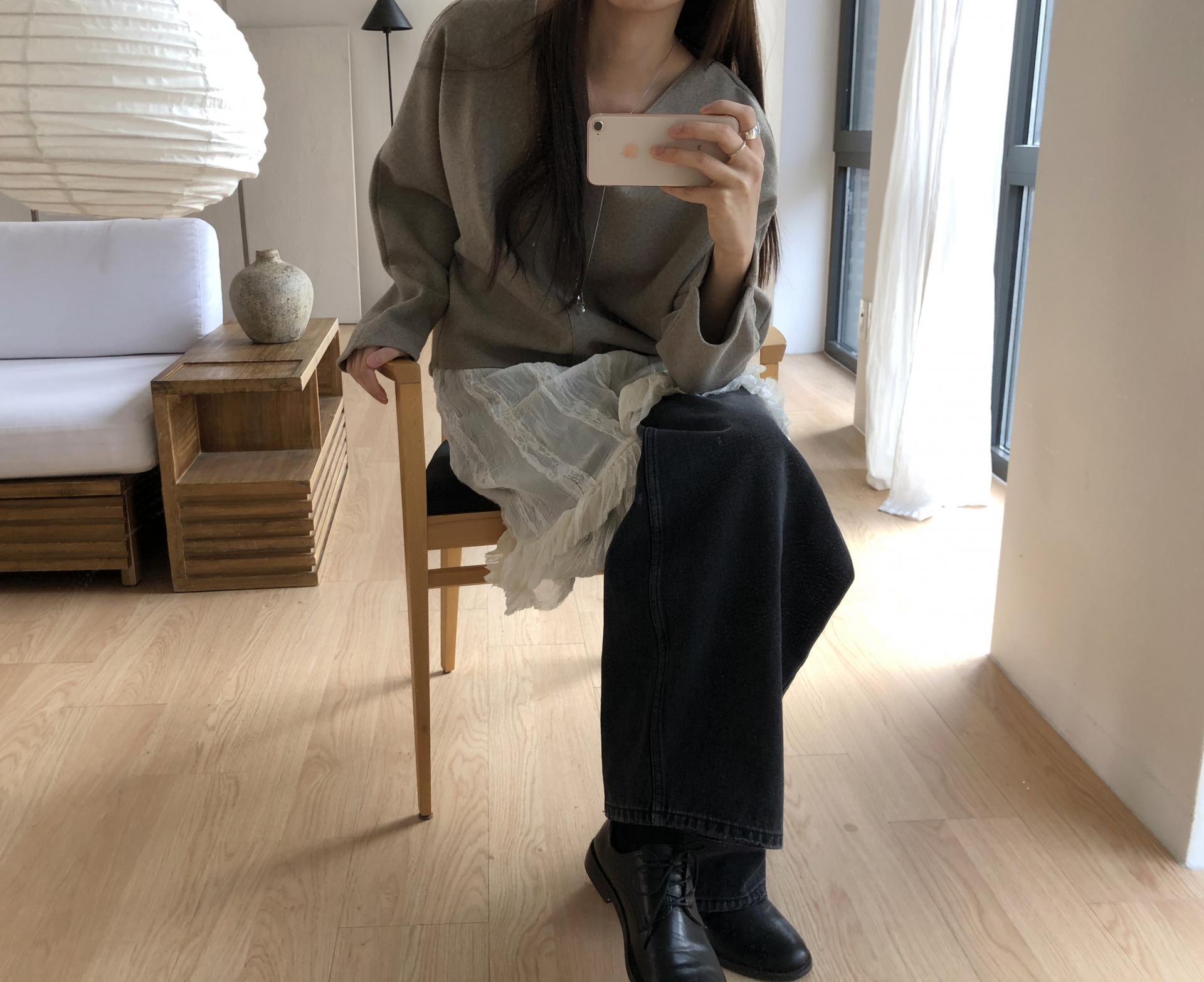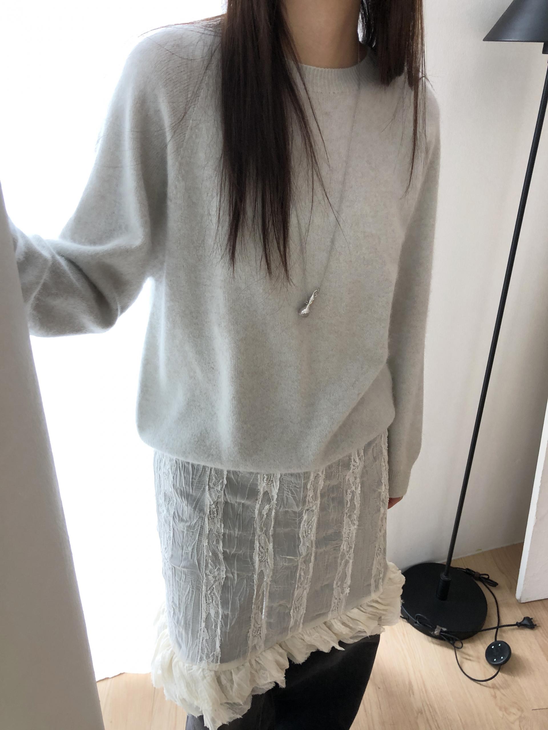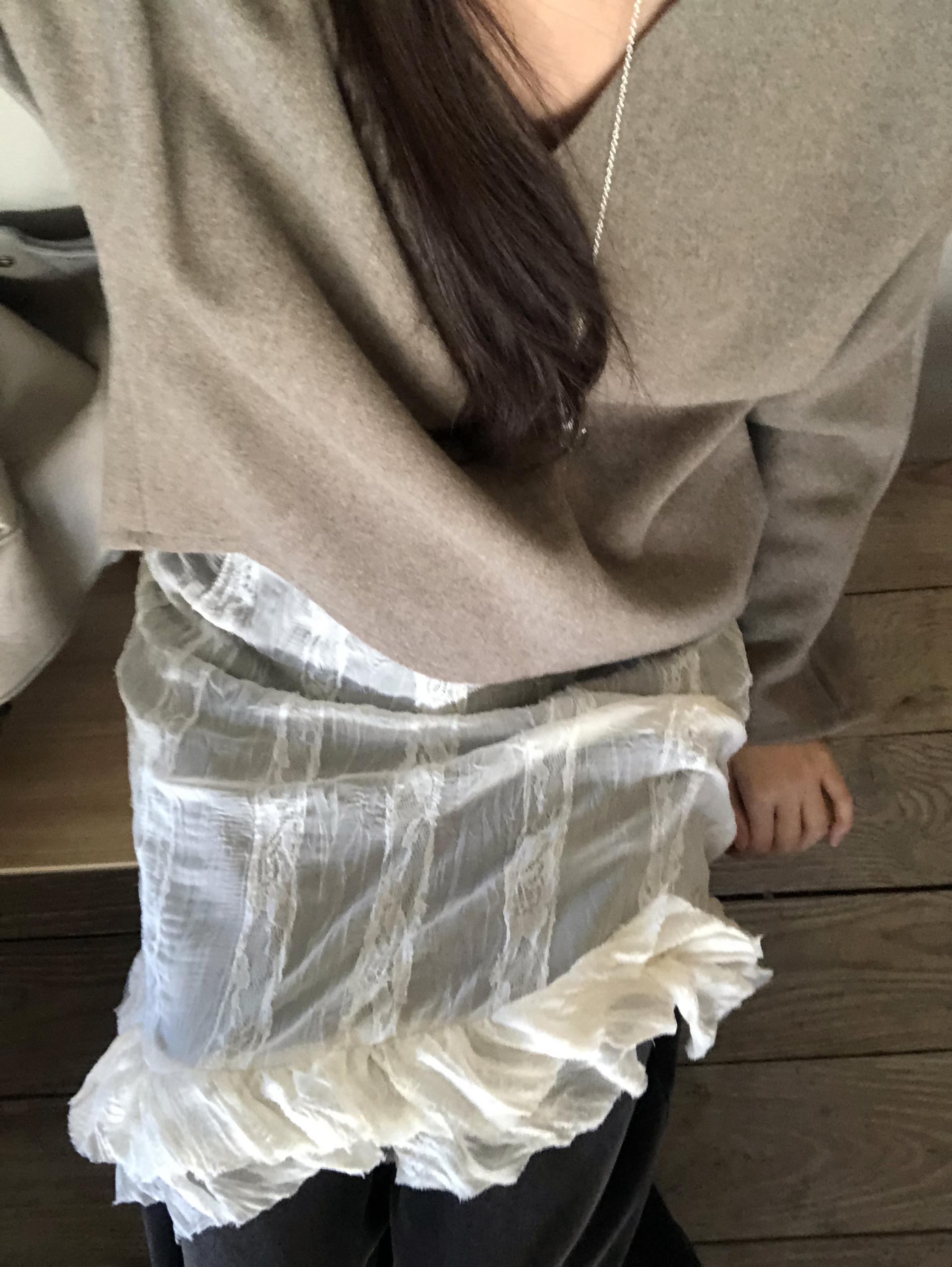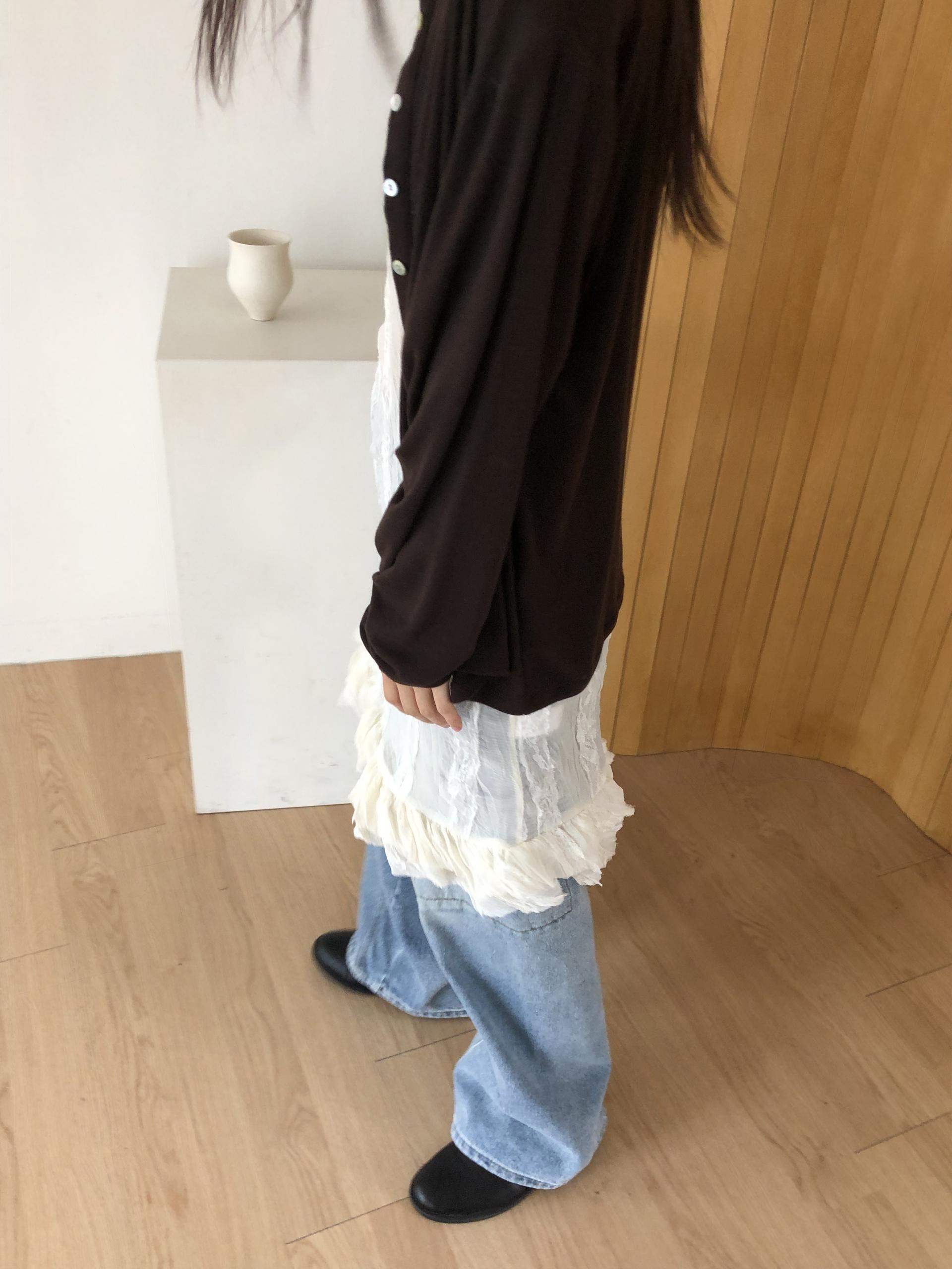 시어한 소재에 레이스를 포인트로 한 디자인으로 겹쳐입어도 부해보이지 않게 레이어링 할 수 있어 더욱 마음에 들었던 아이템이에요. 살짝 파여있는 라운드넥이라 원피스 안에 탑을 입어주어도 답답함없이 깔끔한 실루엣으로 연출됩니다.