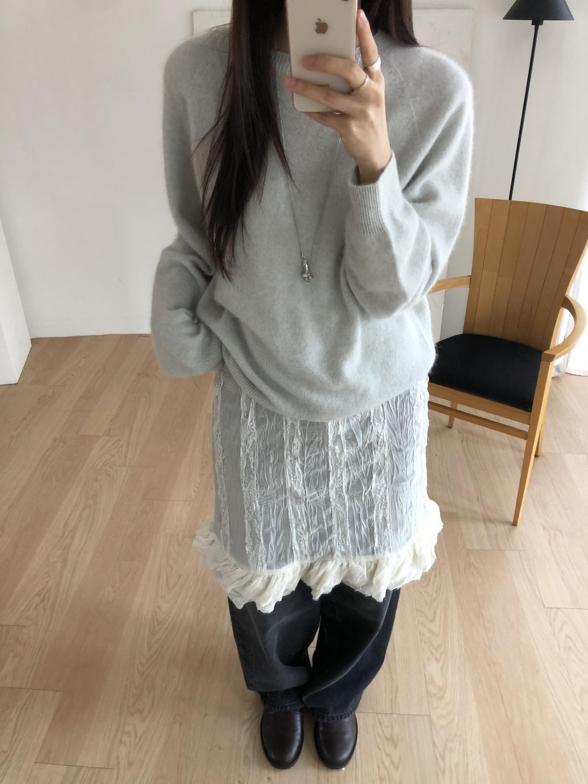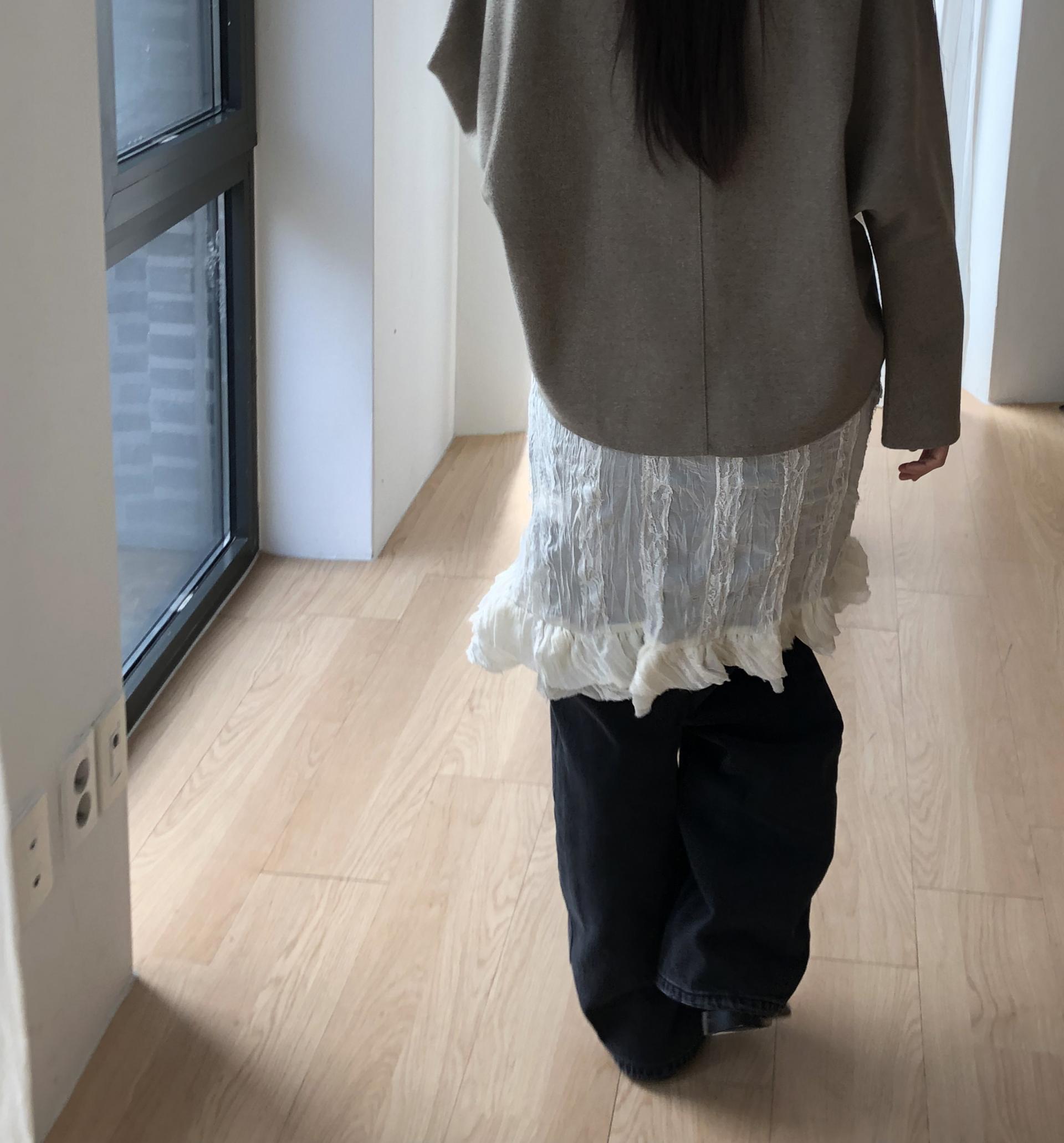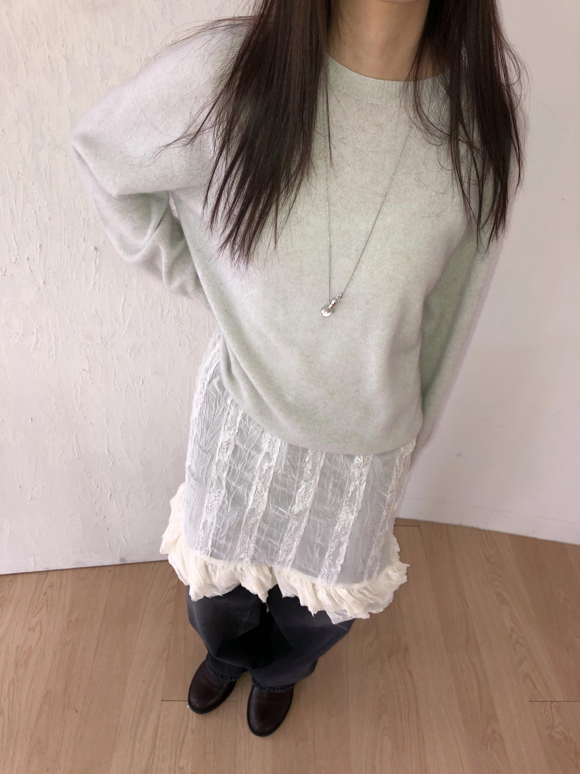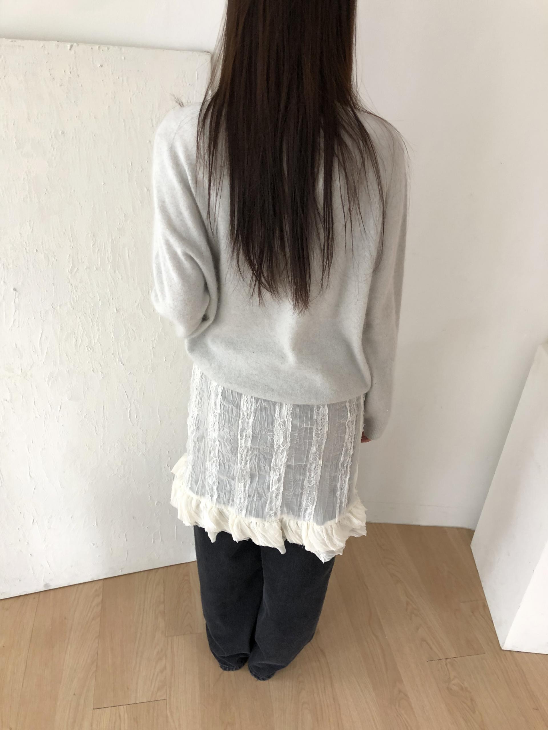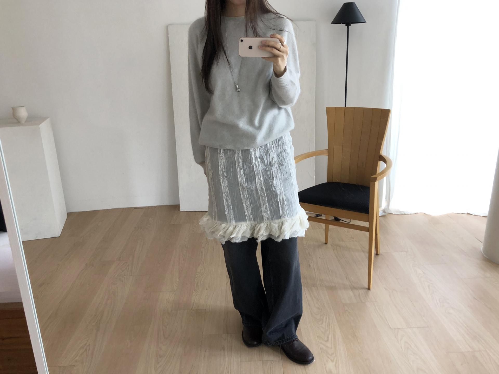 심플한 룩에 자연스럽게 로맨틱한 결이 더해져 마치 빈티지 슬립 드레스를 겹쳐 입은 듯한 분위기를 연출할 수 있습니다. 기장감도 어느정도 있는 편이라 오버핏의 아우터나 니트웨어에도 예쁘게 매치된답니다.