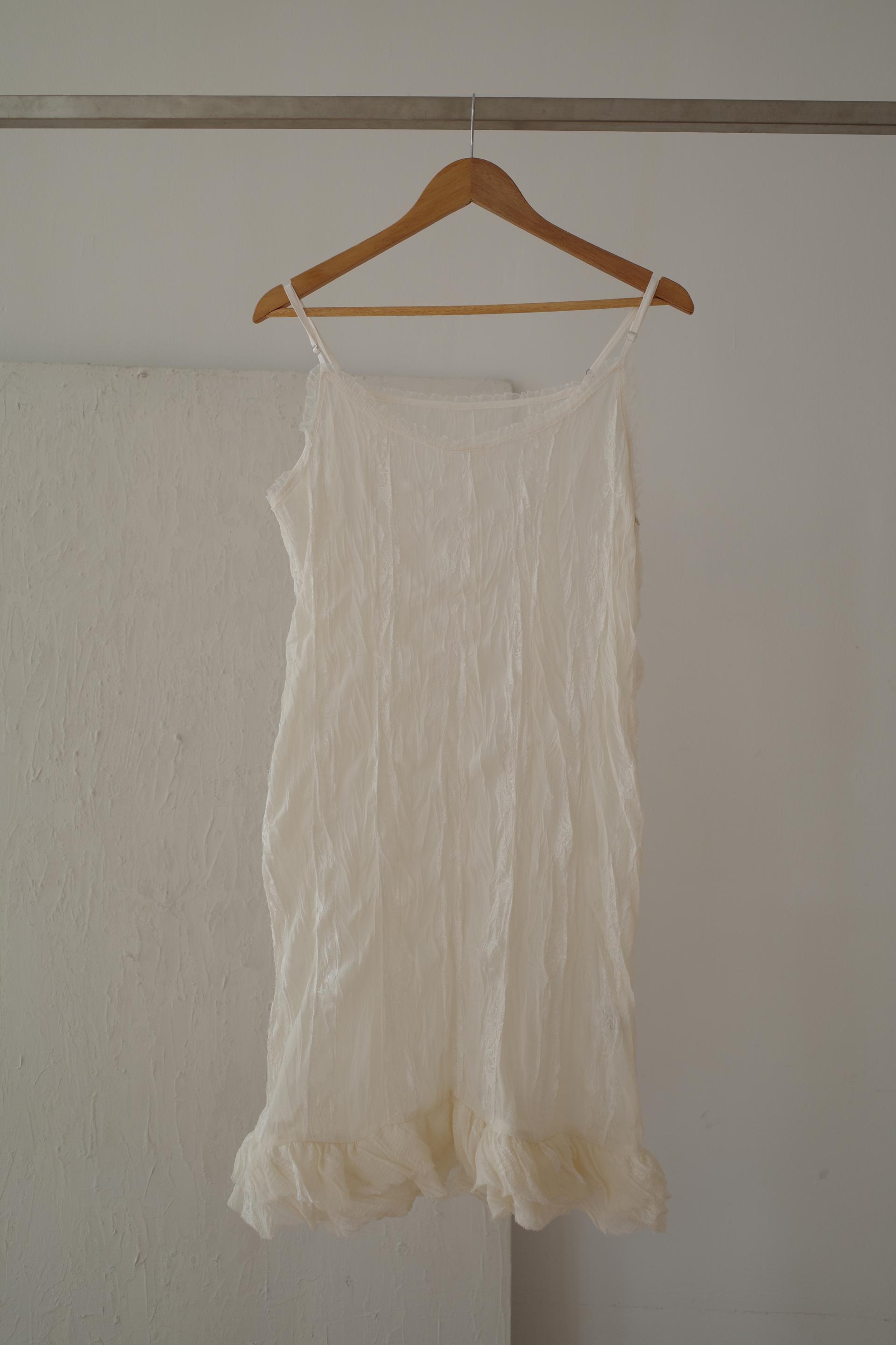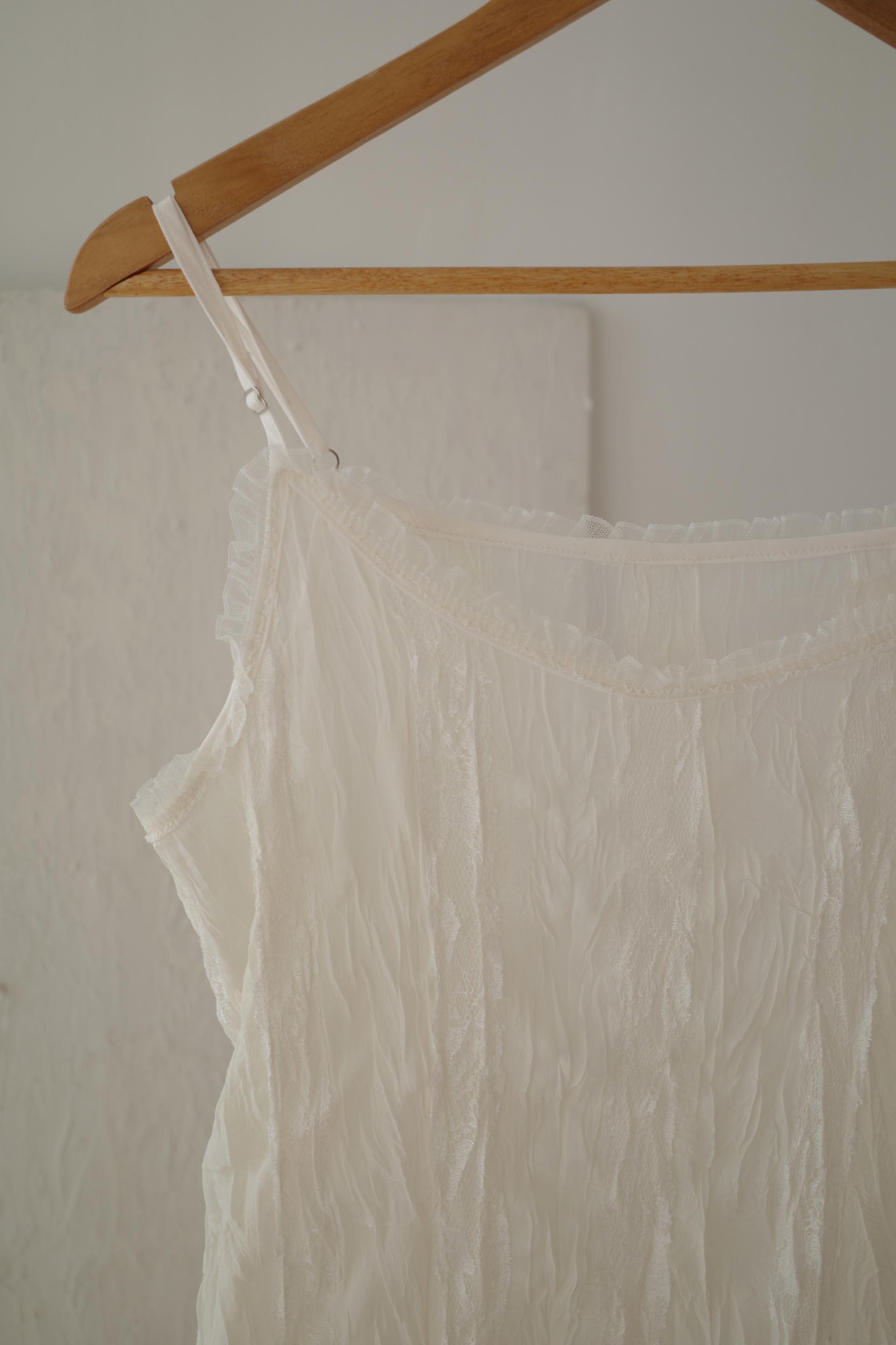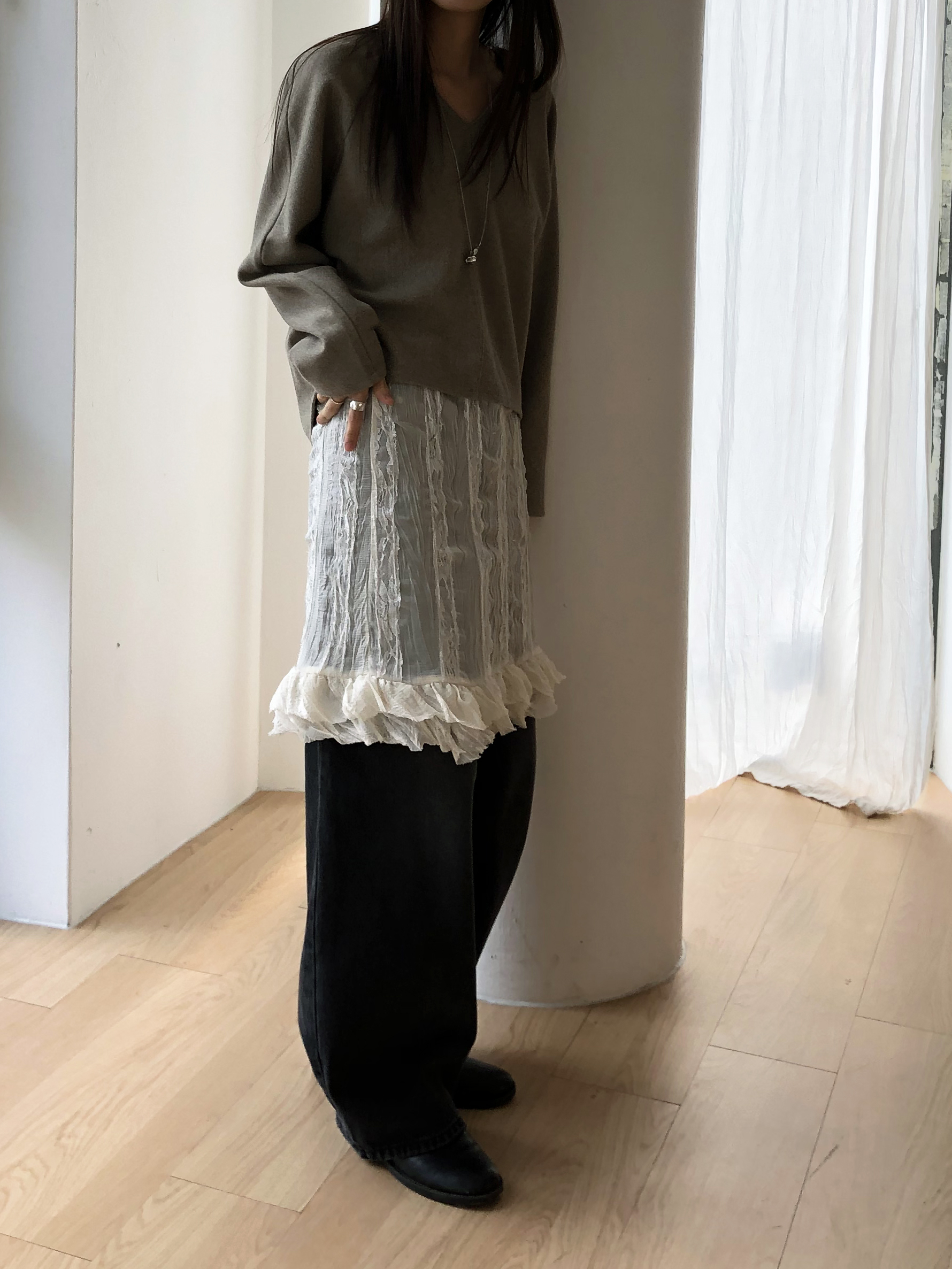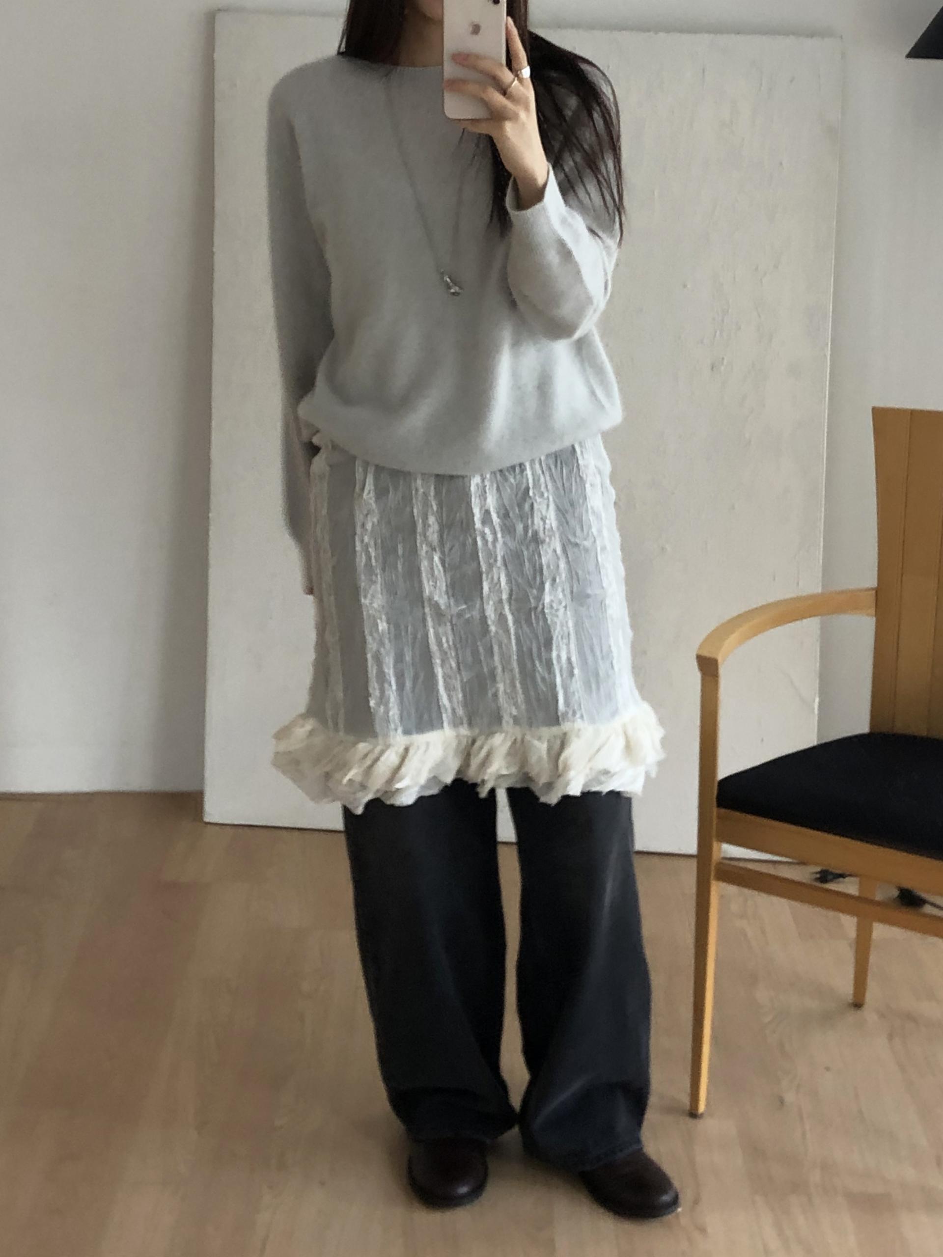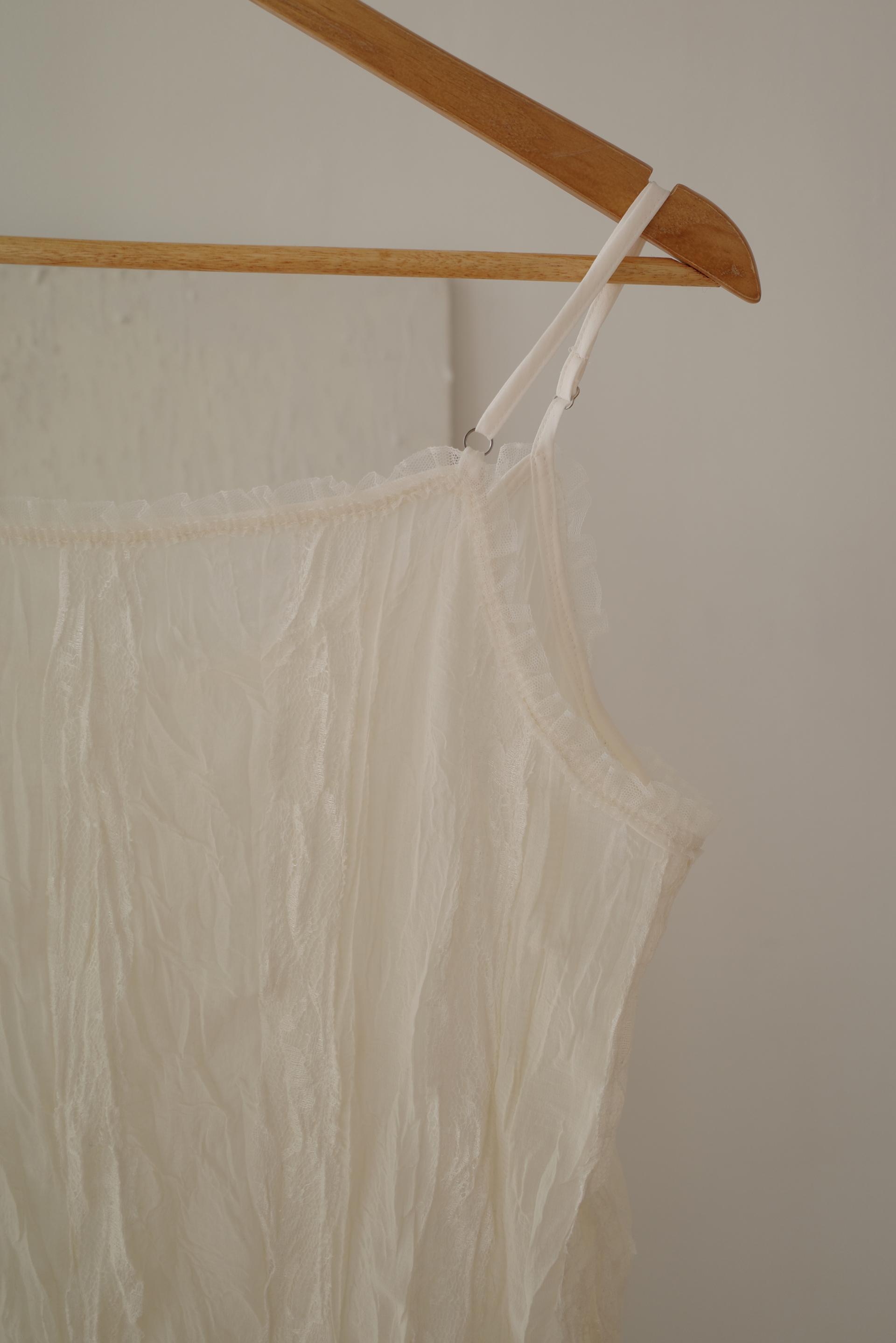 심플한 룩에 자연스럽게 로맨틱한 결이 더해져 마치 빈티지 슬립 드레스를 겹쳐 입은 듯한 분위기를 연출할 수 있습니다. 기장감도 어느정도 있는 편이라 오버핏의 아우터나 니트웨어에도 예쁘게 매치된답니다.