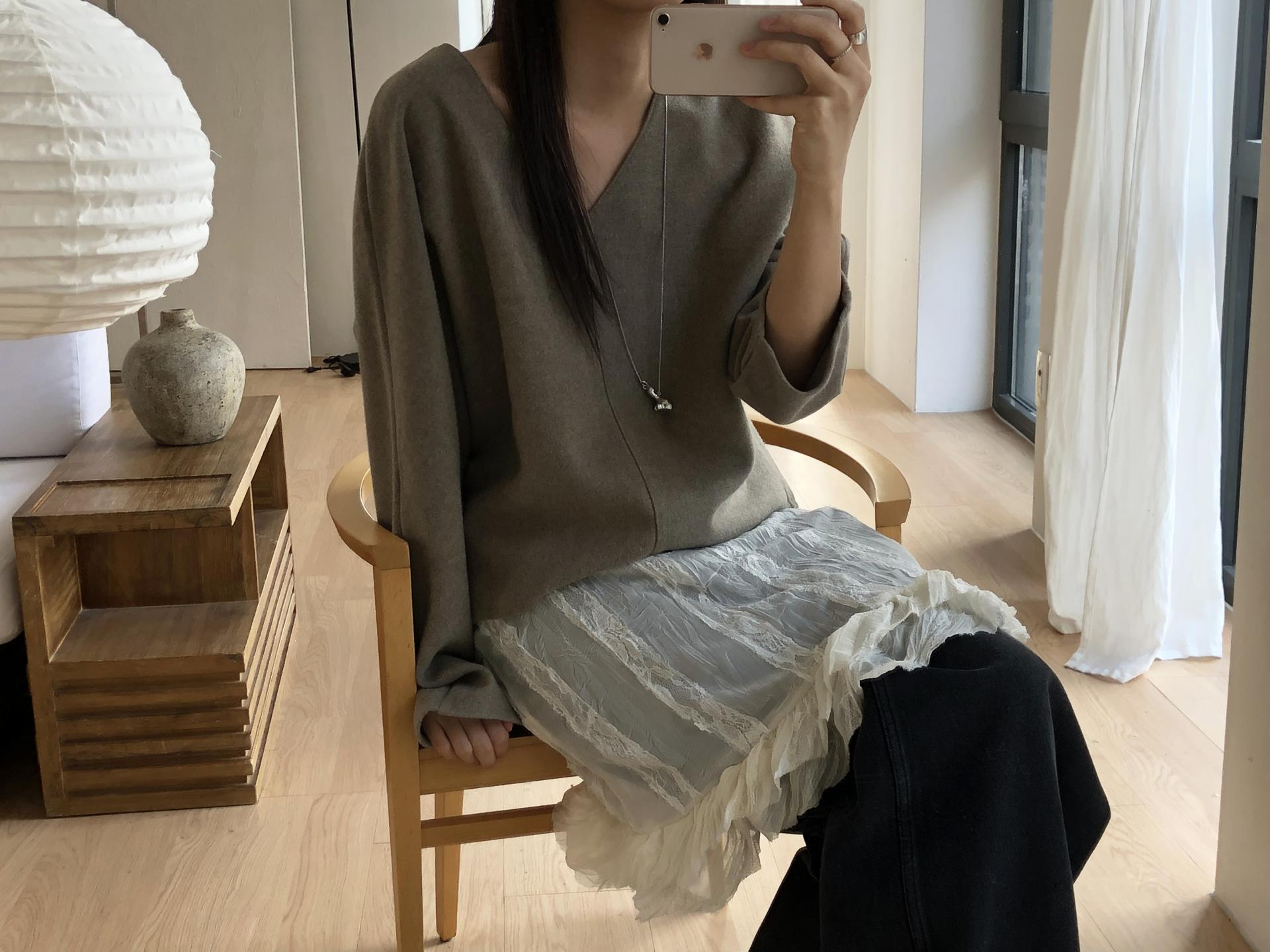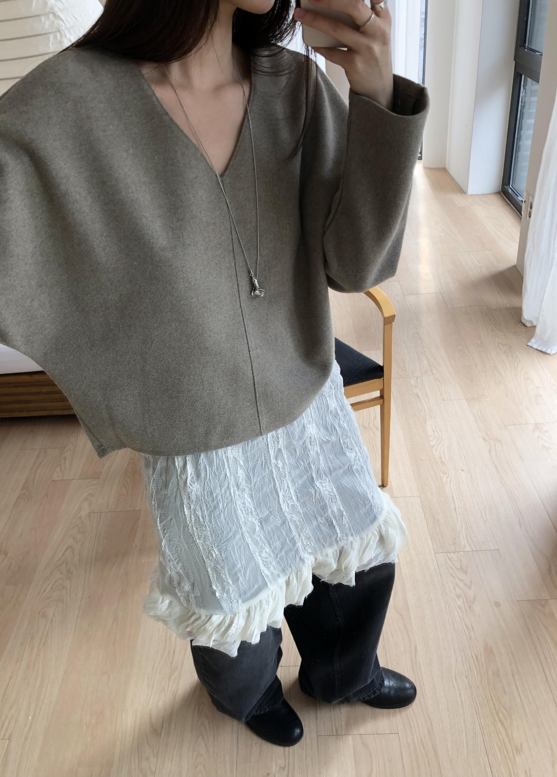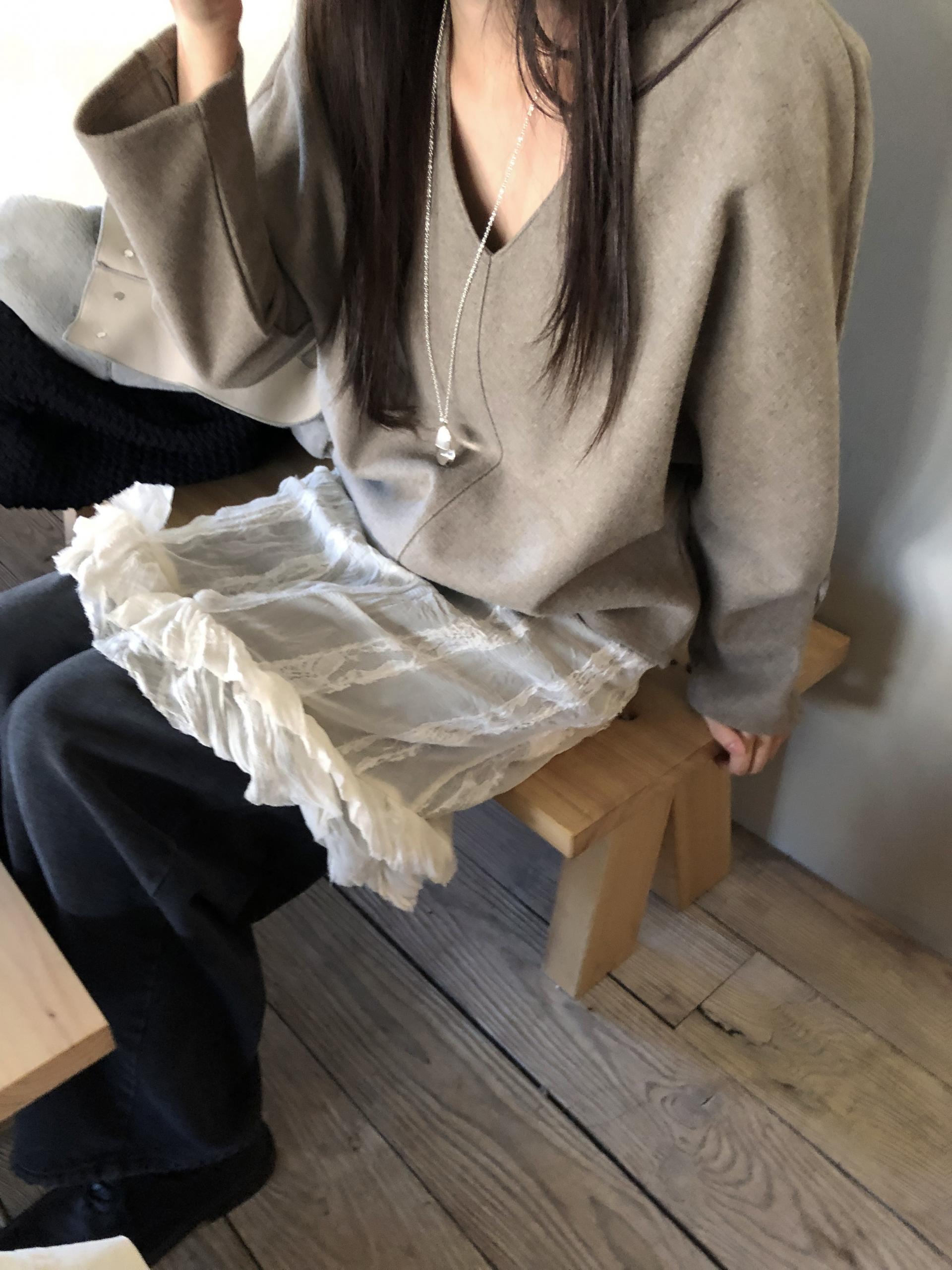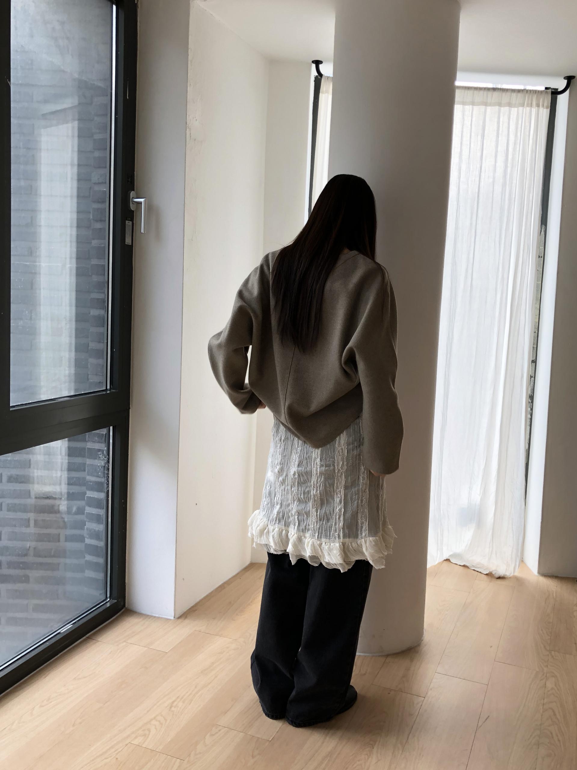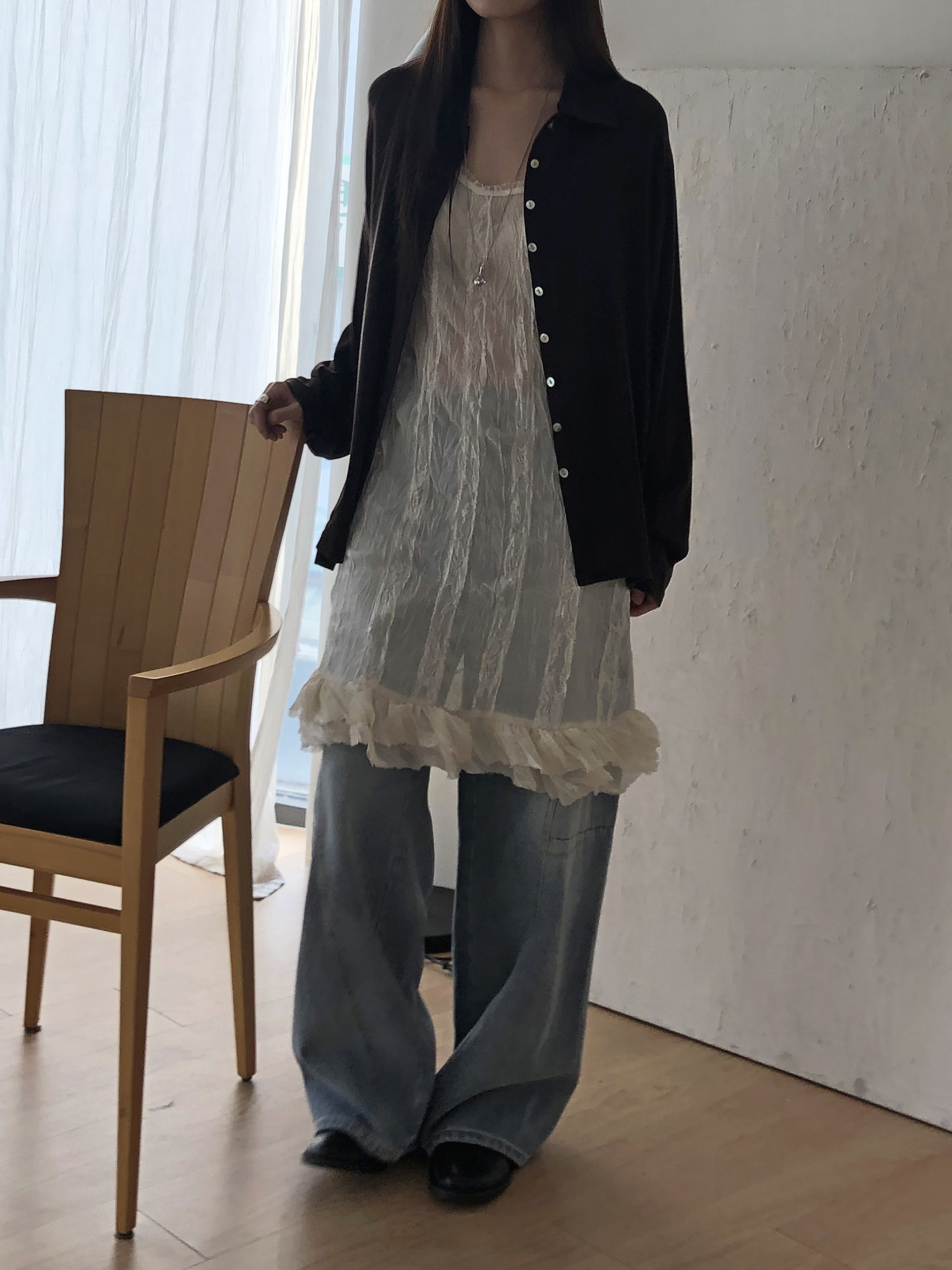 심플한 룩에 자연스럽게 로맨틱한 결이 더해져 마치 빈티지 슬립 드레스를 겹쳐 입은 듯한 분위기를 연출할 수 있습니다. 기장감도 어느정도 있는 편이라 오버핏의 아우터나 니트웨어에도 예쁘게 매치된답니다.
