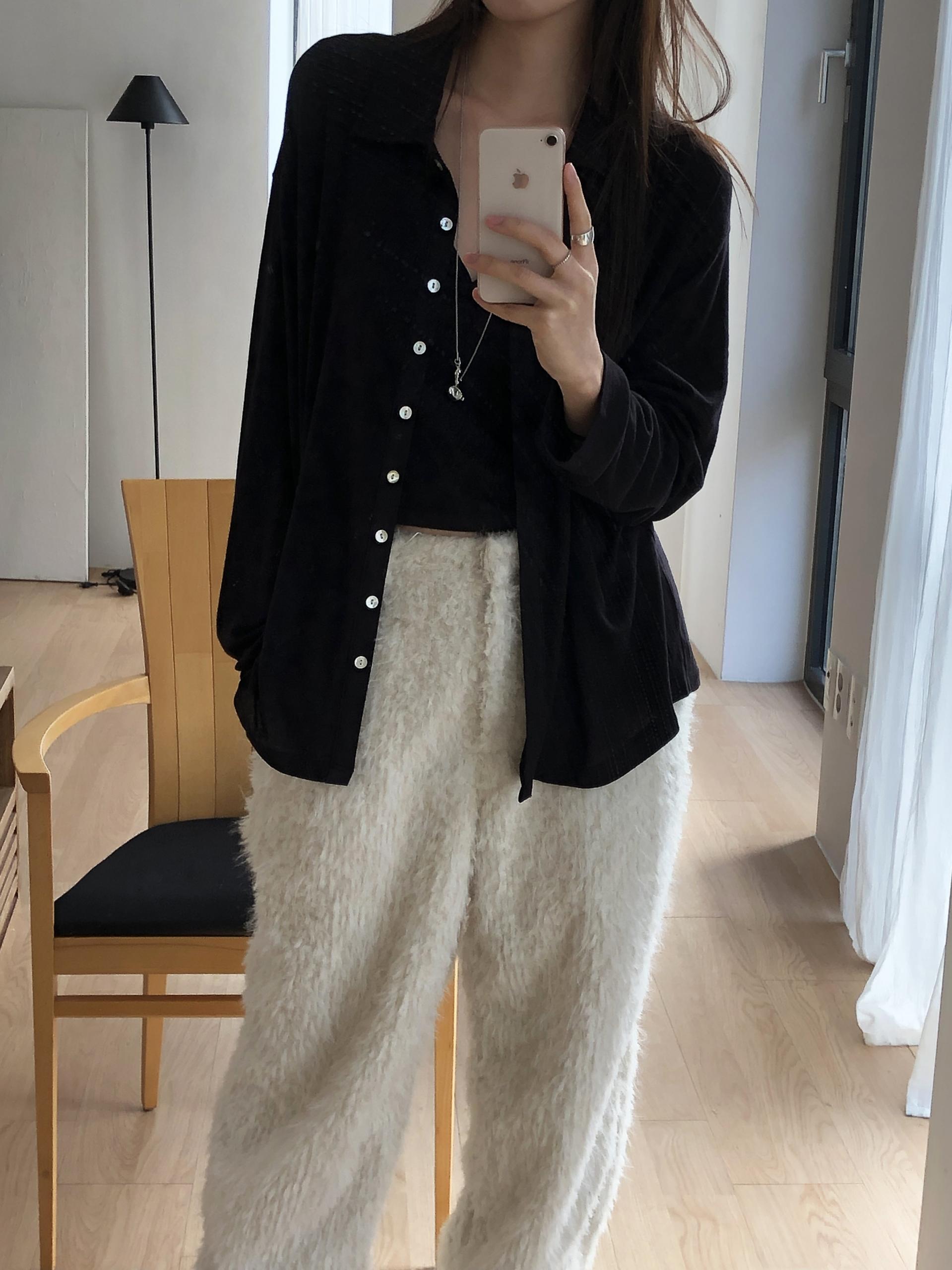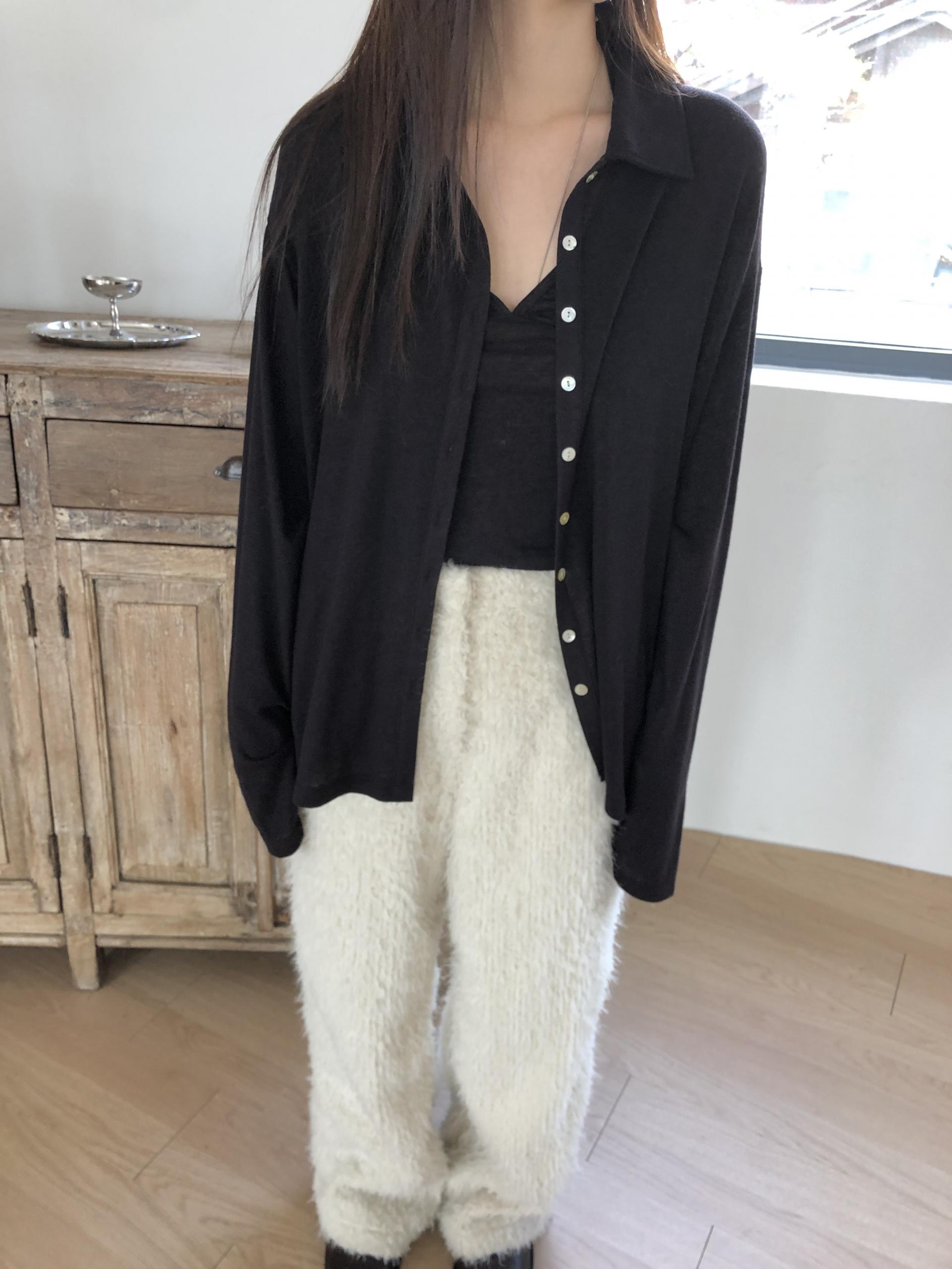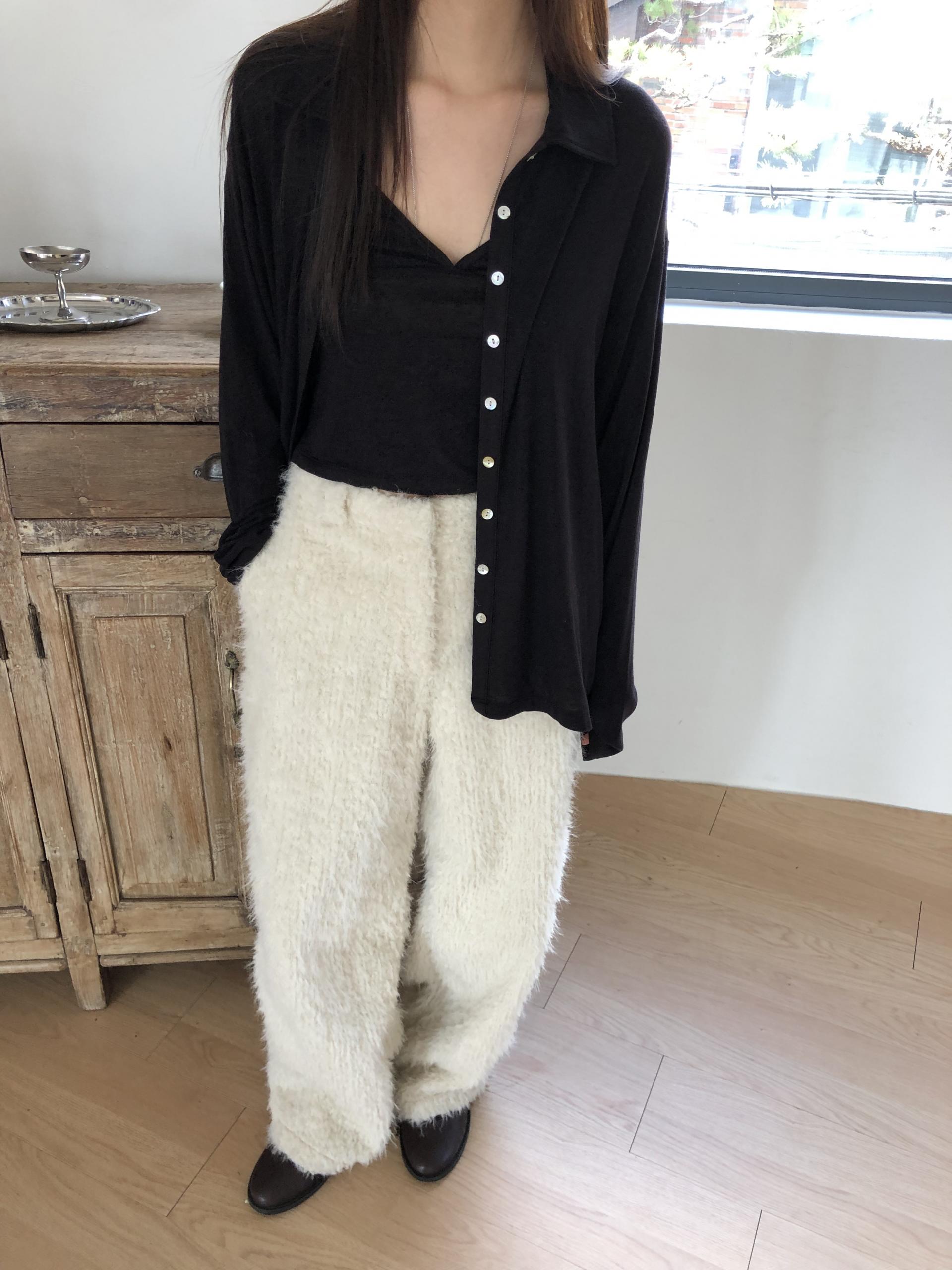 세트로 구성되었던 미아 루즈 가디건과 동일한 원단으로 제작되어 후들후들하면서 쫀쫀한 촉감을 가졌어요.