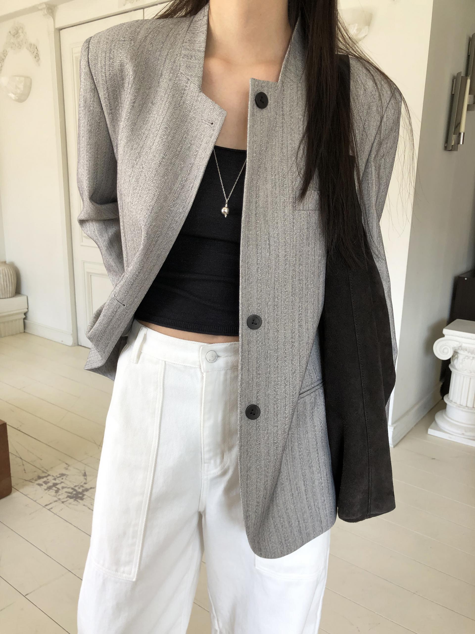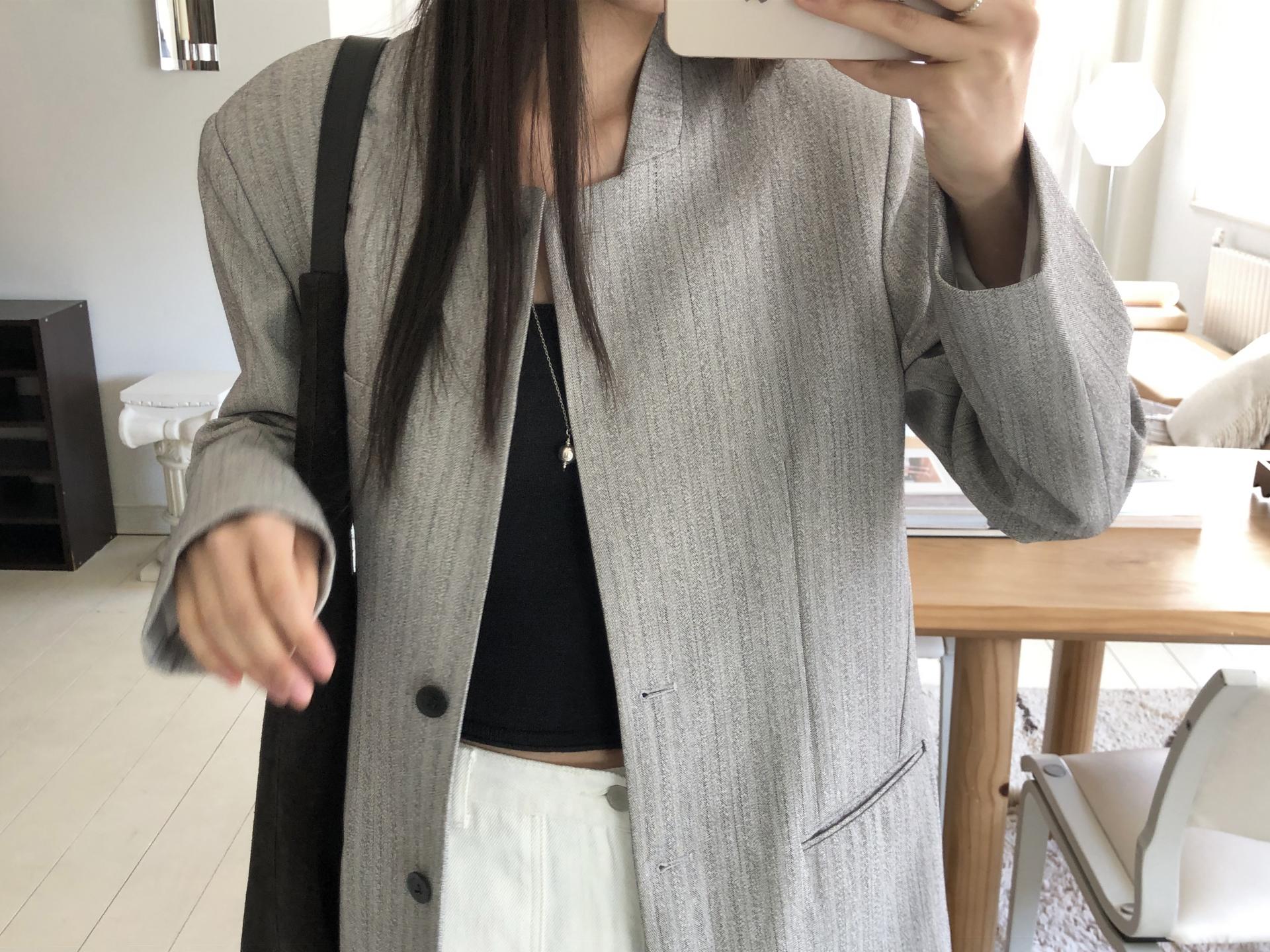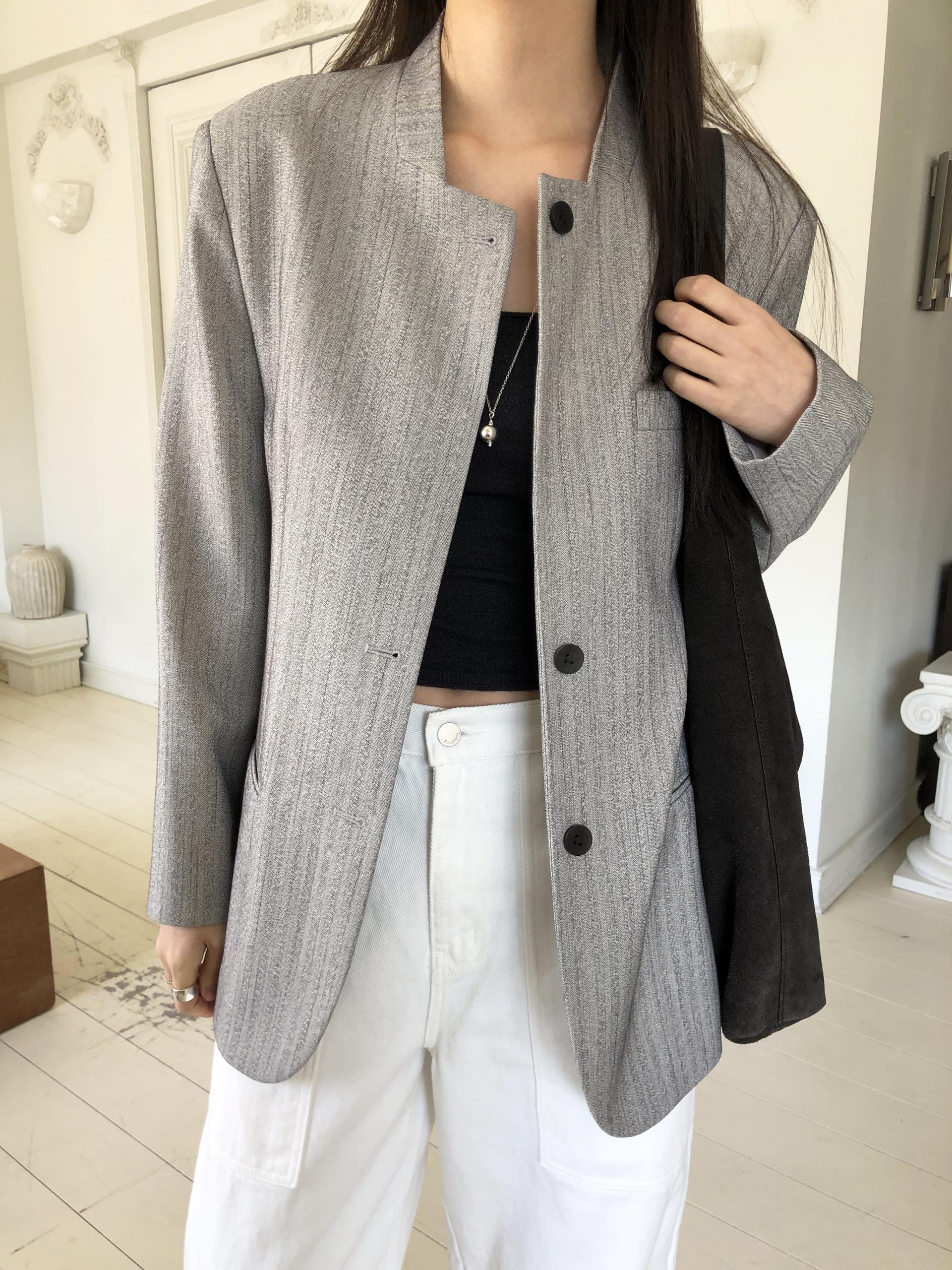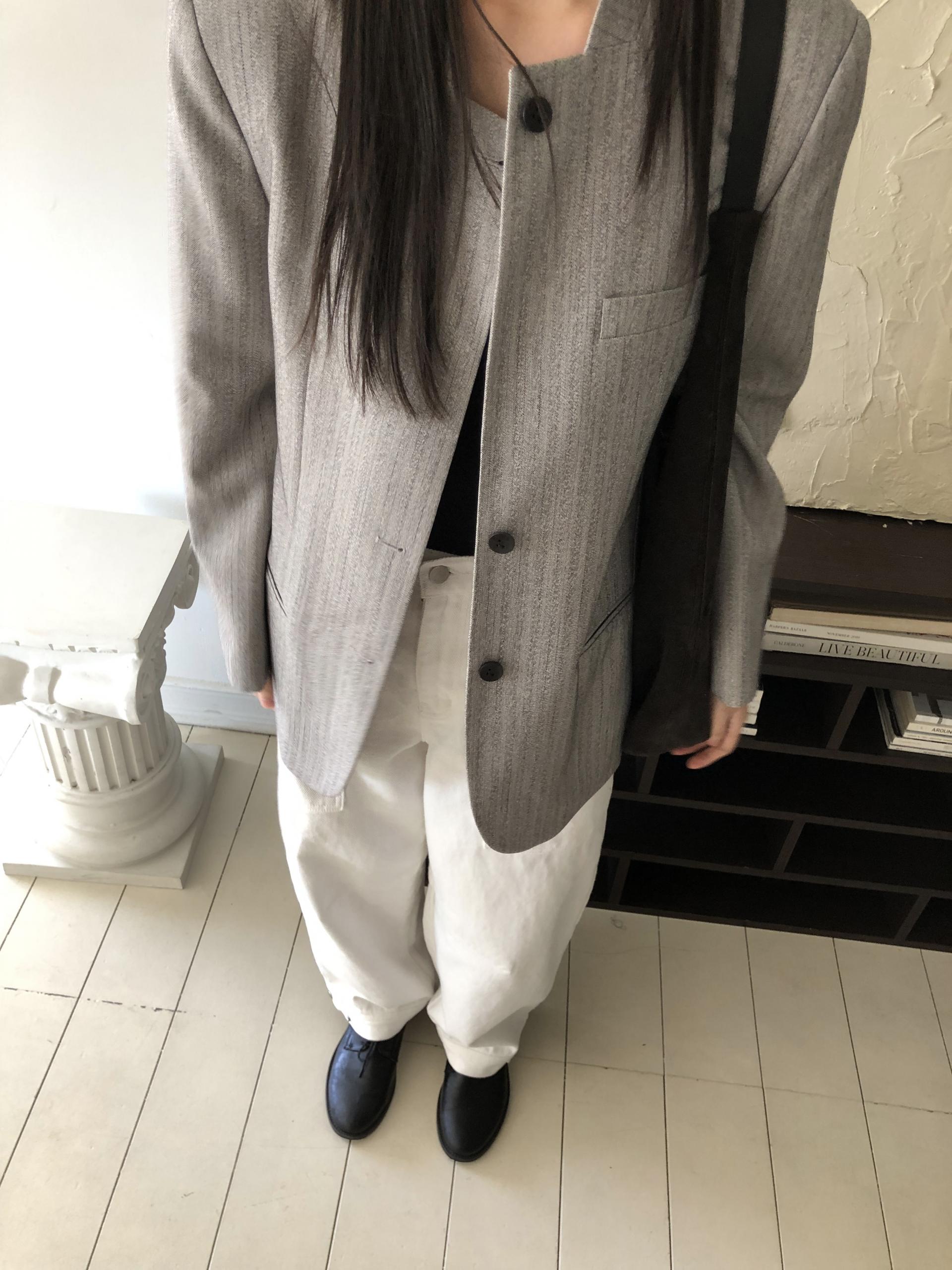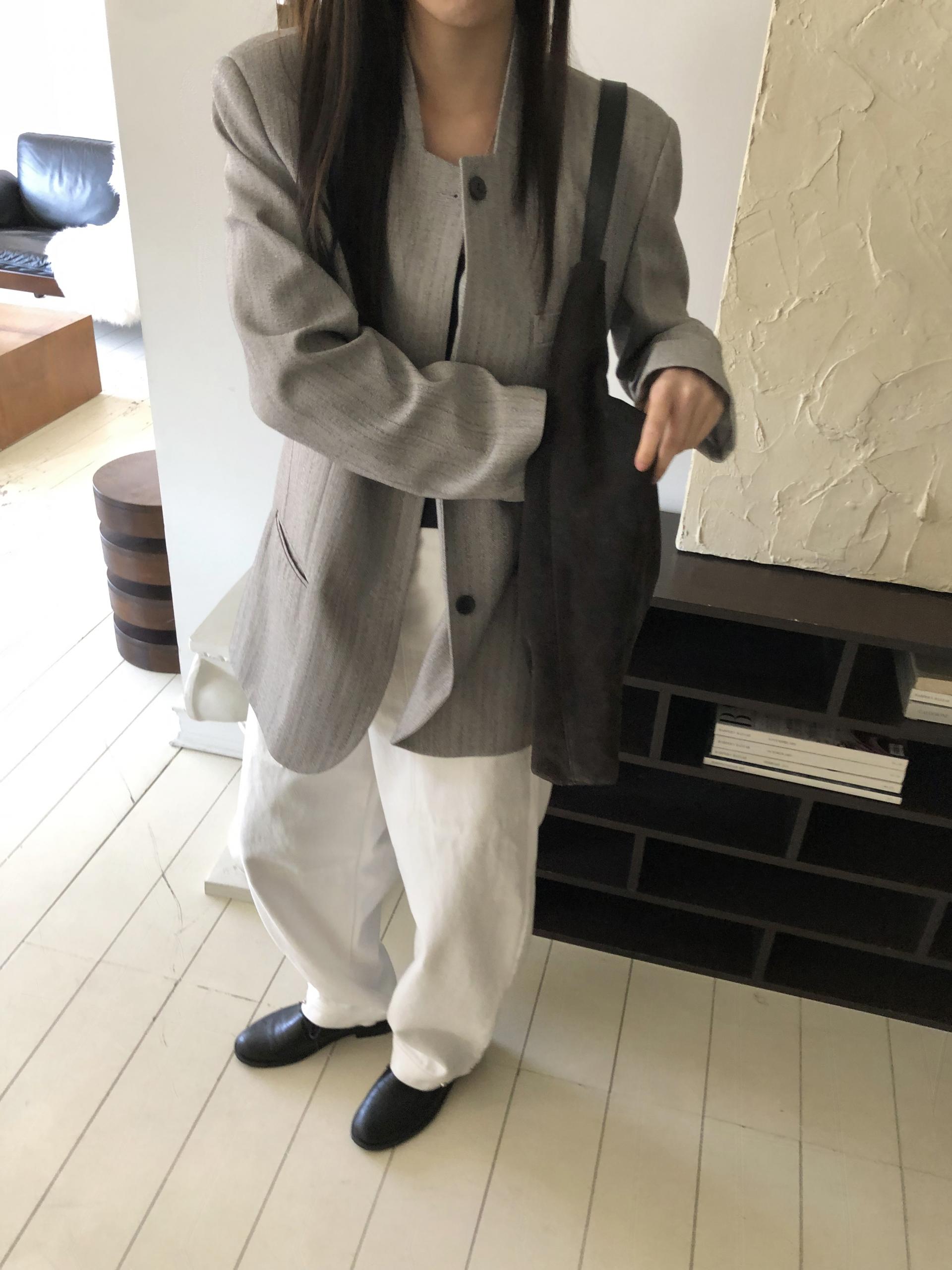 미니멀한 페퍼 자켓의 매력이 잘 드러나는 차콜은 웨어러블하게 스타일링이 가능해 가장 추천드립니다. 트위드 자켓같이 산뜻하고 은은한 매력의 라이트 그레이는 특히나 봄과 잘 어울리는 컬러예요.