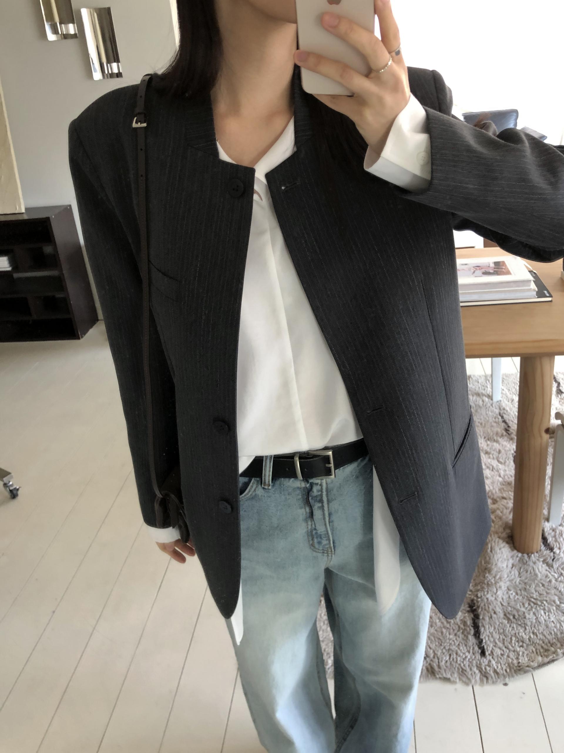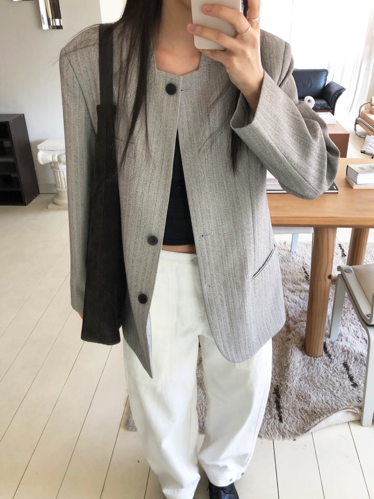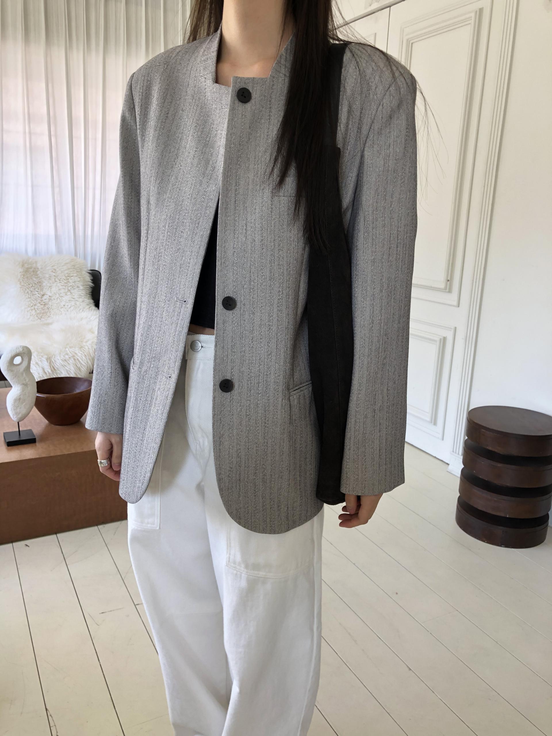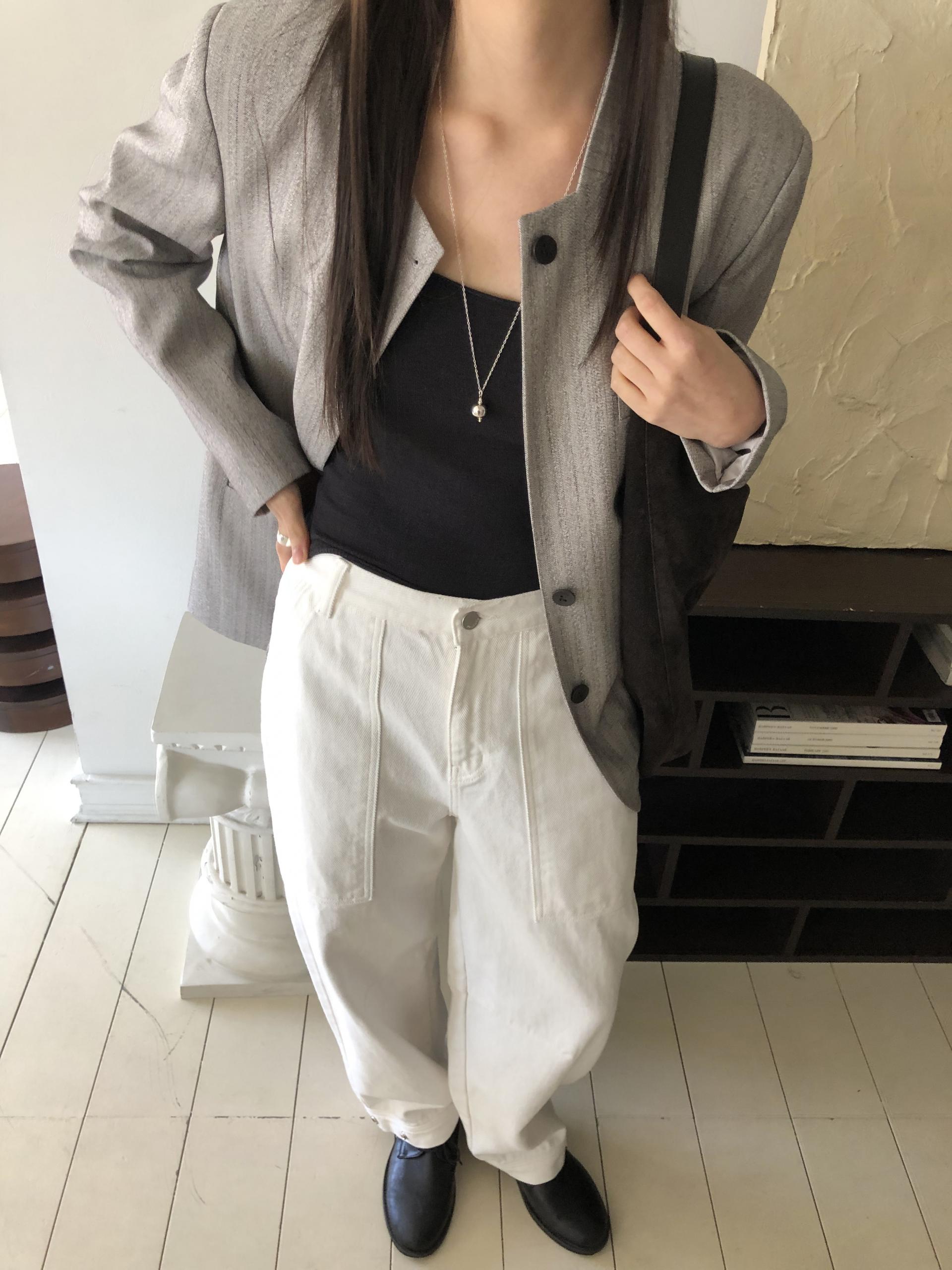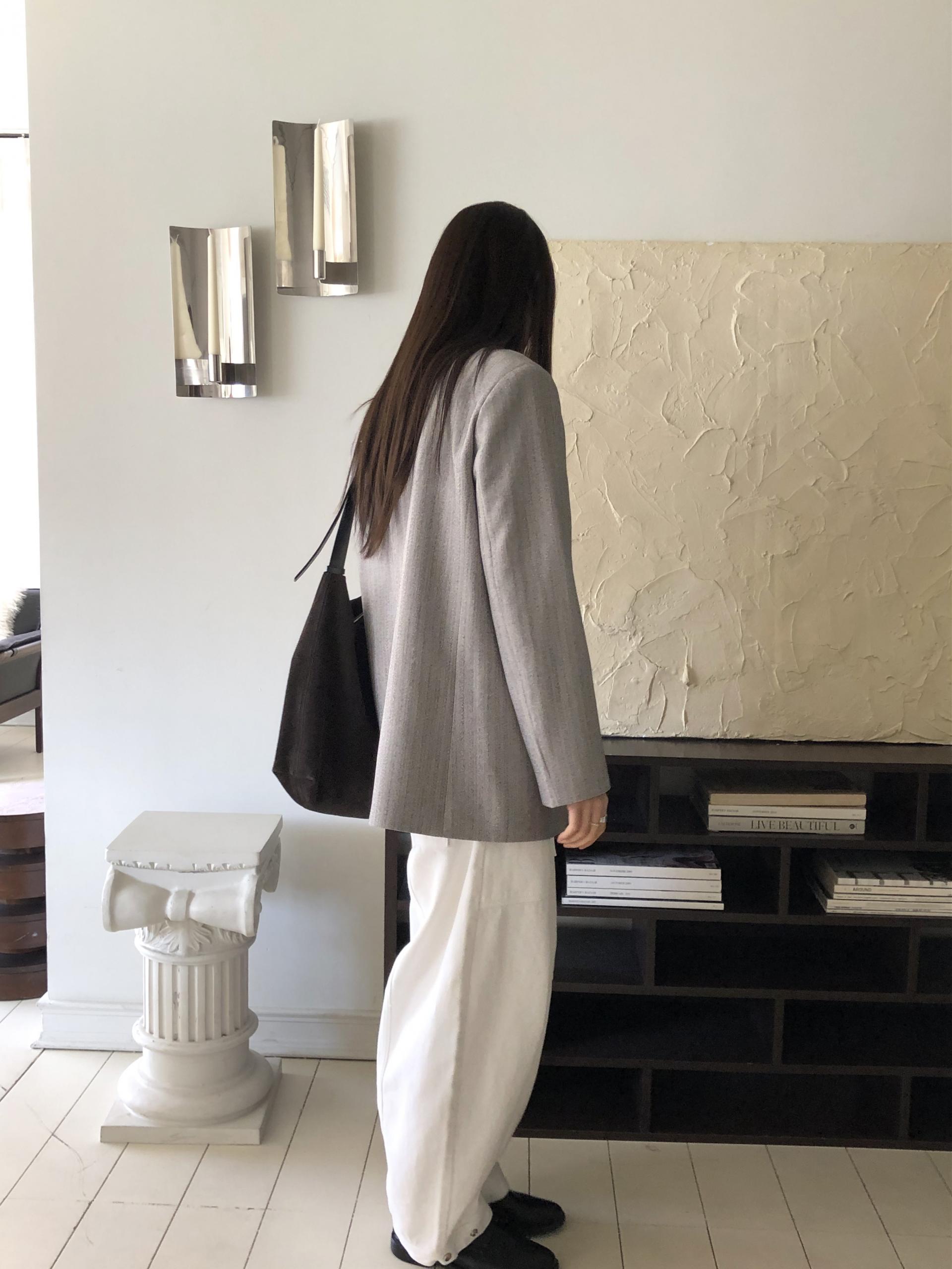 미니멀한 페퍼 자켓의 매력이 잘 드러나는 차콜은 웨어러블하게 스타일링이 가능해 가장 추천드립니다. 트위드 자켓같이 산뜻하고 은은한 매력의 라이트 그레이는 특히나 봄과 잘 어울리는 컬러예요.