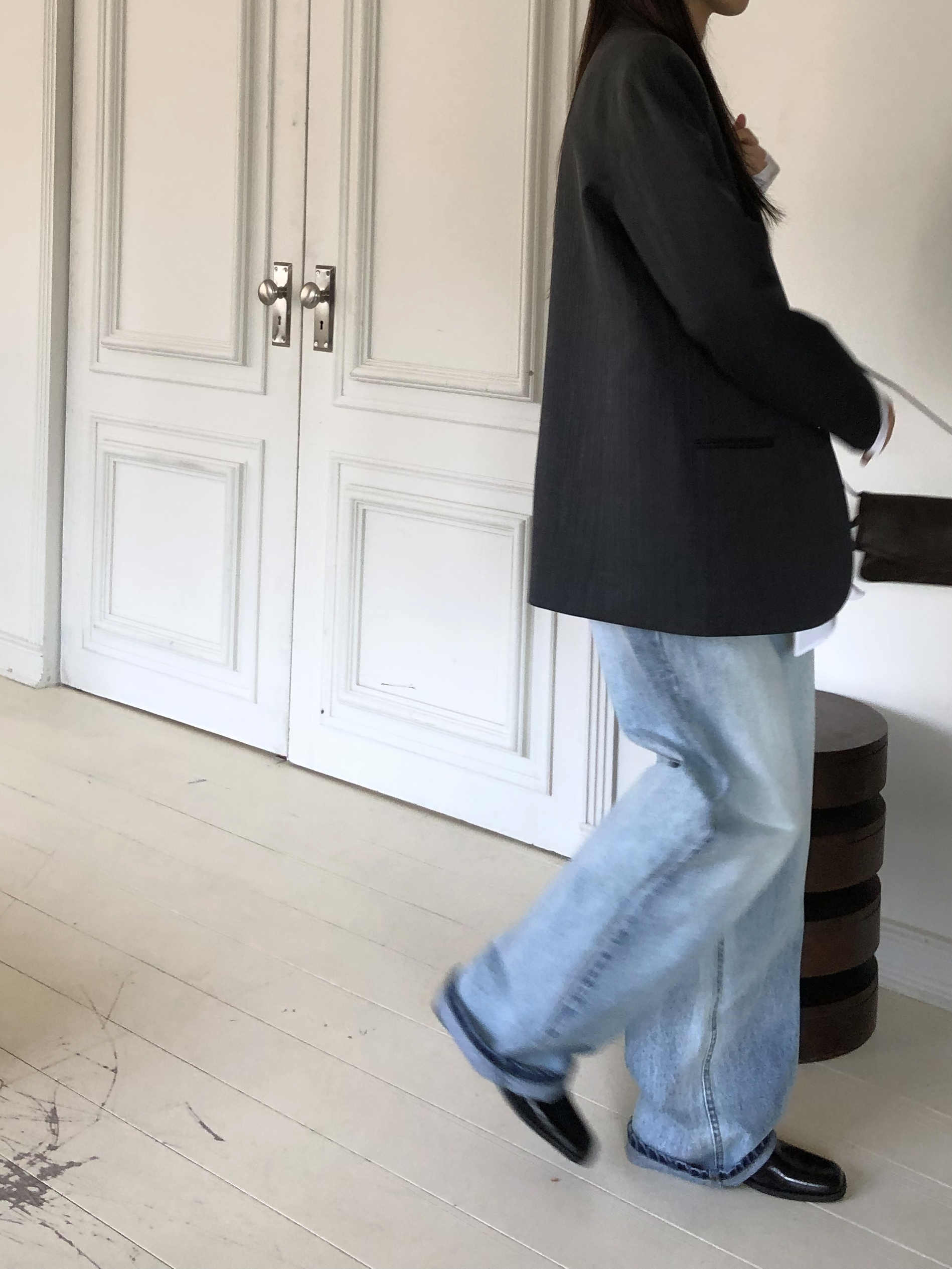 자세히 보면 단추 배치가 특이해요. 촘촘하게 이어진 디자인이 아닌, 첫번째와 두번째 사이에 간격을 주어 리듬감을 주었습니다. 이 여백 덕분에 어딘지 좀 더 미니멀하고 가볍게 느껴지기도 한답니다. 걸을 때 자연스럽게 벌어져 유연함을 더해주는 뒷 슬릿 디테일도 확인해주세요.