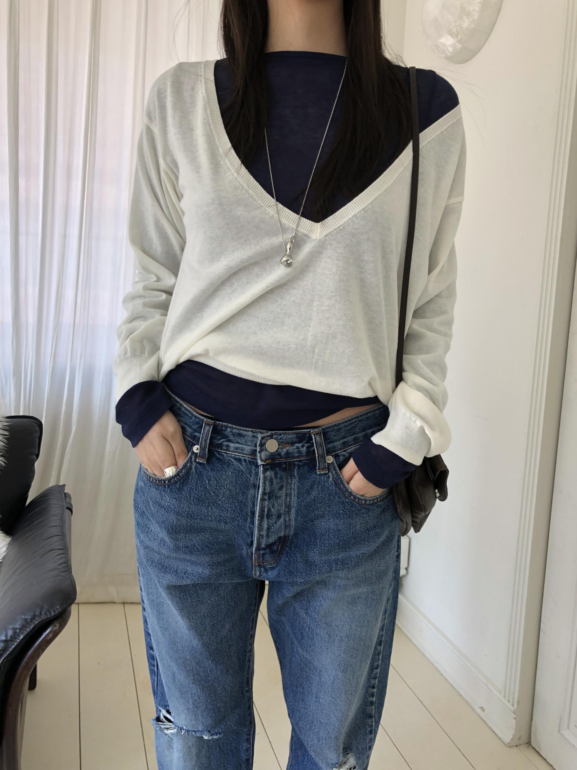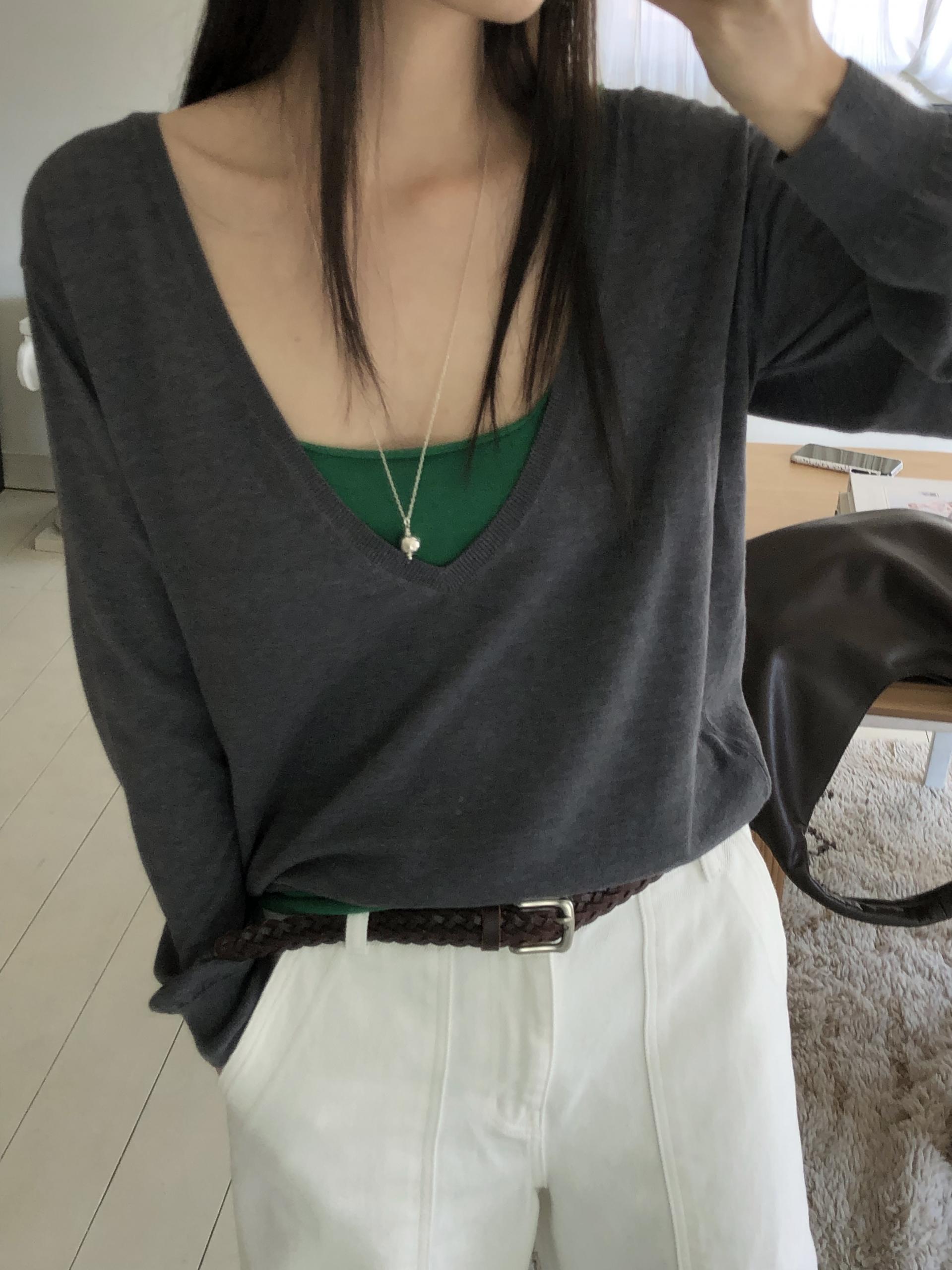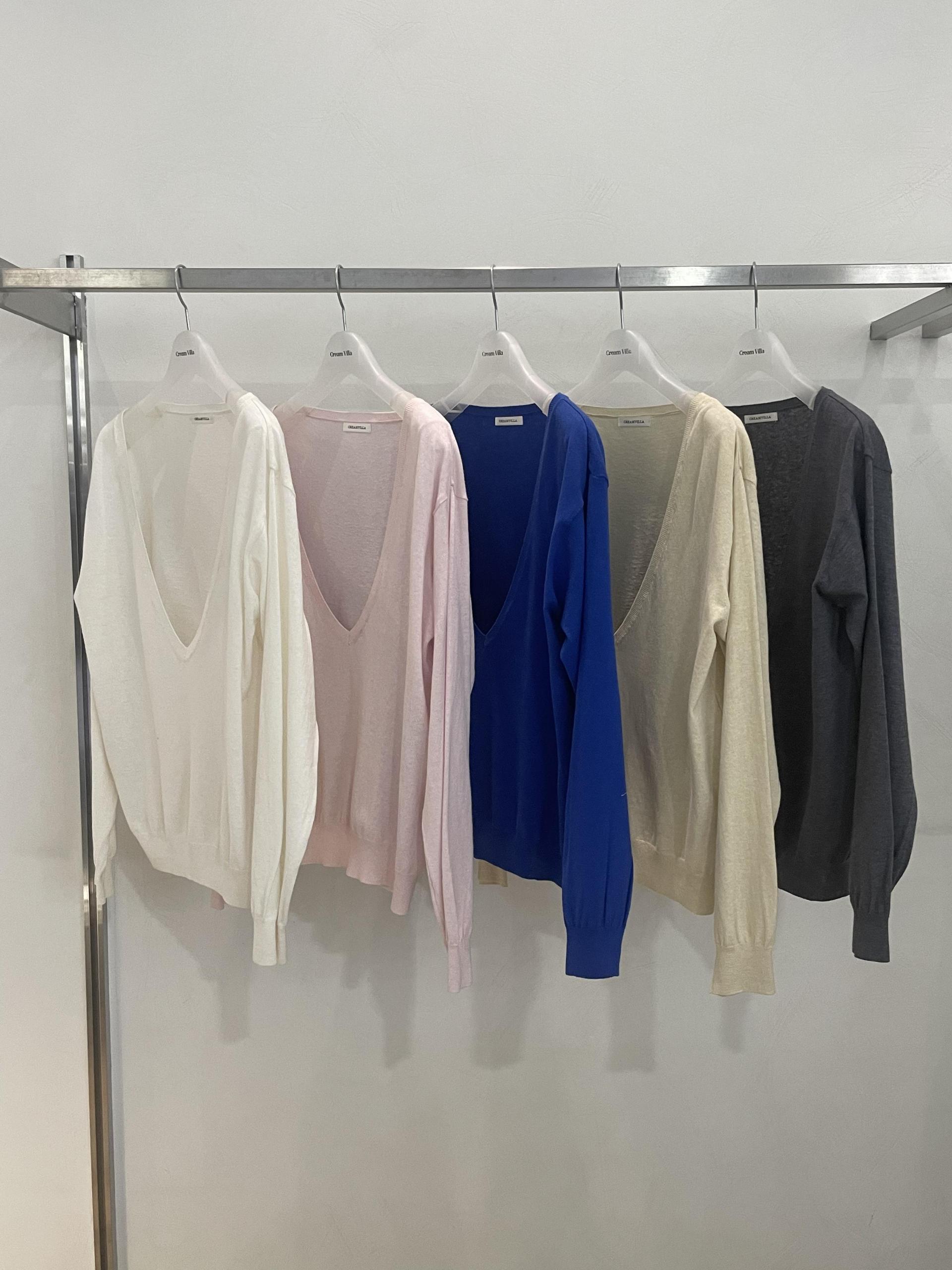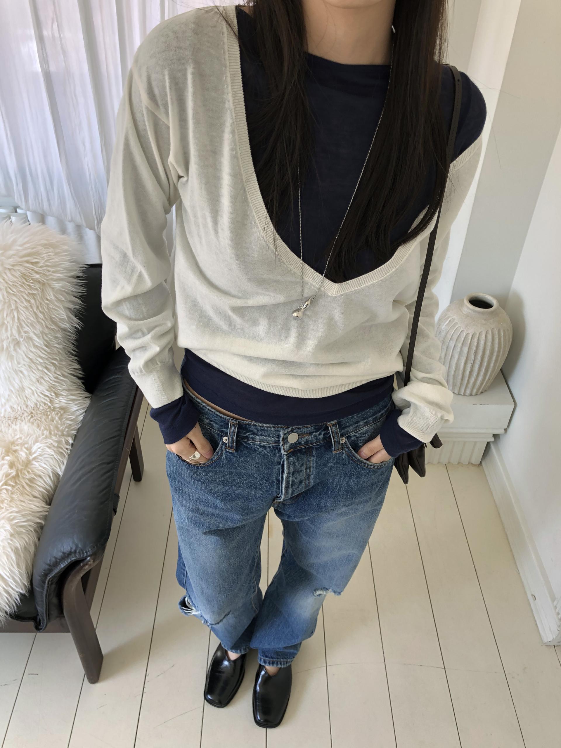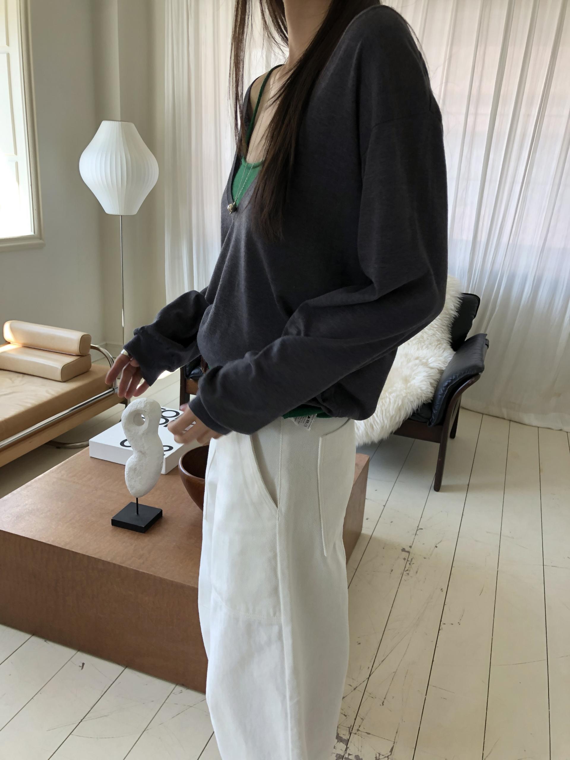 깊은 네크라인과 텁텁하지 않게 착용되는 얇은 두께감. 봄 시즌 브이넥 니트를 고르며 가장 중요하게 생각했던 두가지를 모두 담아낸 아이템입니다.