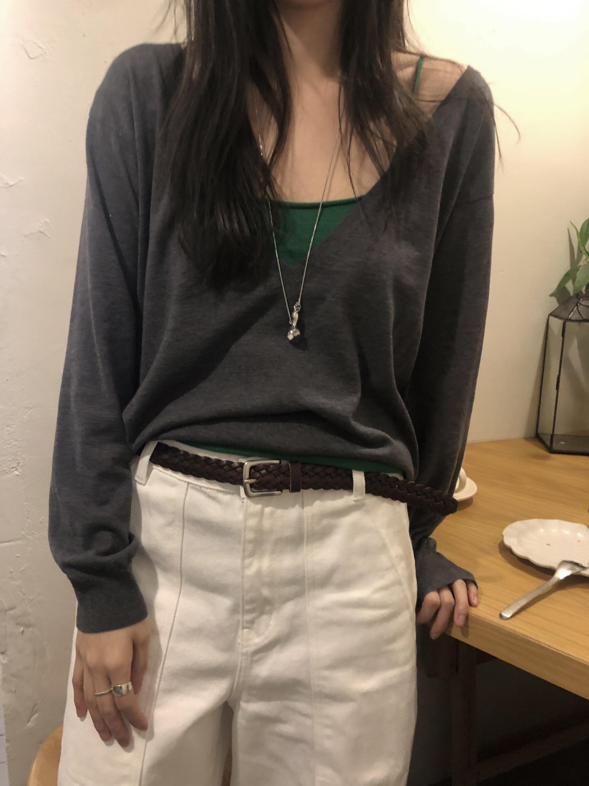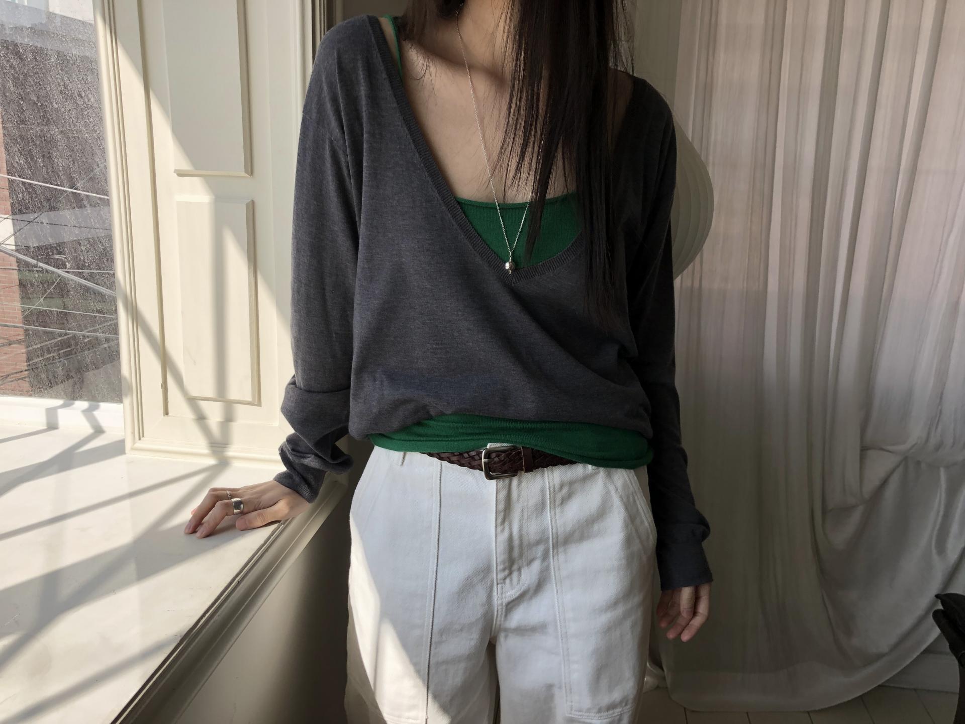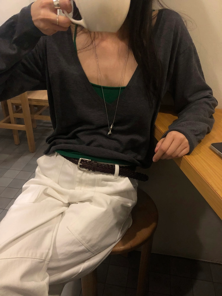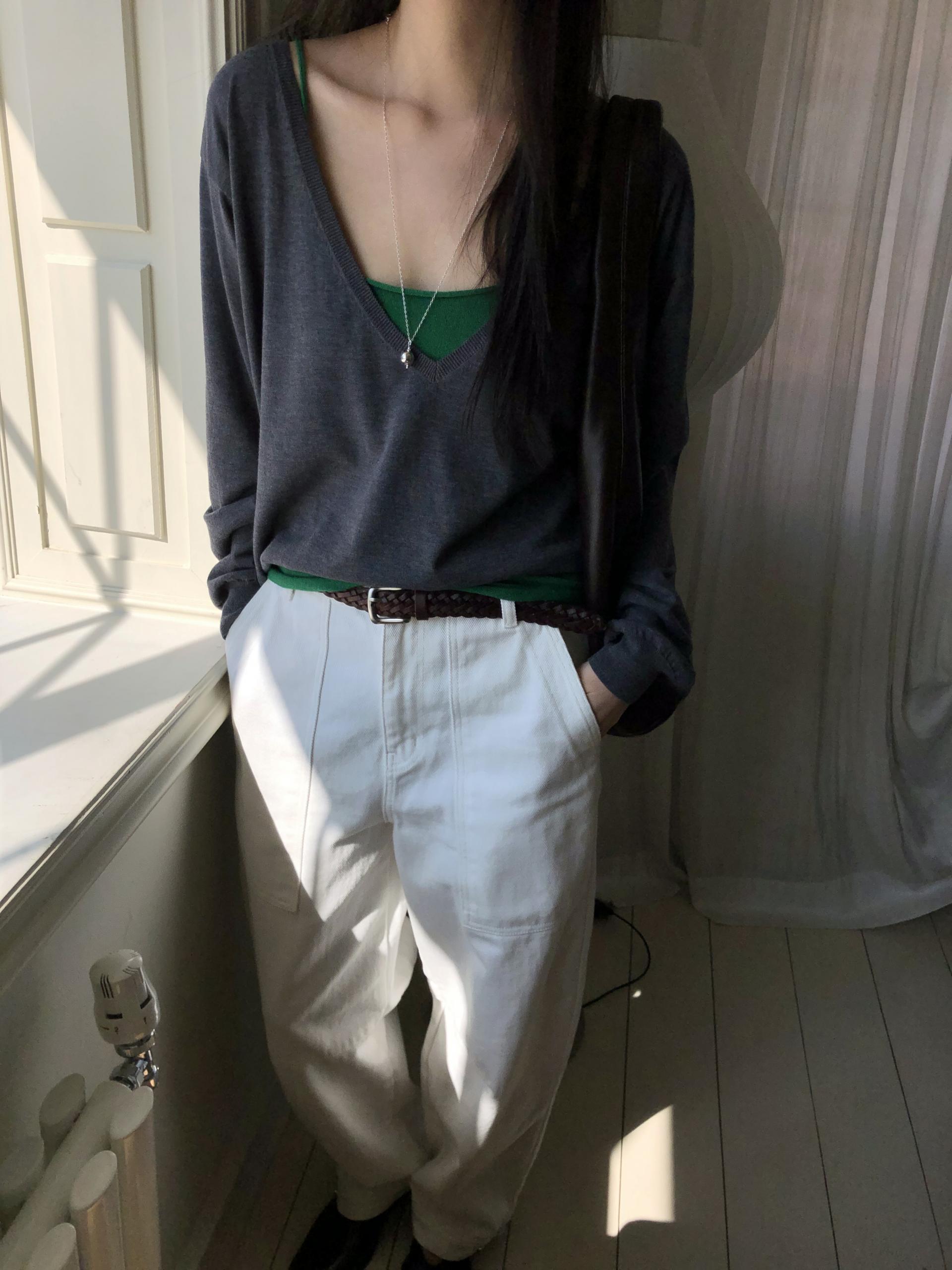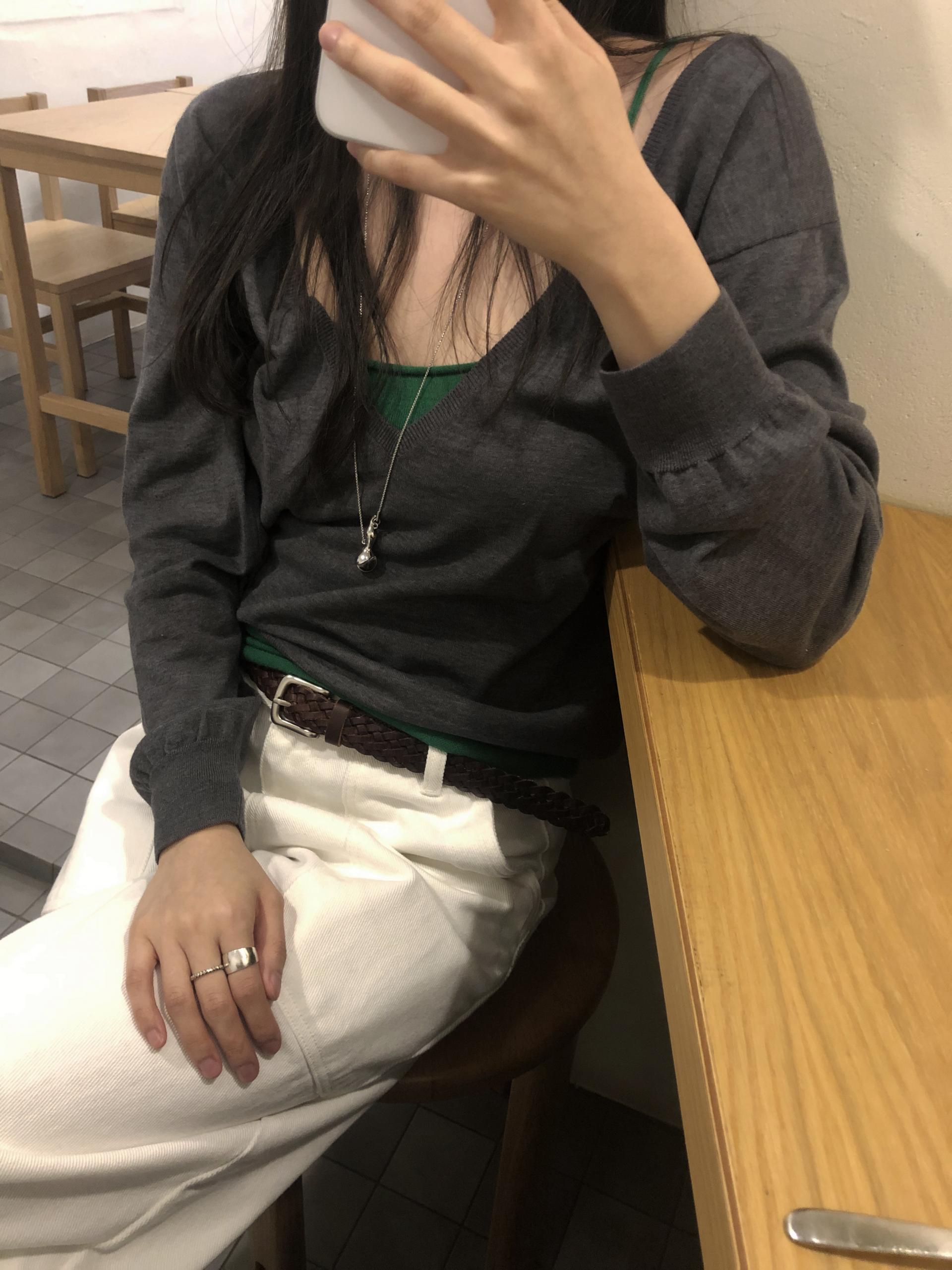 깊은 네크라인과 텁텁하지 않게 착용되는 얇은 두께감. 봄 시즌 브이넥 니트를 고르며 가장 중요하게 생각했던 두가지를 모두 담아낸 아이템입니다.