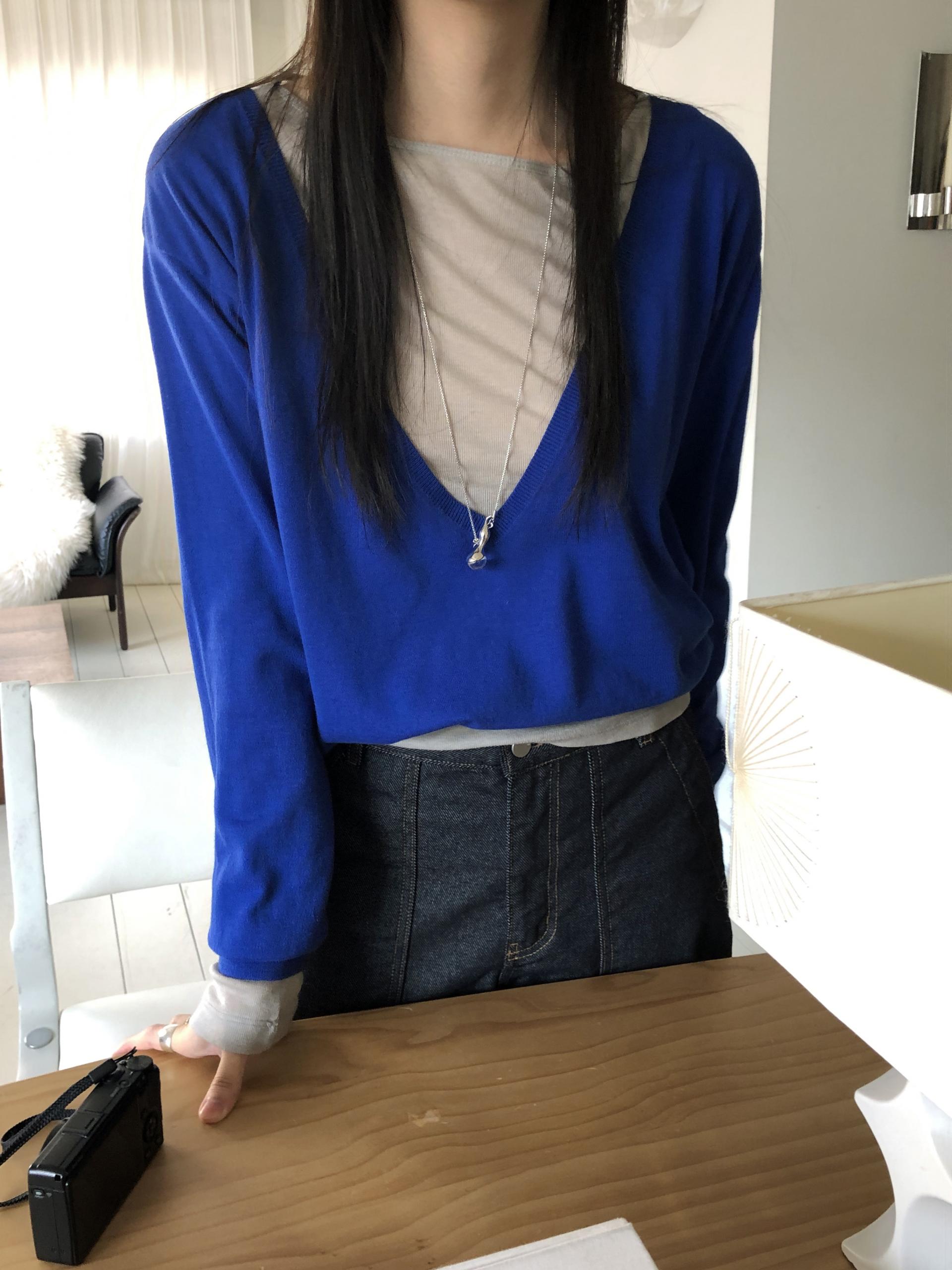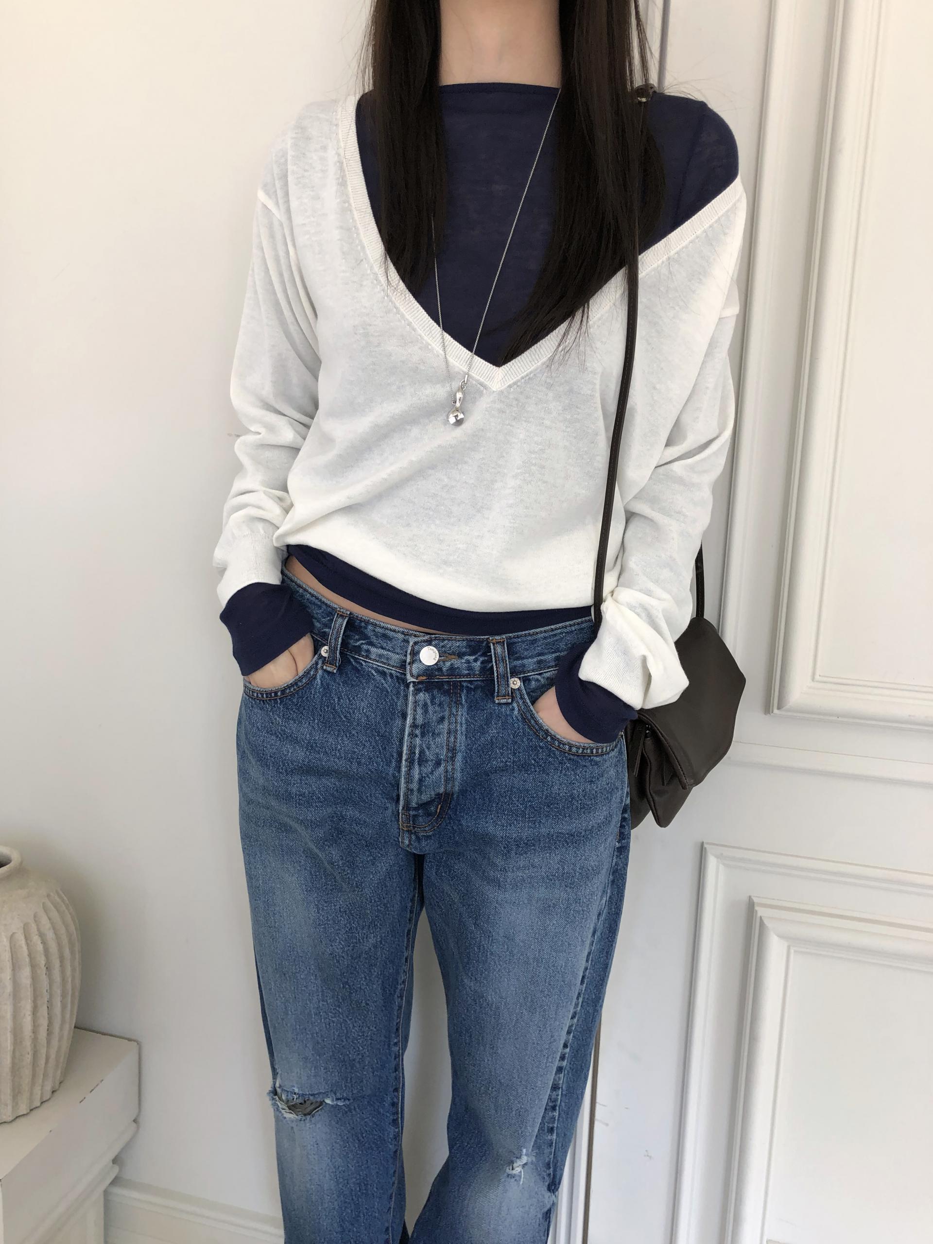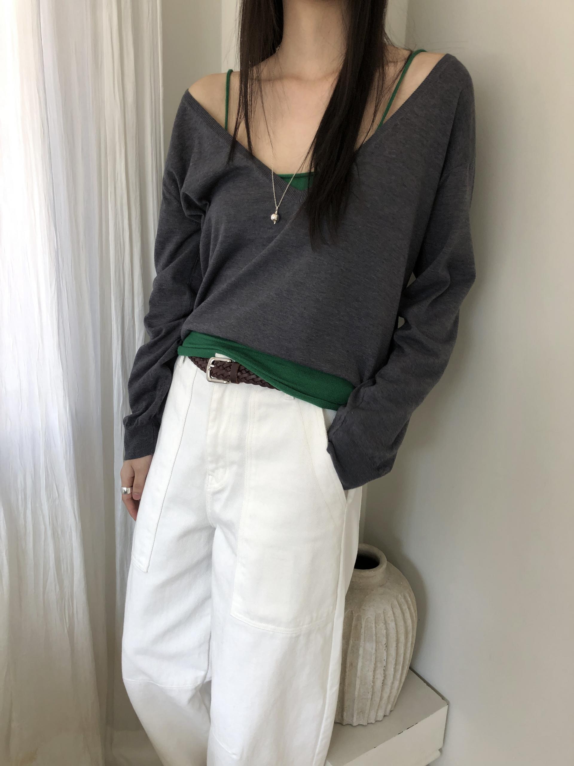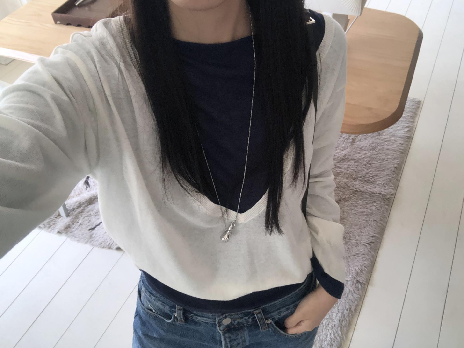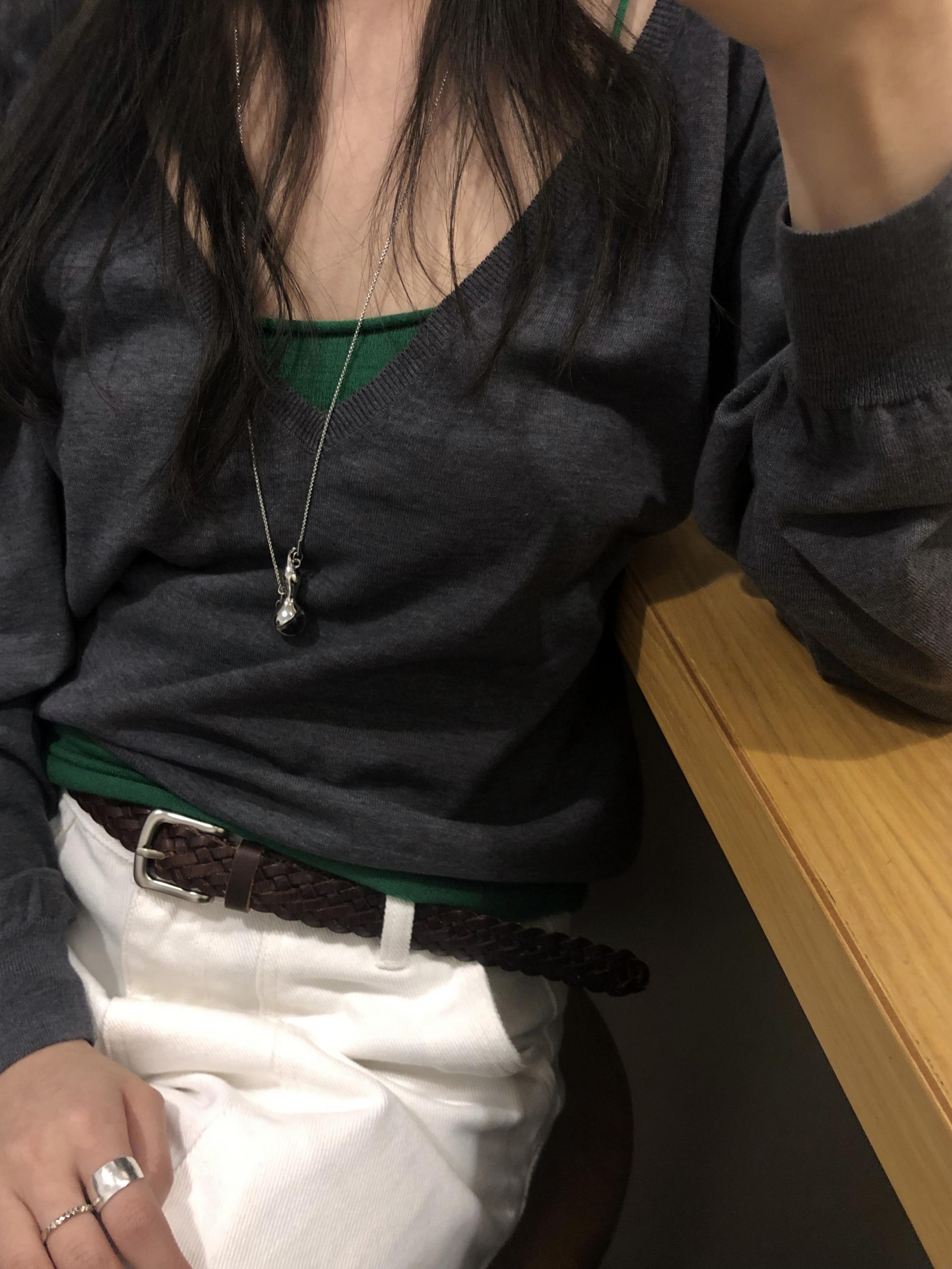 깊은 네크라인과 텁텁하지 않게 착용되는 얇은 두께감. 봄 시즌 브이넥 니트를 고르며 가장 중요하게 생각했던 두가지를 모두 담아낸 아이템입니다.