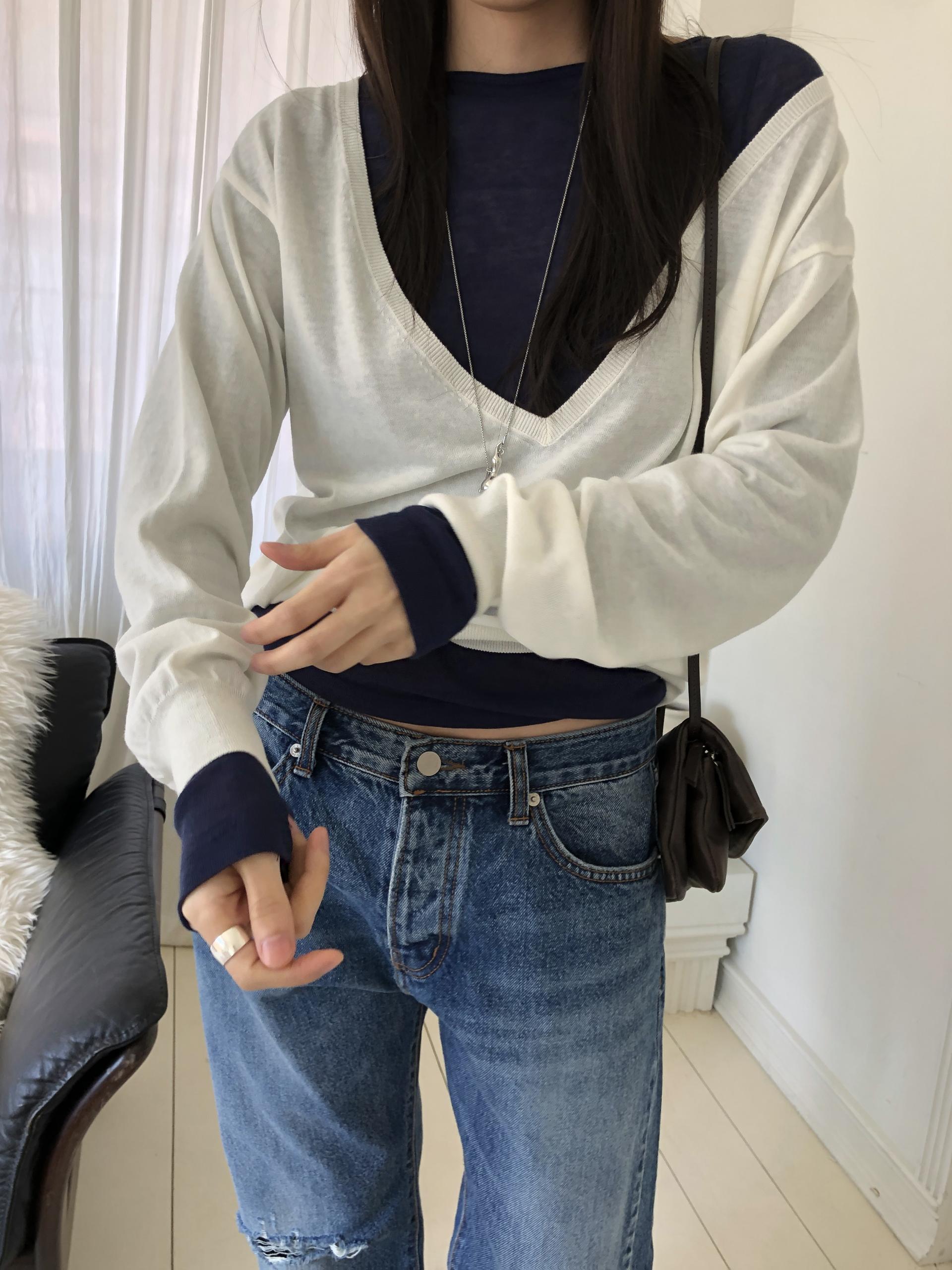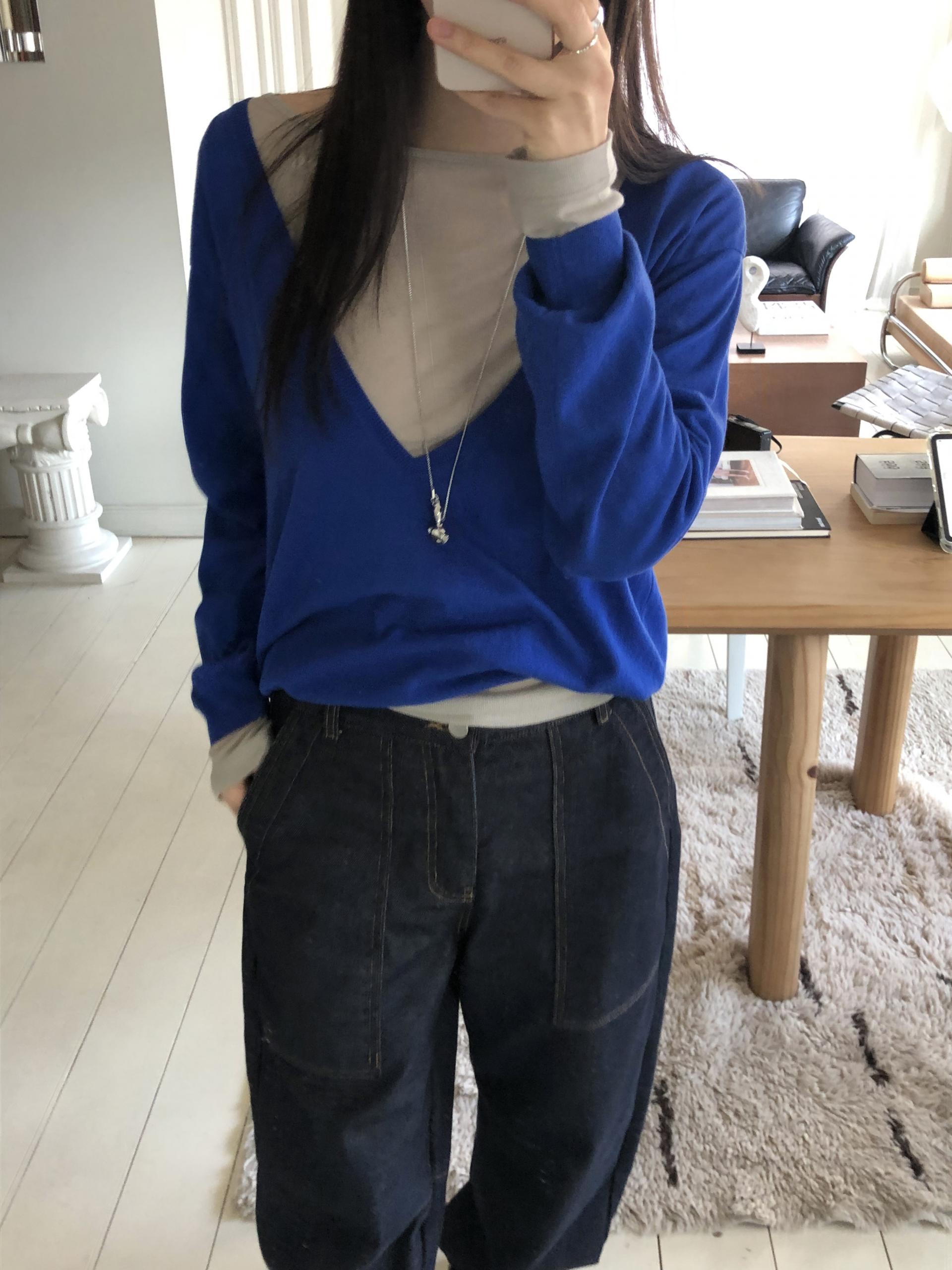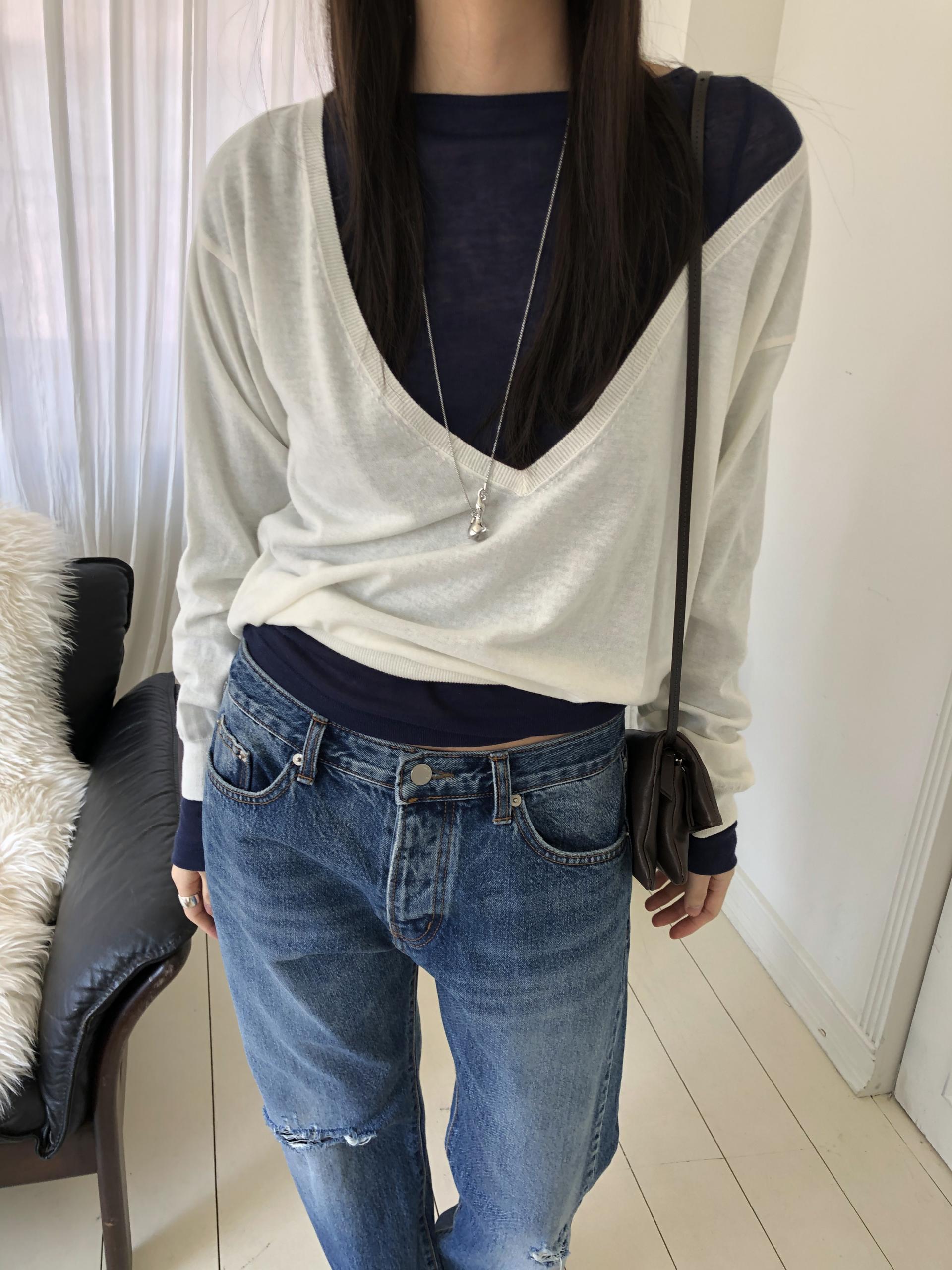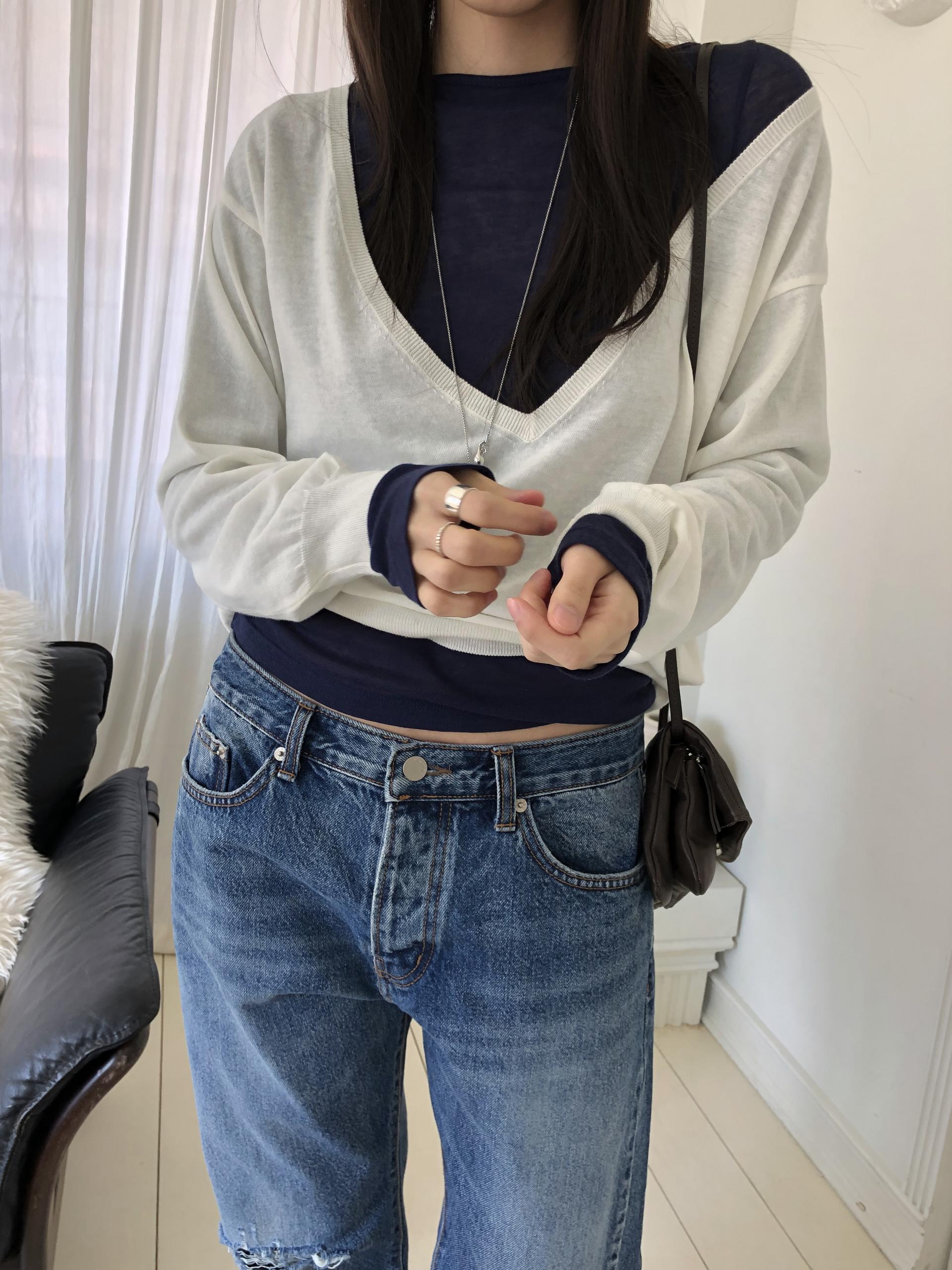 깊은 네크라인과 텁텁하지 않게 착용되는 얇은 두께감. 봄 시즌 브이넥 니트를 고르며 가장 중요하게 생각했던 두가지를 모두 담아낸 아이템입니다.