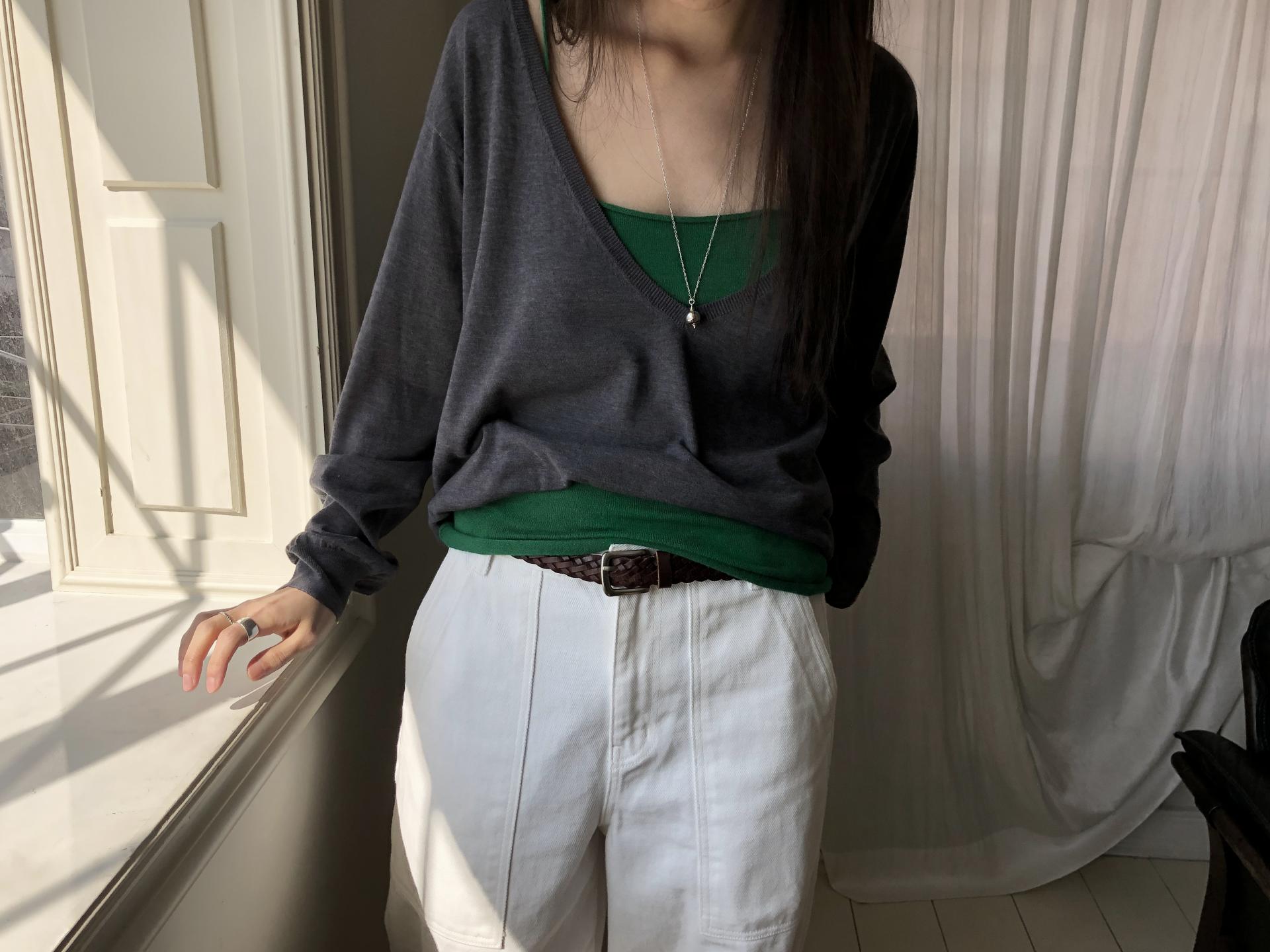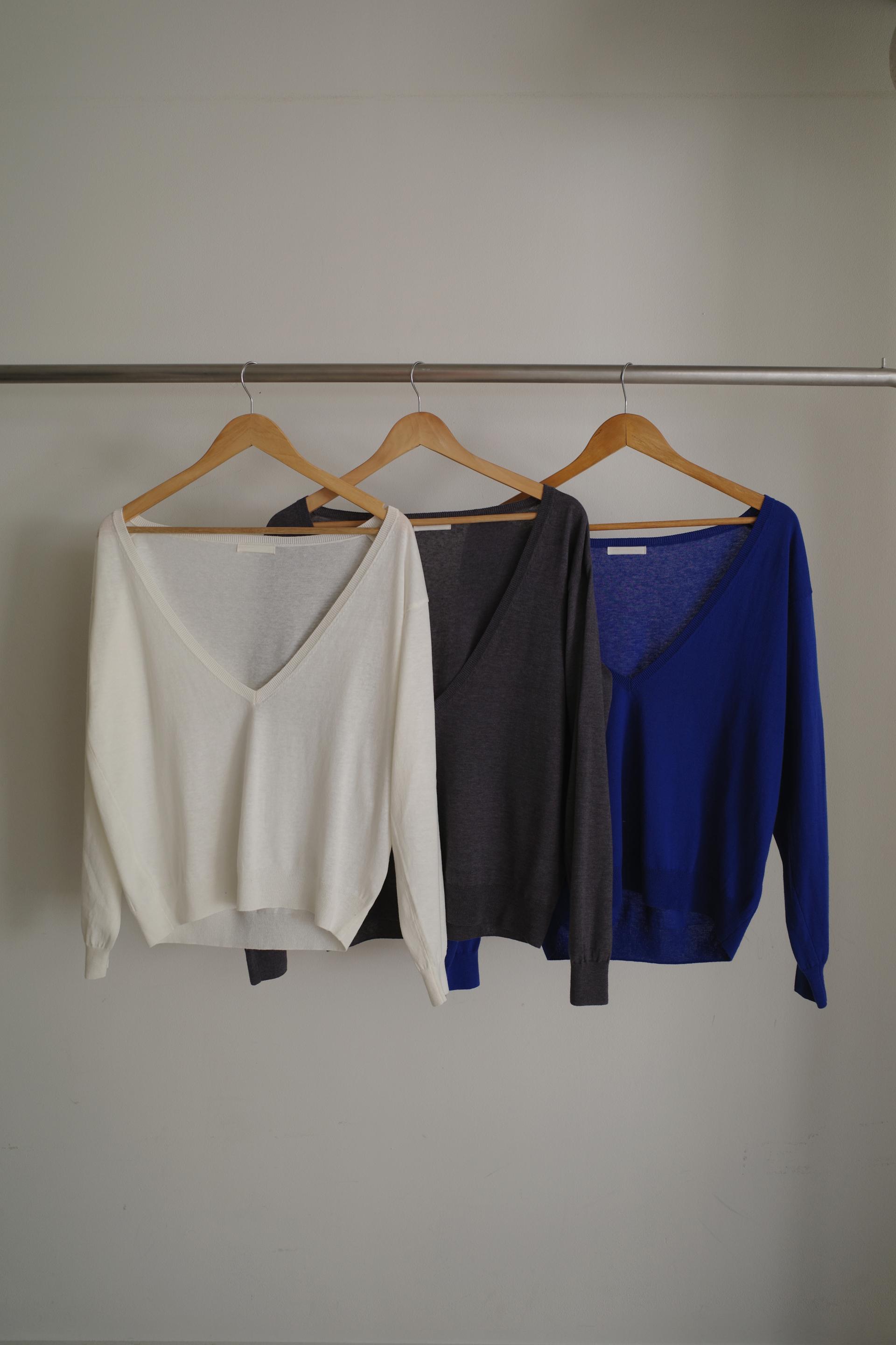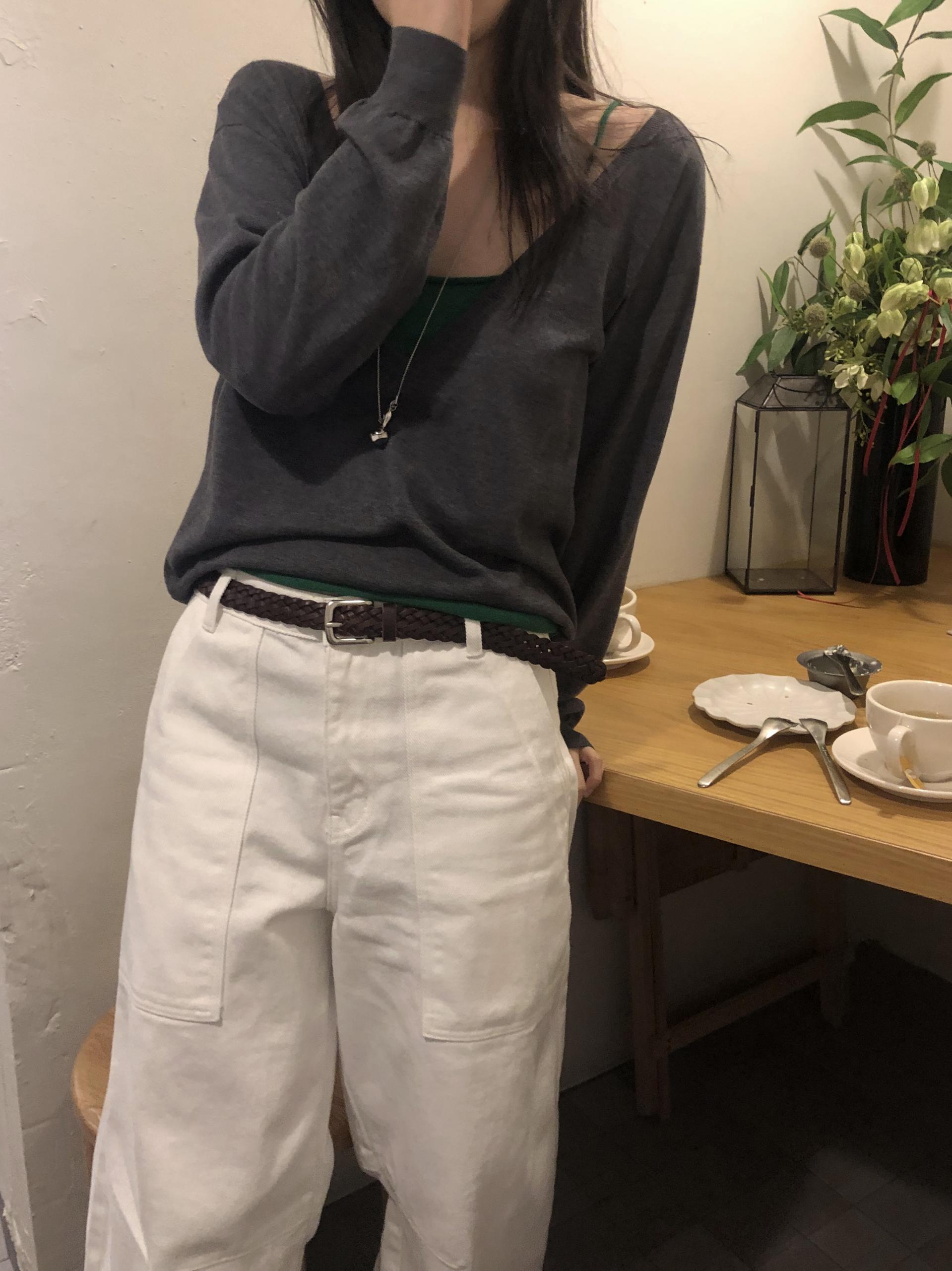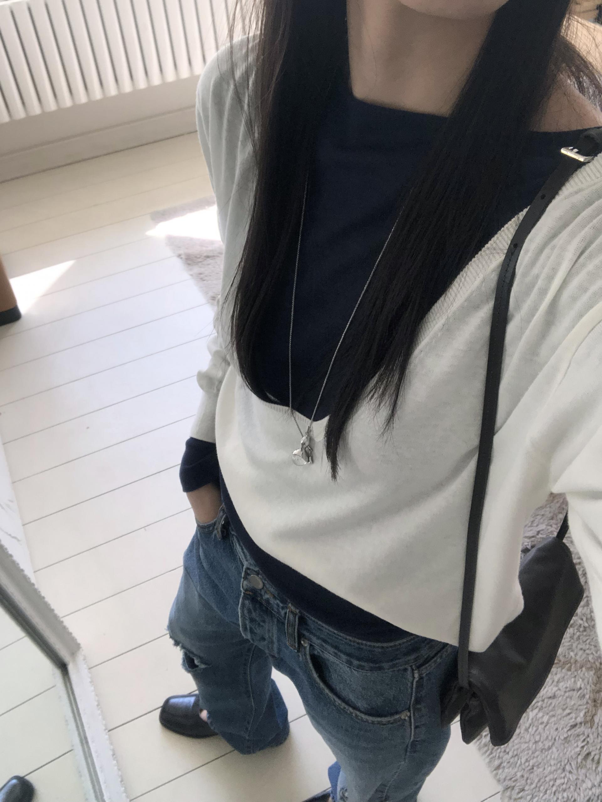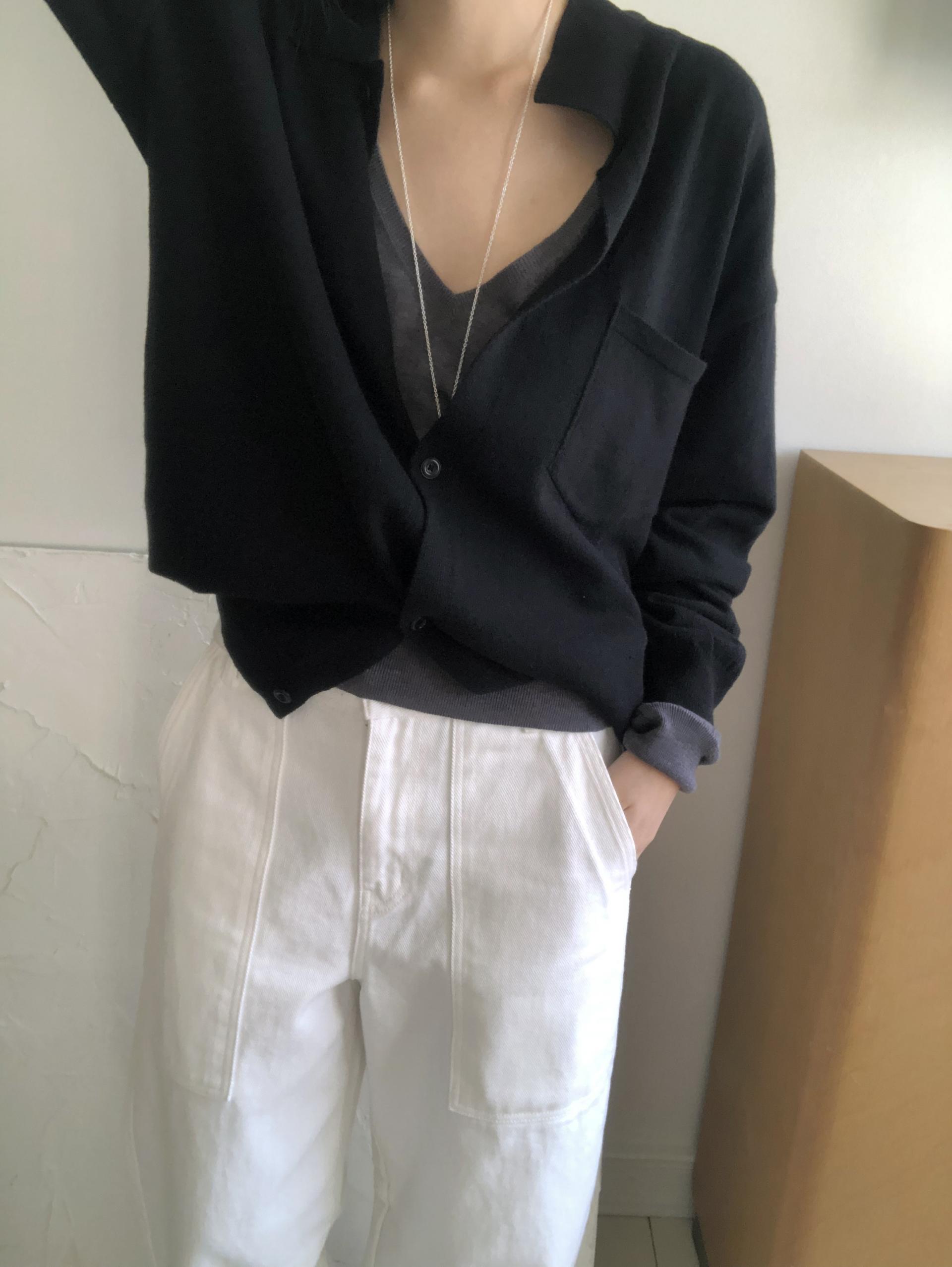 깊은 네크라인과 텁텁하지 않게 착용되는 얇은 두께감. 봄 시즌 브이넥 니트를 고르며 가장 중요하게 생각했던 두가지를 모두 담아낸 아이템입니다.