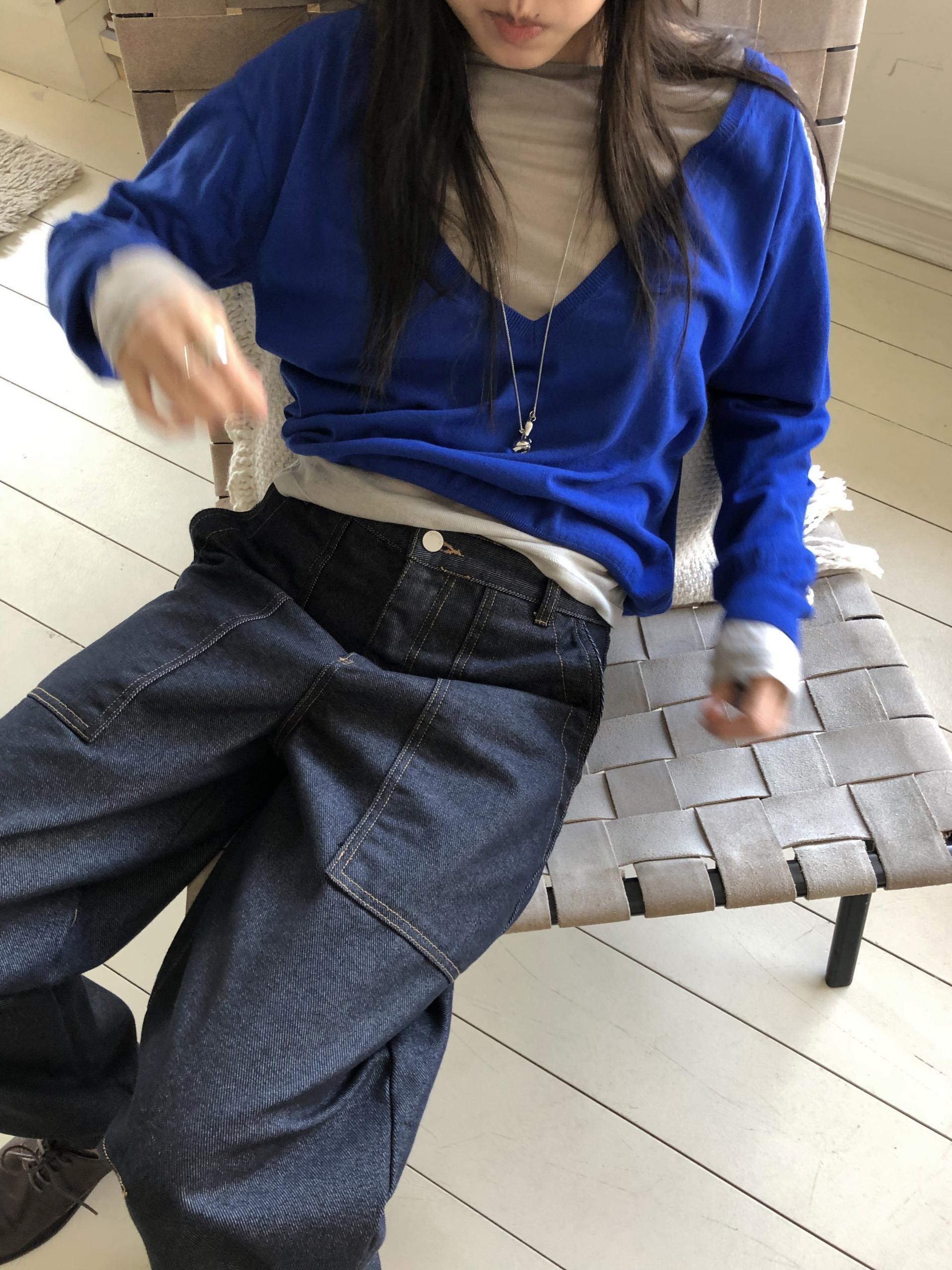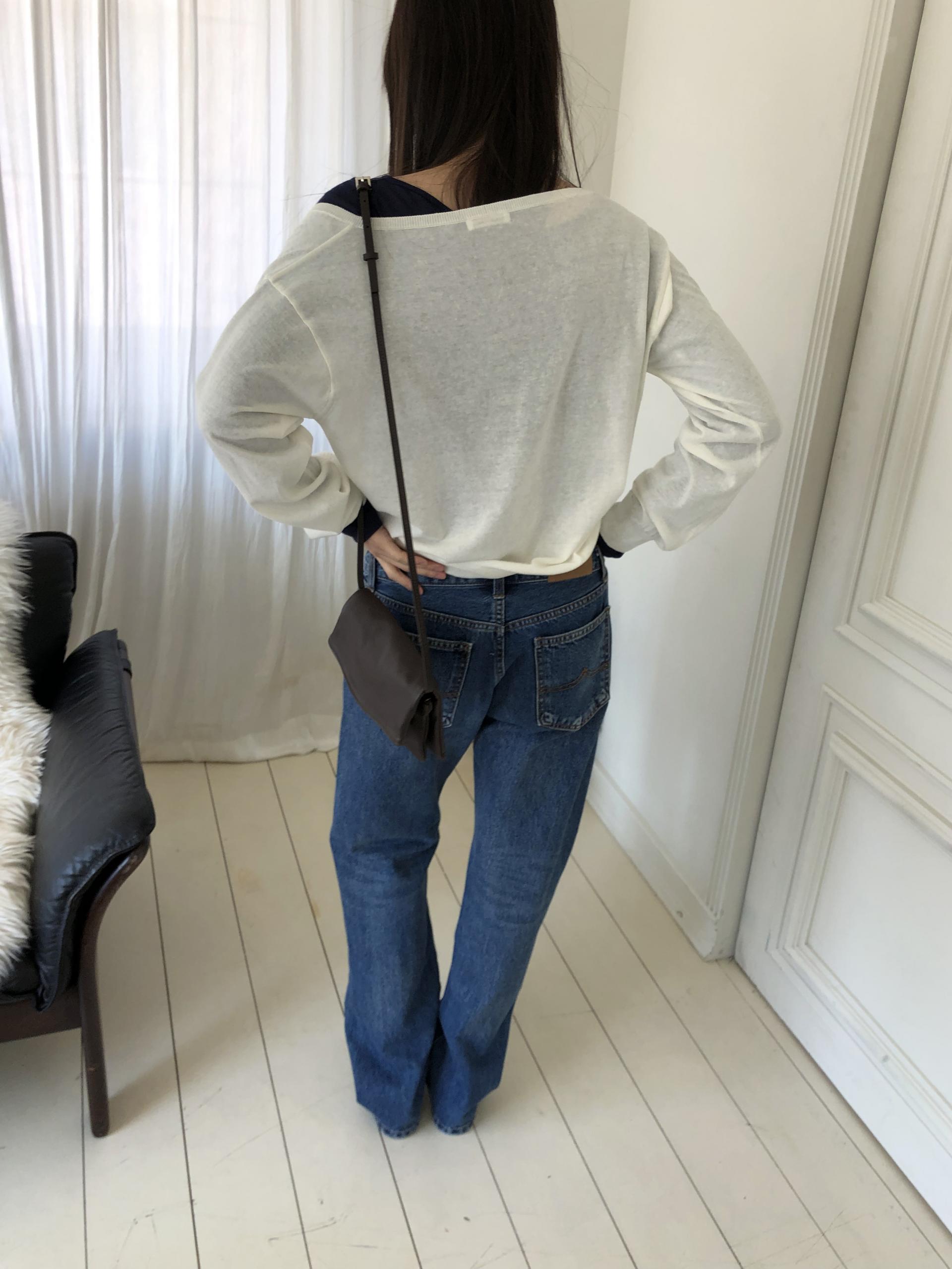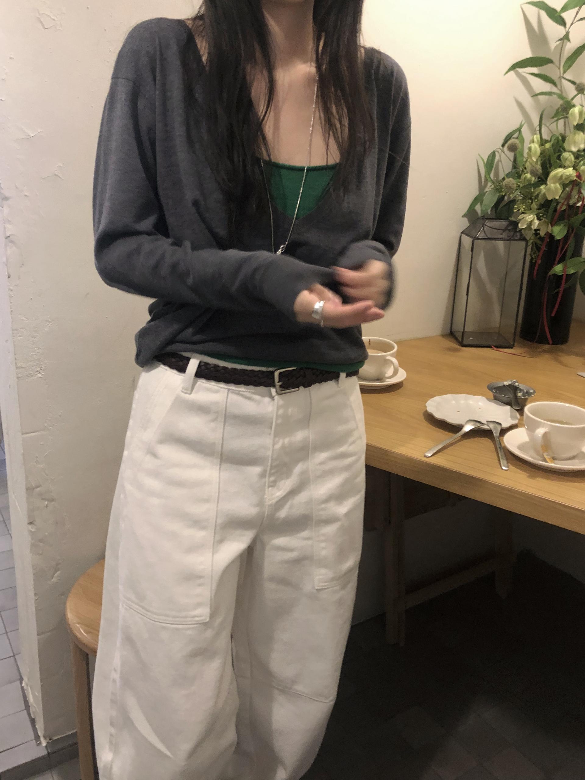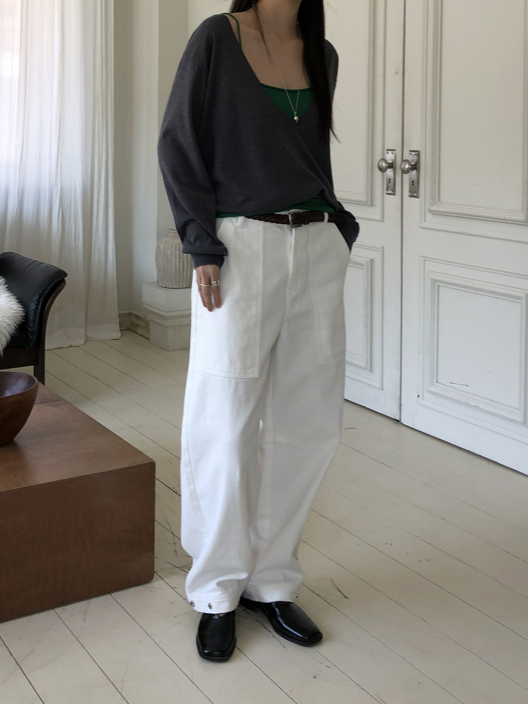 깊은 네크라인과 텁텁하지 않게 착용되는 얇은 두께감. 봄 시즌 브이넥 니트를 고르며 가장 중요하게 생각했던 두가지를 모두 담아낸 아이템입니다.