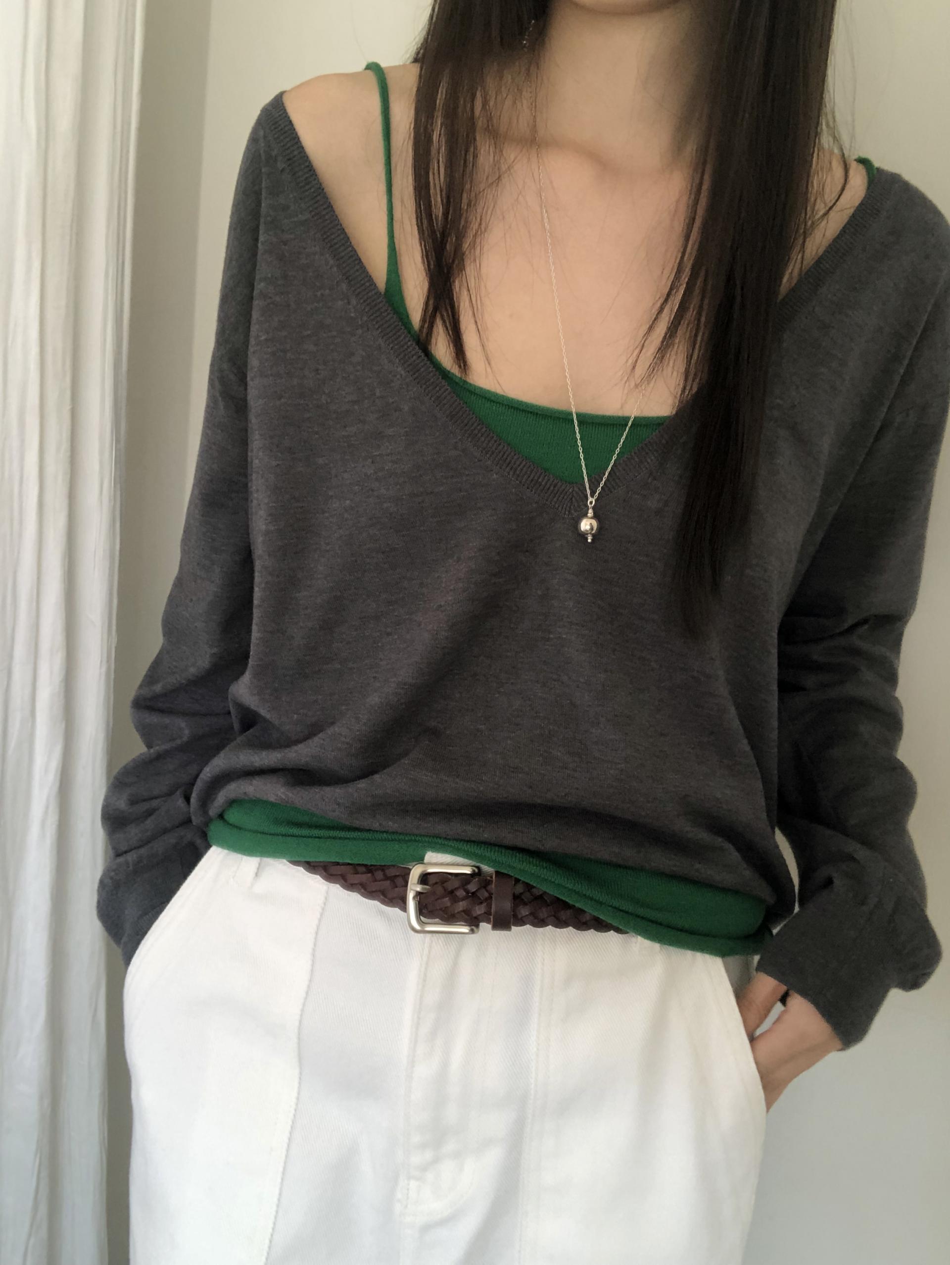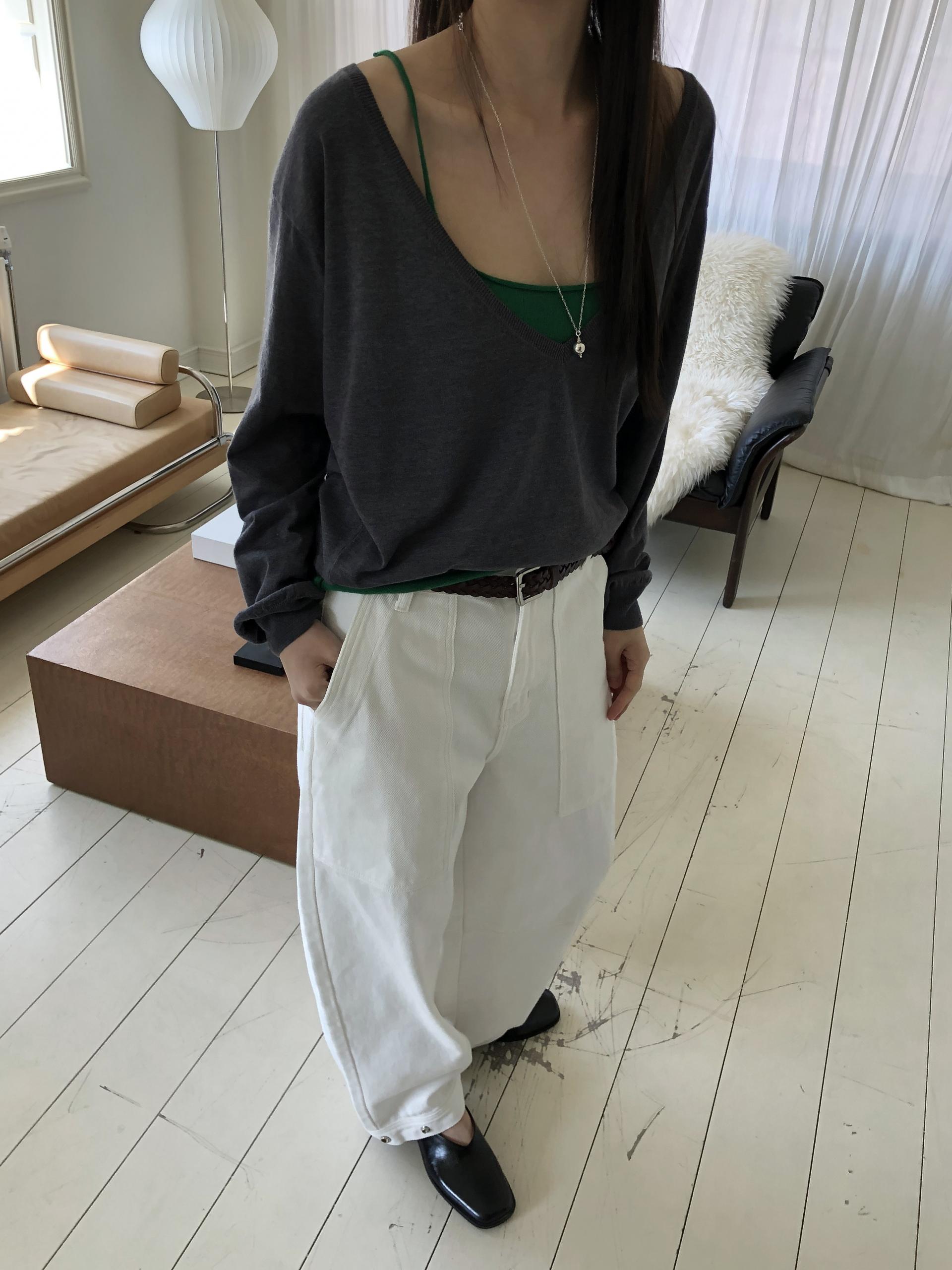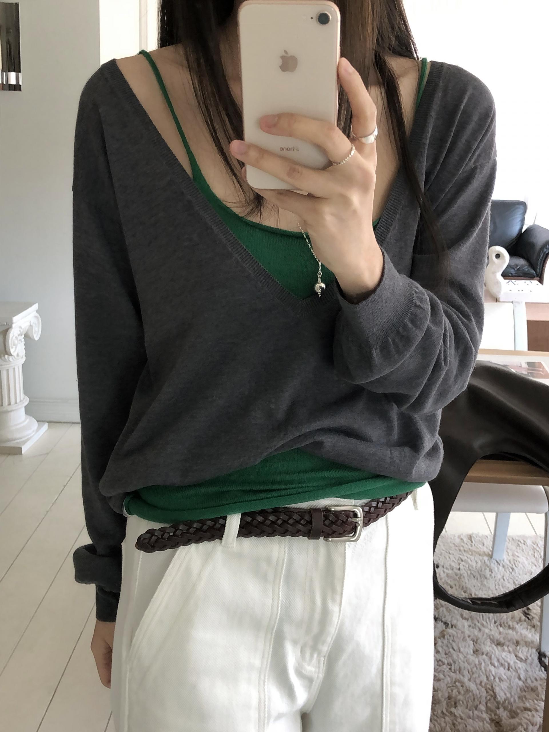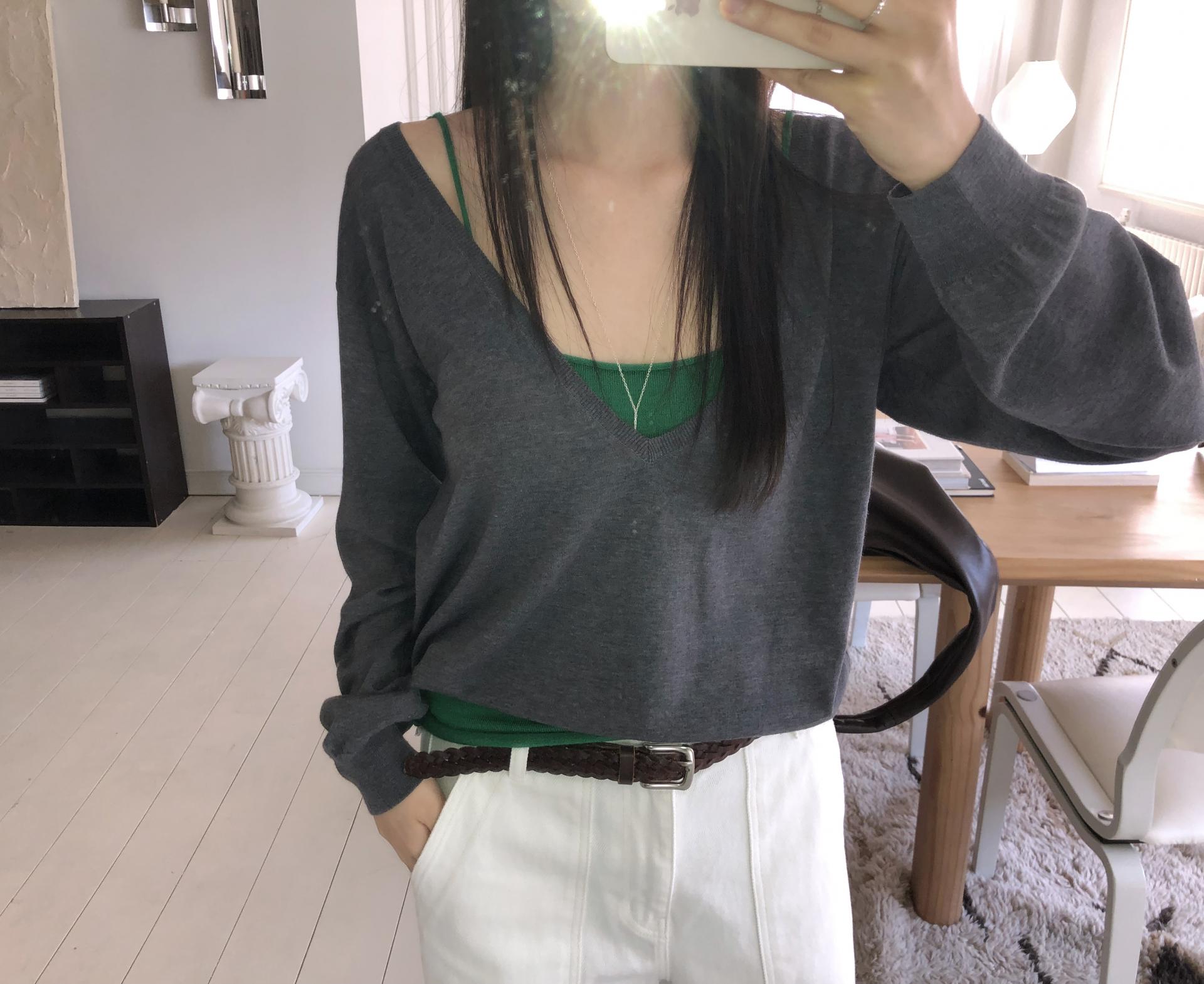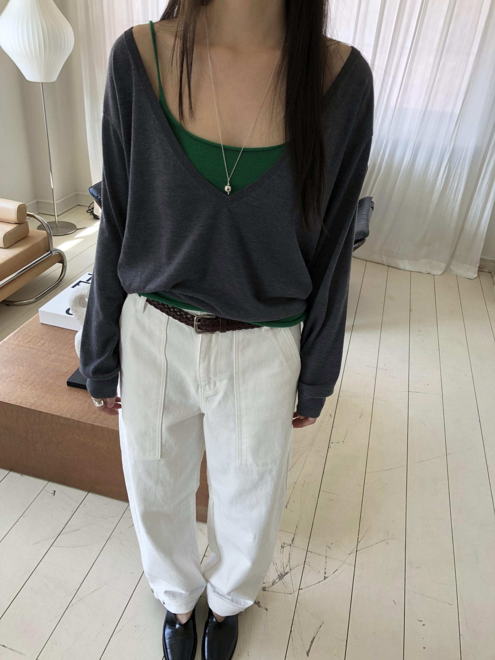 적당히 루즈한 핏으로 여유로운 실루엣을 보여주며 딥하게 파인 네크라인으로 이너 레이어드를 추천드립니다. 얇고 가벼운 두께감이라 이너를 더했을 때도 답답하지 않아 좋아요. 레이스 포인트의 슬리브리스나 미니멀한 민소매, 얇은 티셔츠나 블라우스 등 레이어드하는 재미가 쏠쏠하답니다. 브이넥의 여백이 깊어 이너에 따라 전혀 다른 무드를 연출합니다.