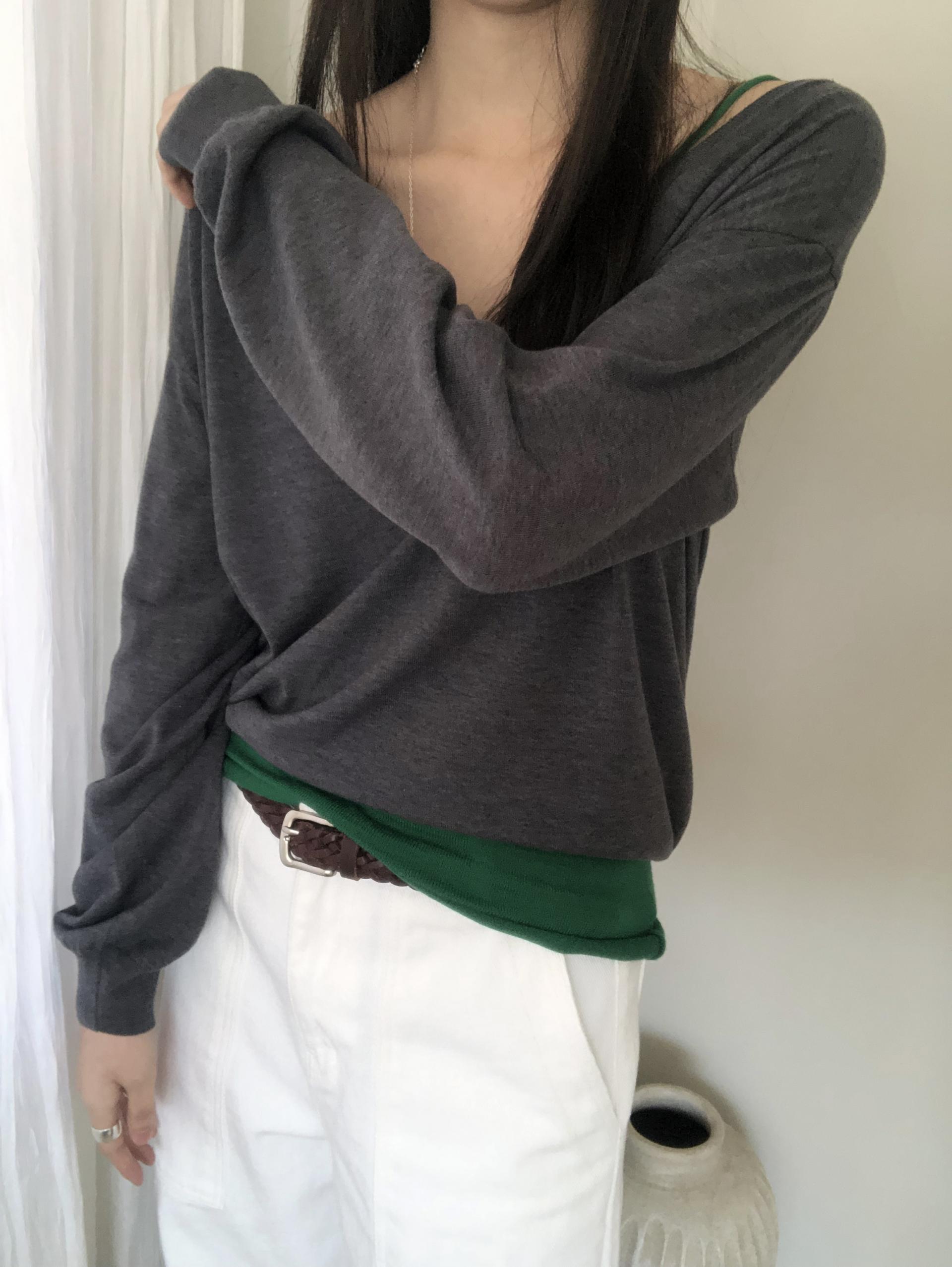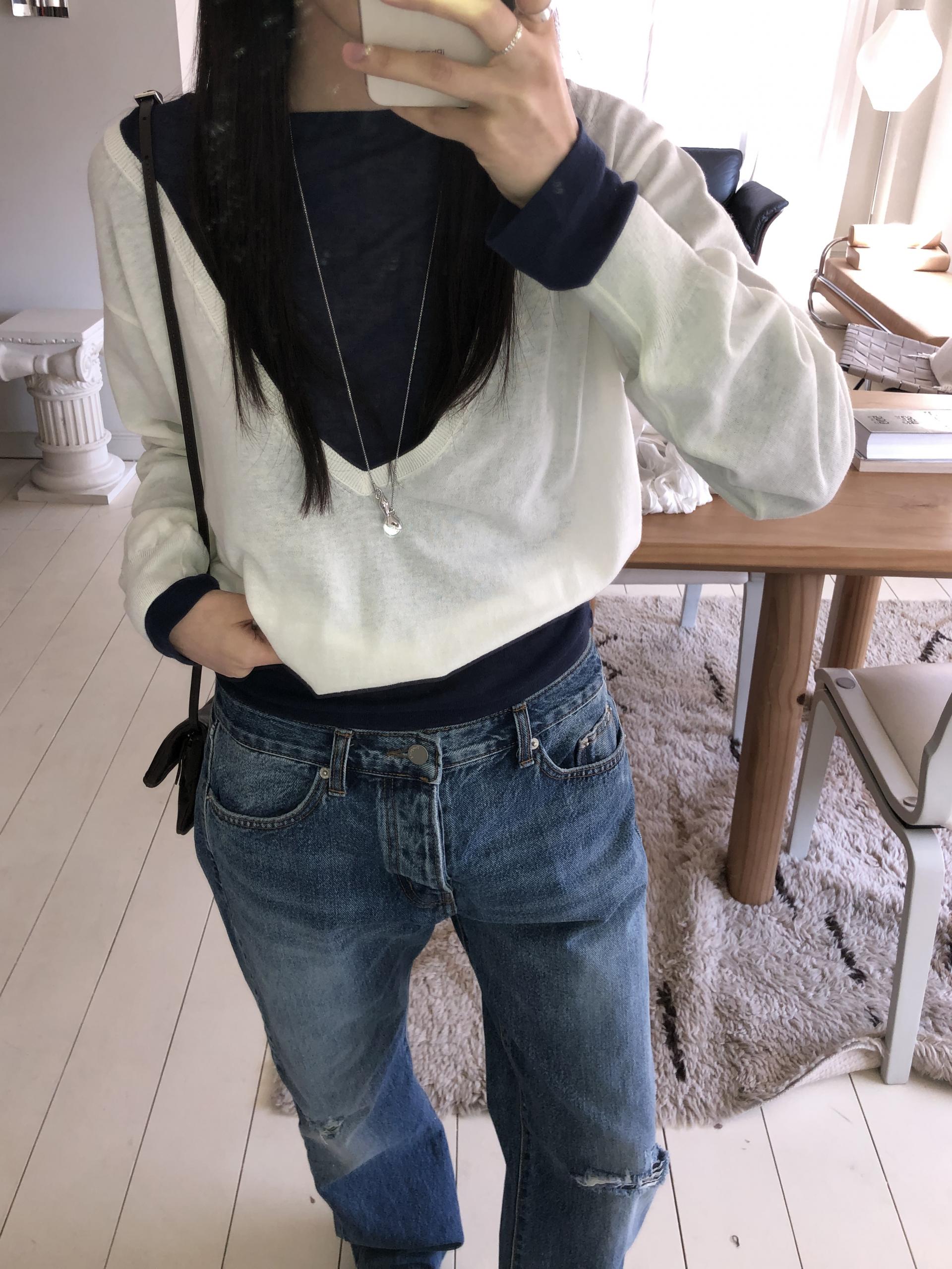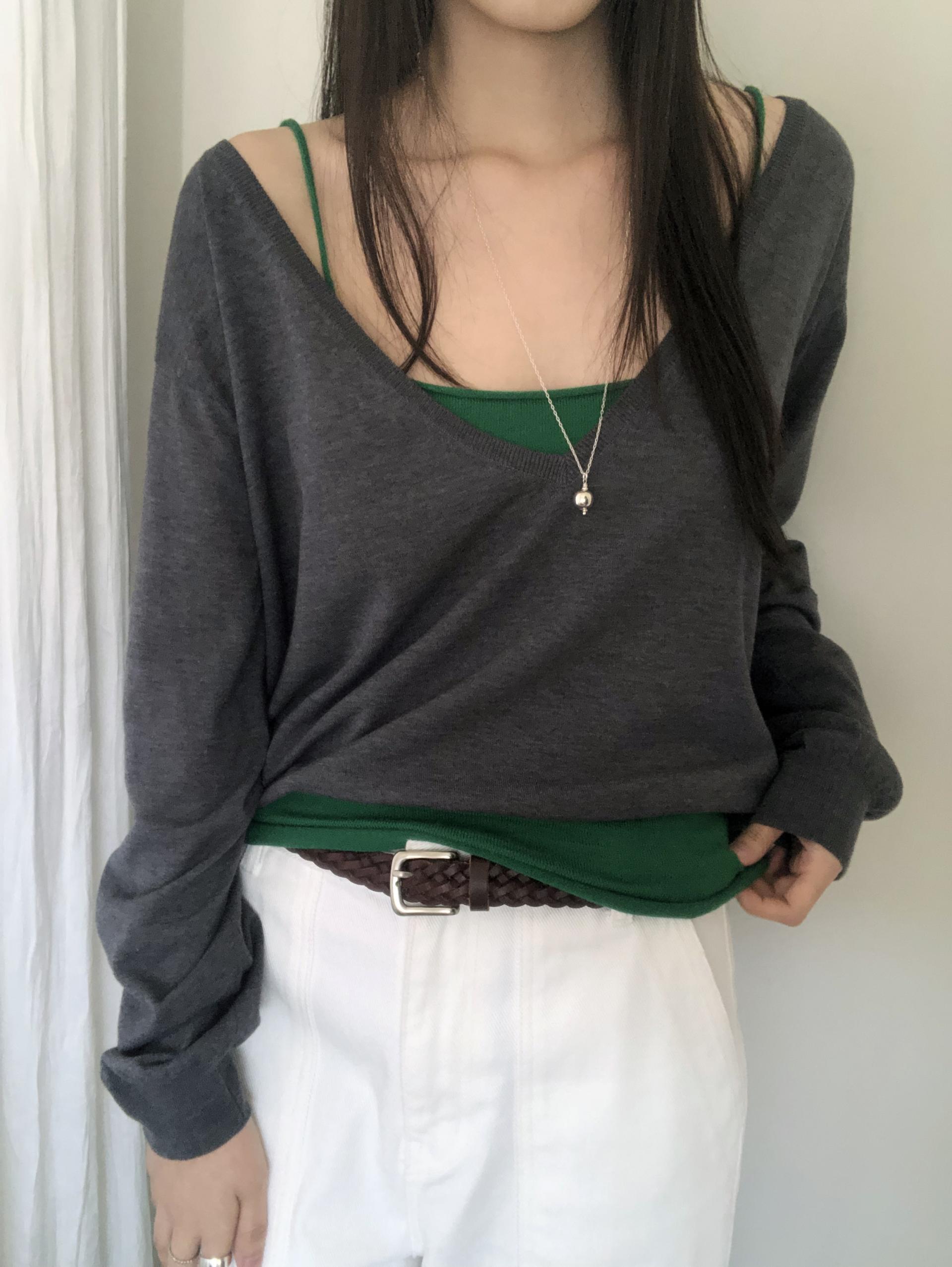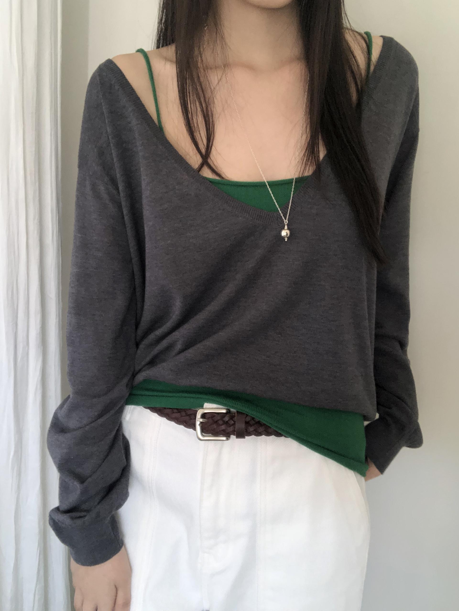 적당히 루즈한 핏으로 여유로운 실루엣을 보여주며 딥하게 파인 네크라인으로 이너 레이어드를 추천드립니다. 얇고 가벼운 두께감이라 이너를 더했을 때도 답답하지 않아 좋아요. 레이스 포인트의 슬리브리스나 미니멀한 민소매, 얇은 티셔츠나 블라우스 등 레이어드하는 재미가 쏠쏠하답니다. 브이넥의 여백이 깊어 이너에 따라 전혀 다른 무드를 연출합니다.