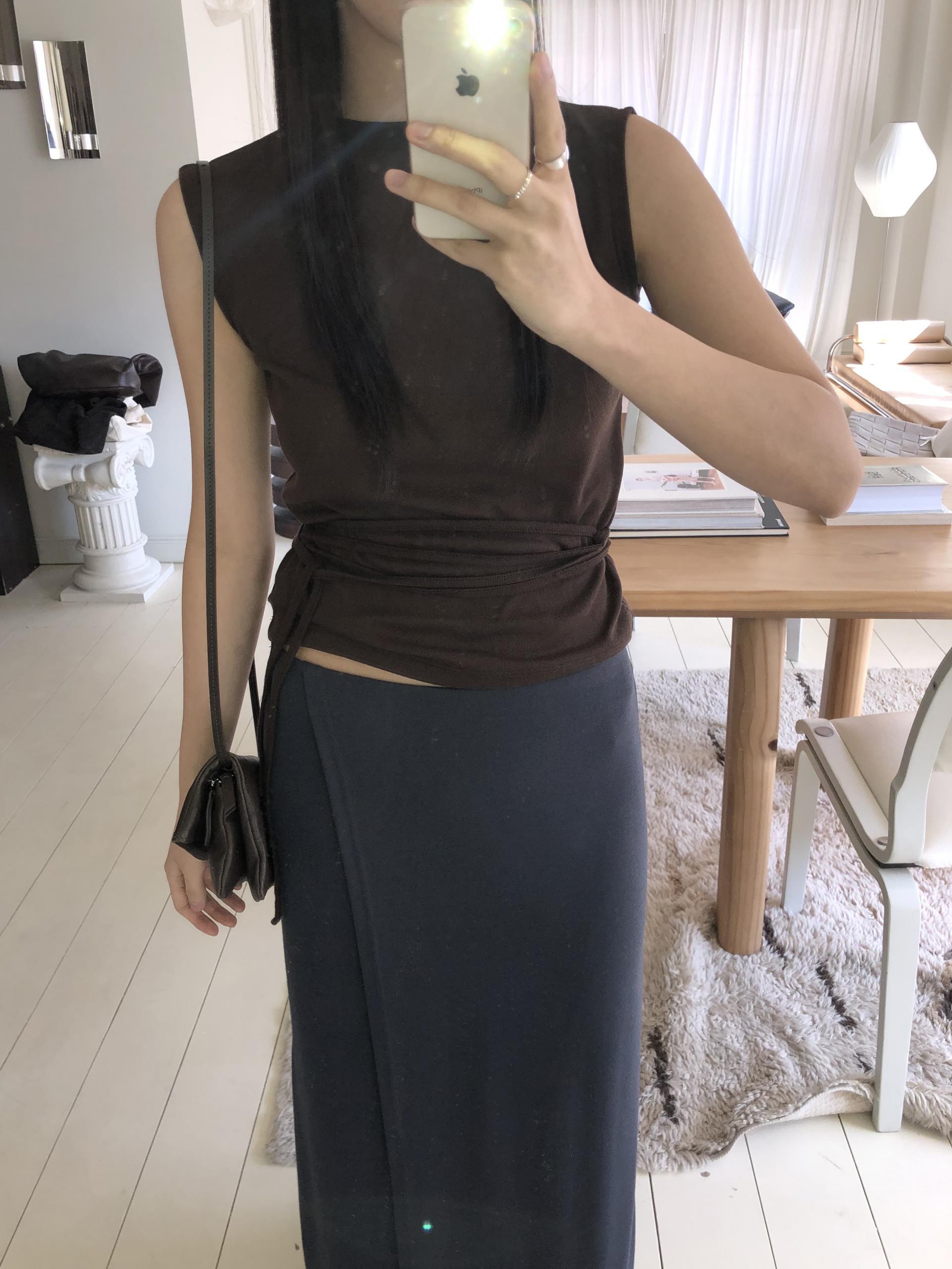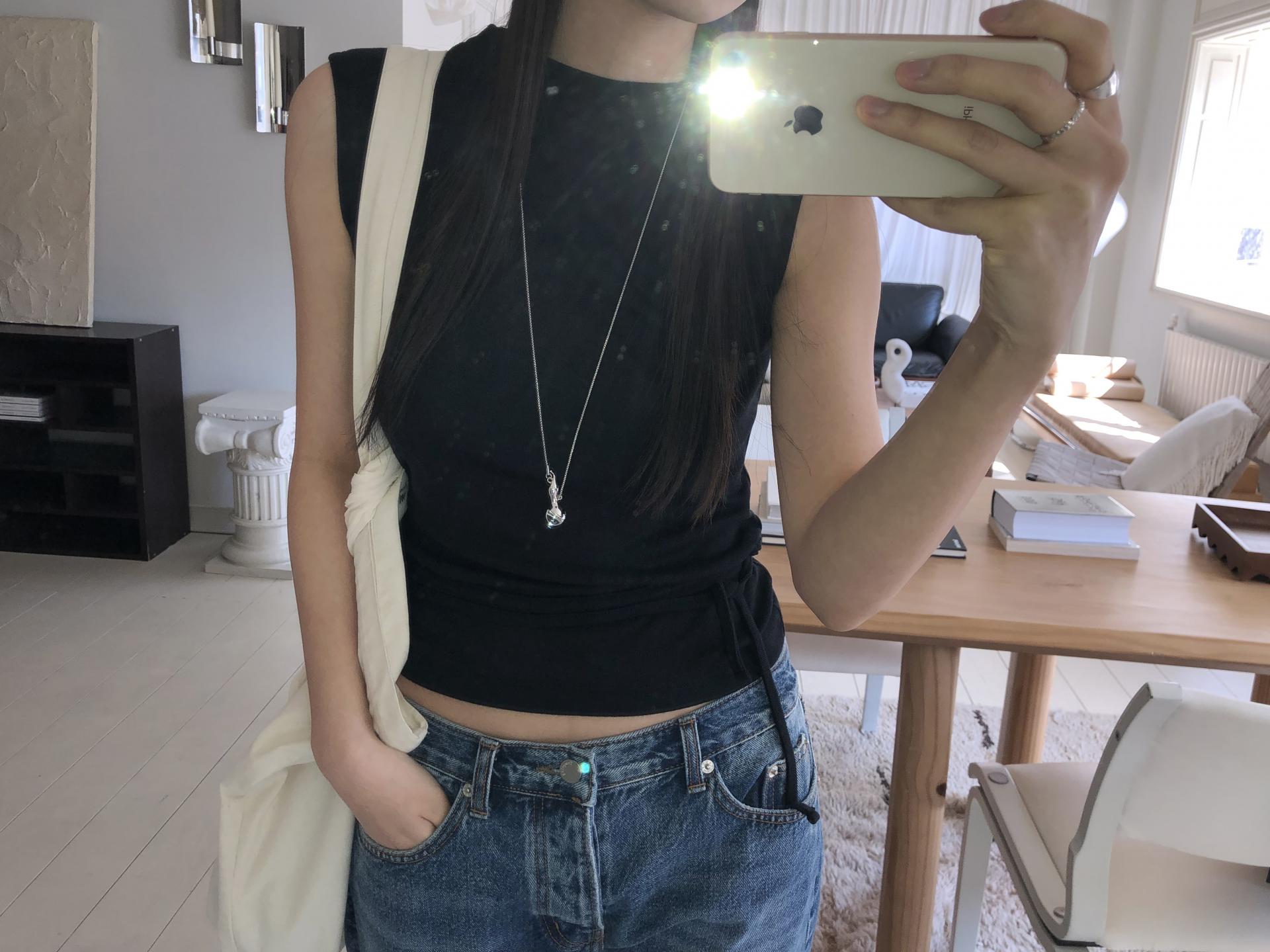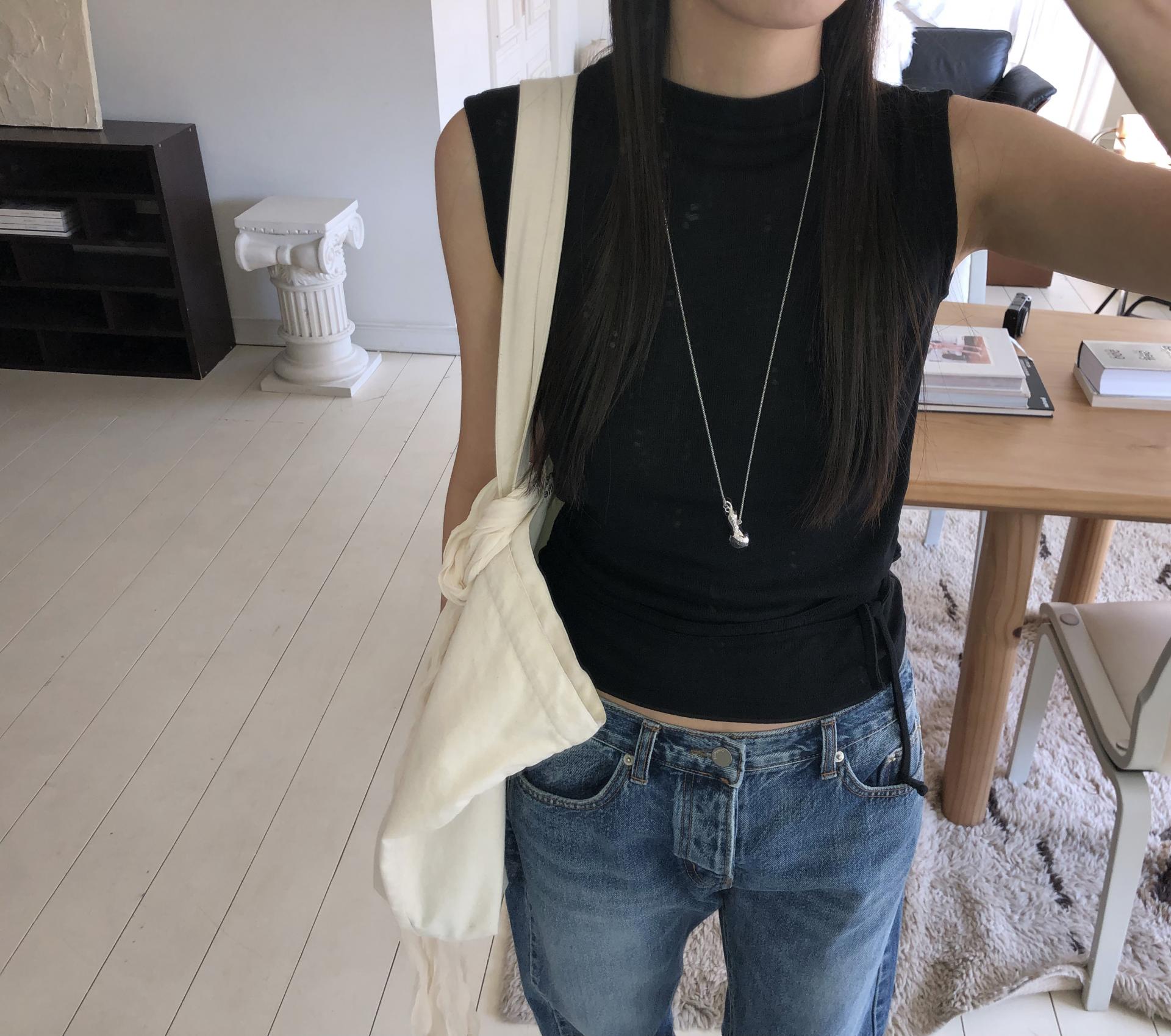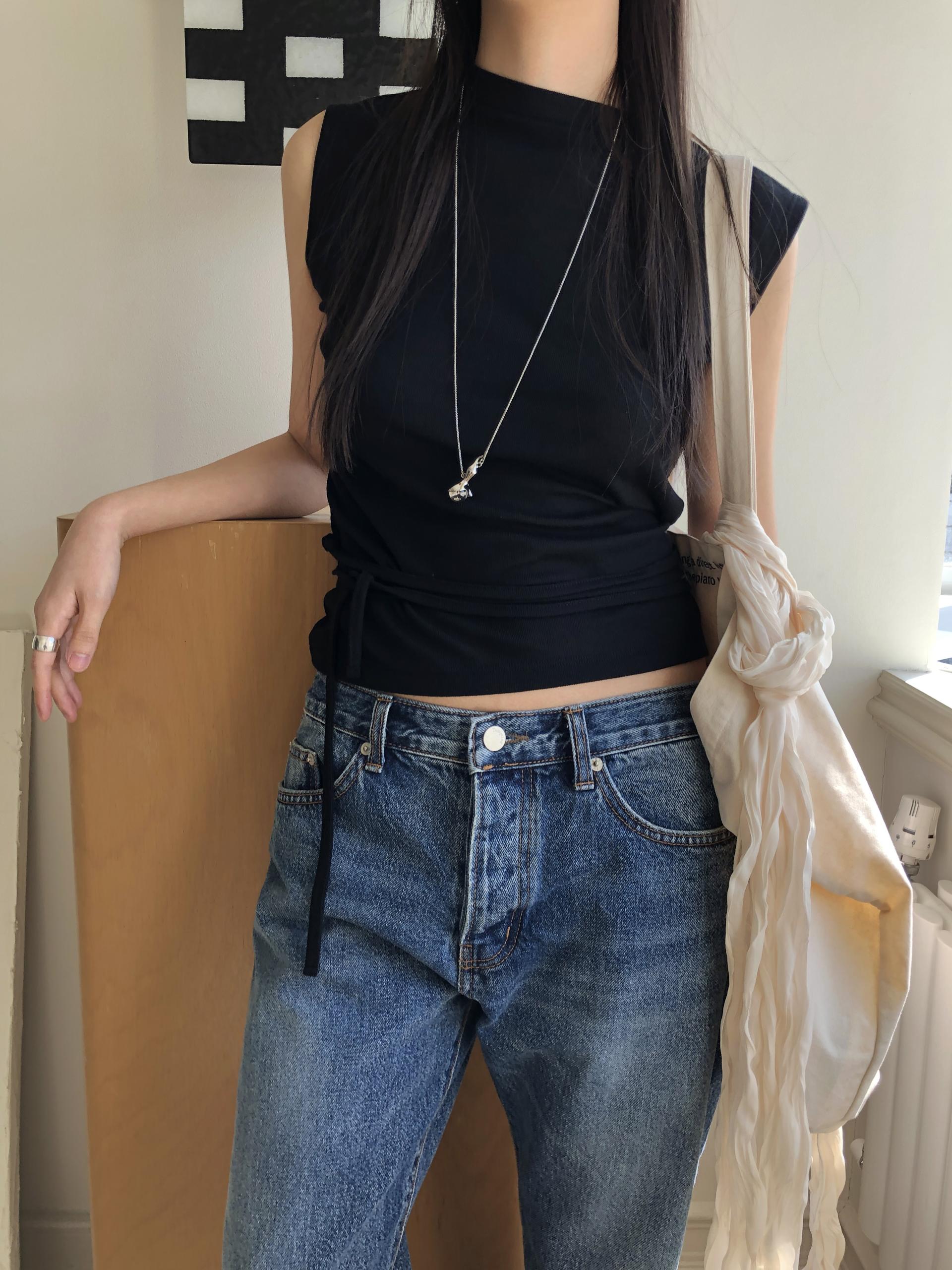 약하게 올라오는 라운드넥과 깔끔하게 떨어지는 어깨 라인이 미니멀하고 클린한 핏을 만들어줍니다. 탈부착이 가능한 끈을 허리 고리에 걸어 연출할 수 있습니다. 베이직한 탑에서 디테일있는 탑으로 바뀌어 단독은 물론 포인트 이너로 활용하기 좋아요.