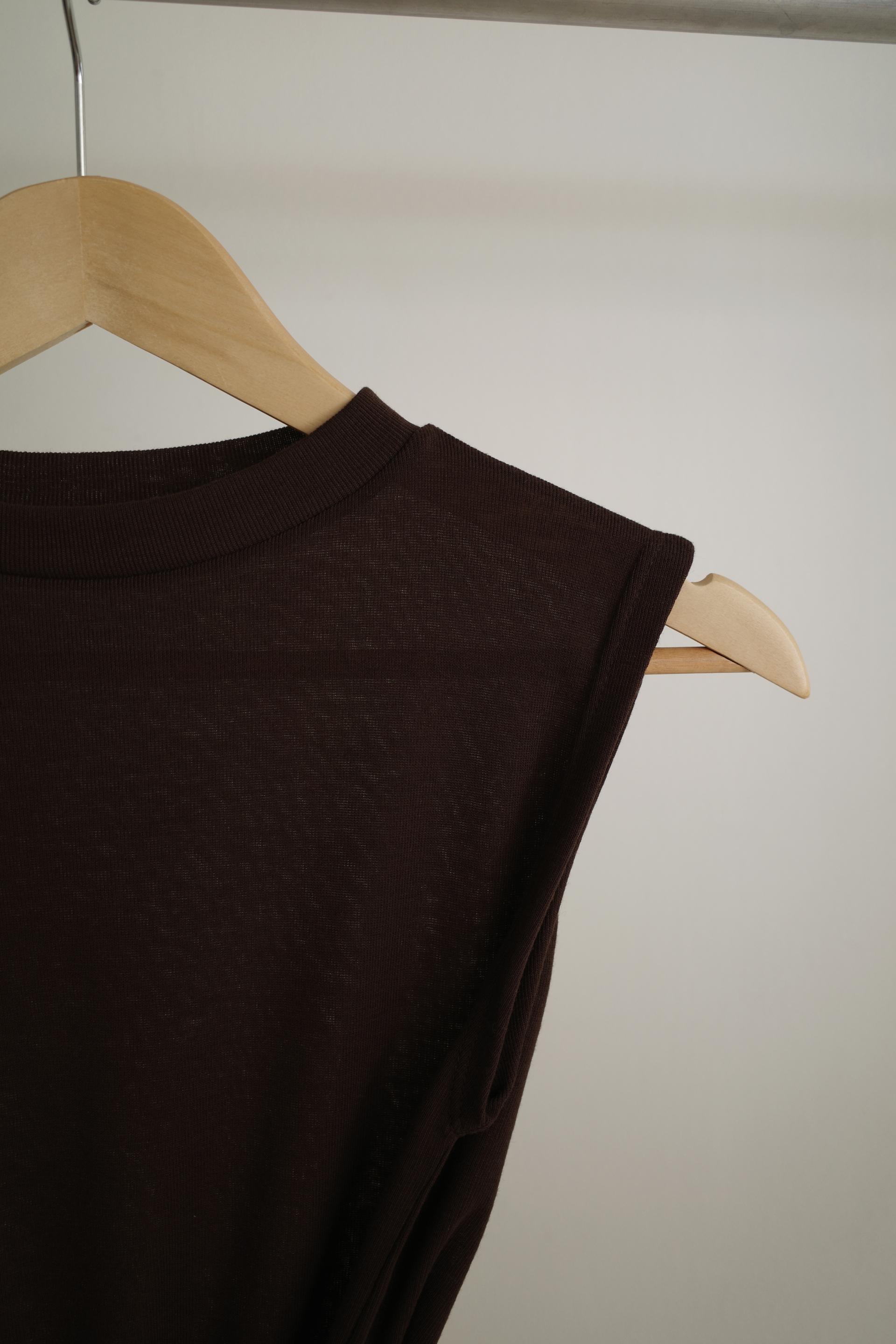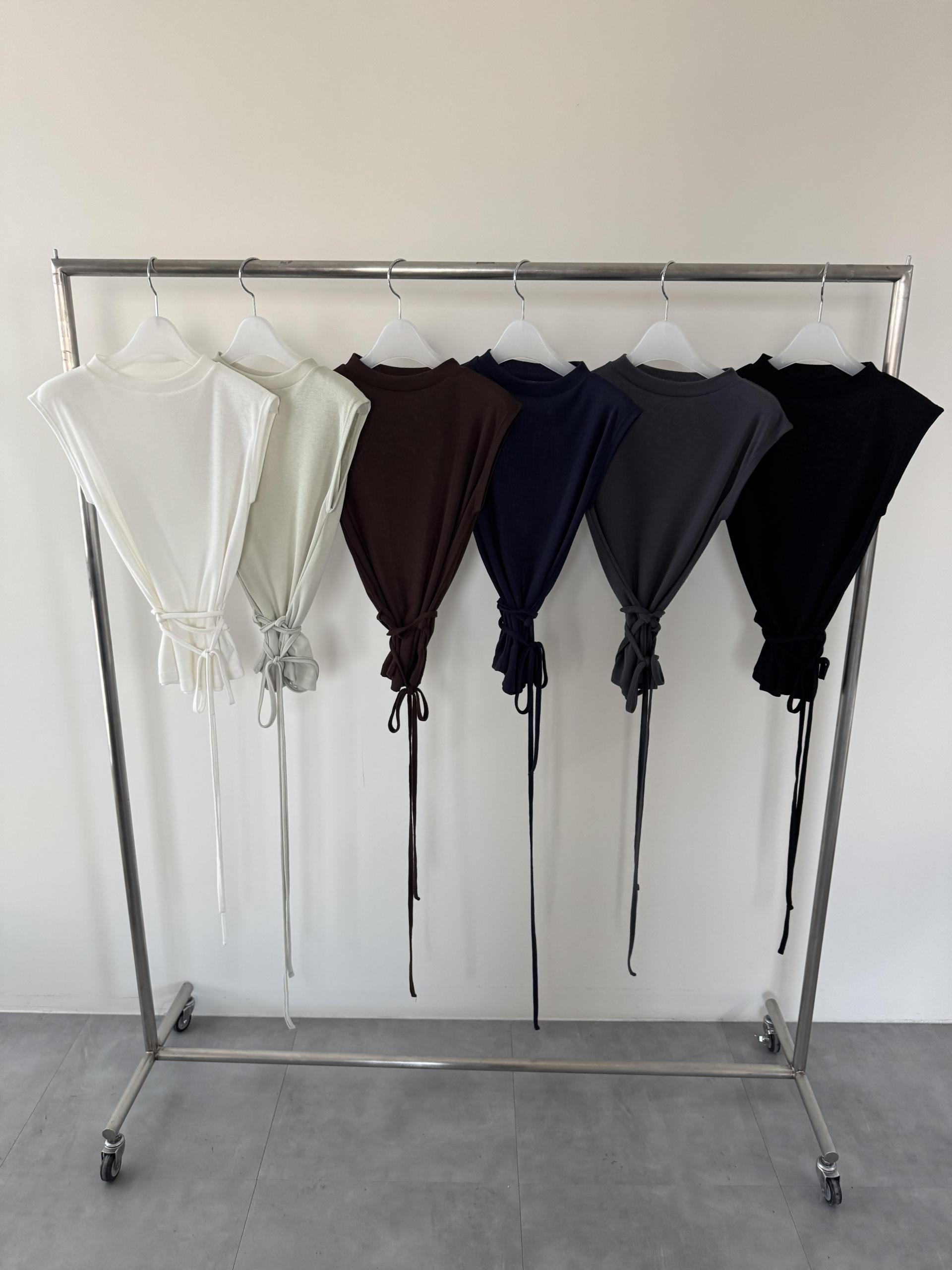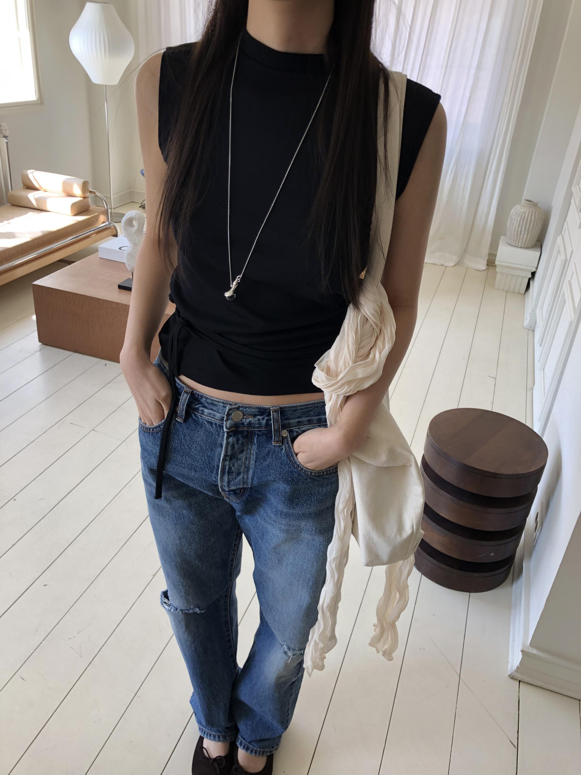 클린한 무드로 어디에나 매치하기 좋은 스트링 슬리브리스 티입니다.