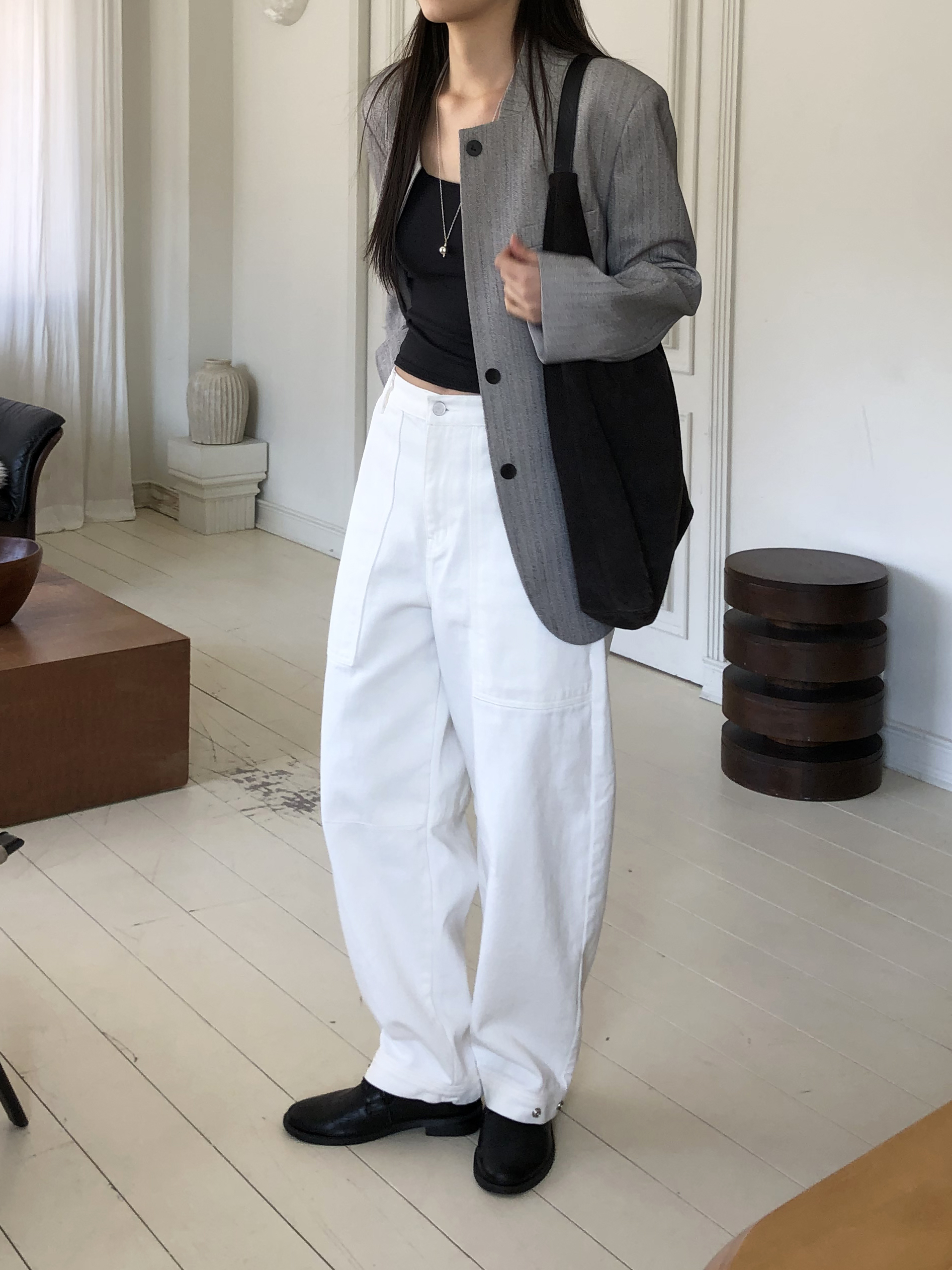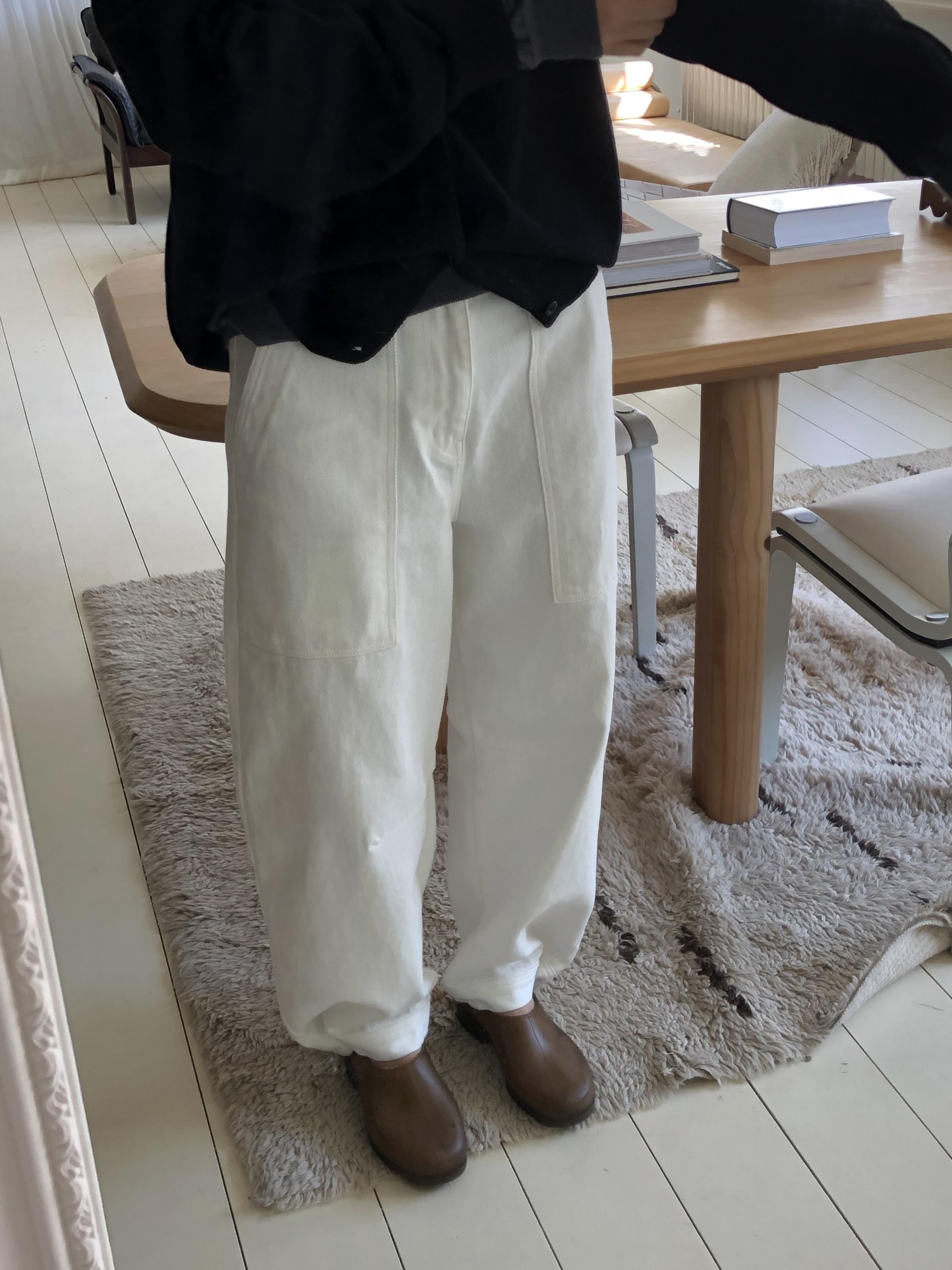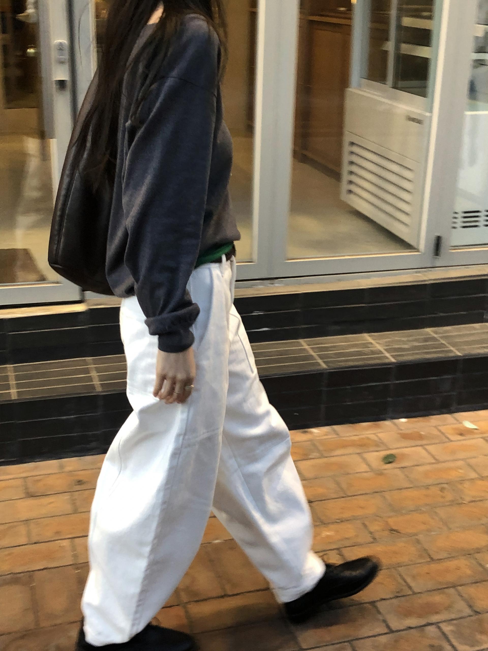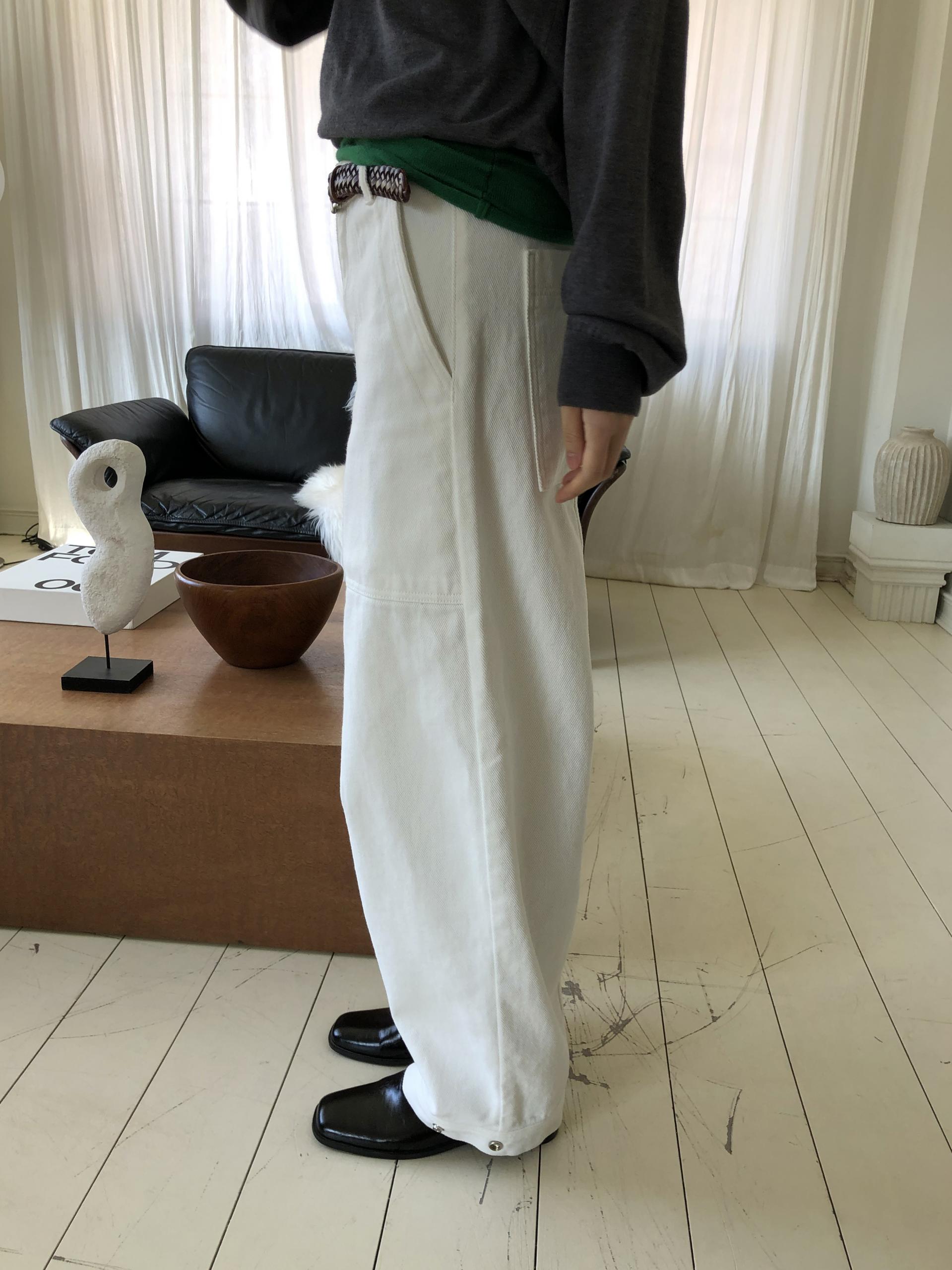탄탄한 조직감의 코튼, 논페이드 데님 원단으로 실루엣을 적당히 잡아줍니다. 밑단 스냅 버튼을 오픈하면 여유있게 떨어지는 세미 벌룬핏, 스냅을 잠그면 밑단이 살짝 모이면서 둥근 실루엣이 더 또렷해집니다. 같은 팬츠인데도 연출에 따라 분위기가 꽤 달라져요. 특히 버튼을 잠갔을 때 그 아방한 쉐입이 예뻐서 개인적으로는 잠가 입는 걸 추천드립니다. 이 디테일과 핏이 가장 매력적인 포인트거든요 !