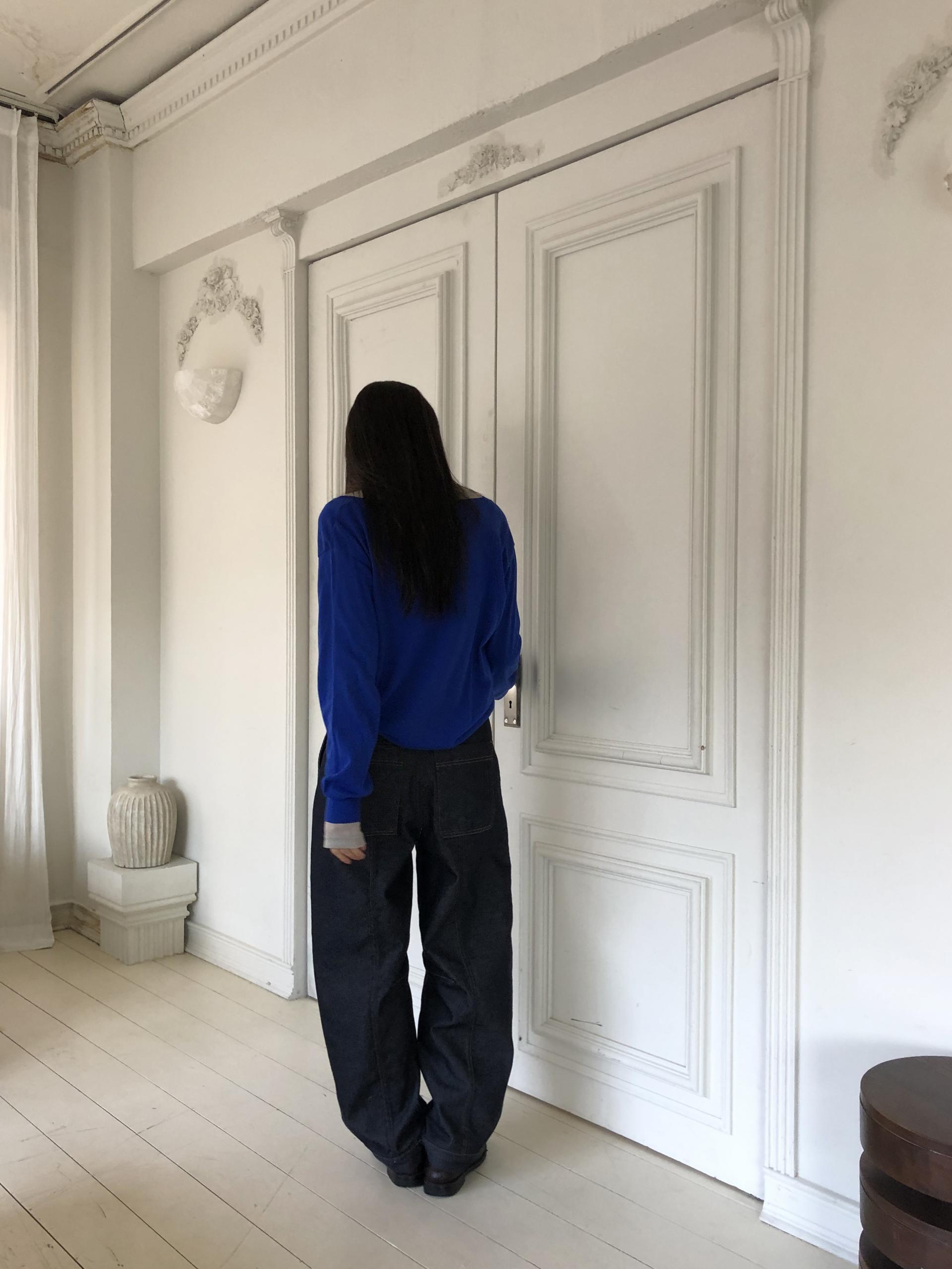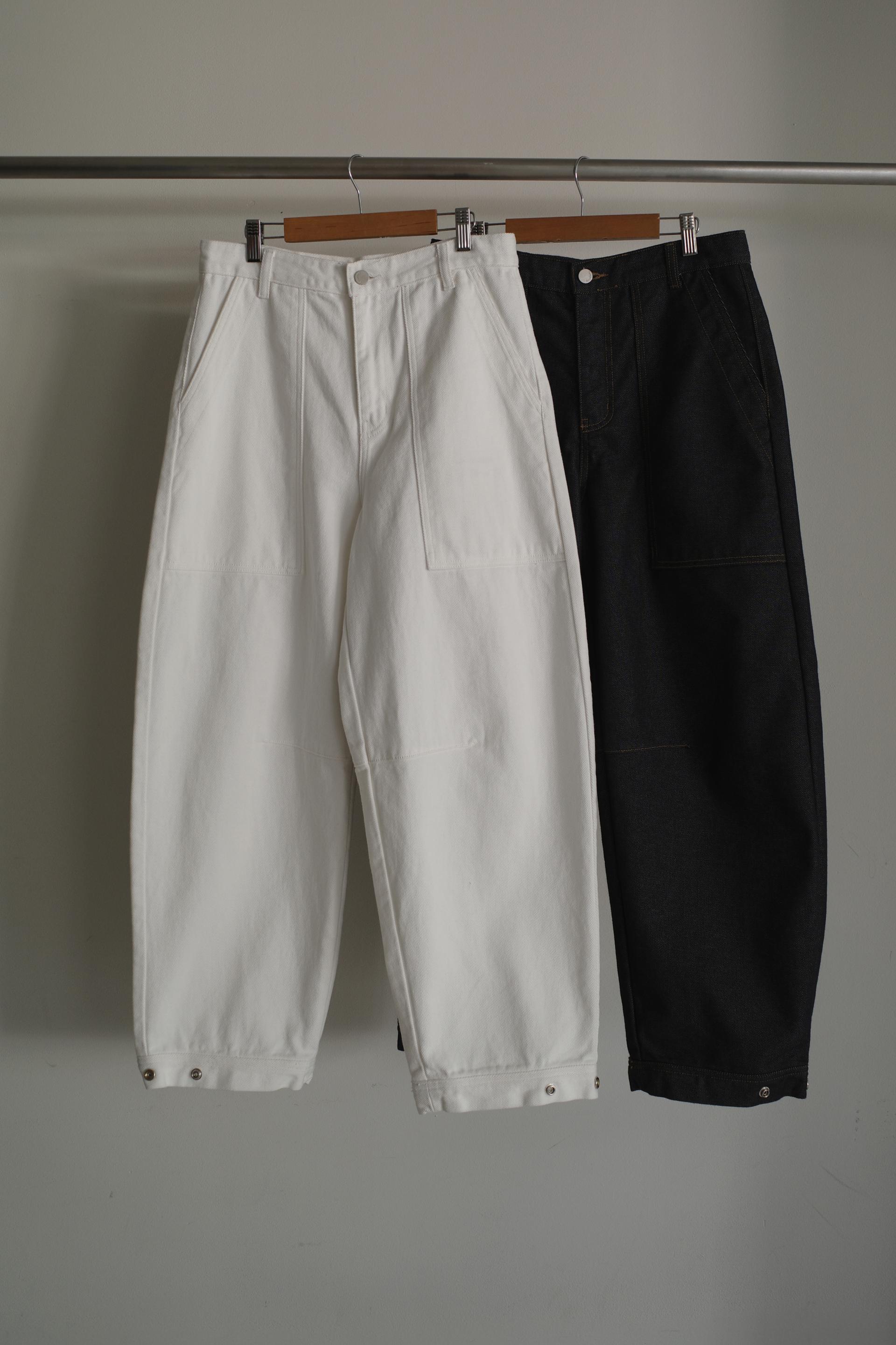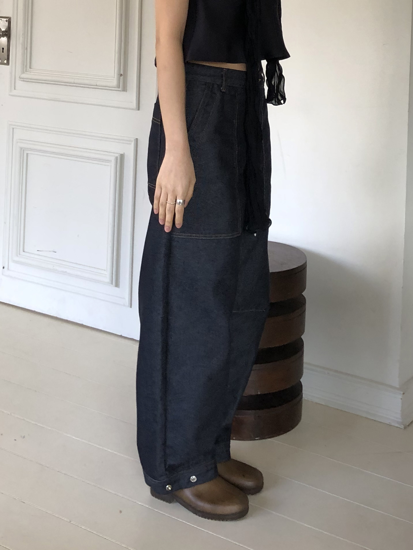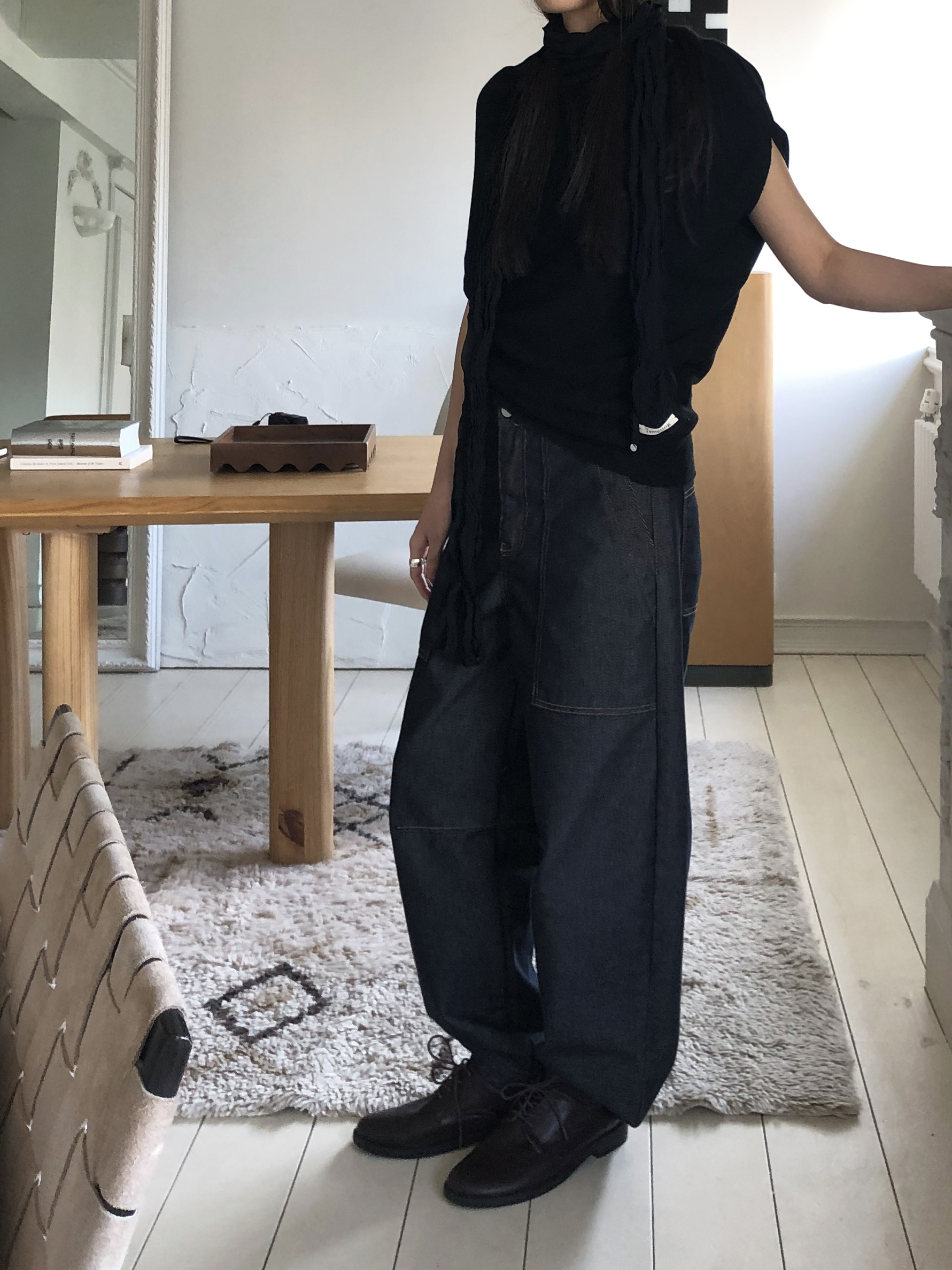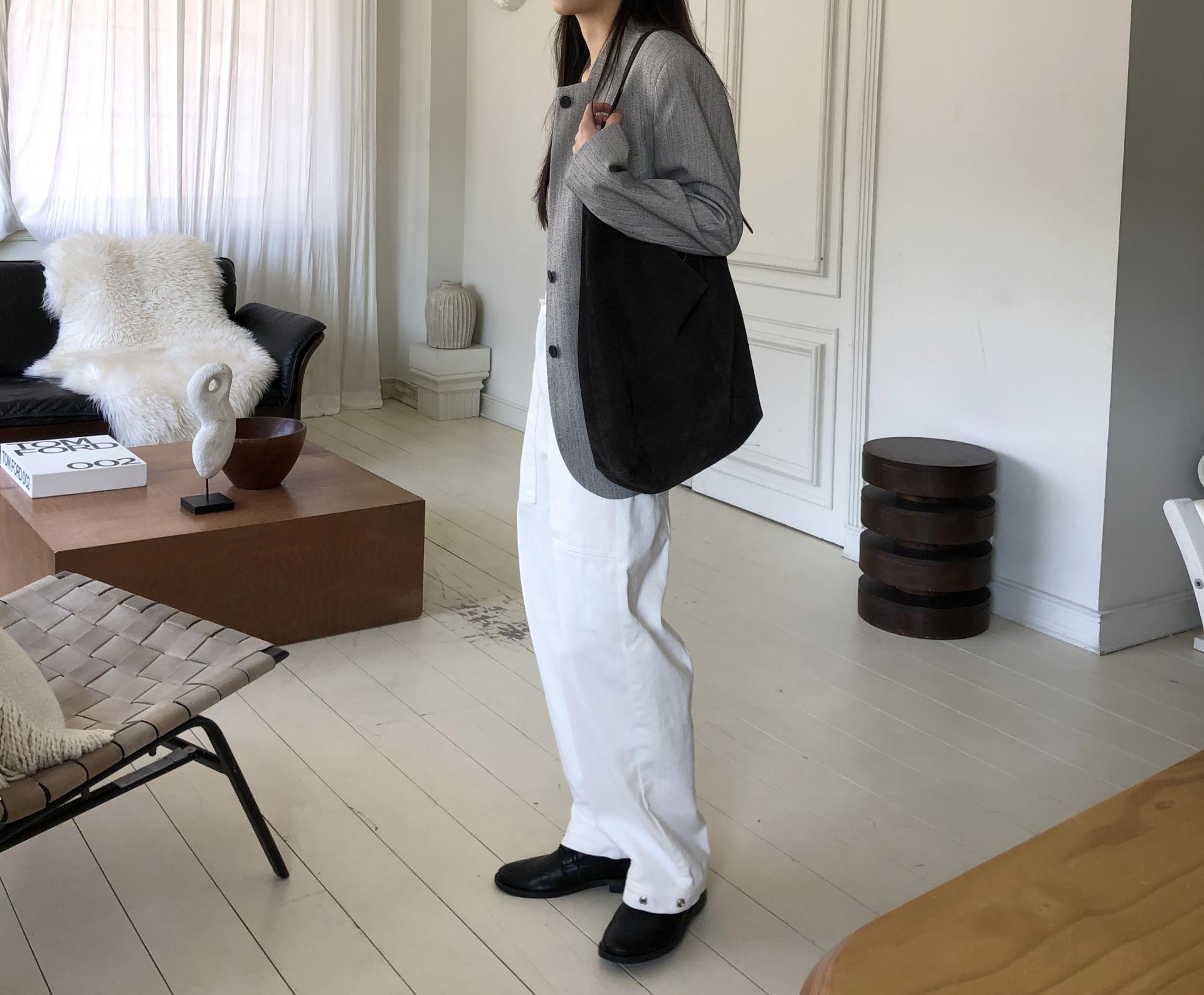 탄탄한 조직감의 코튼, 논페이드 데님 원단으로 실루엣을 적당히 잡아줍니다. 밑단 스냅 버튼을 오픈하면 여유있게 떨어지는 세미 벌룬핏, 스냅을 잠그면 밑단이 살짝 모이면서 둥근 실루엣이 더 또렷해집니다. 같은 팬츠인데도 연출에 따라 분위기가 꽤 달라져요. 특히 버튼을 잠갔을 때 그 아방한 쉐입이 예뻐서 개인적으로는 잠가 입는 걸 추천드립니다. 이 디테일과 핏이 가장 매력적인 포인트거든요 !