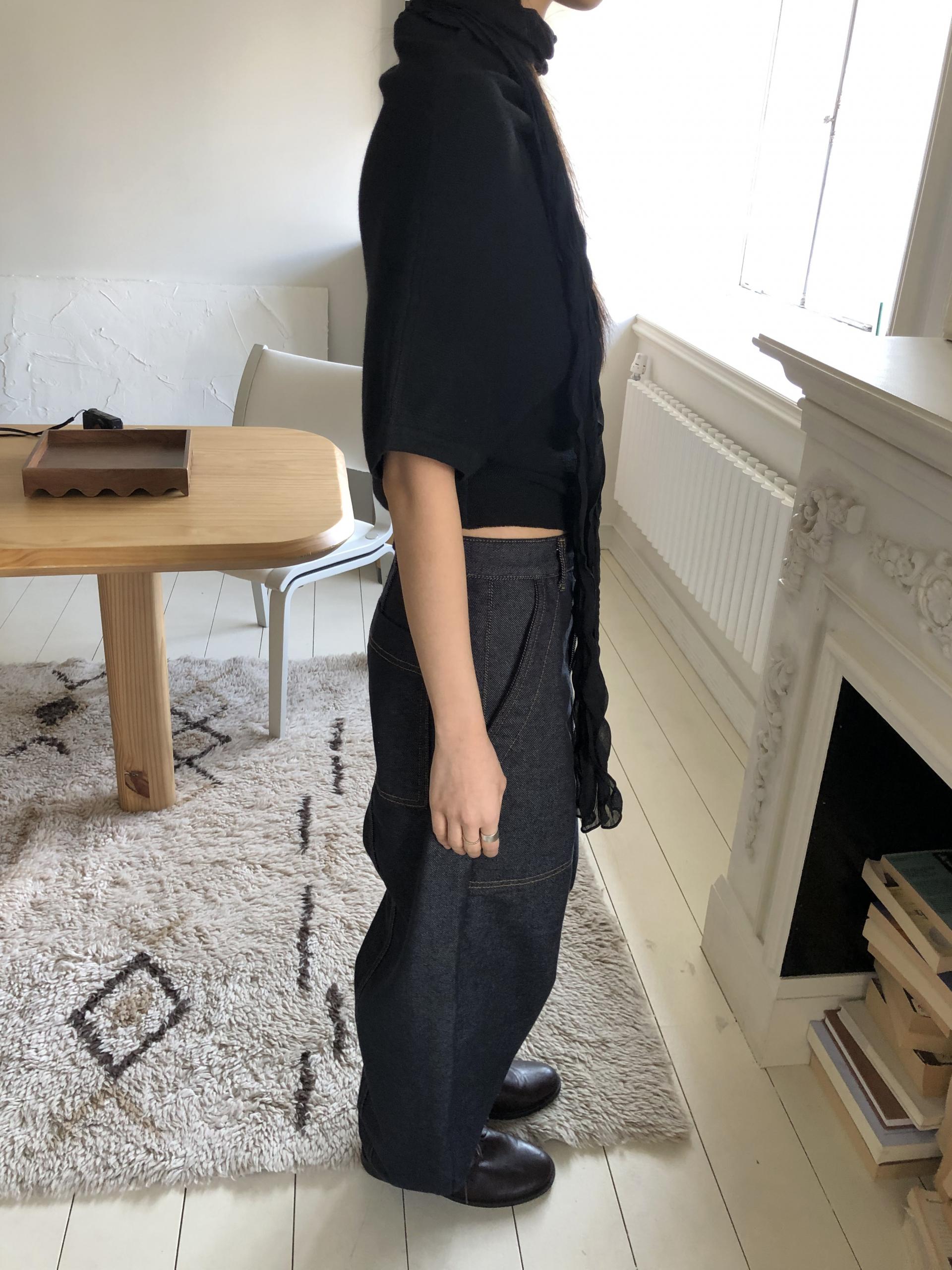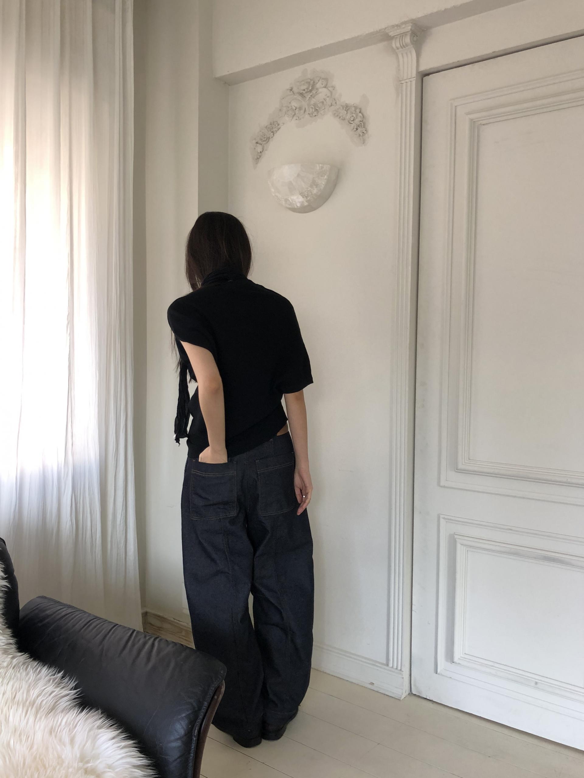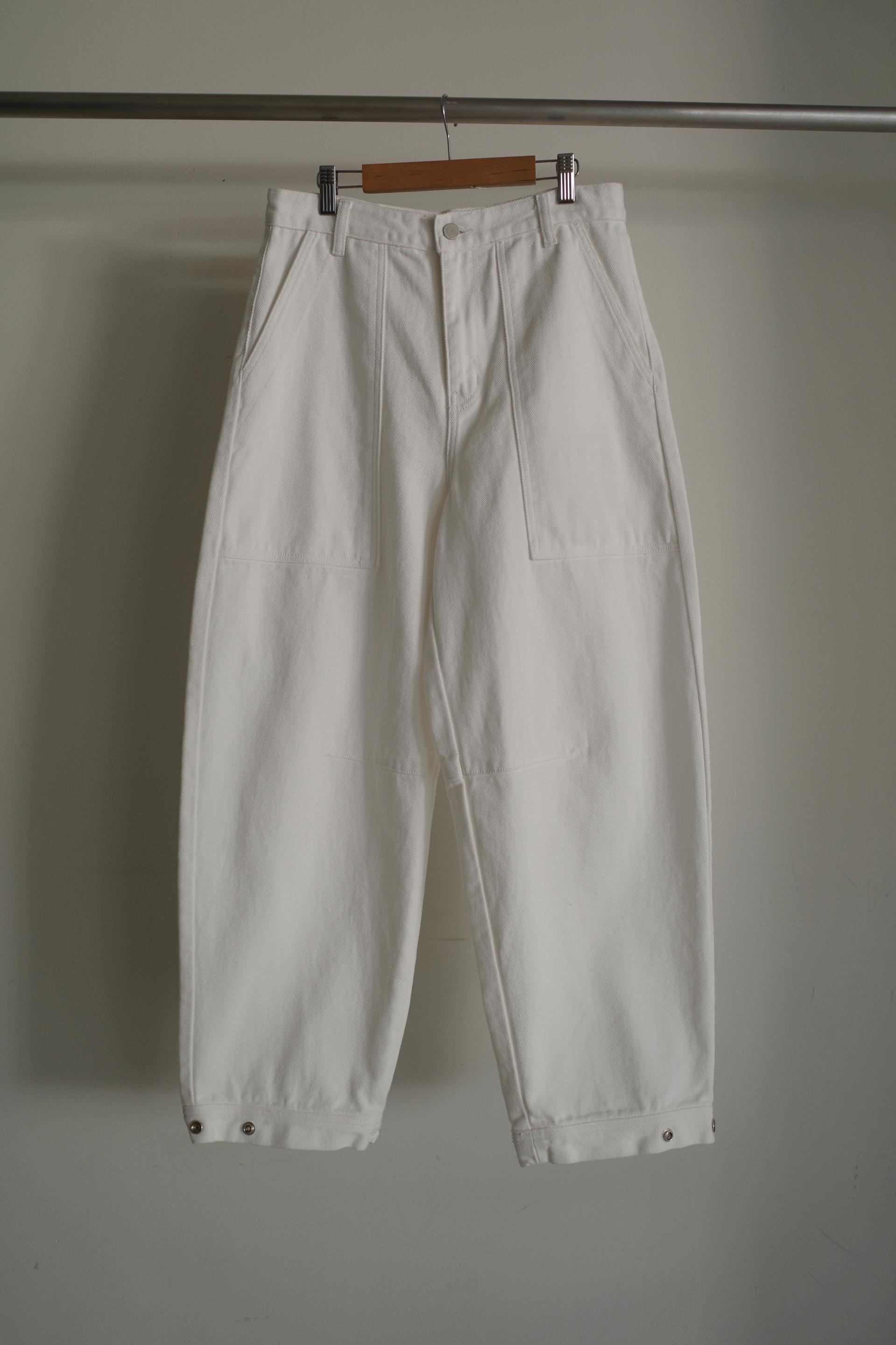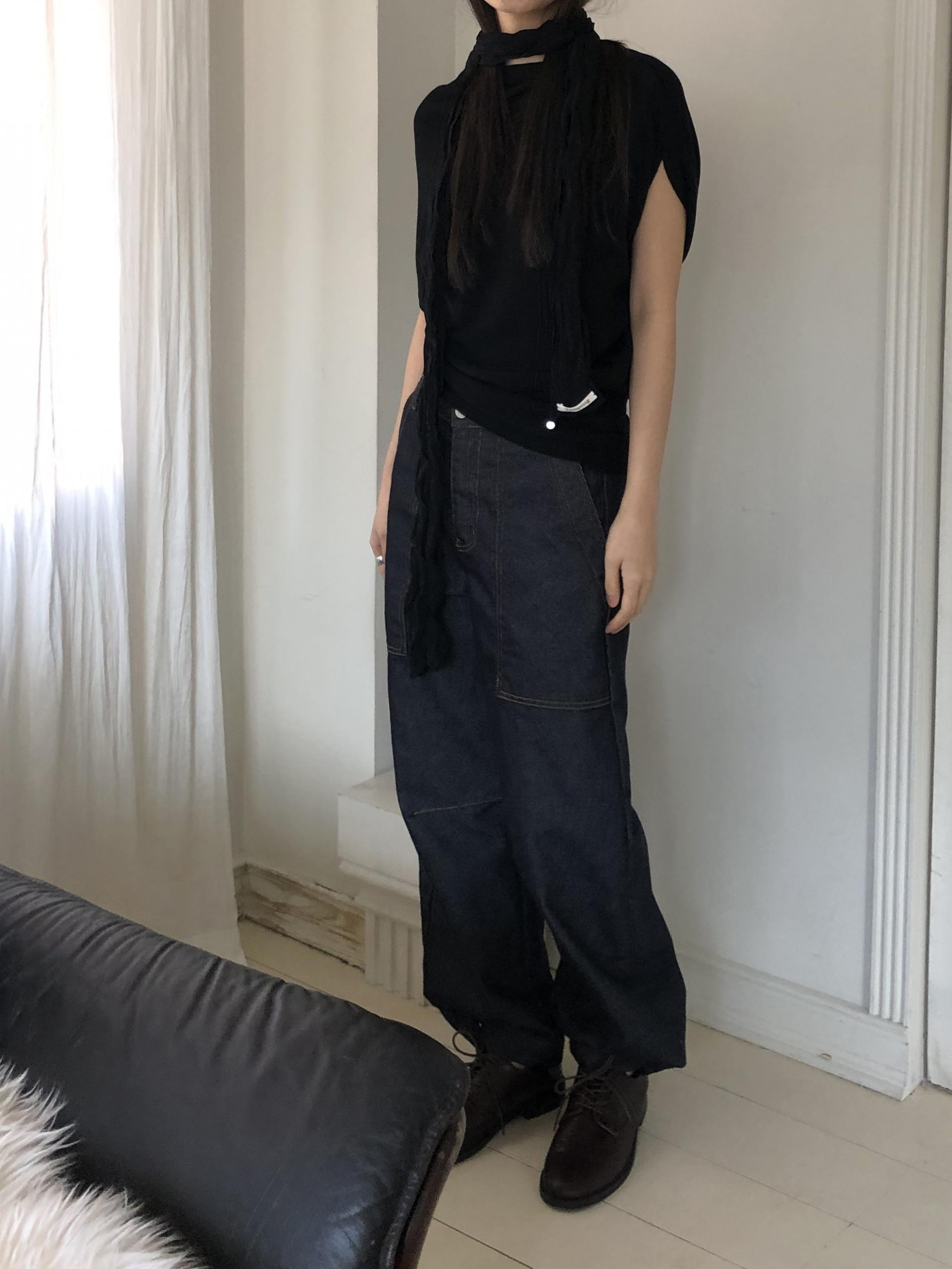 탄탄한 조직감의 코튼, 논페이드 데님 원단으로 실루엣을 적당히 잡아줍니다. 밑단 스냅 버튼을 오픈하면 여유있게 떨어지는 세미 벌룬핏, 스냅을 잠그면 밑단이 살짝 모이면서 둥근 실루엣이 더 또렷해집니다. 같은 팬츠인데도 연출에 따라 분위기가 꽤 달라져요. 특히 버튼을 잠갔을 때 그 아방한 쉐입이 예뻐서 개인적으로는 잠가 입는 걸 추천드립니다. 이 디테일과 핏이 가장 매력적인 포인트거든요 !