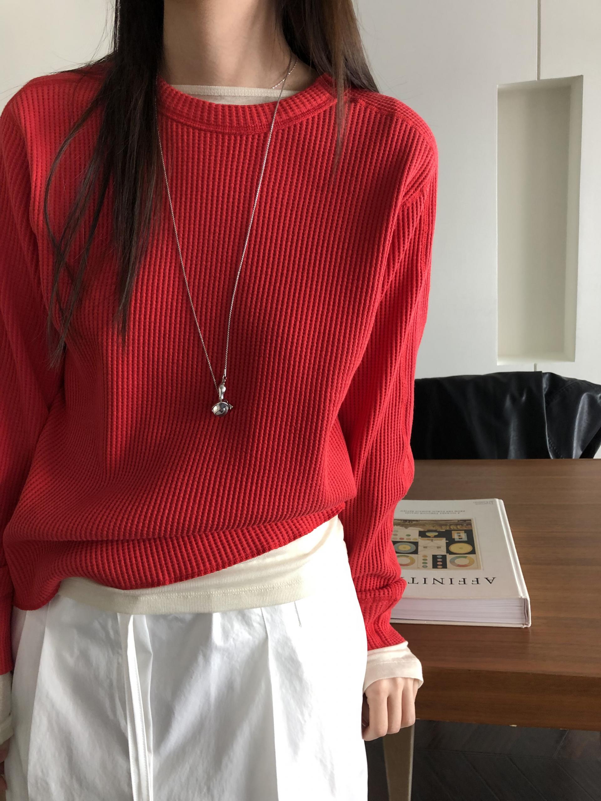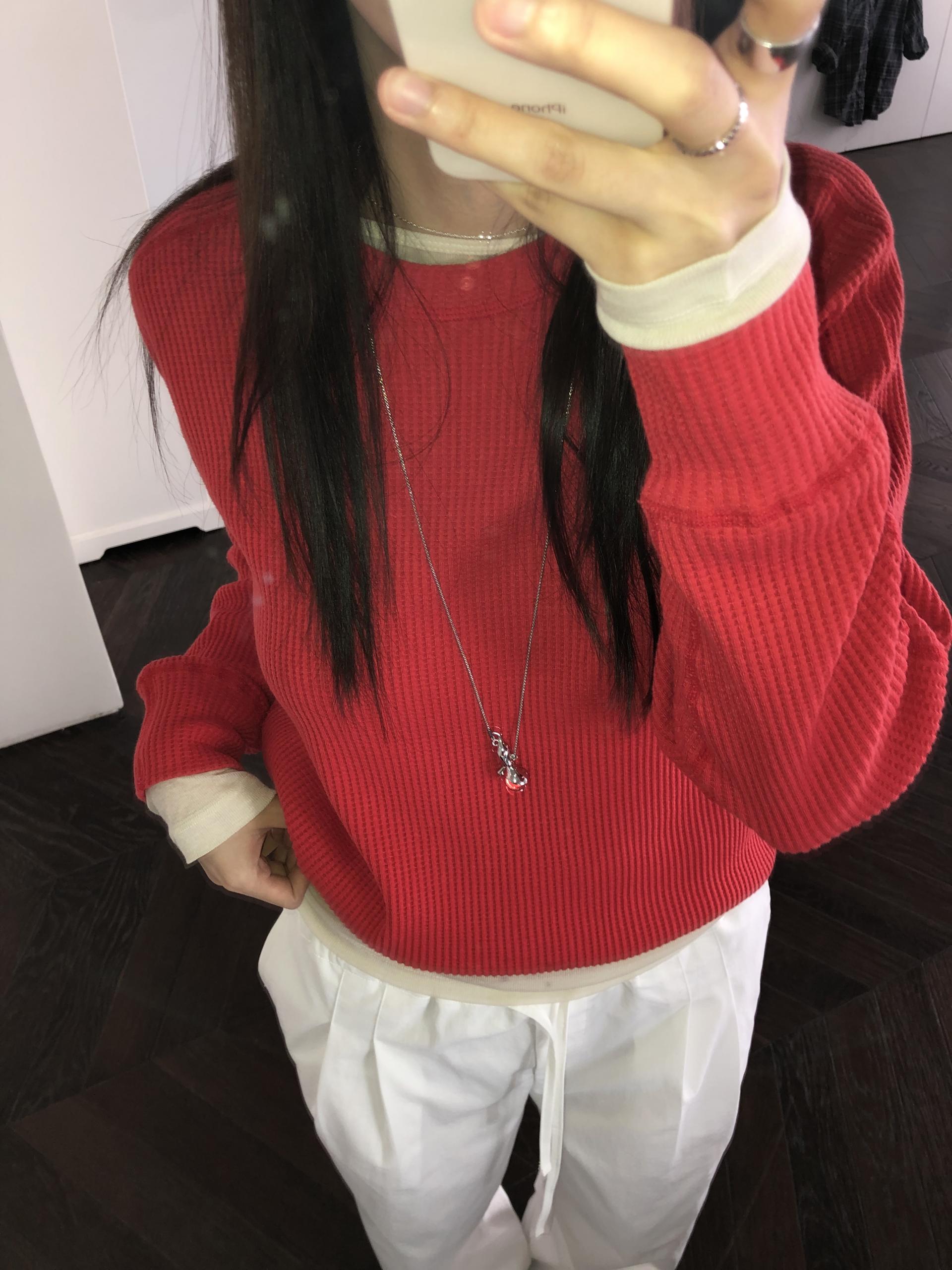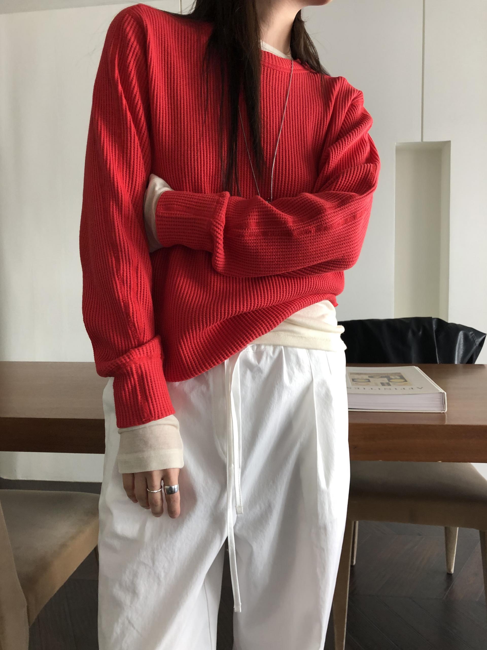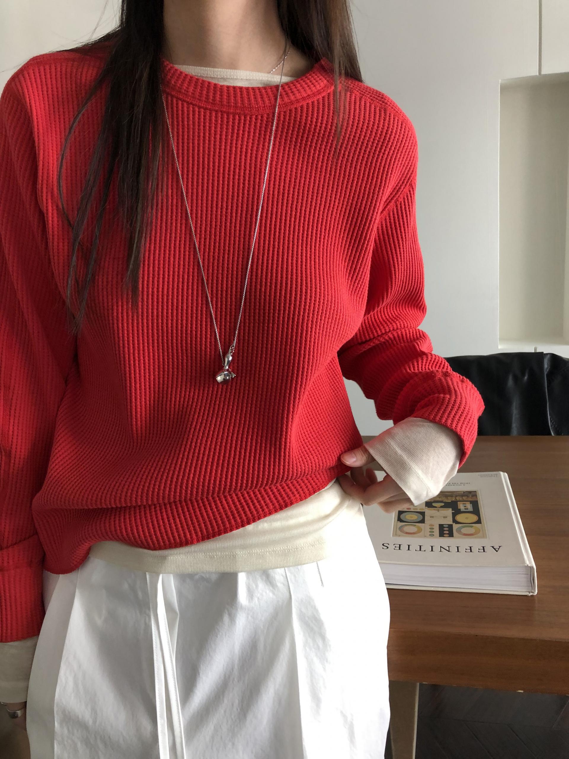 잔잔한 와플 텍스처가 살아있는 원단으로 기본 티셔츠보다 한층 분위기가 느껴지는 제품입니다. 살짝 도톰한 두께감으로 여름을 제외하고 두고두고 활용하기 좋고, 단독으로 입어도 밋밋하지 않아 추천드리는 티셔츠입니다.