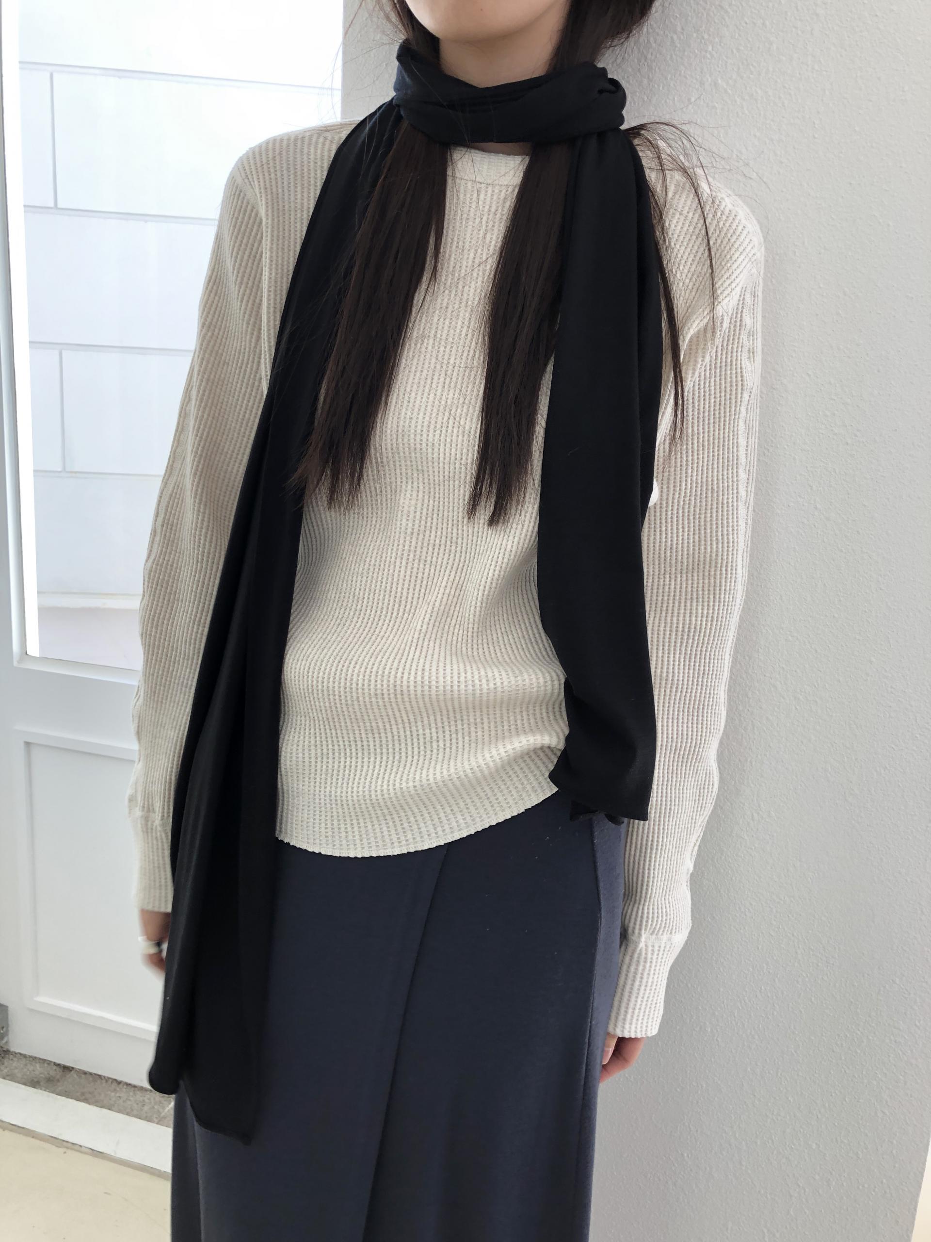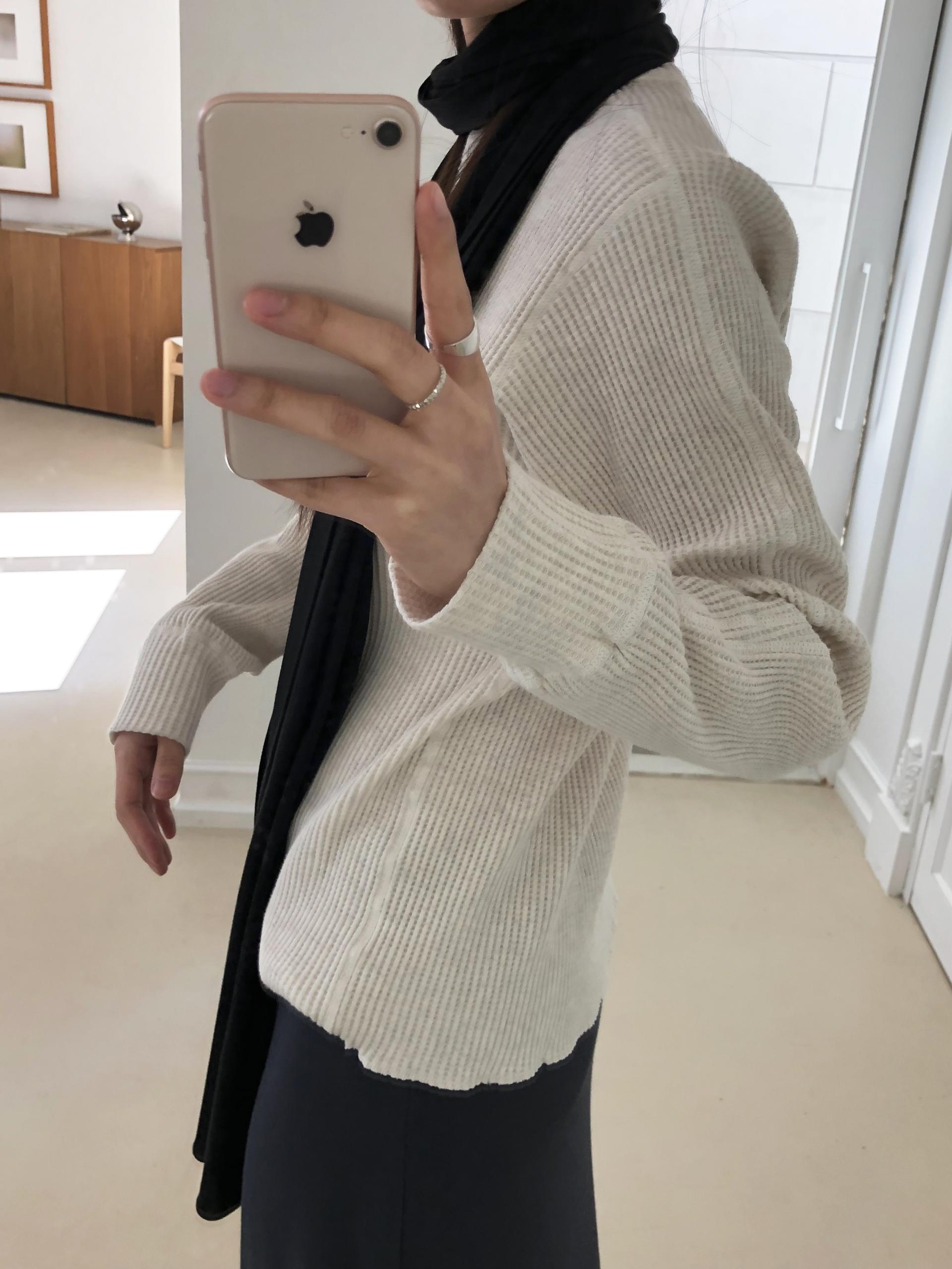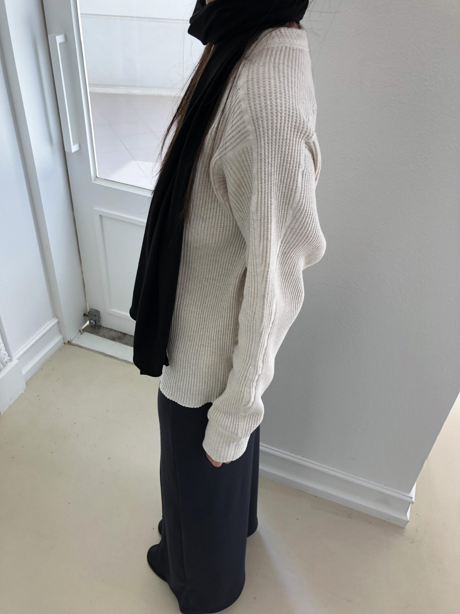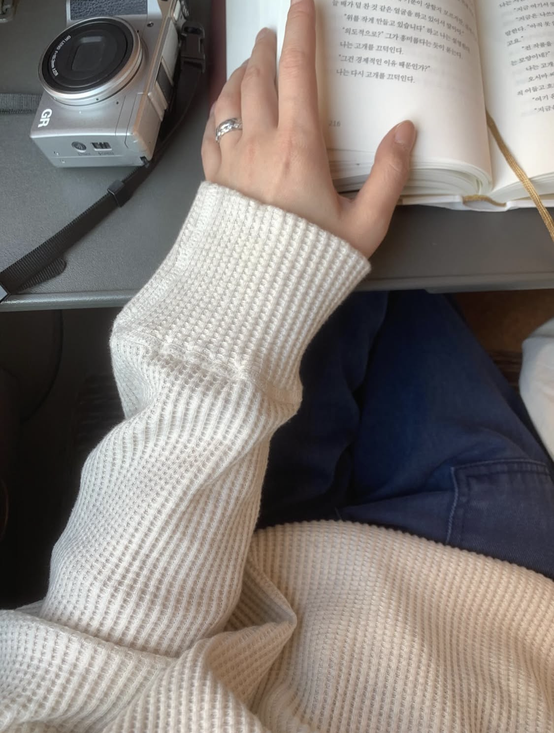 밑단은 시보리없이 내추럴하게 마감되어 실루엣이 조이지 않고 툭 떨어져요. 때문에 편안한 무드가 살아납니다. 반면 소매에는 살짝 넓은 시보리를 더해 와플 조직이 주는 탄탄한 실루엣을 안정감있게 잡아주었어요. 핏은 슬림하지도 과하게 루즈하지도 않은 레귤러한 핏감입니다. 전체적으로 깔끔하면서 단정하지만, 소재감이 주는 캐주얼함이 더해진 티셔츠예요.