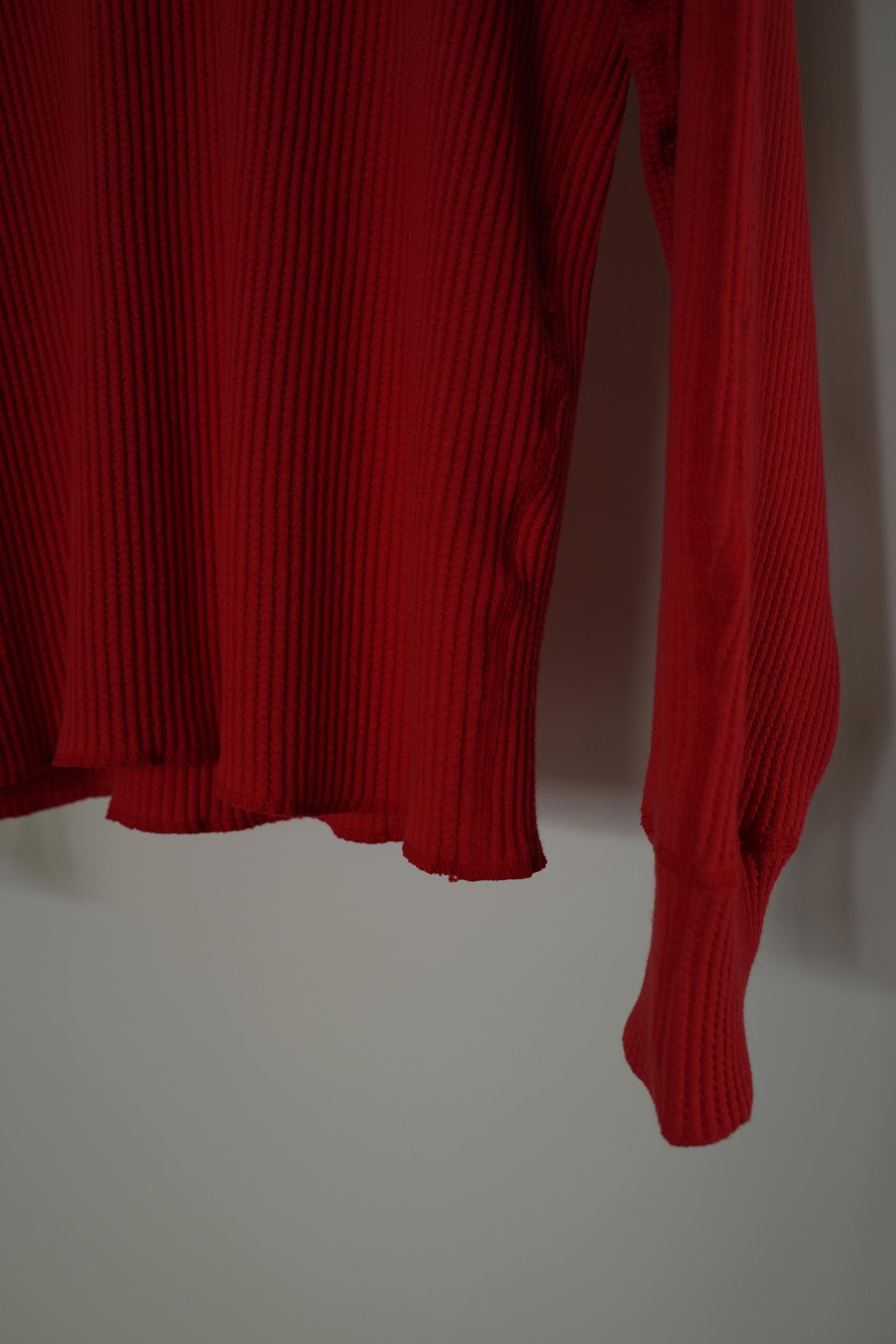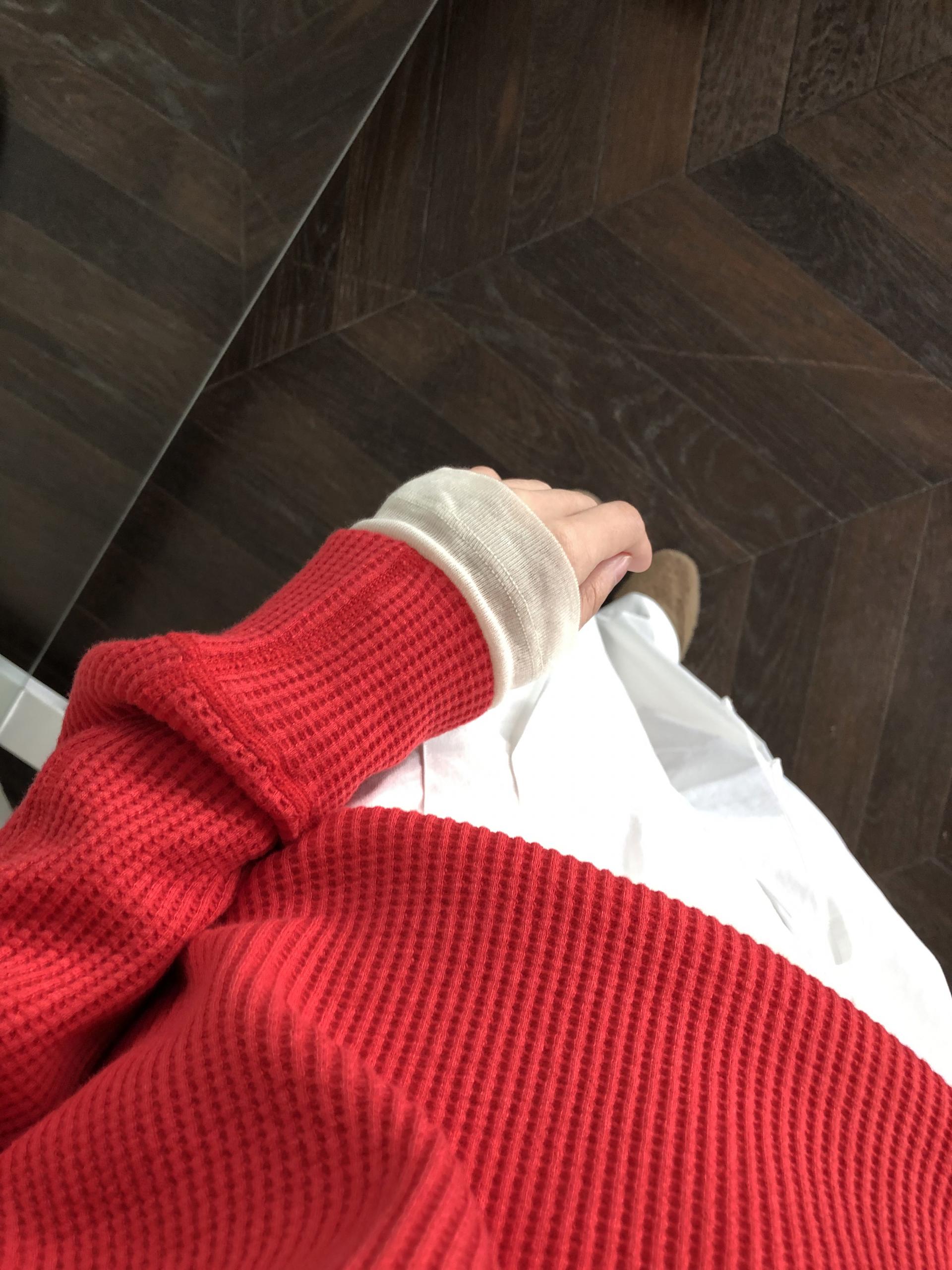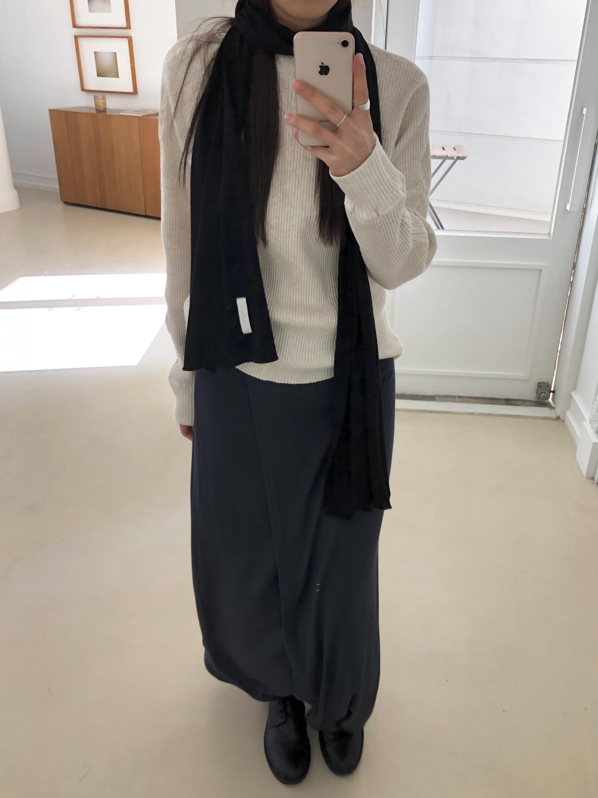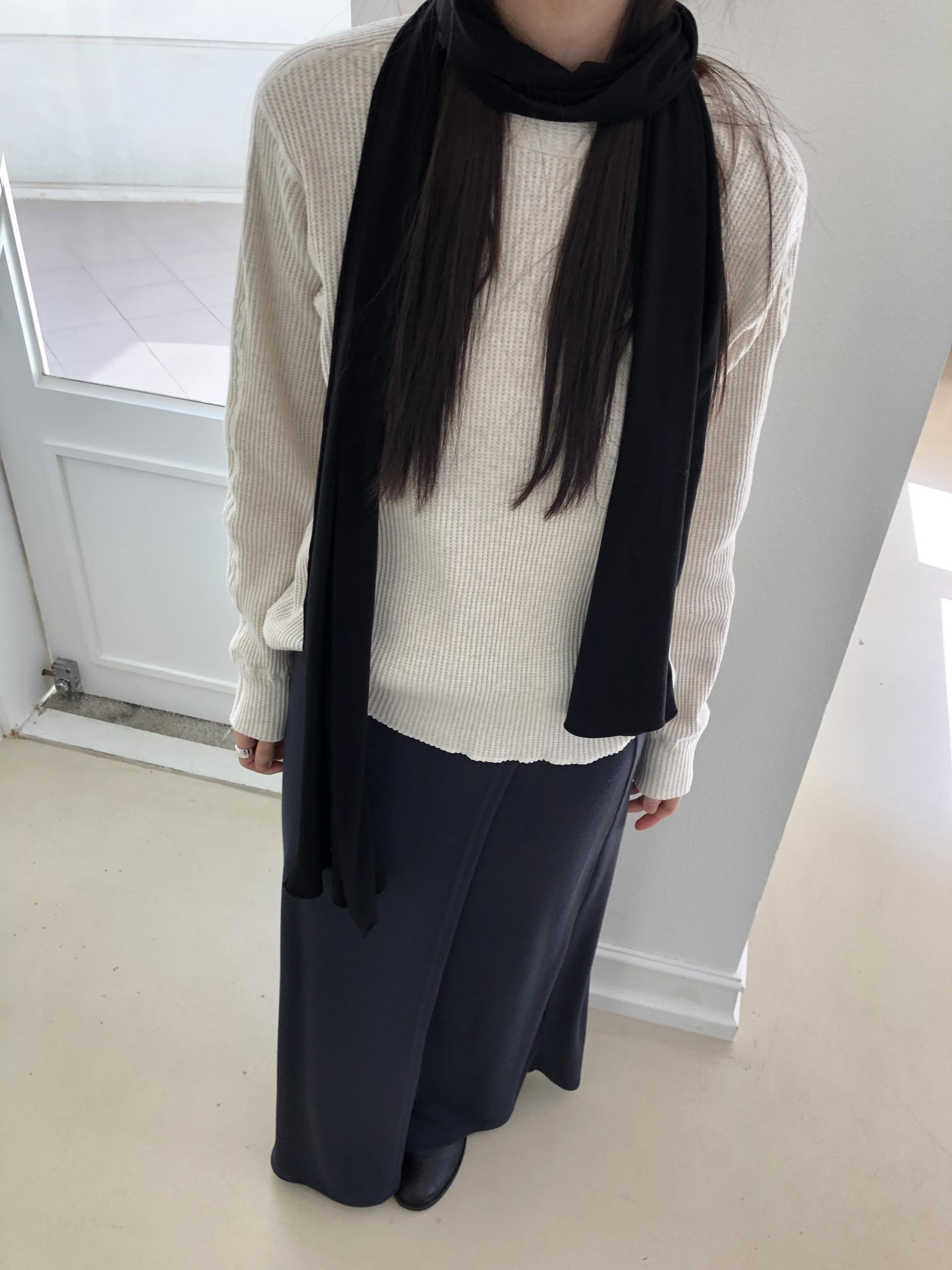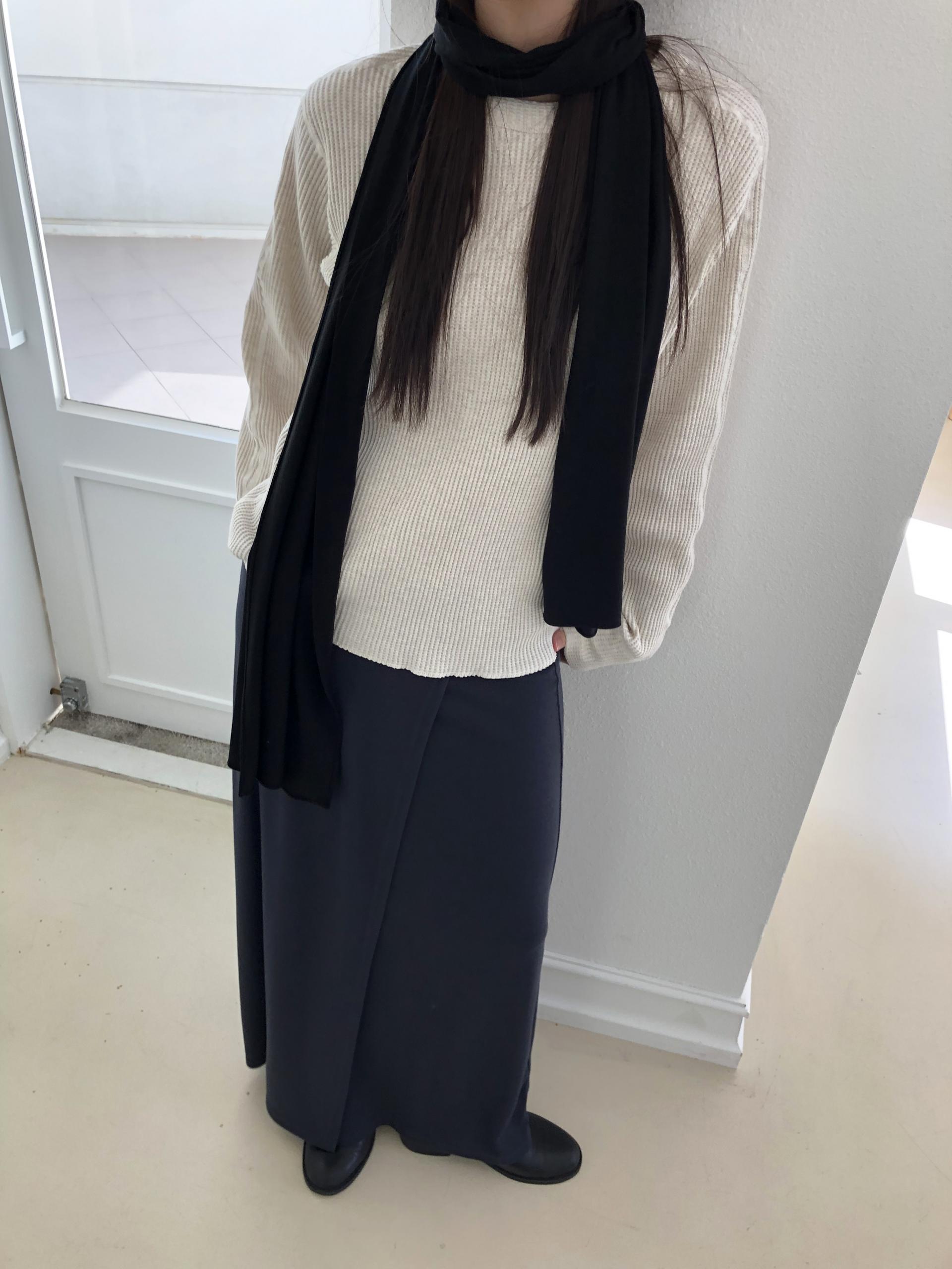 밑단은 시보리없이 내추럴하게 마감되어 실루엣이 조이지 않고 툭 떨어져요. 때문에 편안한 무드가 살아납니다. 반면 소매에는 살짝 넓은 시보리를 더해 와플 조직이 주는 탄탄한 실루엣을 안정감있게 잡아주었어요. 핏은 슬림하지도 과하게 루즈하지도 않은 레귤러한 핏감입니다. 전체적으로 깔끔하면서 단정하지만, 소재감이 주는 캐주얼함이 더해진 티셔츠예요.