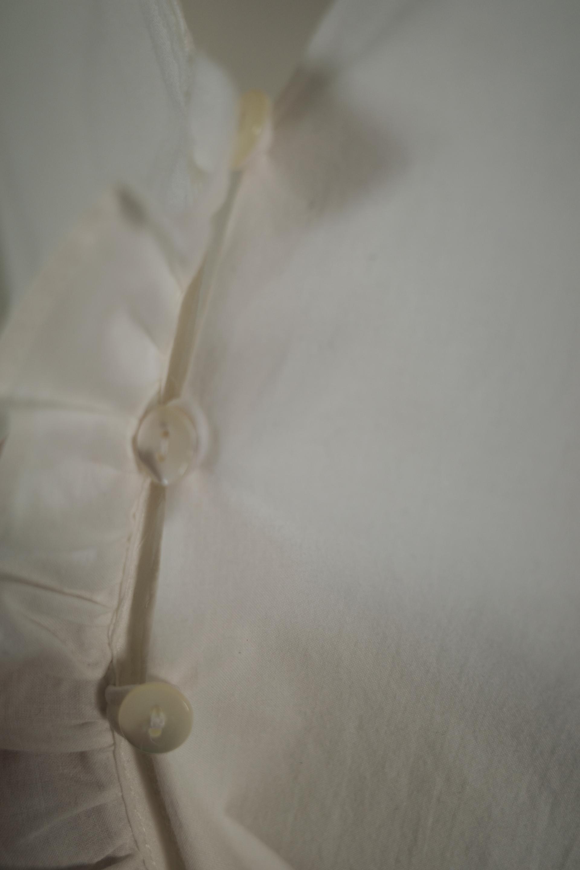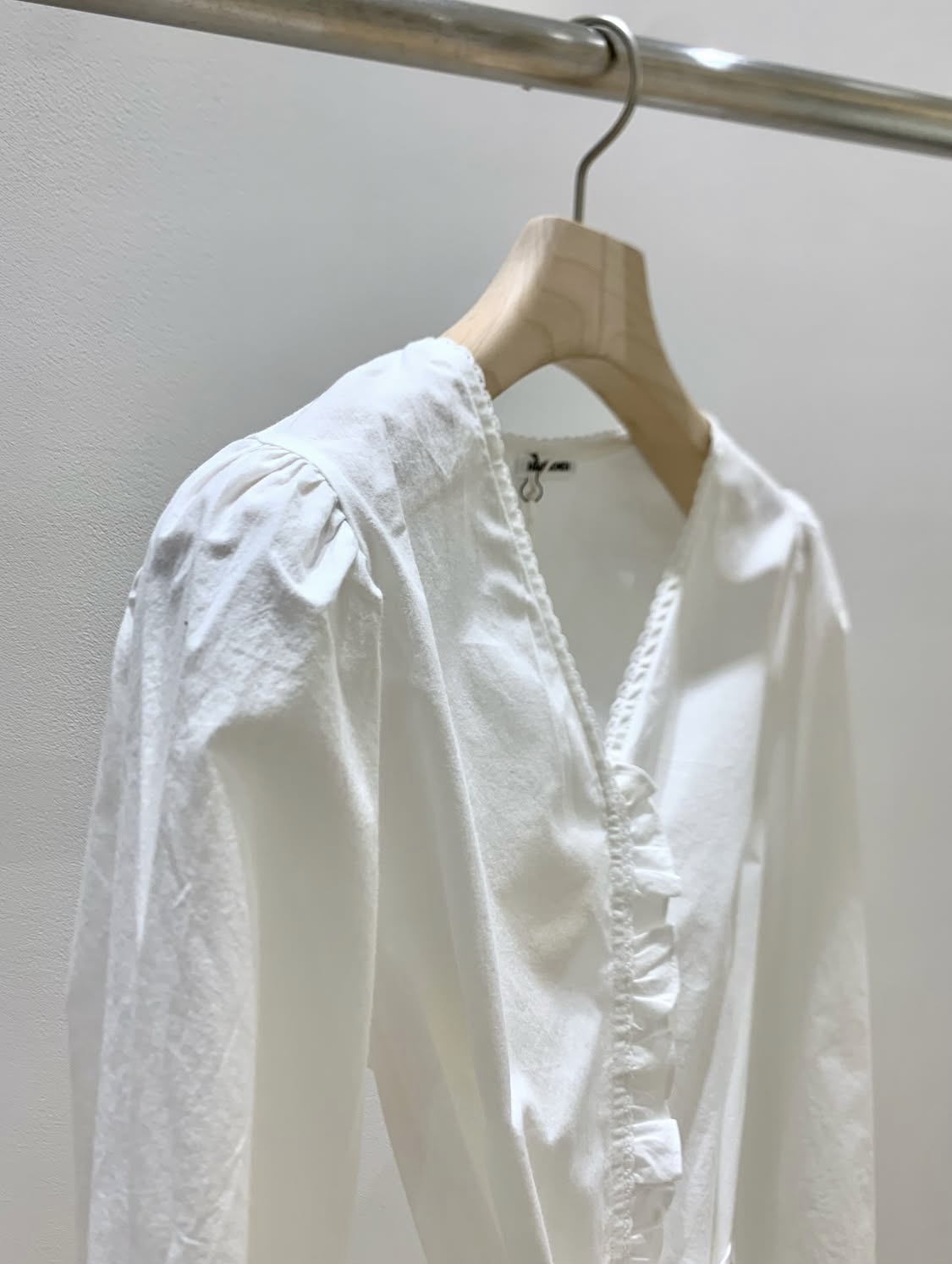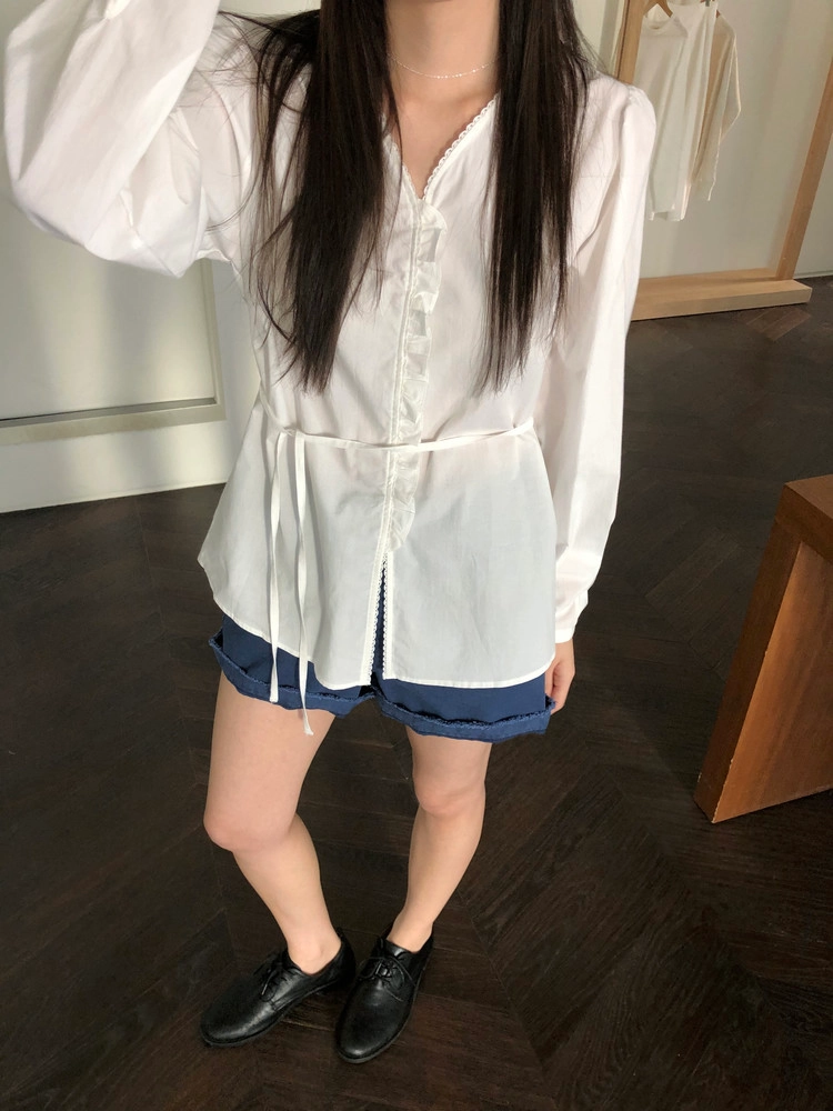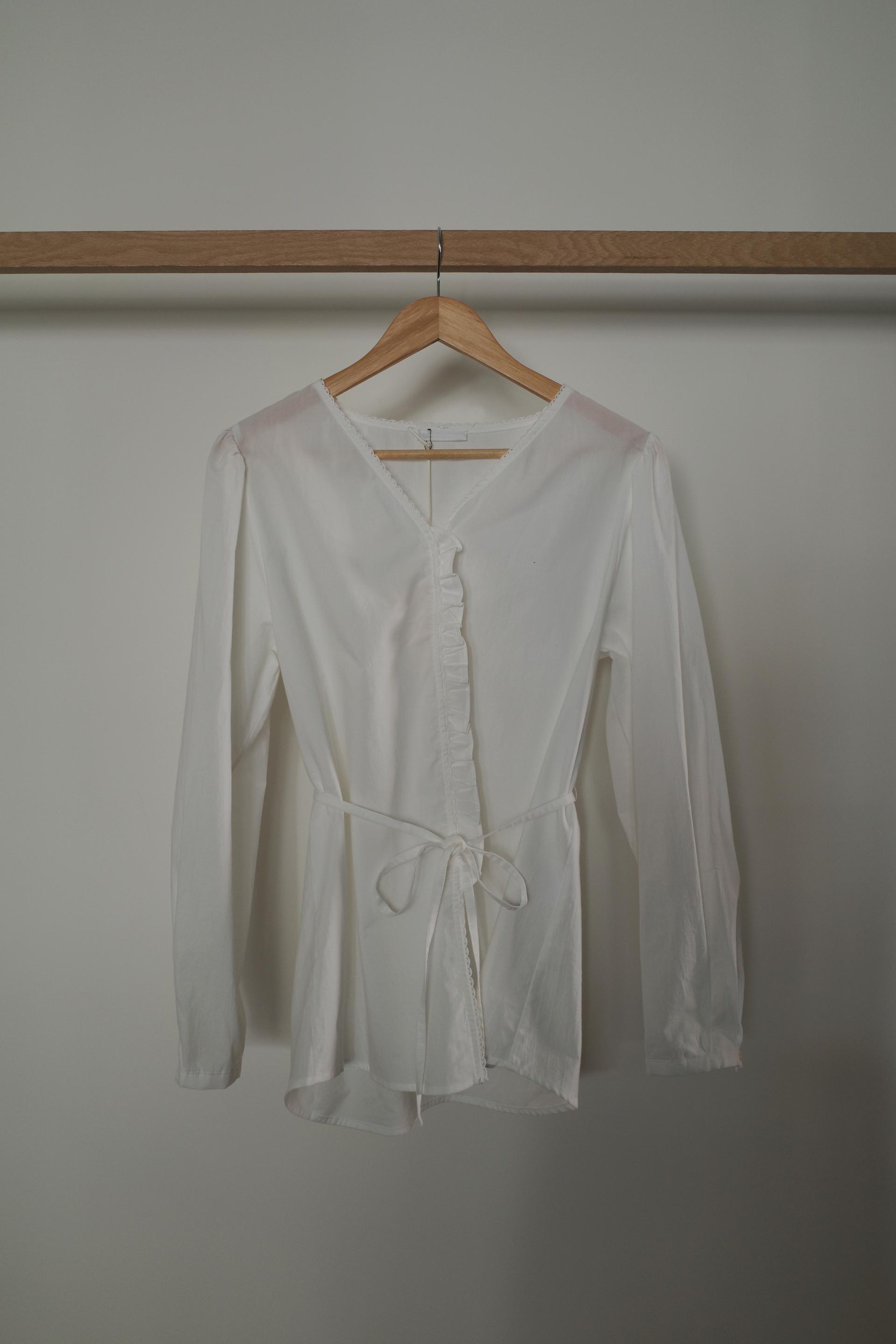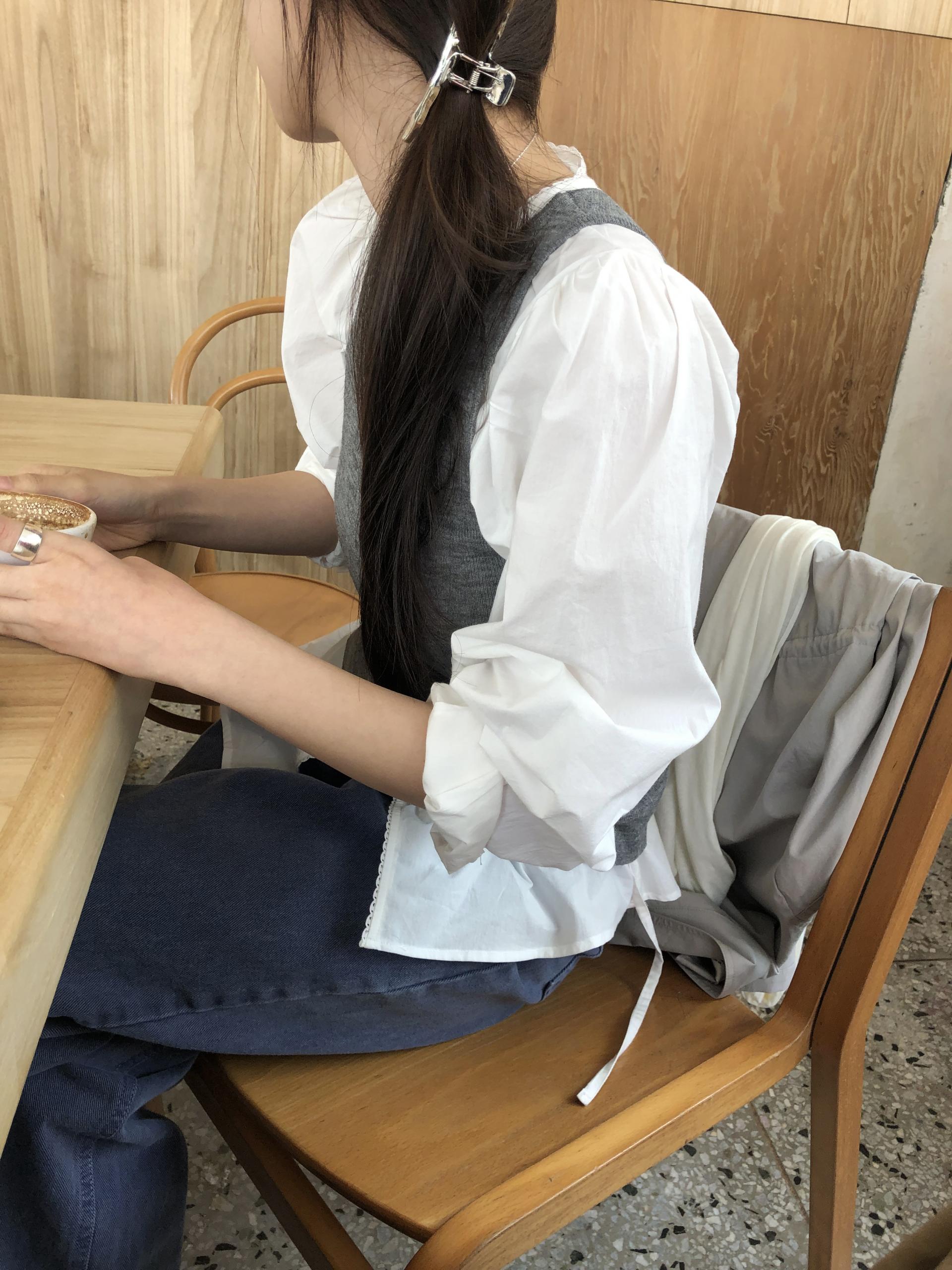 브이넥 라인을 따라 레이스 트리밍이 아래까지 이어지며, 가운데 단작 부분에는 프릴이 더해져 단추가 가려지는 디자인입니다. 레이스와 프릴 디테일이 있지만 과하게 로맨틱한 느낌보다는 은은하게 분위기를 더해주는 정도라 데일리로도 충분히 편하게 입기 좋았어요.