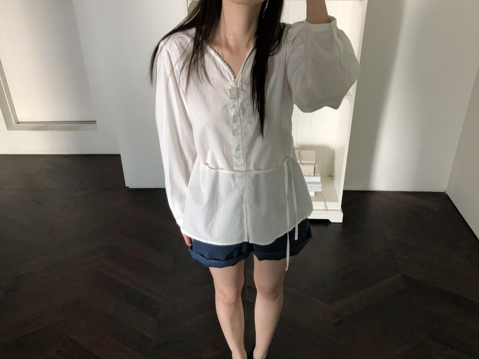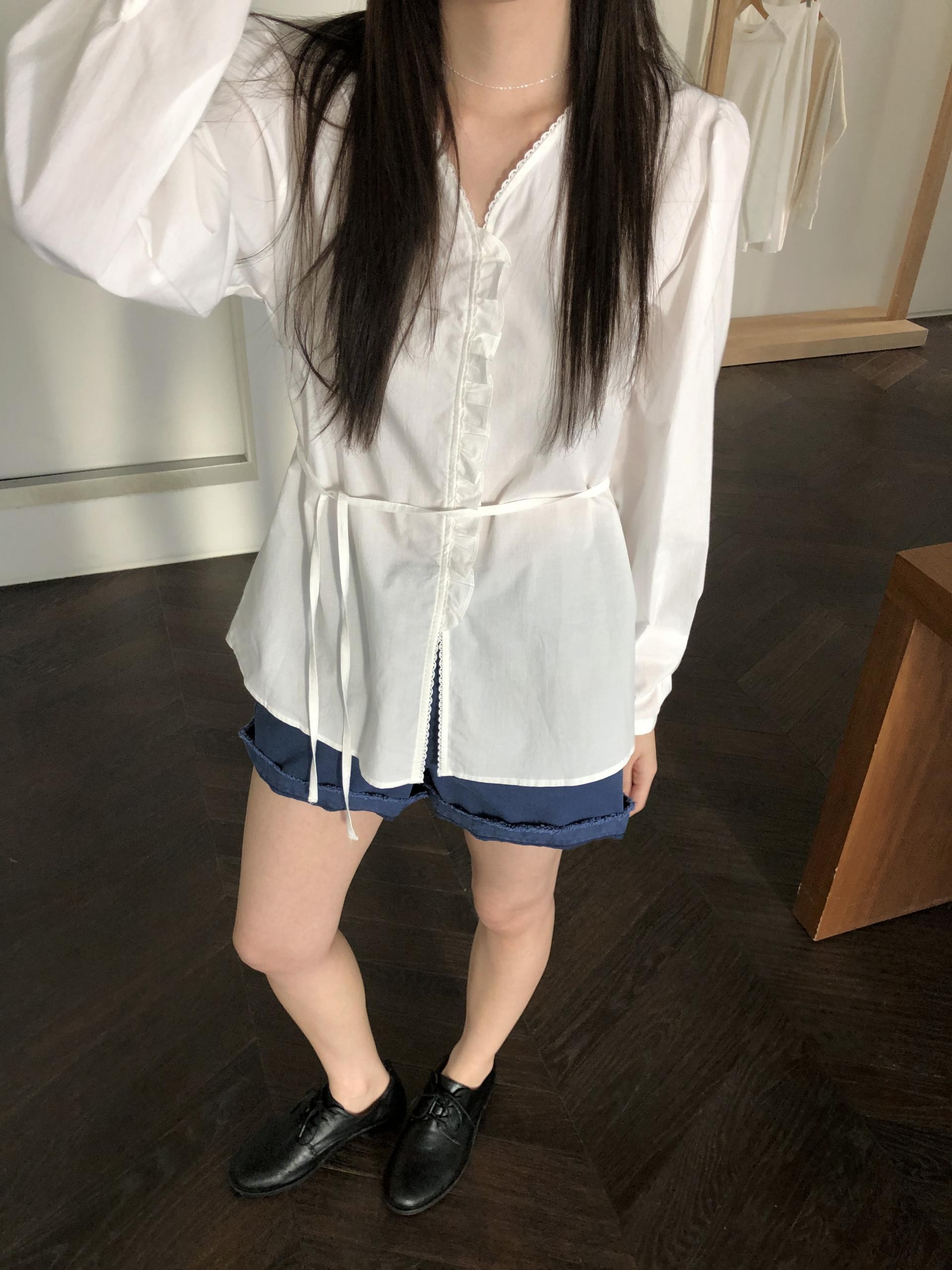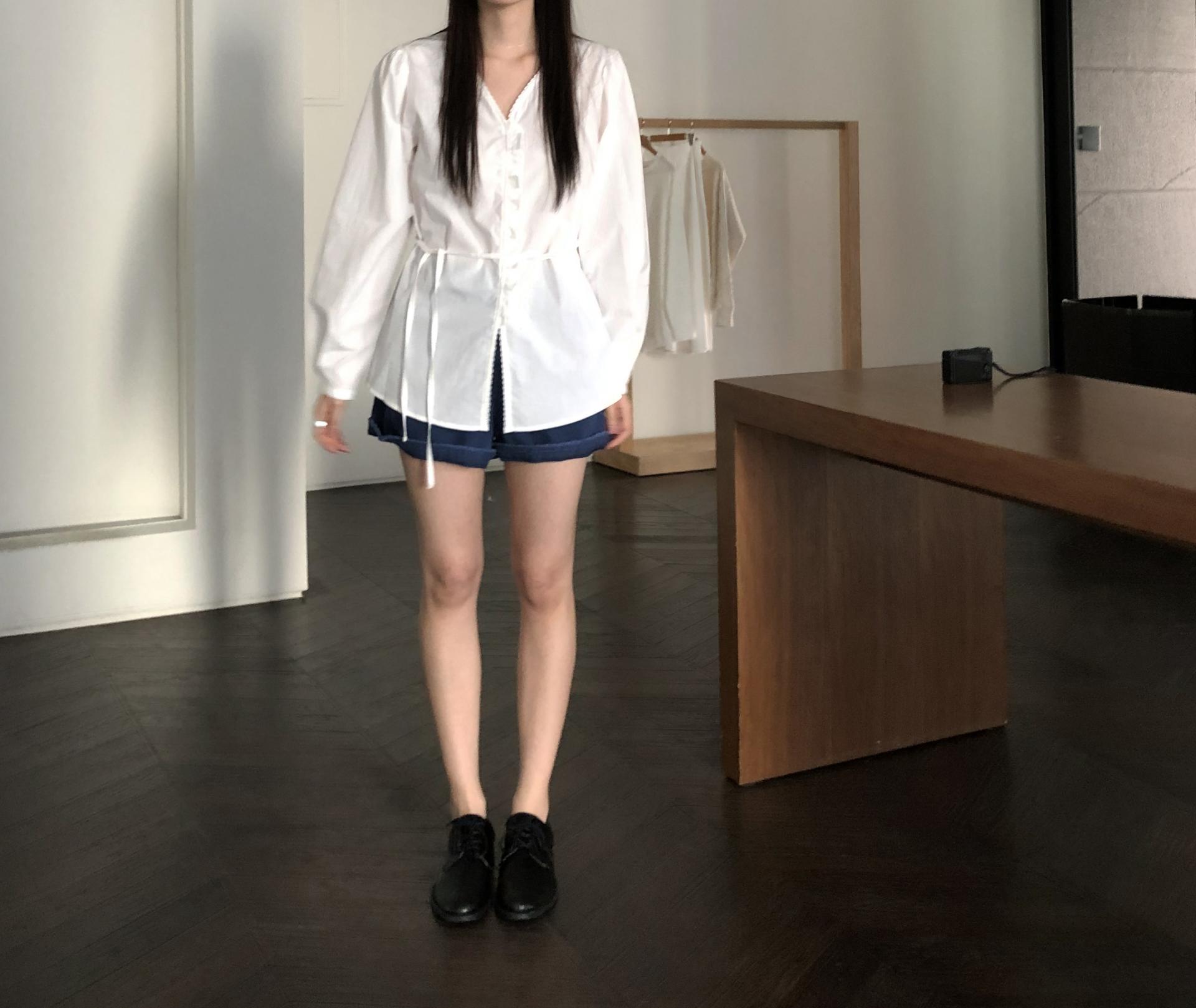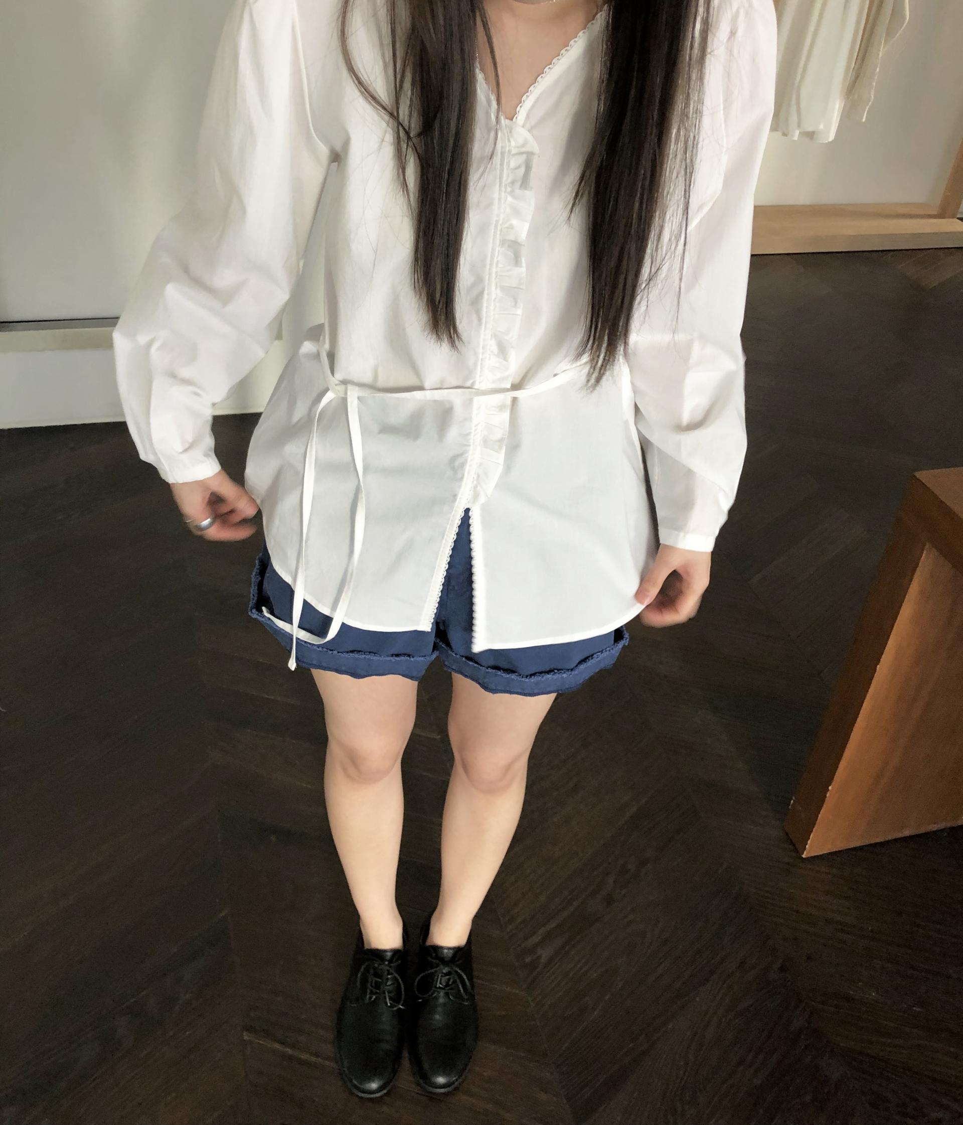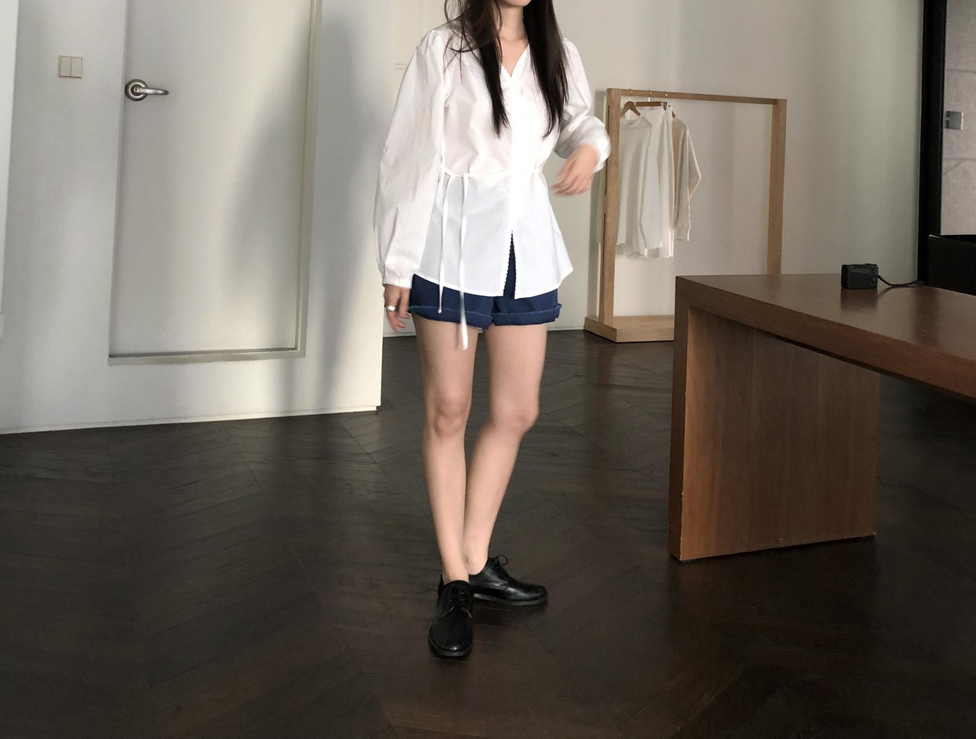소매는 과하지 않은 퍼프라인에 살짝 짧은 기장으로, 셔츠보다는 확실히 블라우스 같은 인상을 만들어줍니다. 덕분에 전체적인 분위기도 느끼하지 않고 산뜻해요. 허리에는 끈 디테일이 있어 묶어서 실루엣을 잡아 연출해도 좋고, 툭 늘어뜨려도 괜찮습니다. 쿨한 무드의 아이템에 분위기를 더해주기 좋은 블라우스예요. 딱 떨어지는 민소매 탑과 레이어링 했을 때 조화가 참 좋았습니다. 단추가 있는 셔츠 디자인을 베이스로 하기 때문에 이너 탑에 가볍게 걸쳐 연출해도 좋아요.