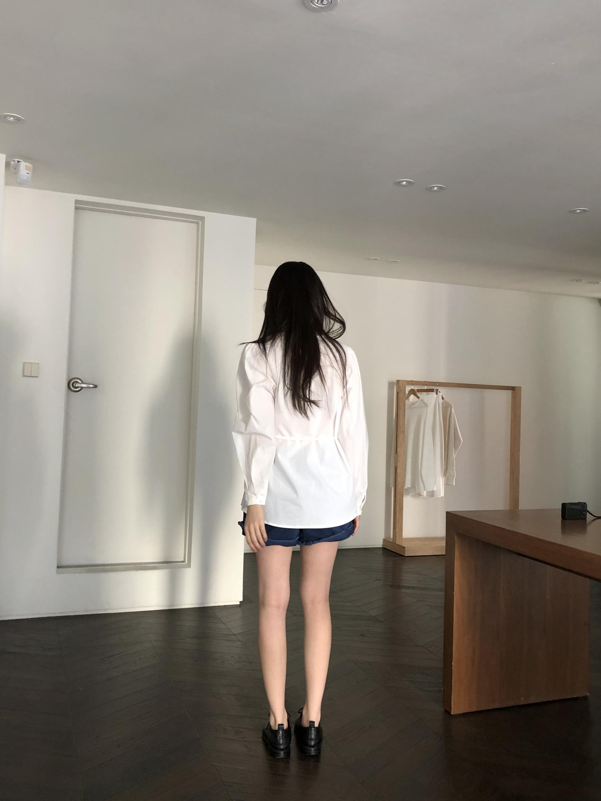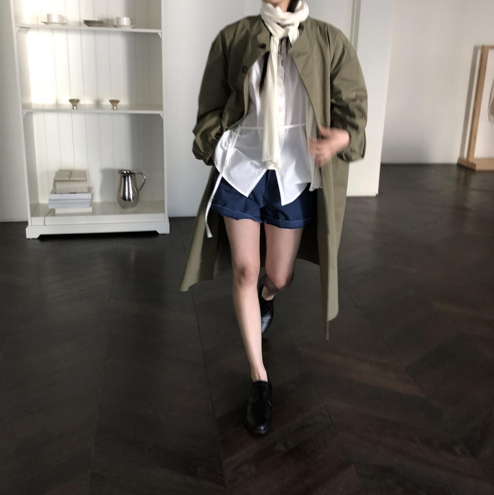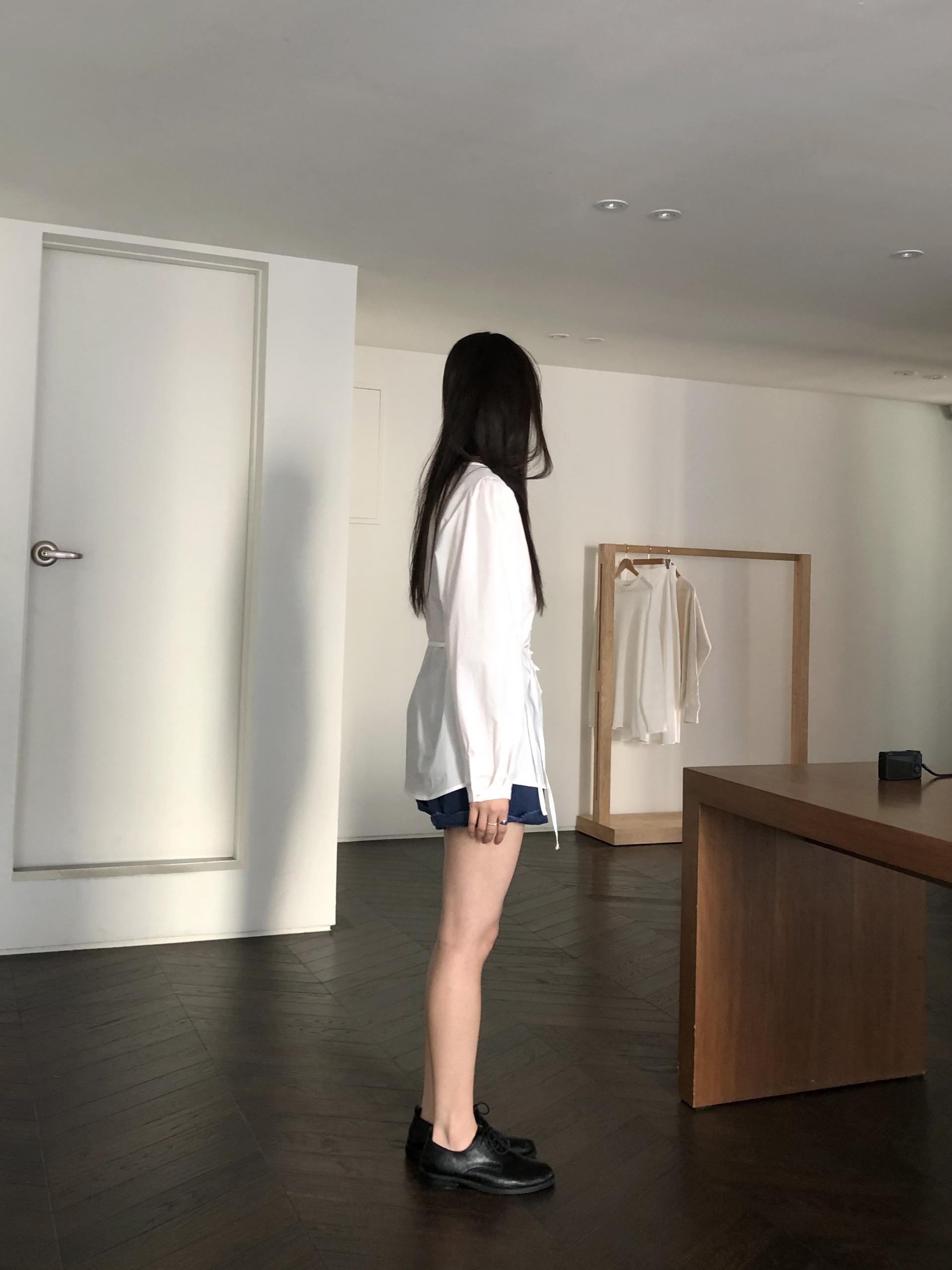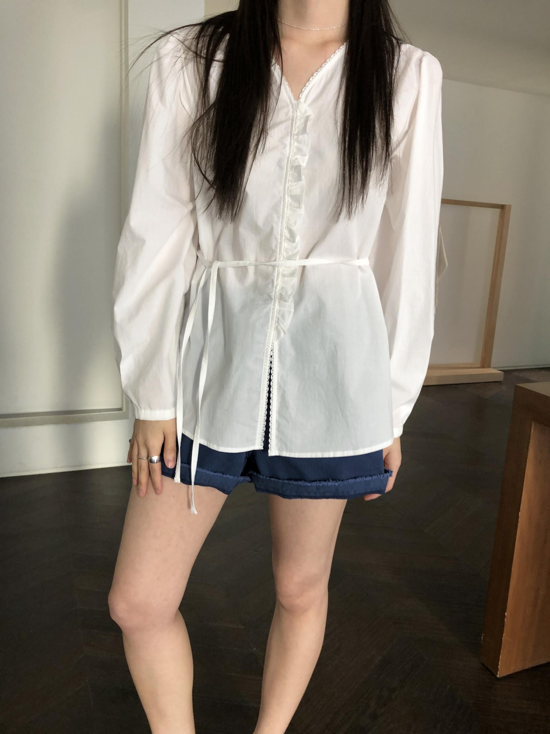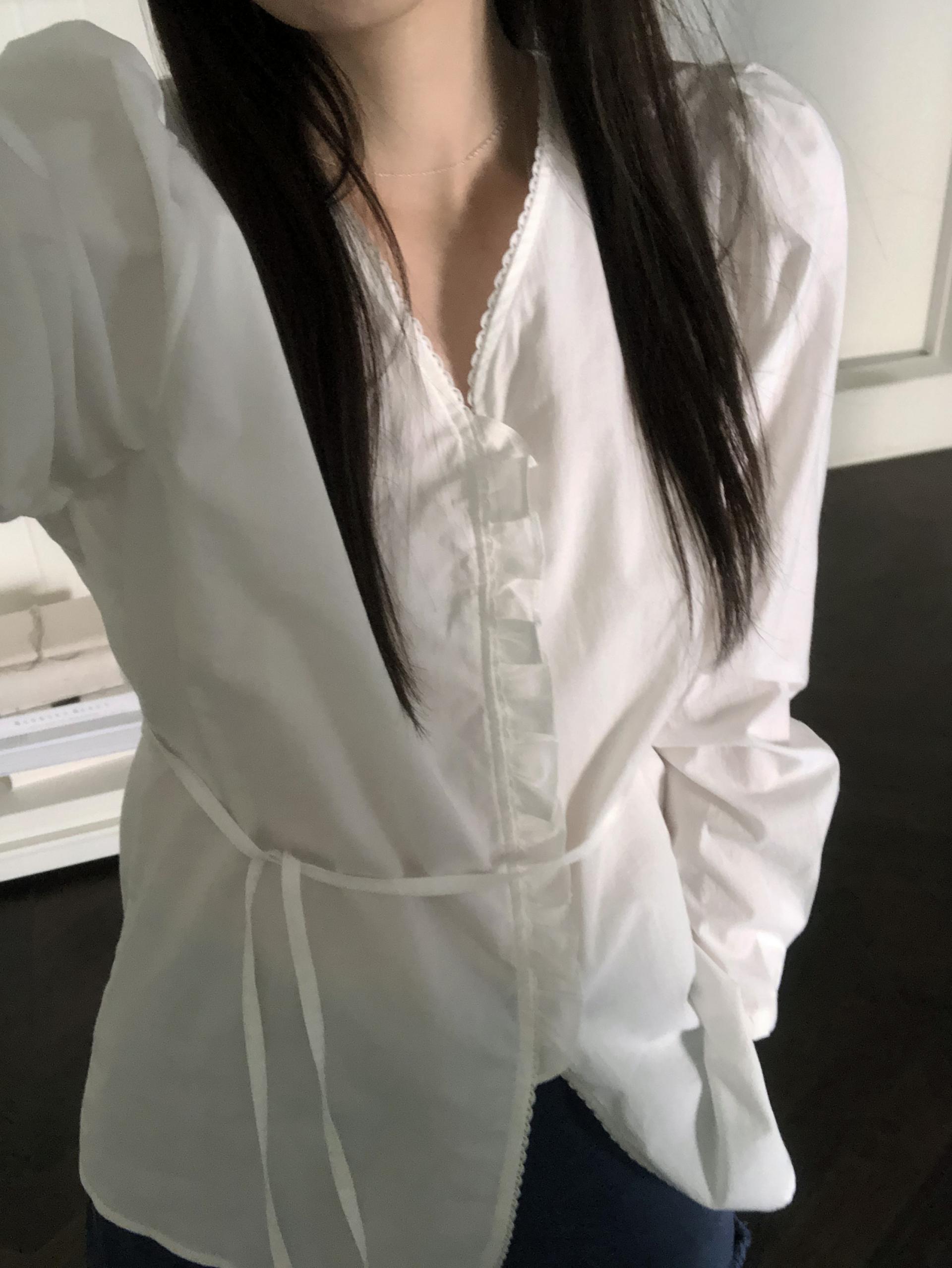 소매는 과하지 않은 퍼프라인에 살짝 짧은 기장으로, 셔츠보다는 확실히 블라우스 같은 인상을 만들어줍니다. 덕분에 전체적인 분위기도 느끼하지 않고 산뜻해요. 허리에는 끈 디테일이 있어 묶어서 실루엣을 잡아 연출해도 좋고, 툭 늘어뜨려도 괜찮습니다. 쿨한 무드의 아이템에 분위기를 더해주기 좋은 블라우스예요. 딱 떨어지는 민소매 탑과 레이어링 했을 때 조화가 참 좋았습니다. 단추가 있는 셔츠 디자인을 베이스로 하기 때문에 이너 탑에 가볍게 걸쳐 연출해도 좋아요.