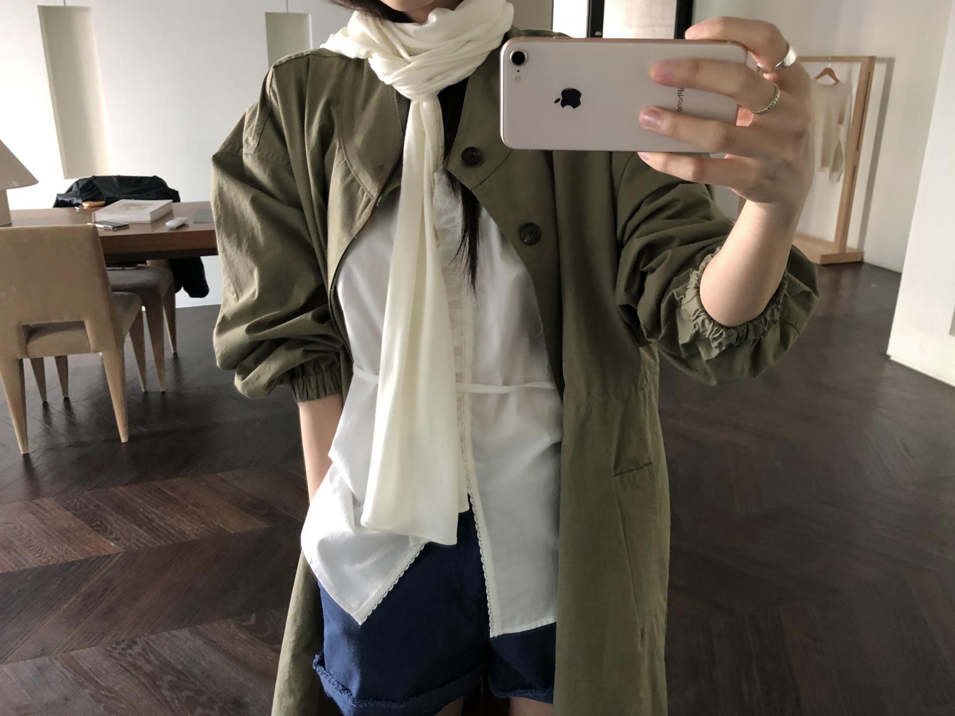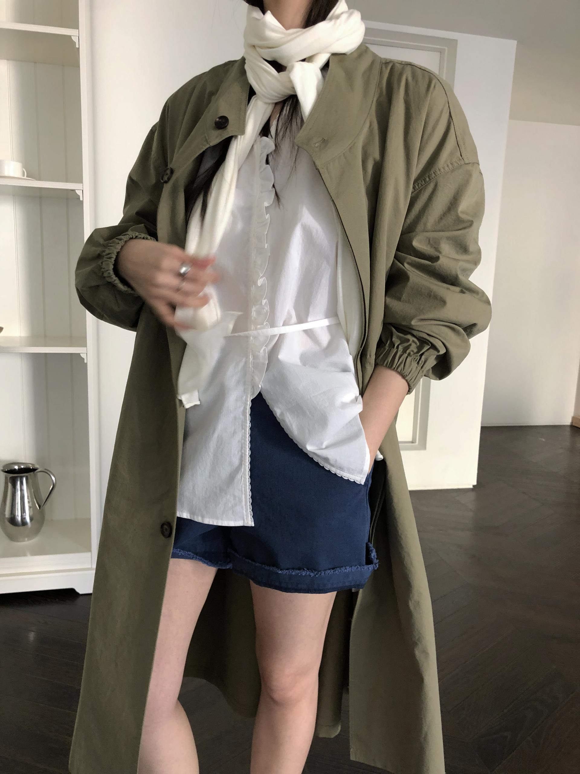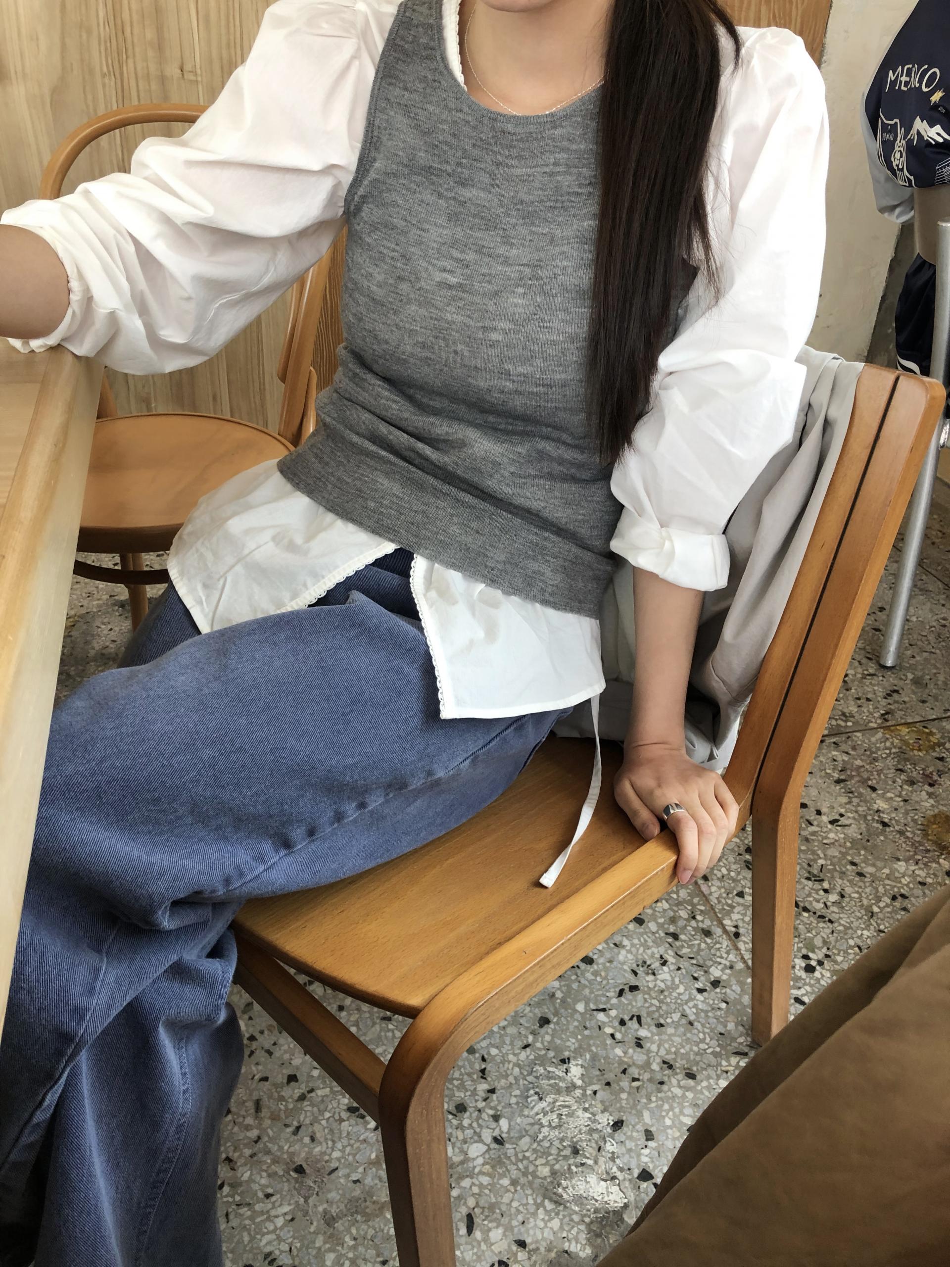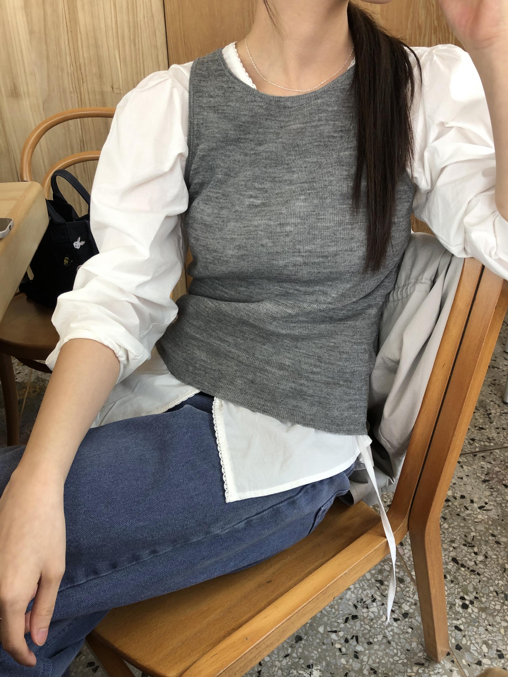 소매는 과하지 않은 퍼프라인에 살짝 짧은 기장으로, 셔츠보다는 확실히 블라우스 같은 인상을 만들어줍니다. 덕분에 전체적인 분위기도 느끼하지 않고 산뜻해요. 허리에는 끈 디테일이 있어 묶어서 실루엣을 잡아 연출해도 좋고, 툭 늘어뜨려도 괜찮습니다. 쿨한 무드의 아이템에 분위기를 더해주기 좋은 블라우스예요. 딱 떨어지는 민소매 탑과 레이어링 했을 때 조화가 참 좋았습니다. 단추가 있는 셔츠 디자인을 베이스로 하기 때문에 이너 탑에 가볍게 걸쳐 연출해도 좋아요.