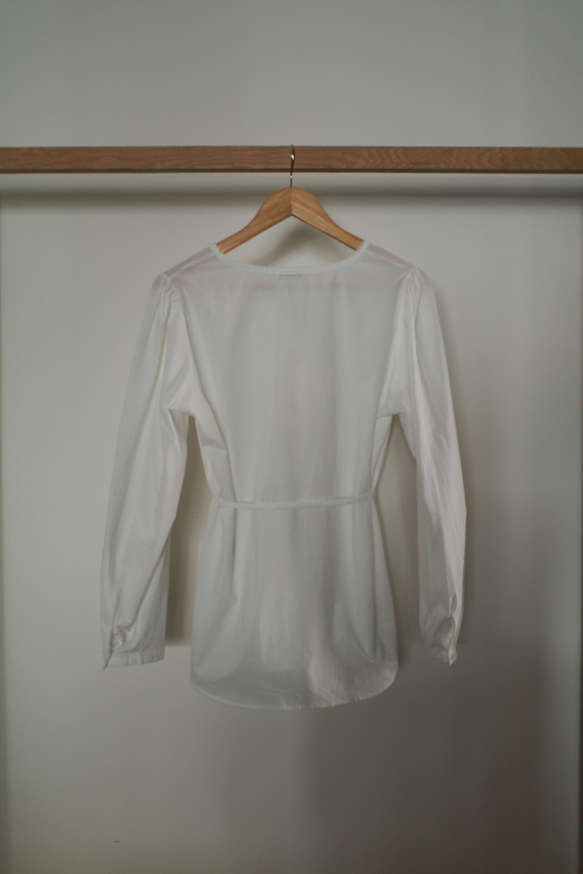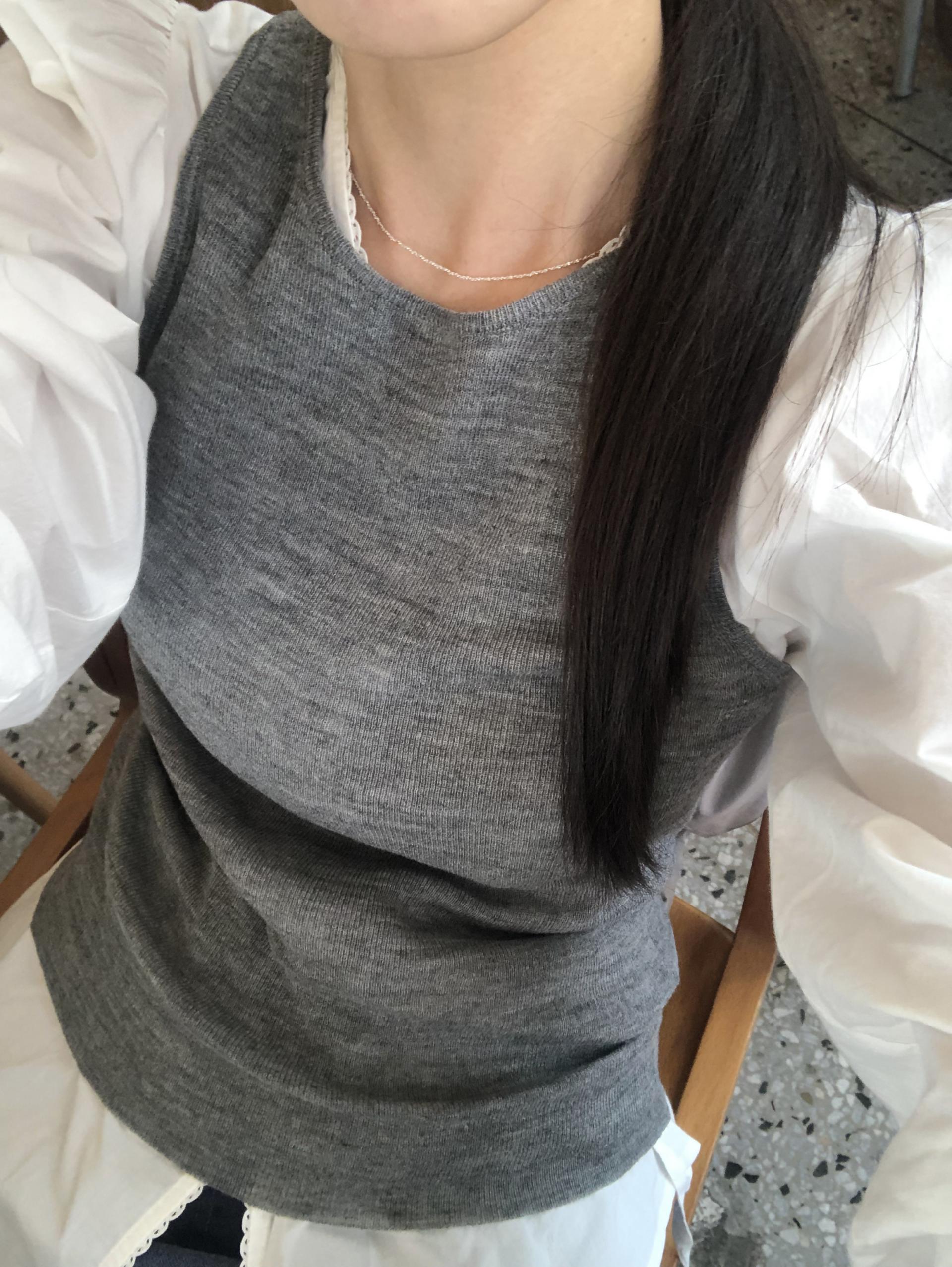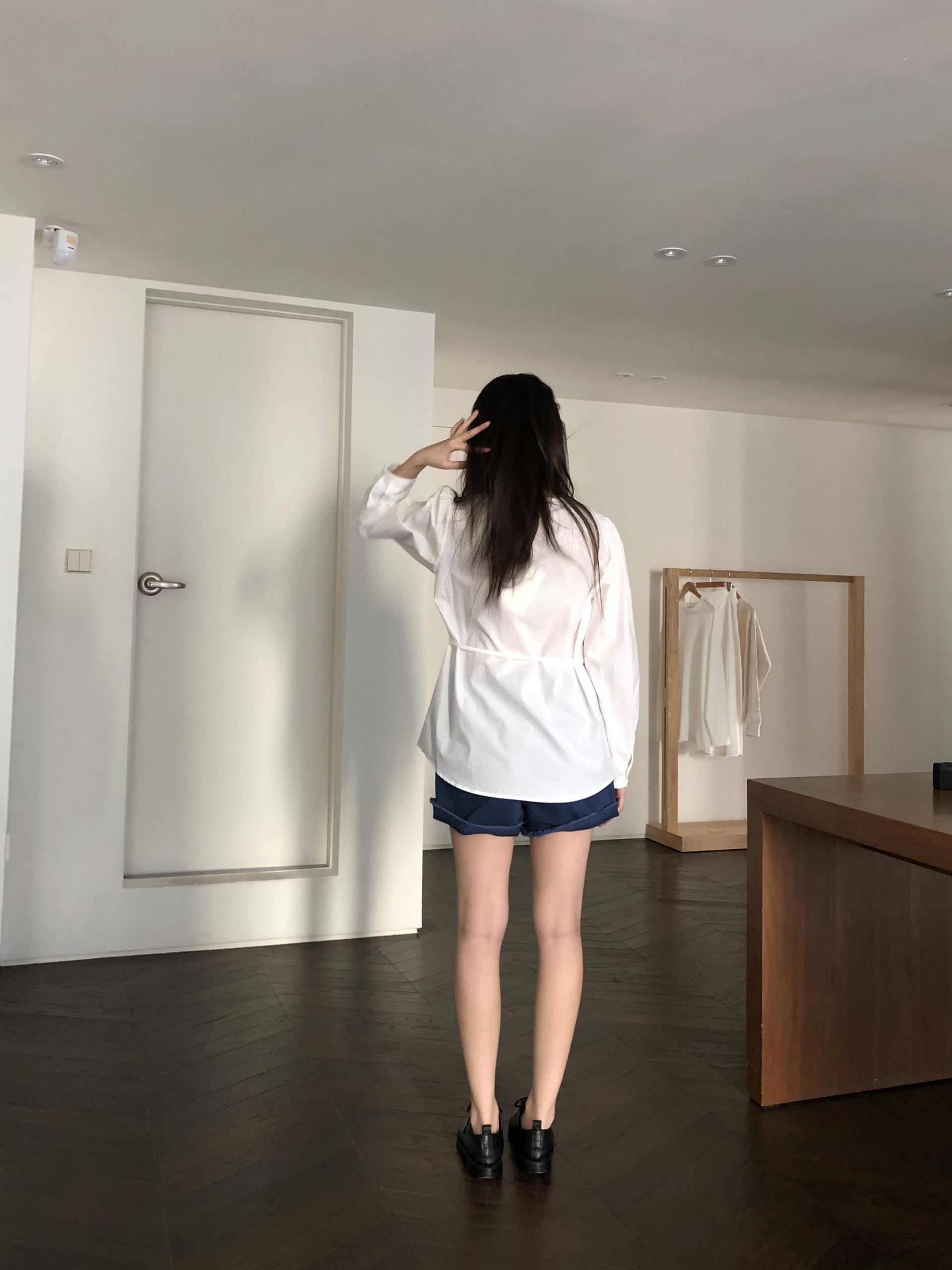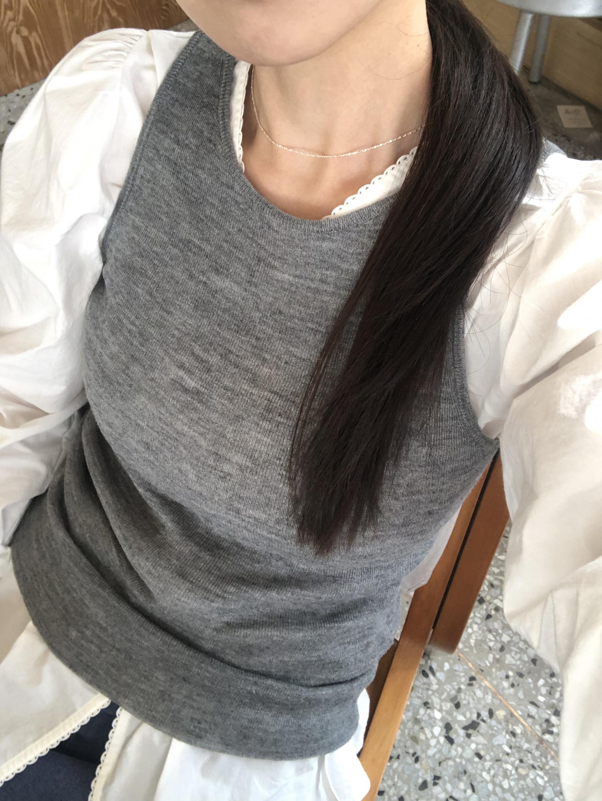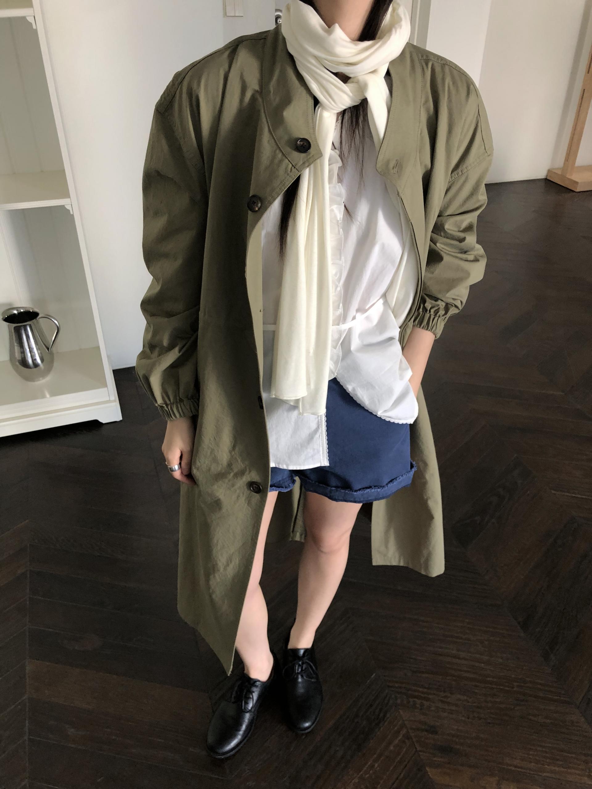 소매는 과하지 않은 퍼프라인에 살짝 짧은 기장으로, 셔츠보다는 확실히 블라우스 같은 인상을 만들어줍니다. 덕분에 전체적인 분위기도 느끼하지 않고 산뜻해요. 허리에는 끈 디테일이 있어 묶어서 실루엣을 잡아 연출해도 좋고, 툭 늘어뜨려도 괜찮습니다. 쿨한 무드의 아이템에 분위기를 더해주기 좋은 블라우스예요. 딱 떨어지는 민소매 탑과 레이어링 했을 때 조화가 참 좋았습니다. 단추가 있는 셔츠 디자인을 베이스로 하기 때문에 이너 탑에 가볍게 걸쳐 연출해도 좋아요.