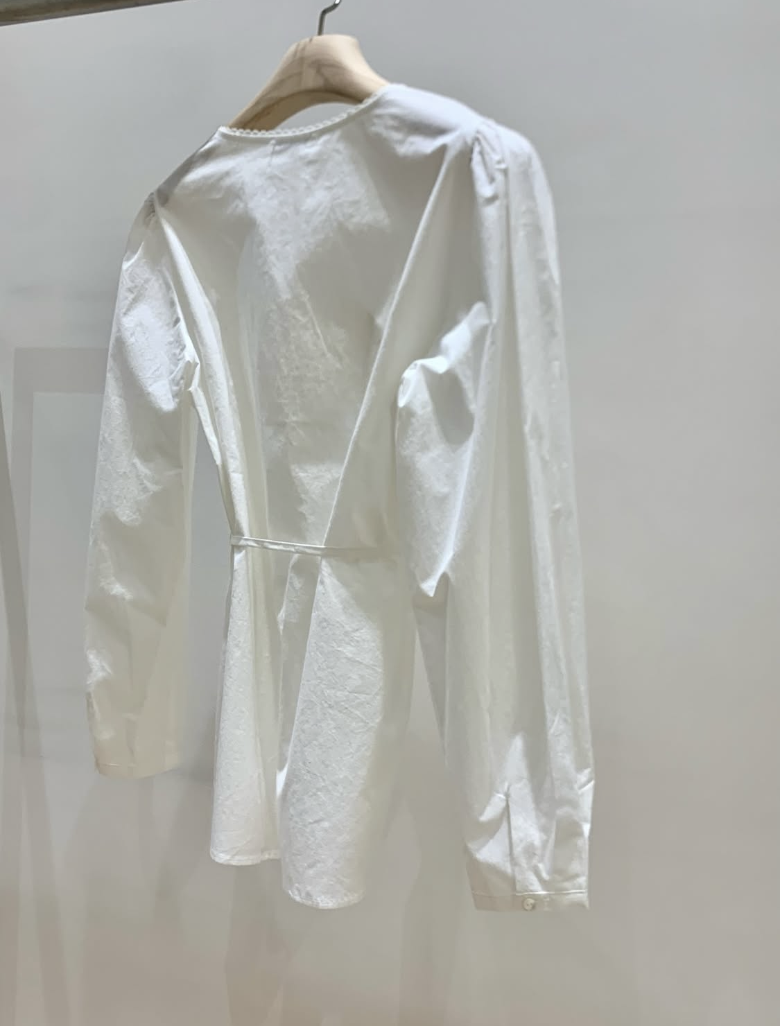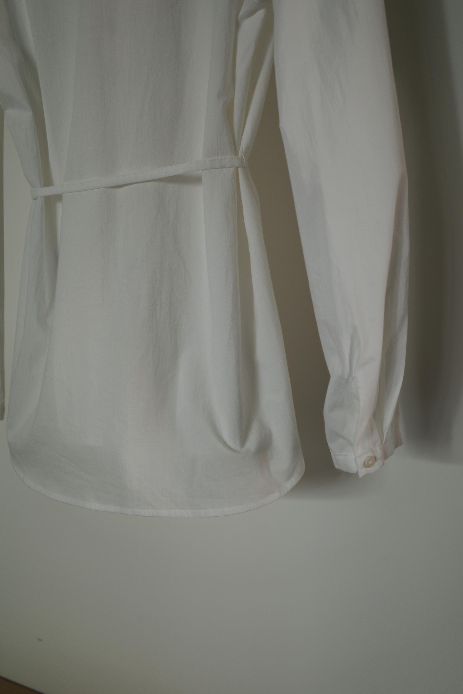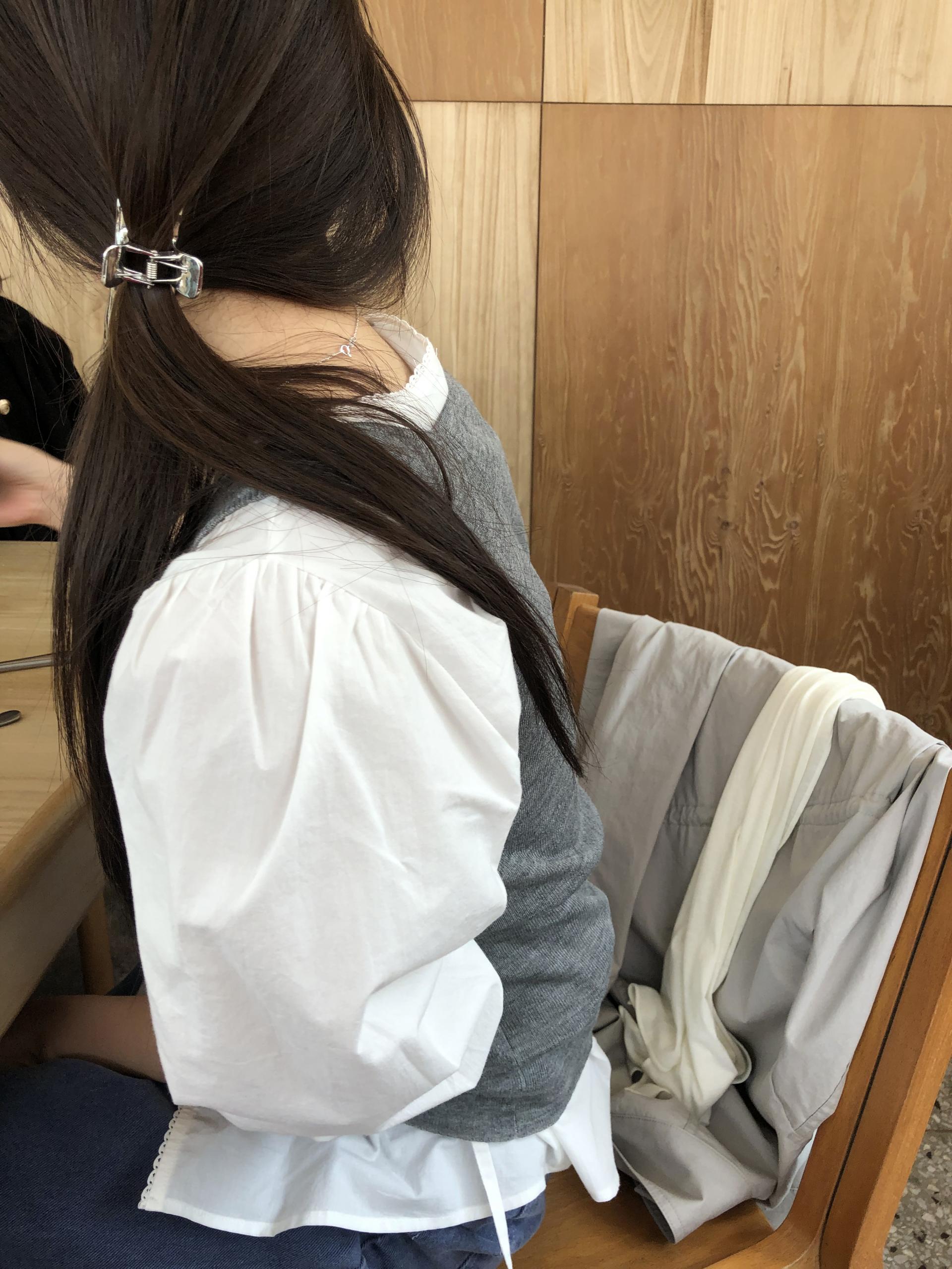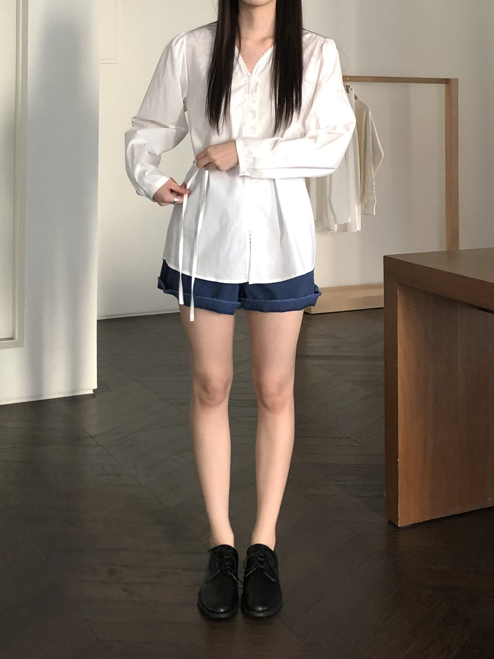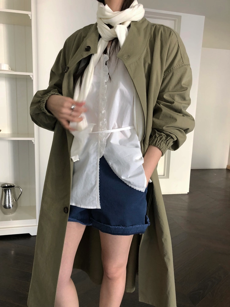 소매는 과하지 않은 퍼프라인에 살짝 짧은 기장으로, 셔츠보다는 확실히 블라우스 같은 인상을 만들어줍니다. 덕분에 전체적인 분위기도 느끼하지 않고 산뜻해요. 허리에는 끈 디테일이 있어 묶어서 실루엣을 잡아 연출해도 좋고, 툭 늘어뜨려도 괜찮습니다. 쿨한 무드의 아이템에 분위기를 더해주기 좋은 블라우스예요. 딱 떨어지는 민소매 탑과 레이어링 했을 때 조화가 참 좋았습니다. 단추가 있는 셔츠 디자인을 베이스로 하기 때문에 이너 탑에 가볍게 걸쳐 연출해도 좋아요.