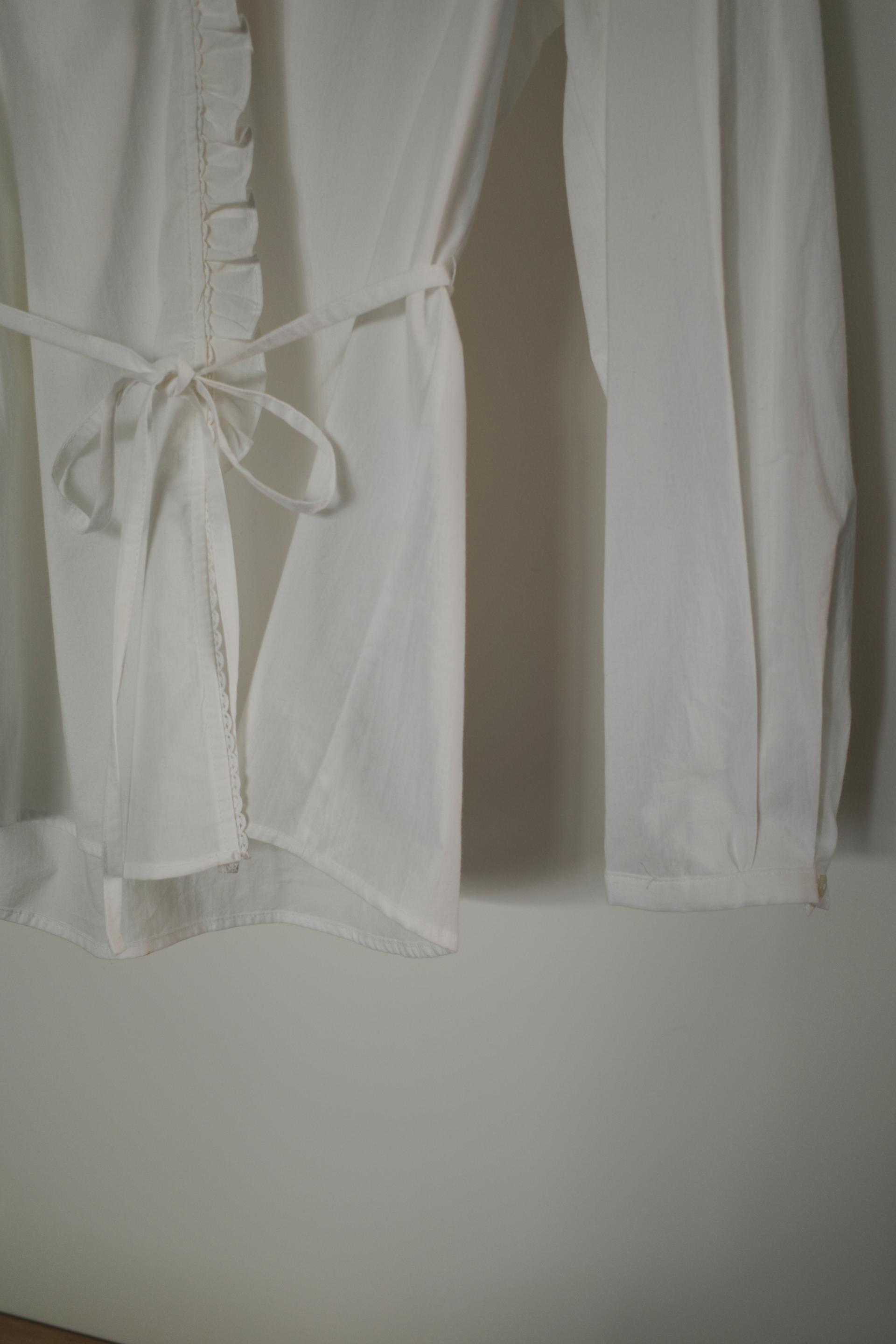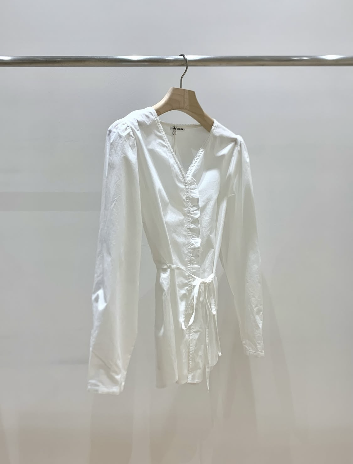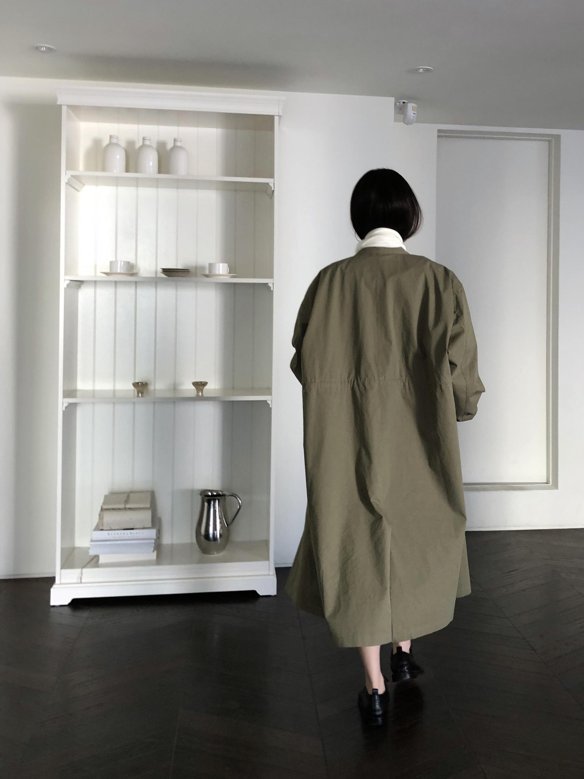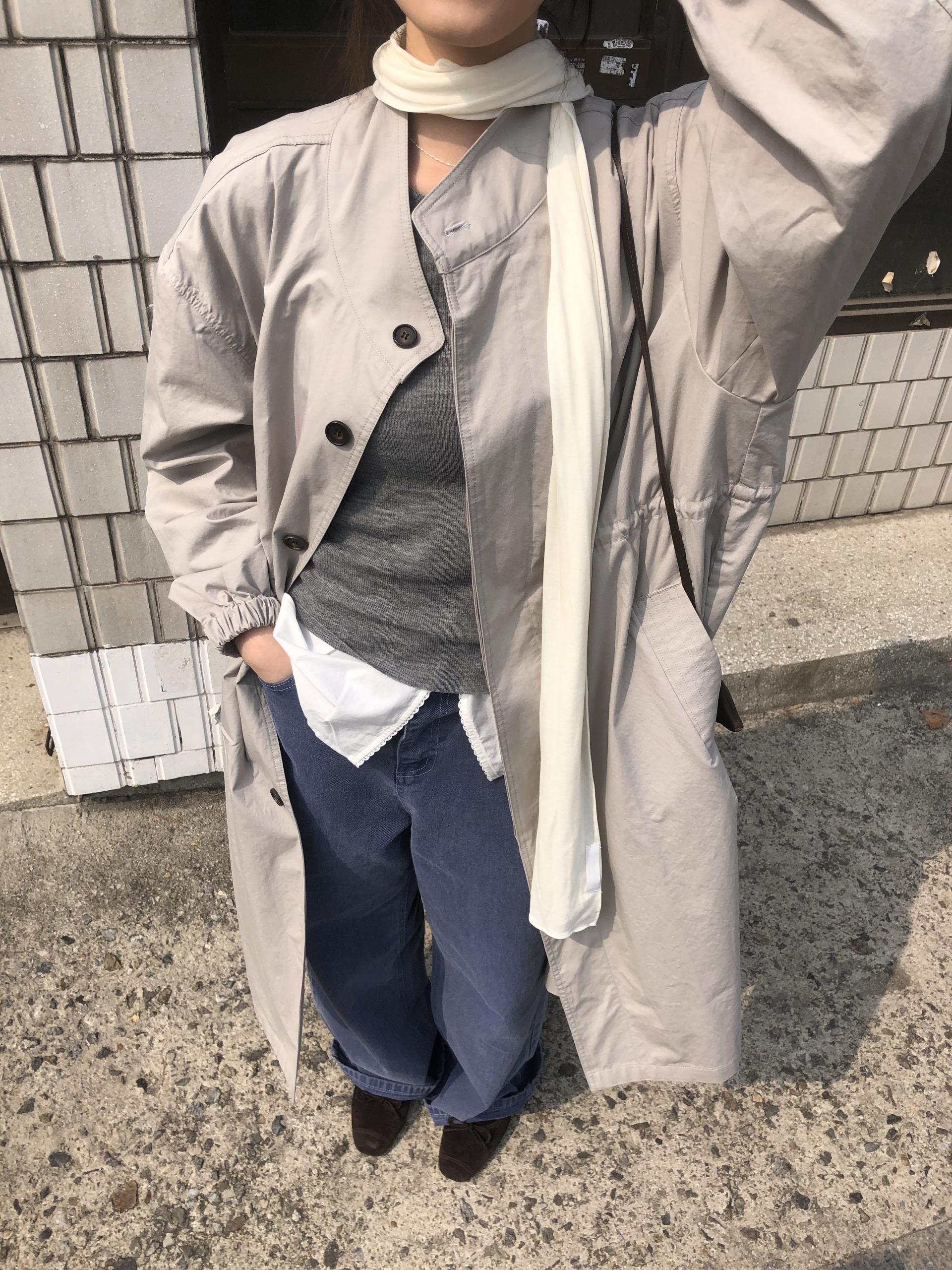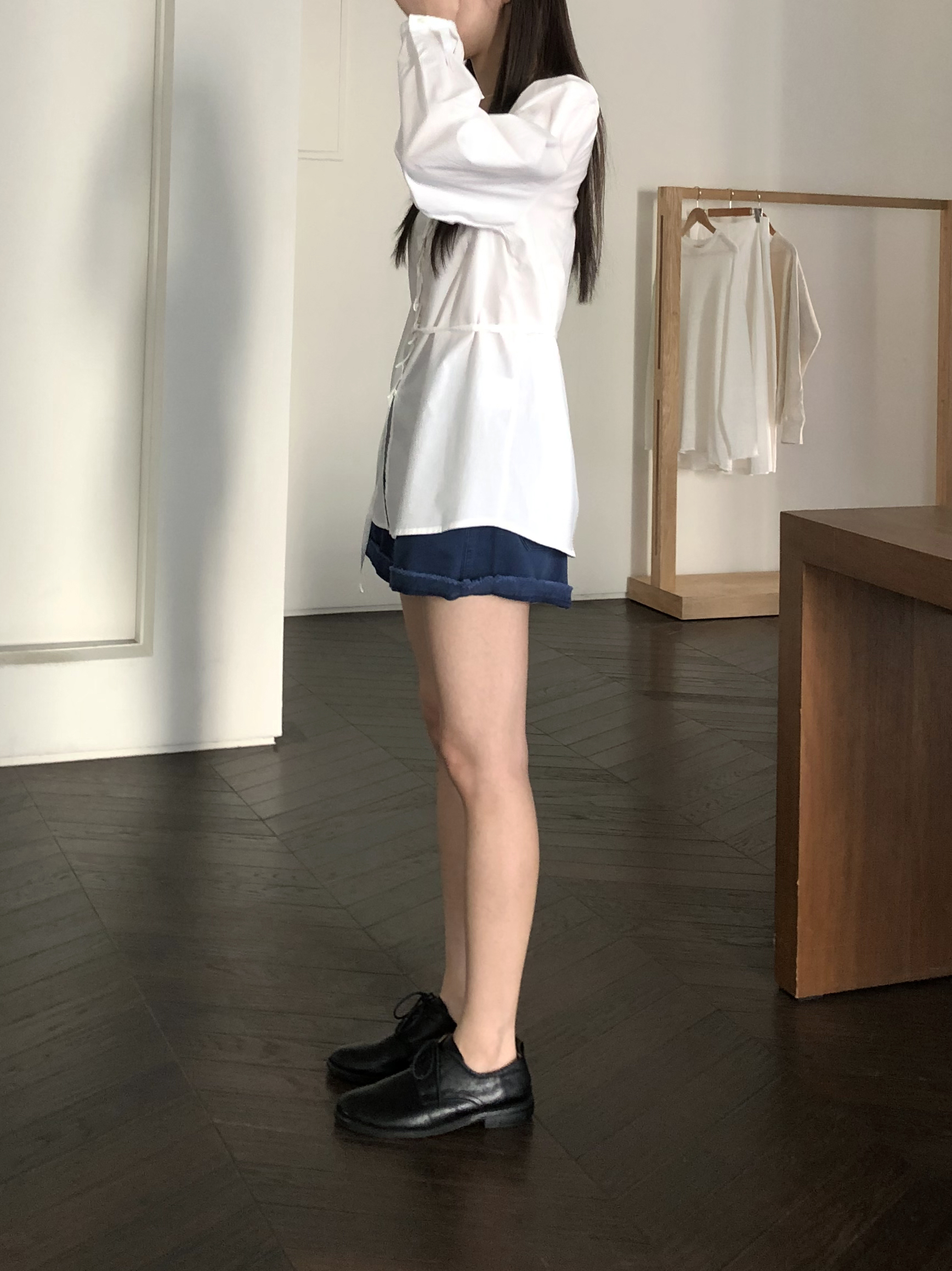 소매는 과하지 않은 퍼프라인에 살짝 짧은 기장으로, 셔츠보다는 확실히 블라우스 같은 인상을 만들어줍니다. 덕분에 전체적인 분위기도 느끼하지 않고 산뜻해요. 허리에는 끈 디테일이 있어 묶어서 실루엣을 잡아 연출해도 좋고, 툭 늘어뜨려도 괜찮습니다. 쿨한 무드의 아이템에 분위기를 더해주기 좋은 블라우스예요. 딱 떨어지는 민소매 탑과 레이어링 했을 때 조화가 참 좋았습니다. 단추가 있는 셔츠 디자인을 베이스로 하기 때문에 이너 탑에 가볍게 걸쳐 연출해도 좋아요.