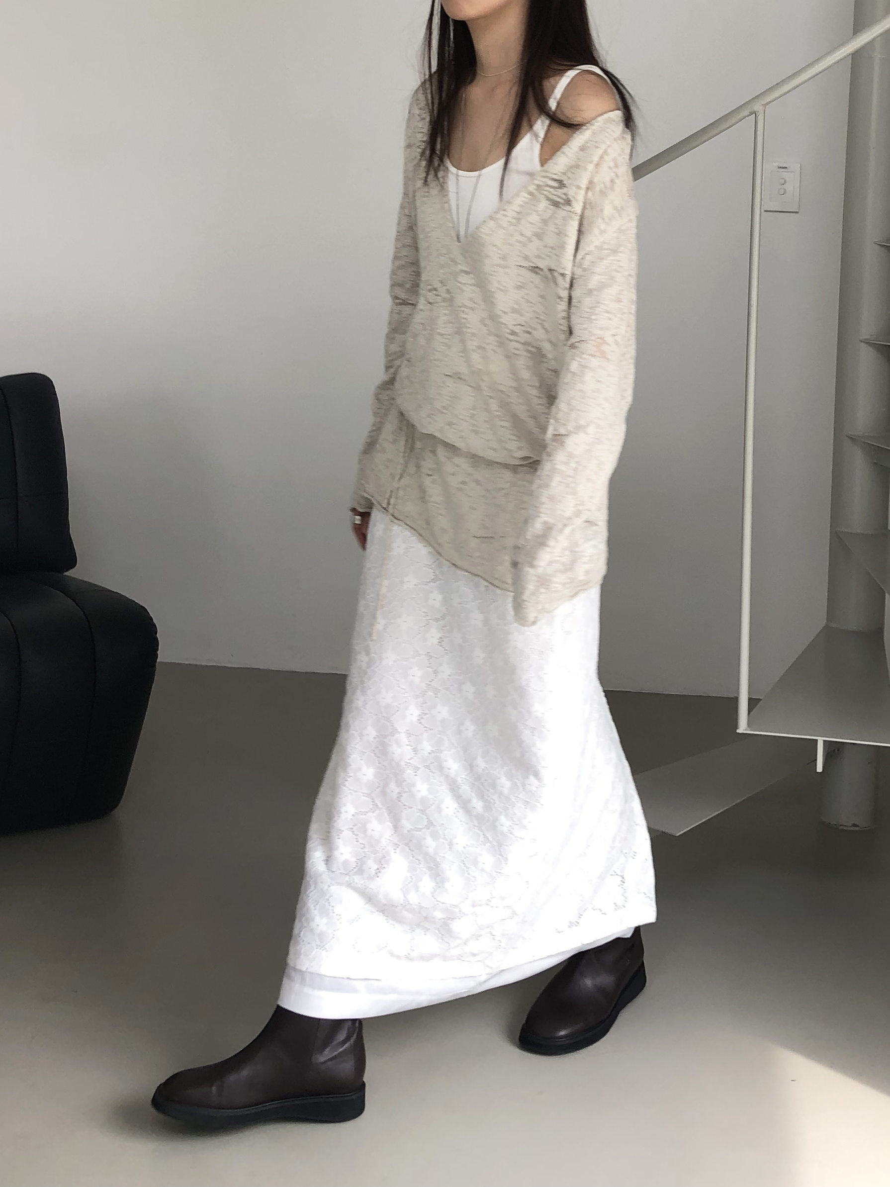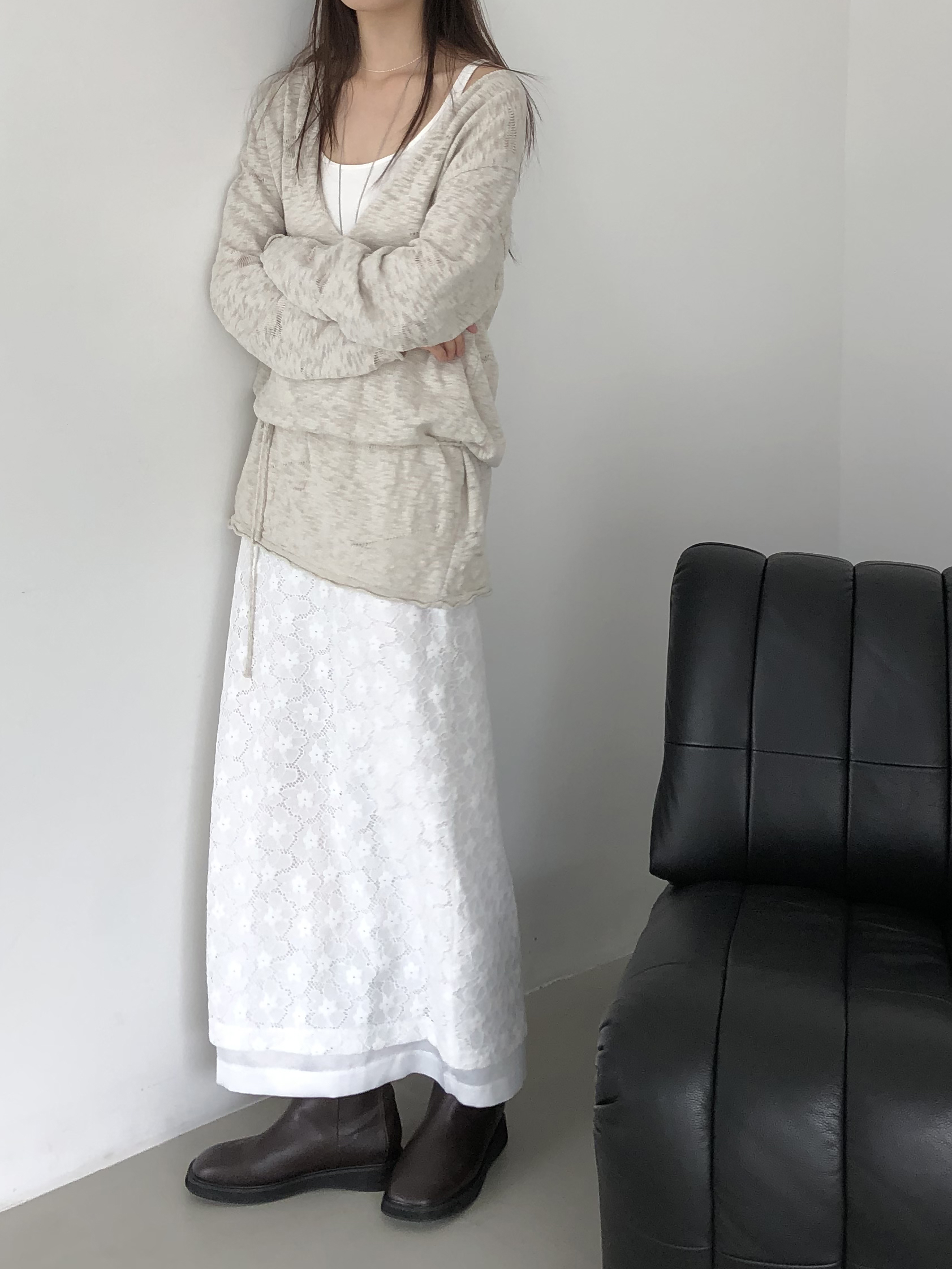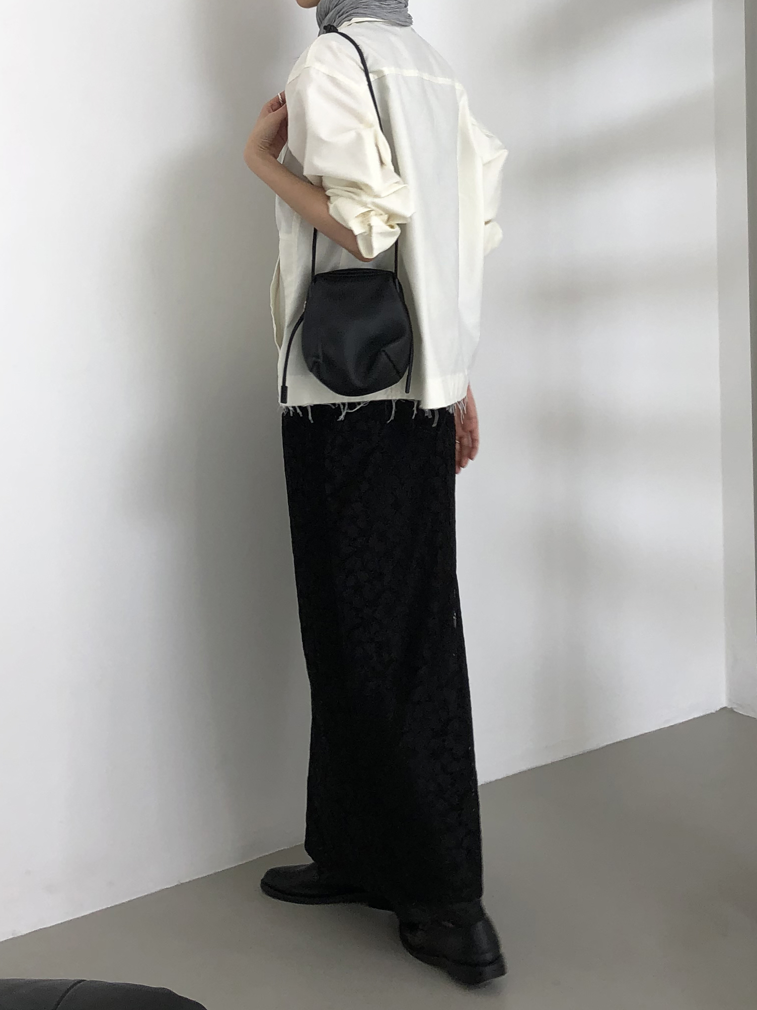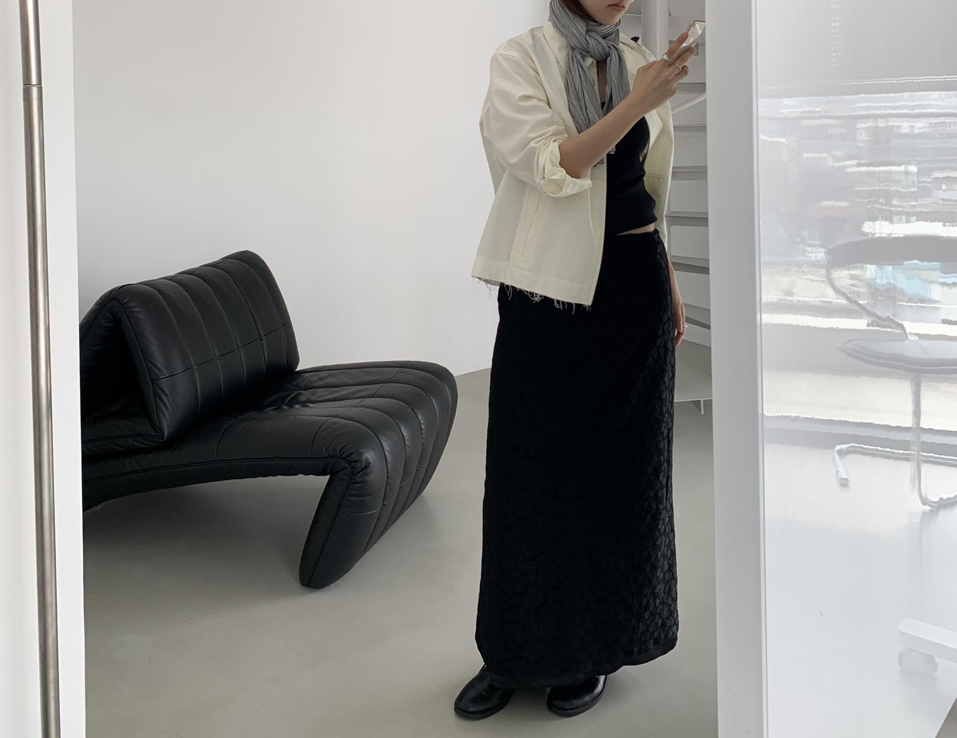 맥시한 기장에 여유로운 핏감으로 깔끔하게 뚝 떨어지는 실루엣을 가졌습니다. 안감이 끝까지 레이어드 되어 밑단 아래로 드러나요. 걸을 때마다 크로셰 사이로 안감이 은은하게 비칩니다. 안감이 끝까지 더해졌을 뿐인데 훨씬 김이감이 있는 무드를 느낄 수 있어요.