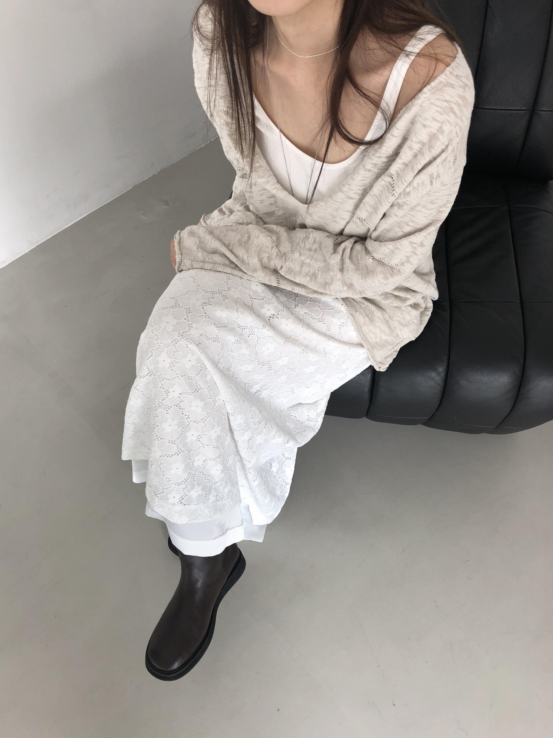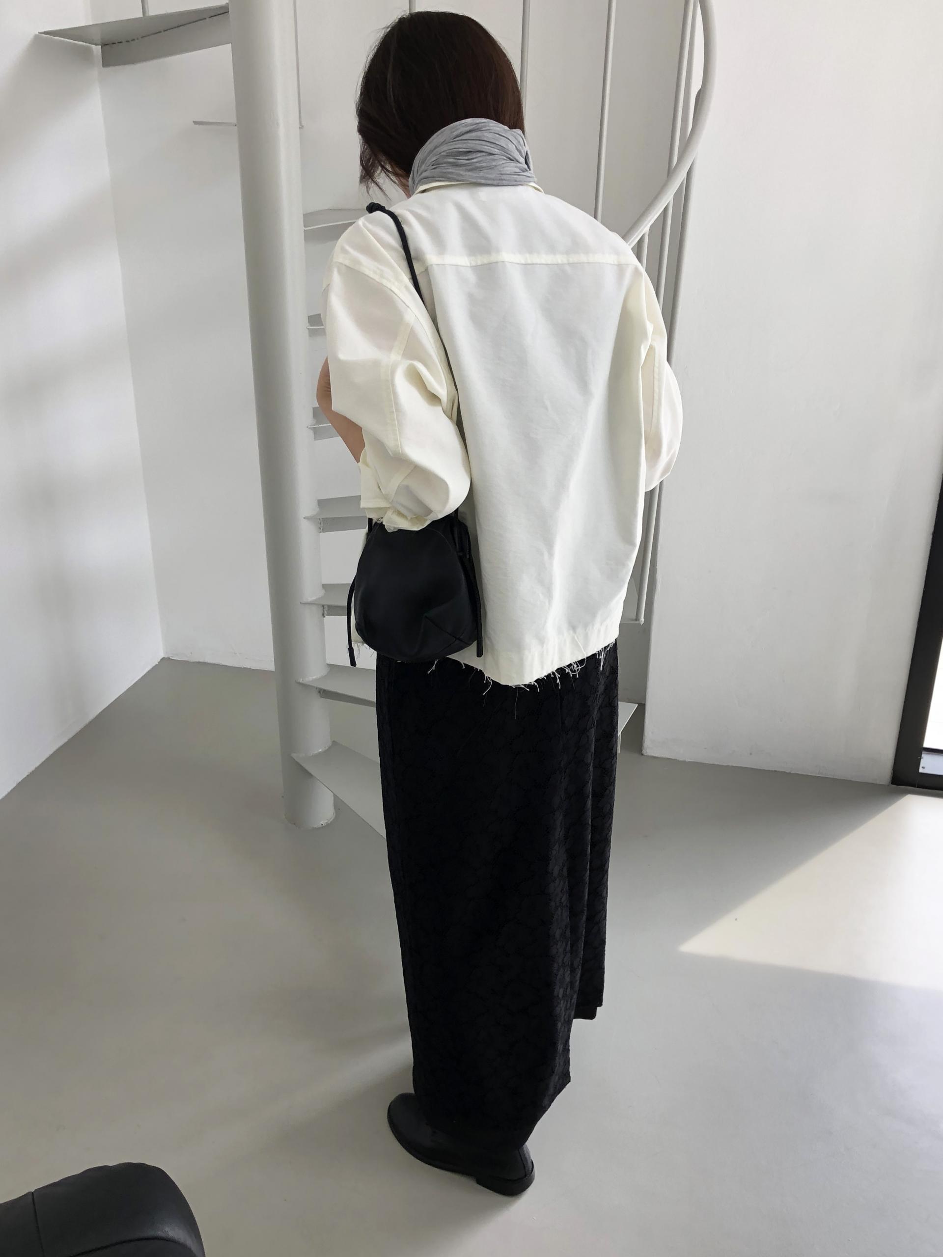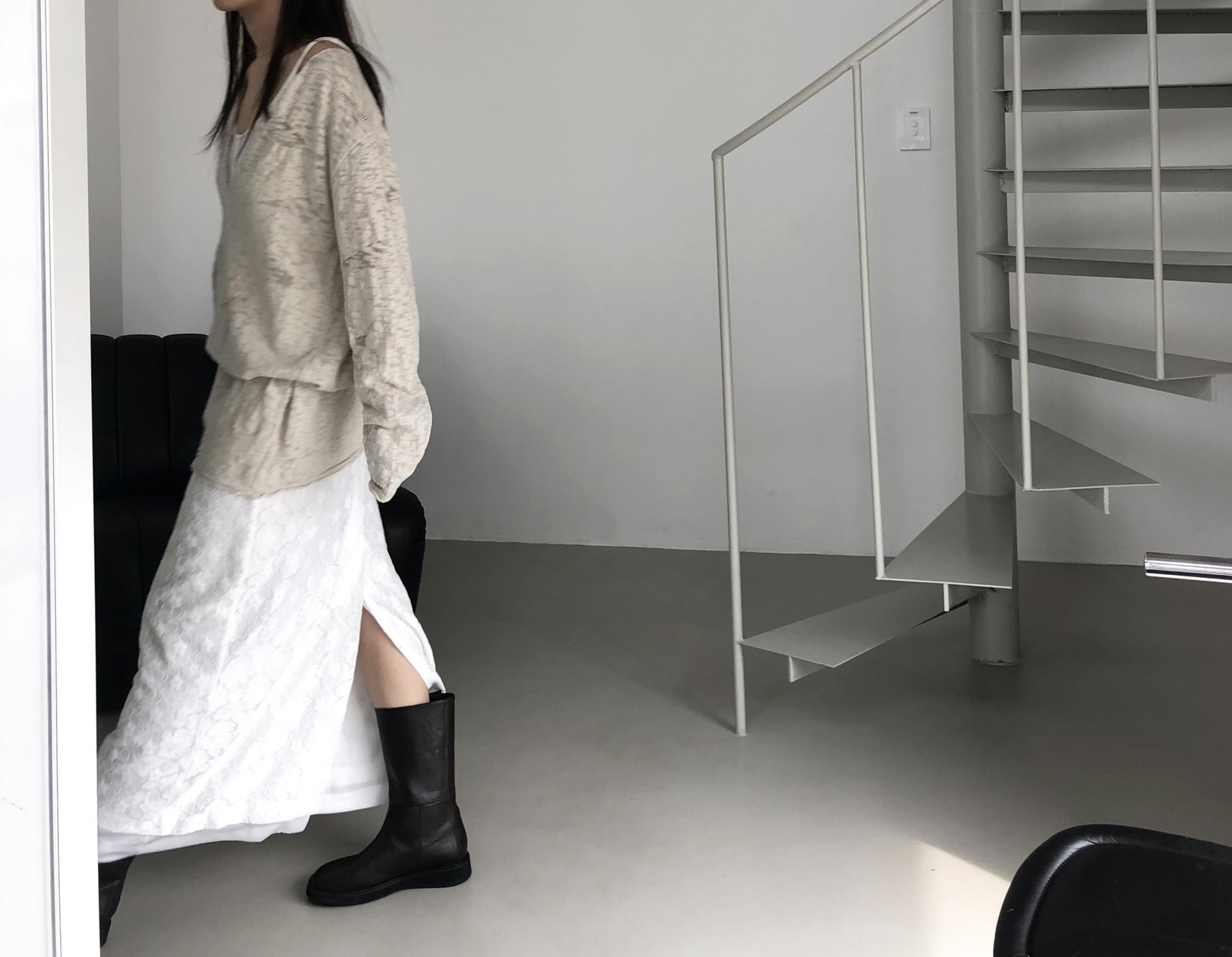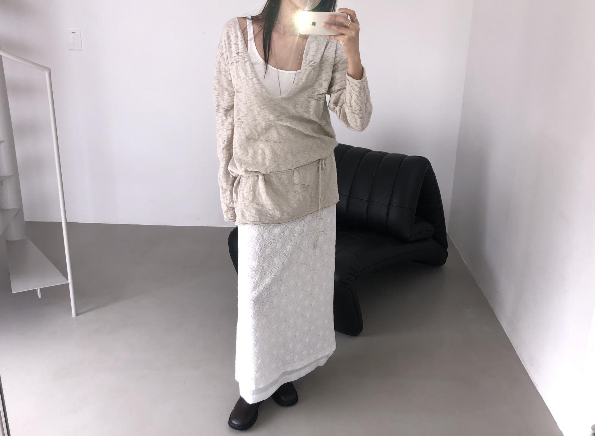 맥시한 기장에 여유로운 핏감으로 깔끔하게 뚝 떨어지는 실루엣을 가졌습니다. 안감이 끝까지 레이어드 되어 밑단 아래로 드러나요. 걸을 때마다 크로셰 사이로 안감이 은은하게 비칩니다. 안감이 끝까지 더해졌을 뿐인데 훨씬 김이감이 있는 무드를 느낄 수 있어요.