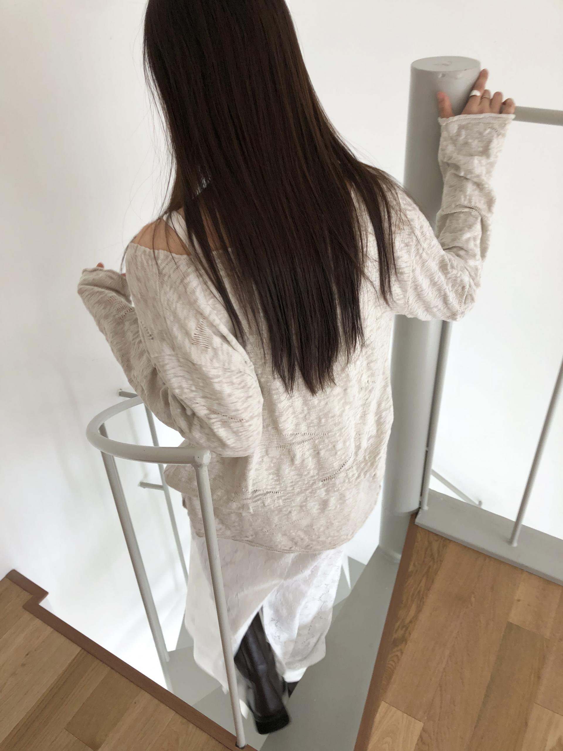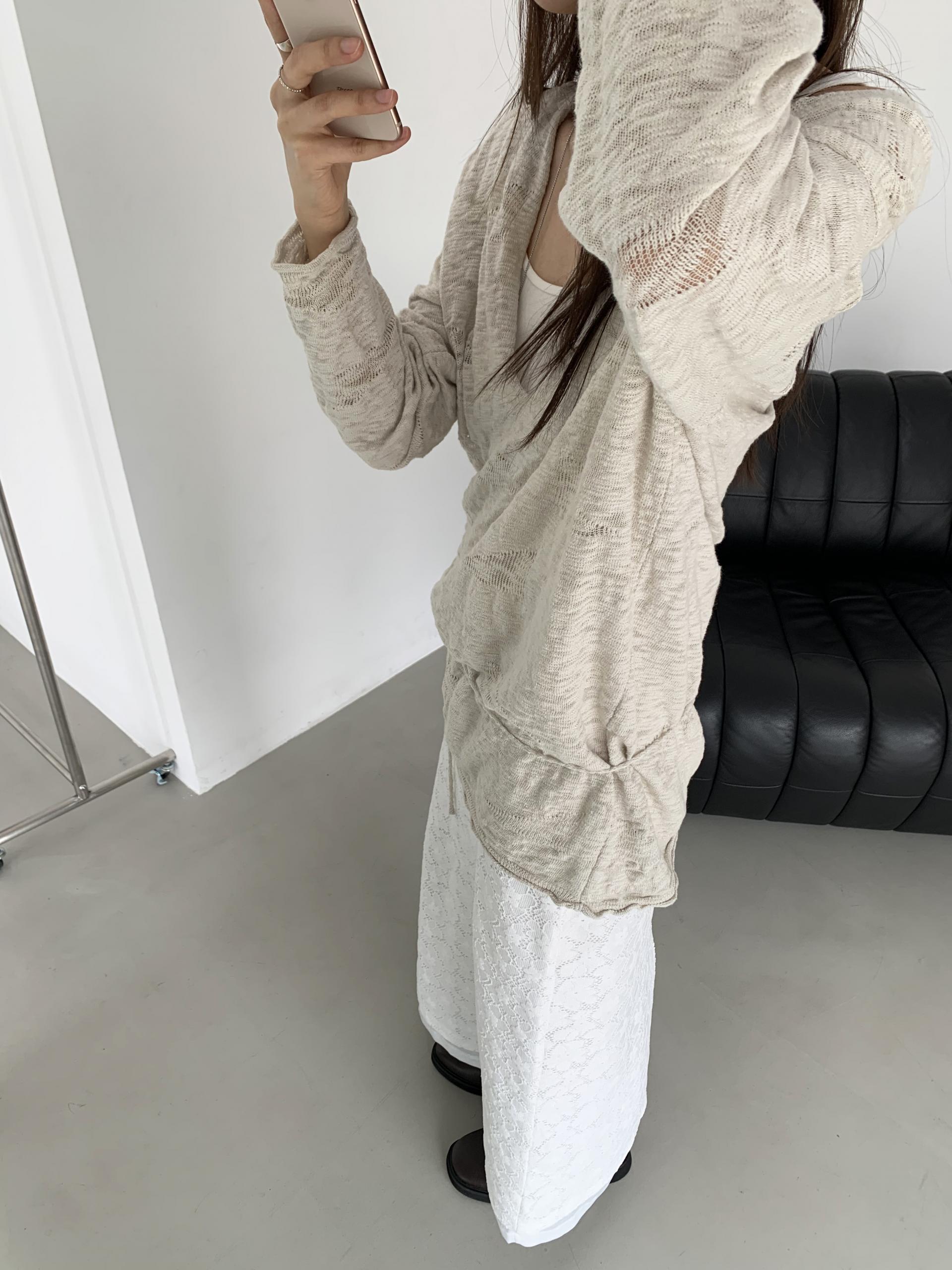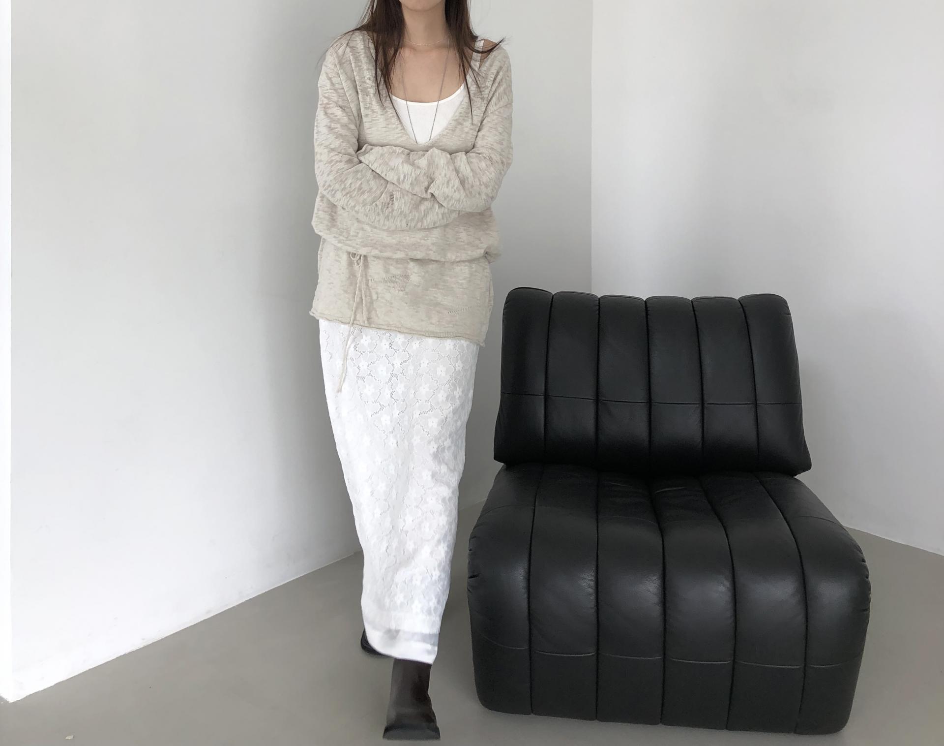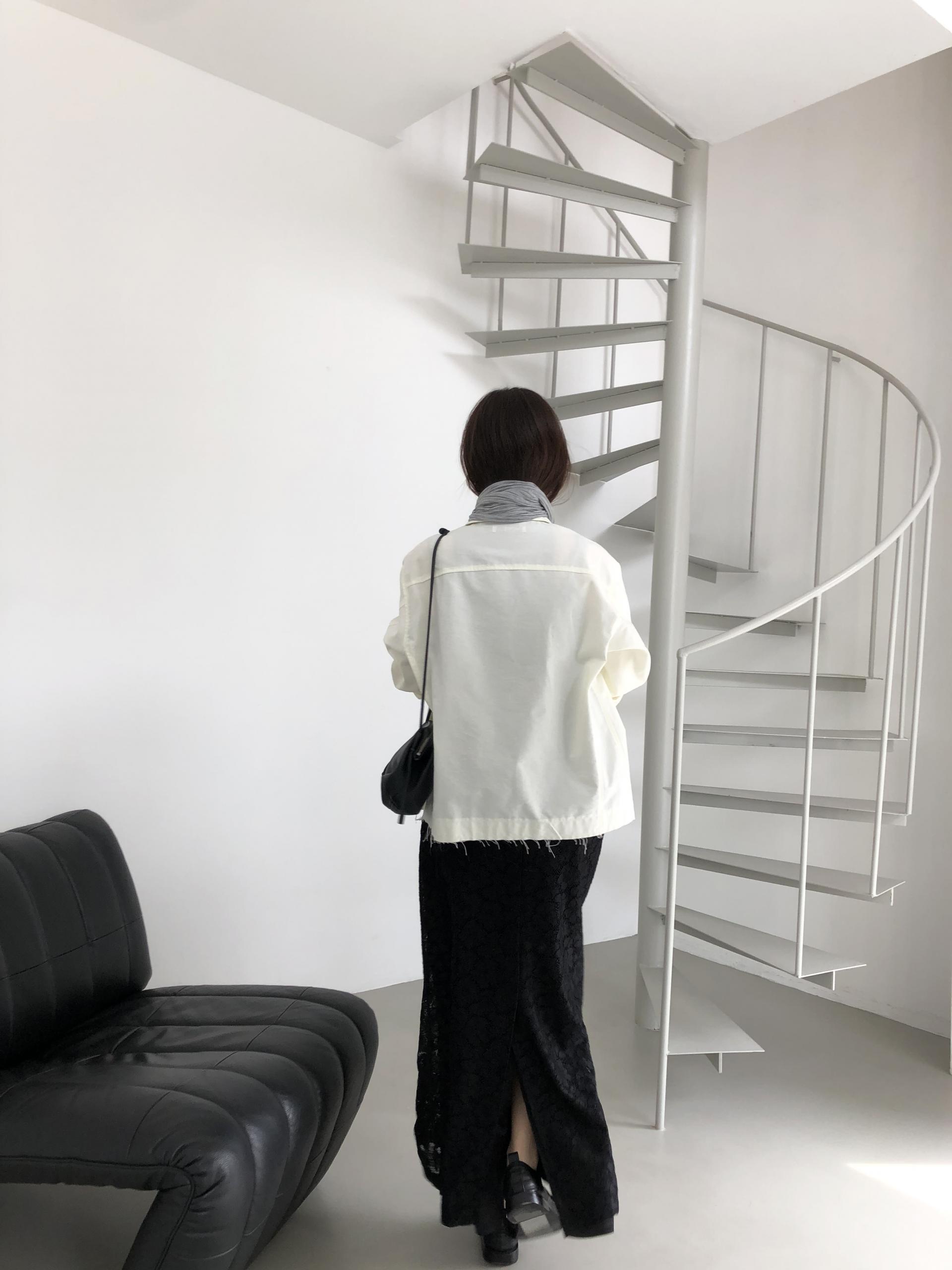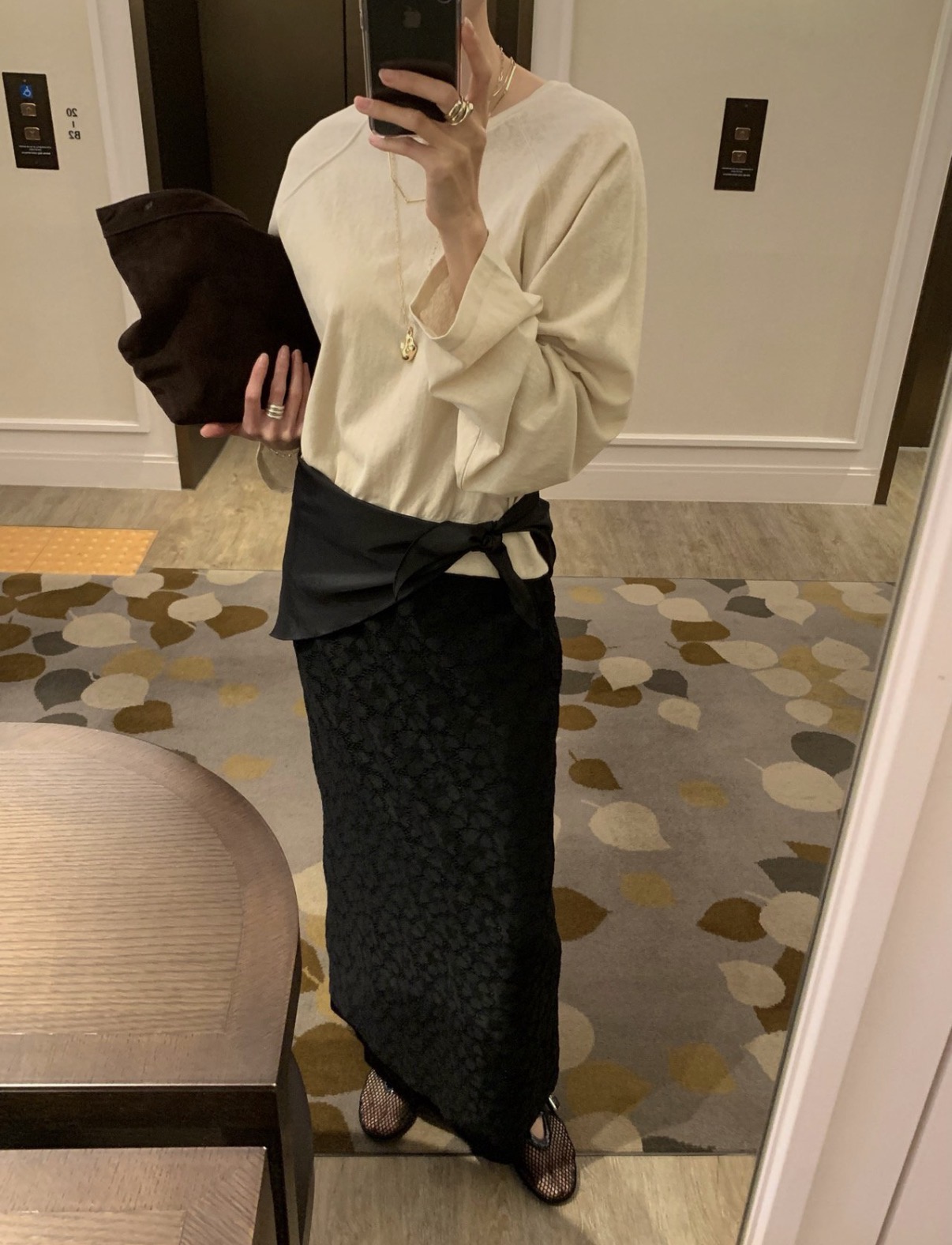 맥시한 기장에 여유로운 핏감으로 깔끔하게 뚝 떨어지는 실루엣을 가졌습니다. 안감이 끝까지 레이어드 되어 밑단 아래로 드러나요. 걸을 때마다 크로셰 사이로 안감이 은은하게 비칩니다. 안감이 끝까지 더해졌을 뿐인데 훨씬 김이감이 있는 무드를 느낄 수 있어요.