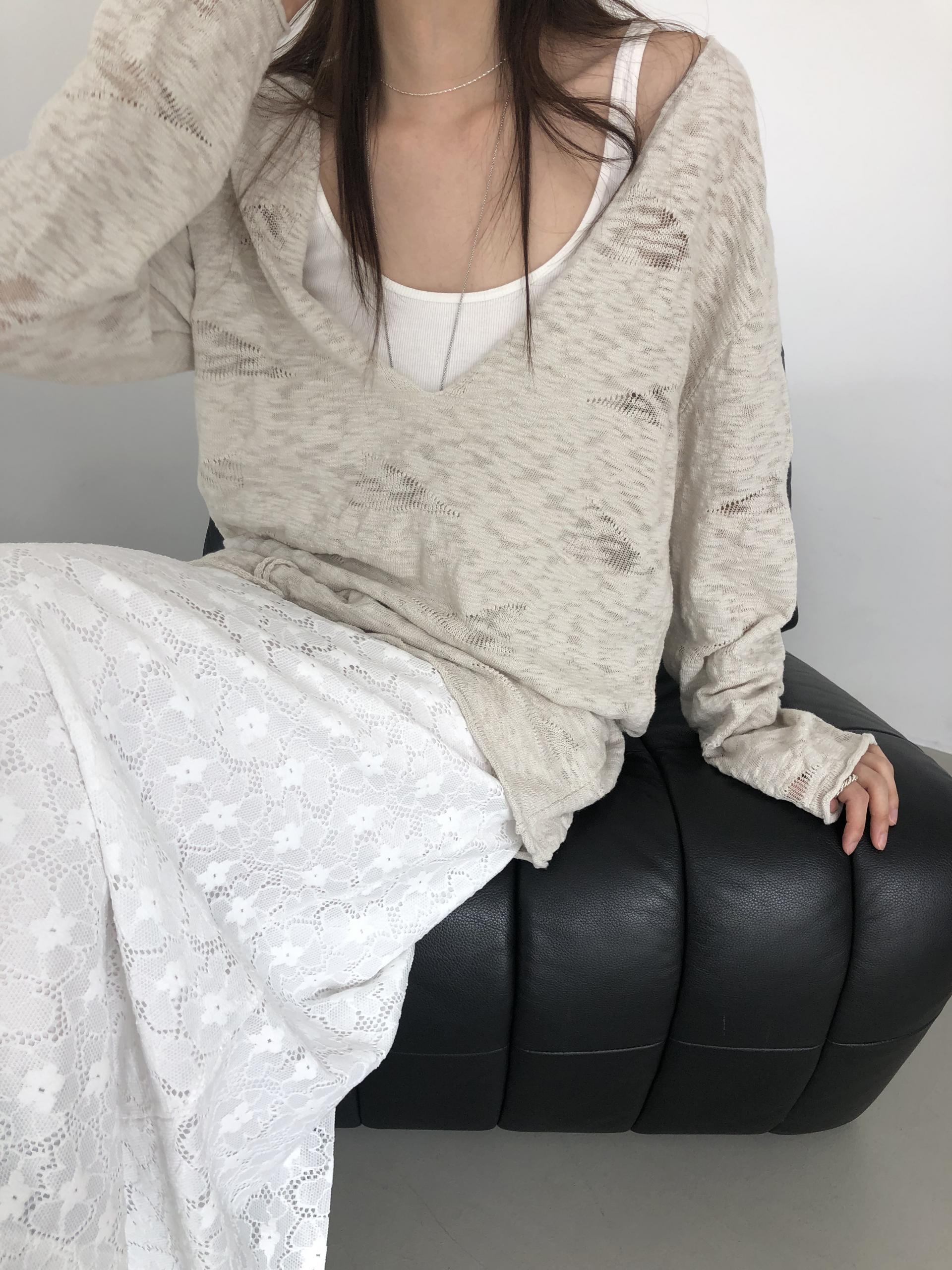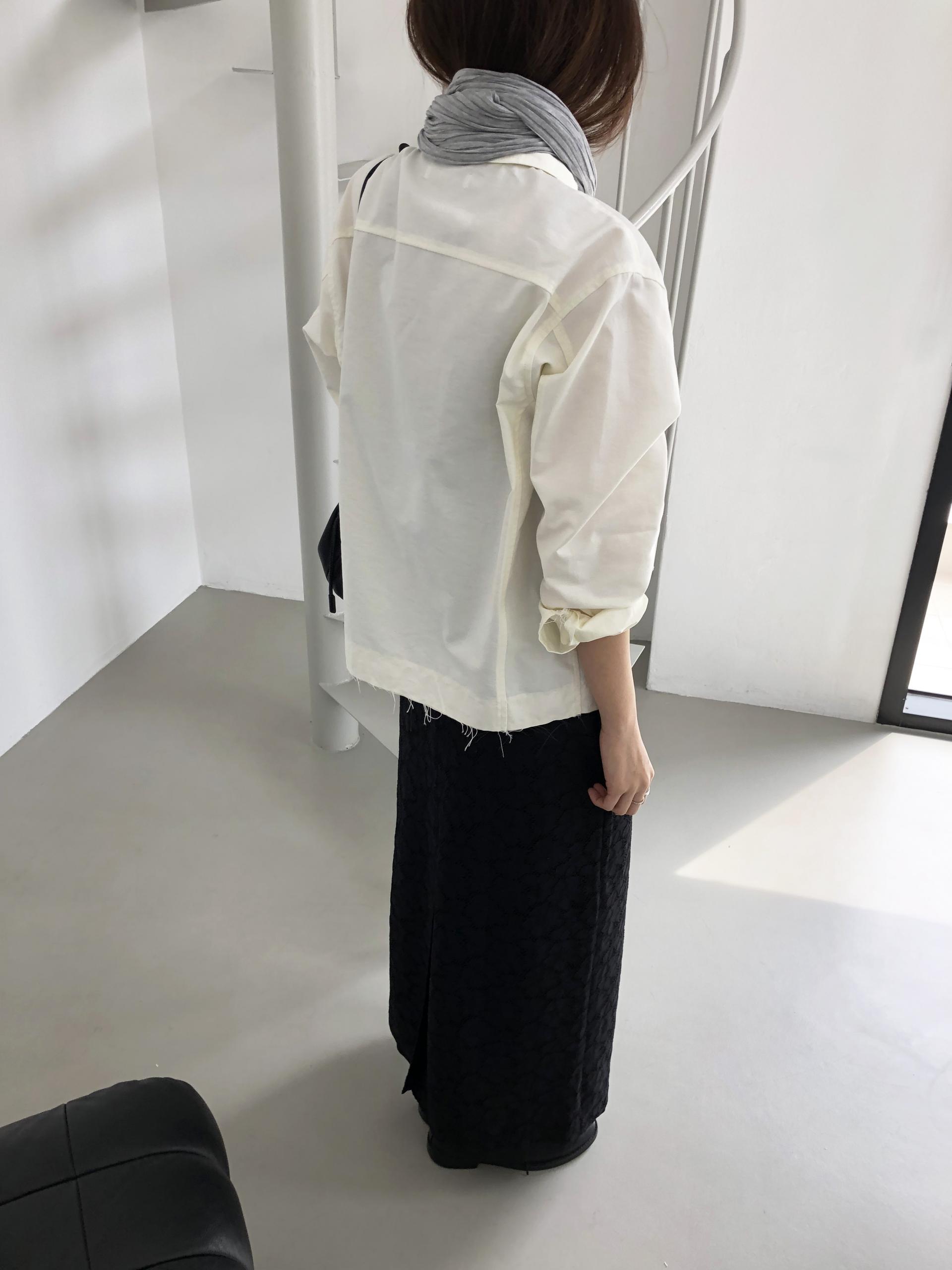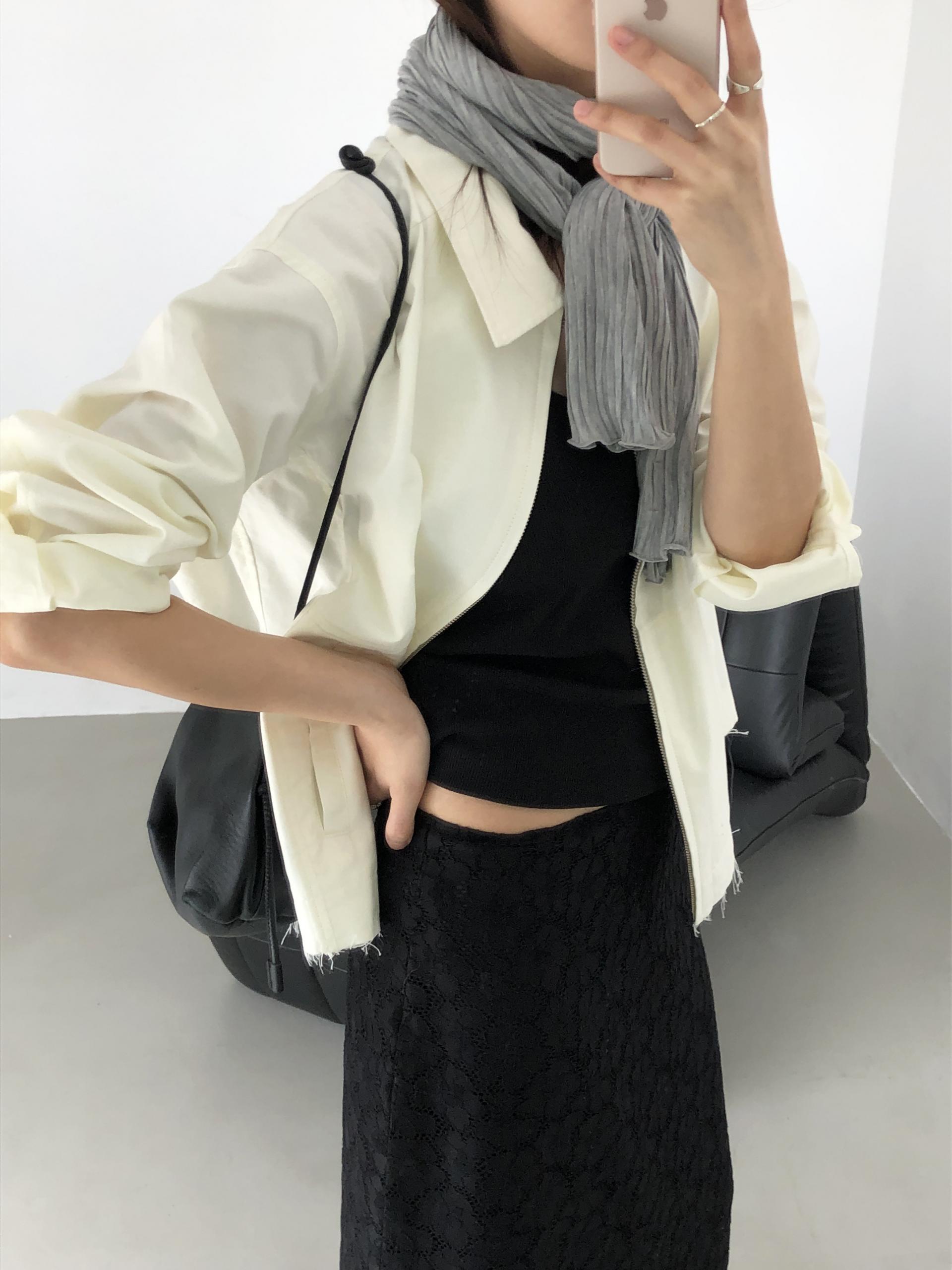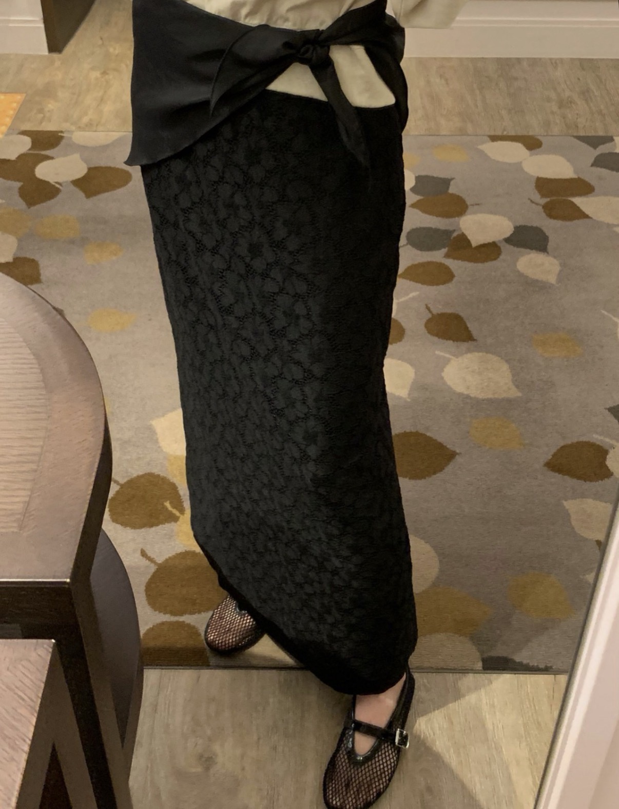 맥시한 기장에 여유로운 핏감으로 깔끔하게 뚝 떨어지는 실루엣을 가졌습니다. 안감이 끝까지 레이어드 되어 밑단 아래로 드러나요. 걸을 때마다 크로셰 사이로 안감이 은은하게 비칩니다. 안감이 끝까지 더해졌을 뿐인데 훨씬 김이감이 있는 무드를 느낄 수 있어요.