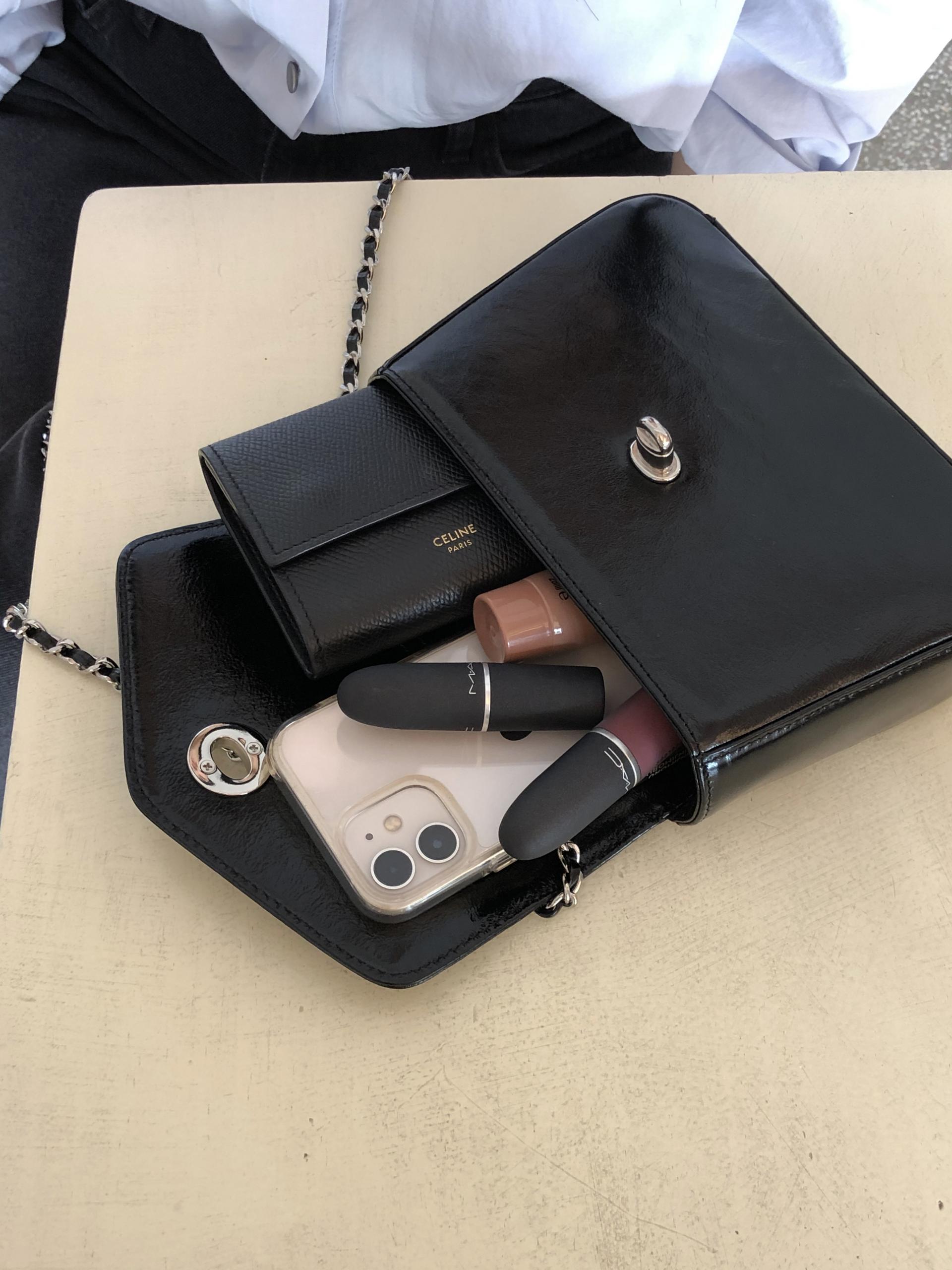 가방 안에는 지퍼로 여닫을 수 있는 이너 포켓이 있으며 지갑과 핸드폰, 간단한 소지품은 가뿐히 들어가는 사이즈입니다 :)