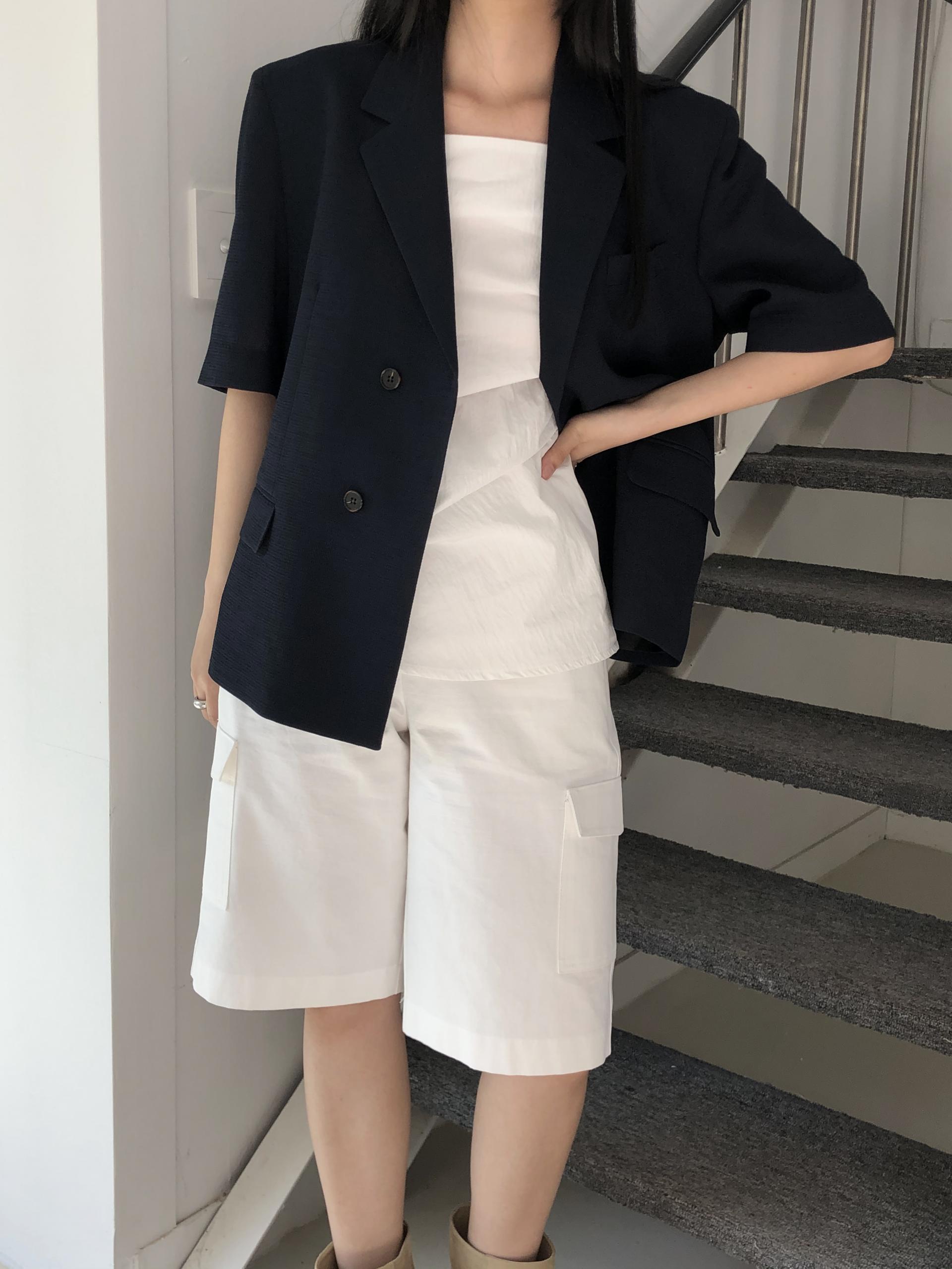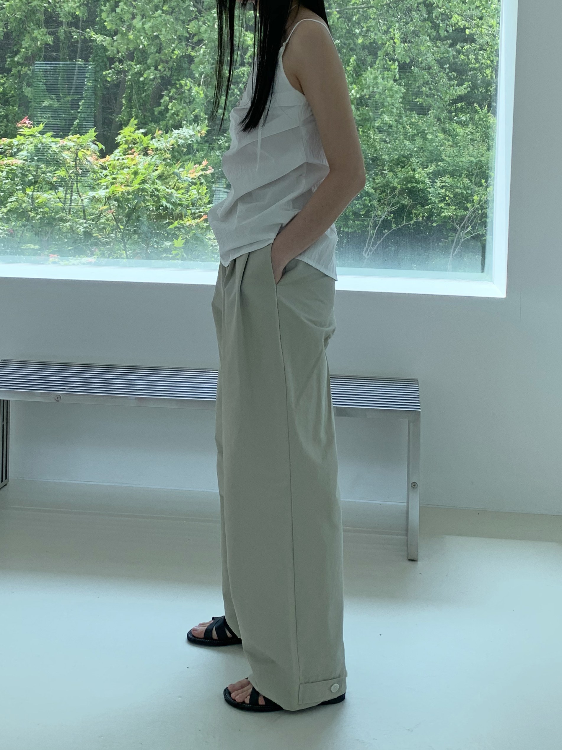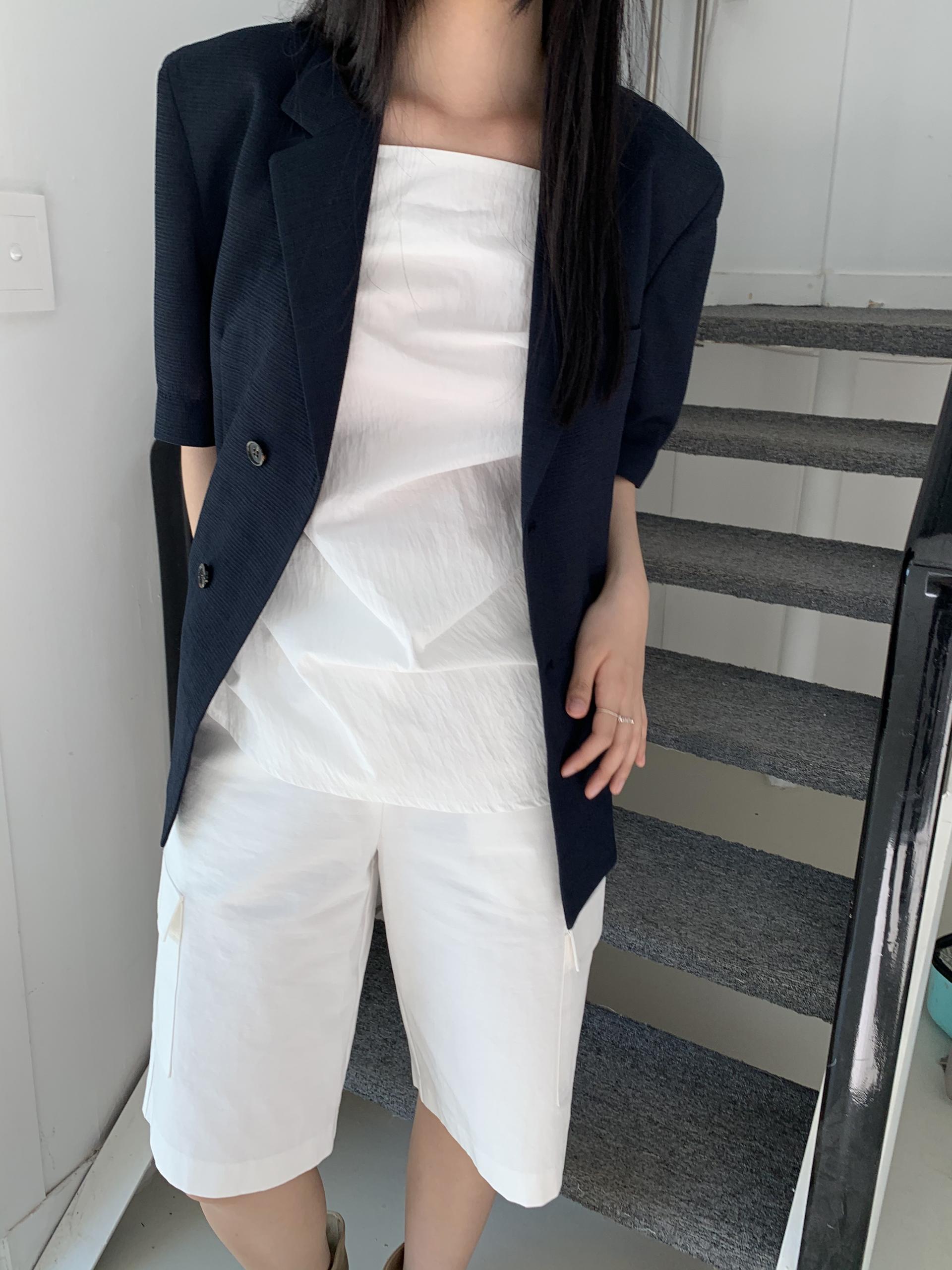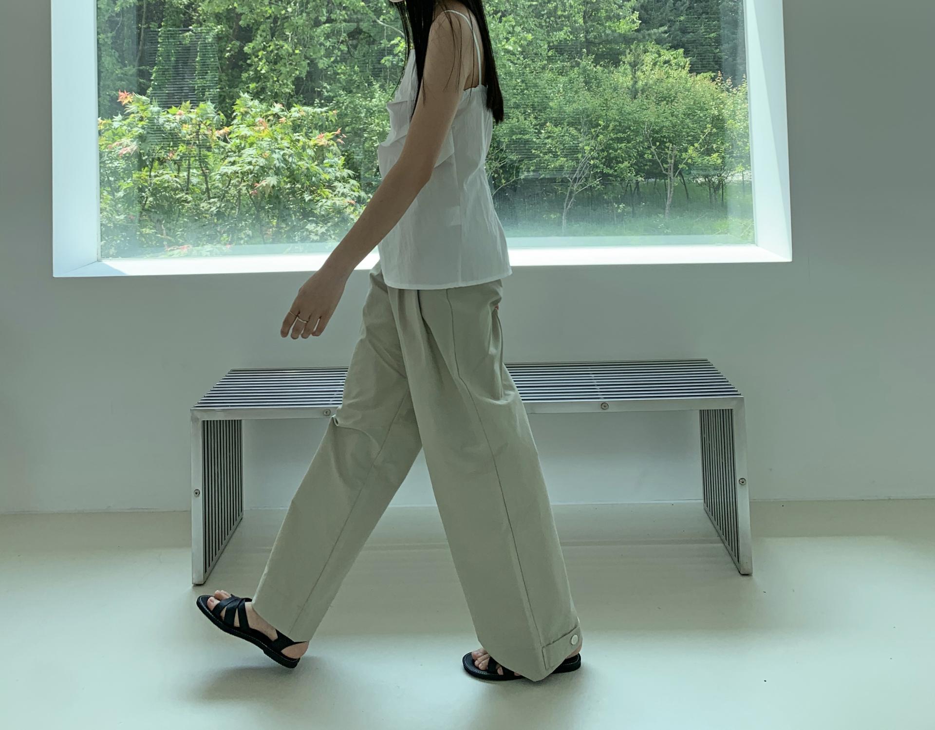 옆선을 따라 사선으로 크게 잡힌 핀턱이 유니크한 분위기를 자아내어 탑 하나만으로 포인트를 줄 수 있어요.