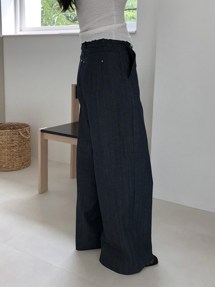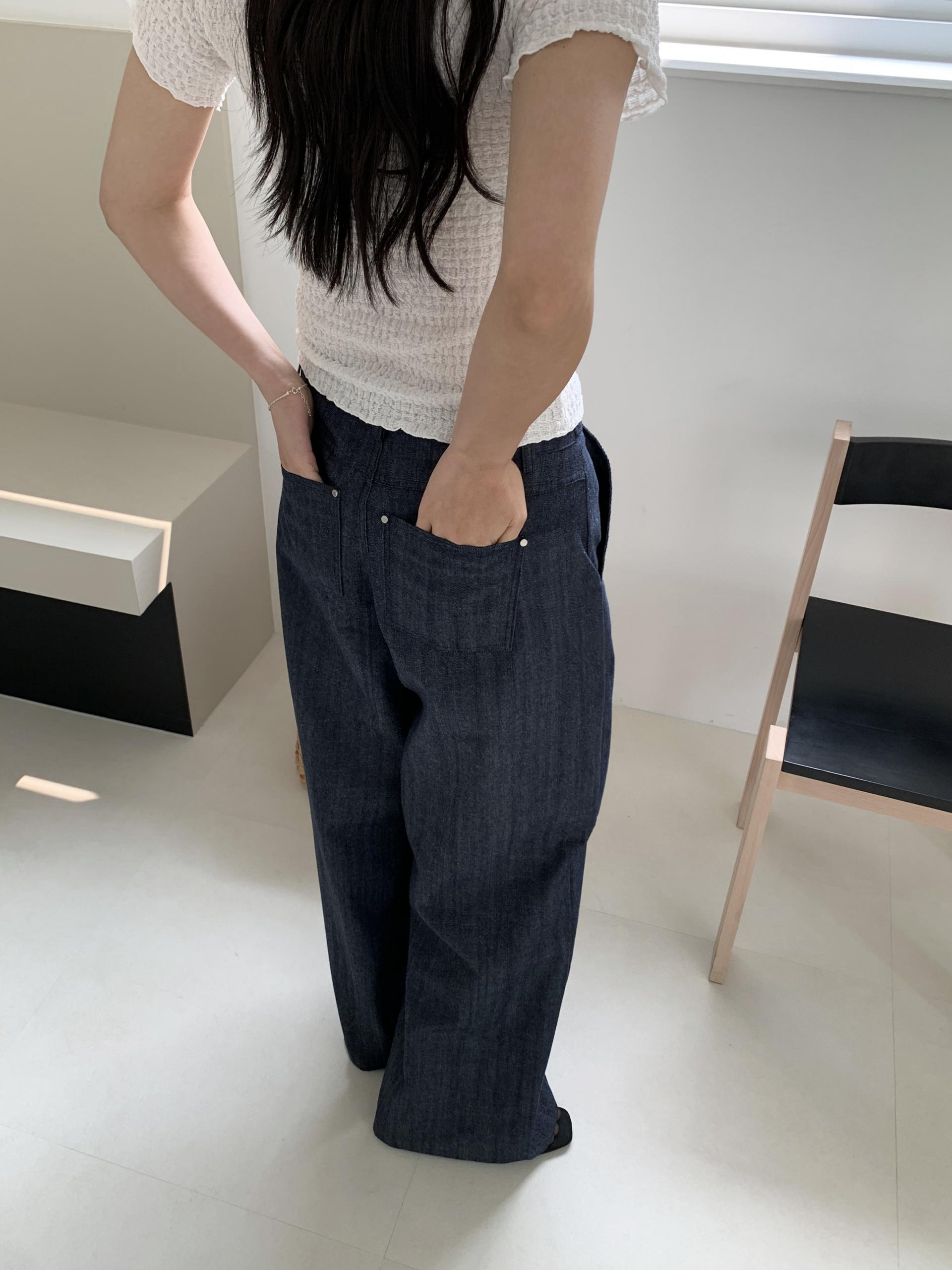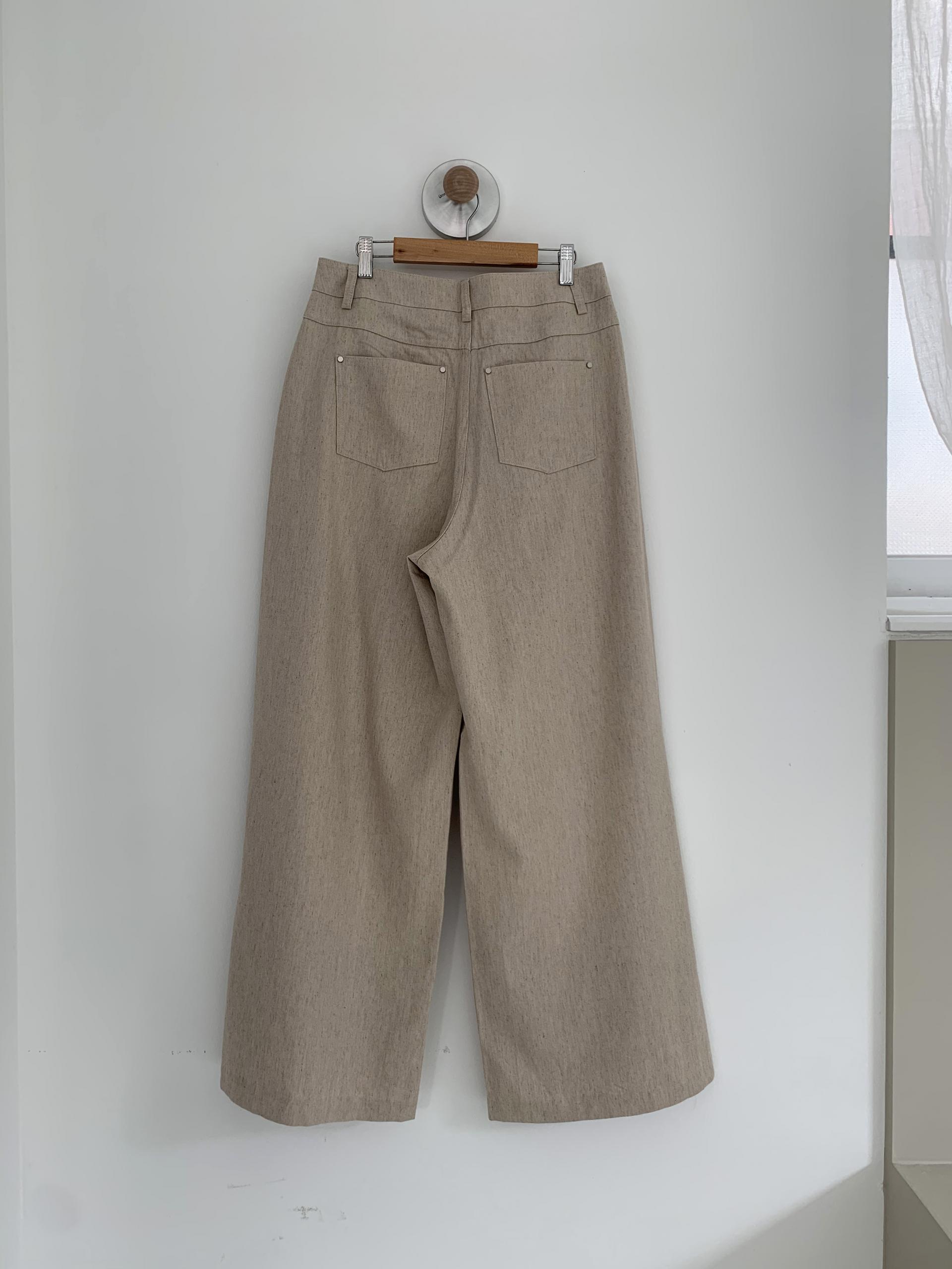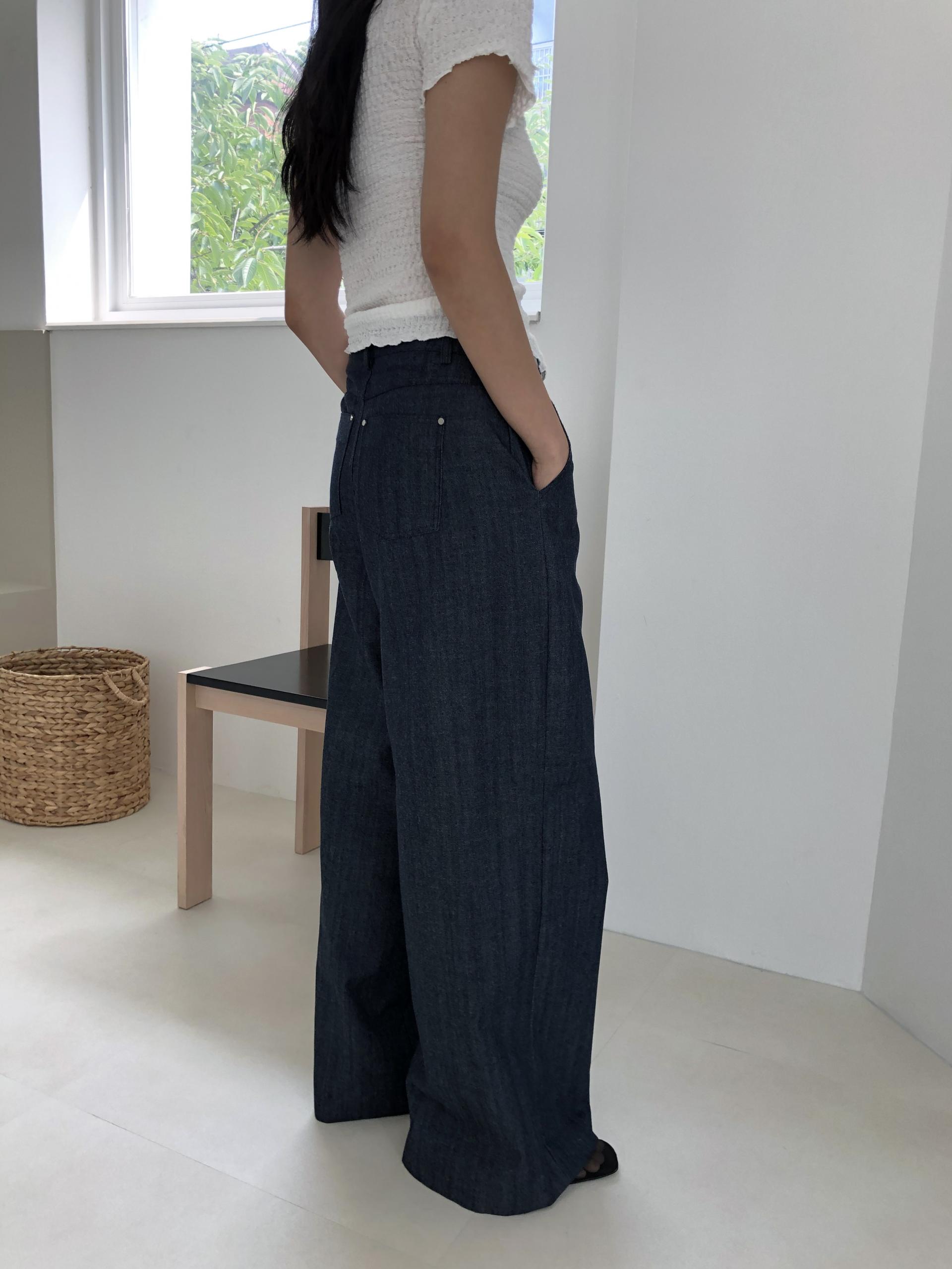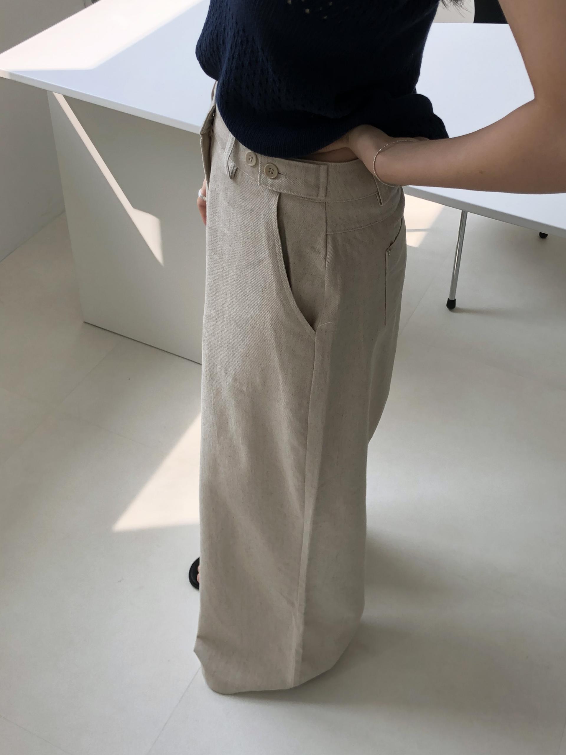 허리에 비죠 디테일이 있어 어느정도 사이즈 조절이 가능합니다. 허리는 깔끔하게 잡아주고, 와이드하게 떨어지는 실루엣이에요. 옆 라인이 특히나 더 예쁜 팬츠입니다. 하체 체형 커버에 탁월한 제품이라 꼭! 추천드리고 싶어요 :)