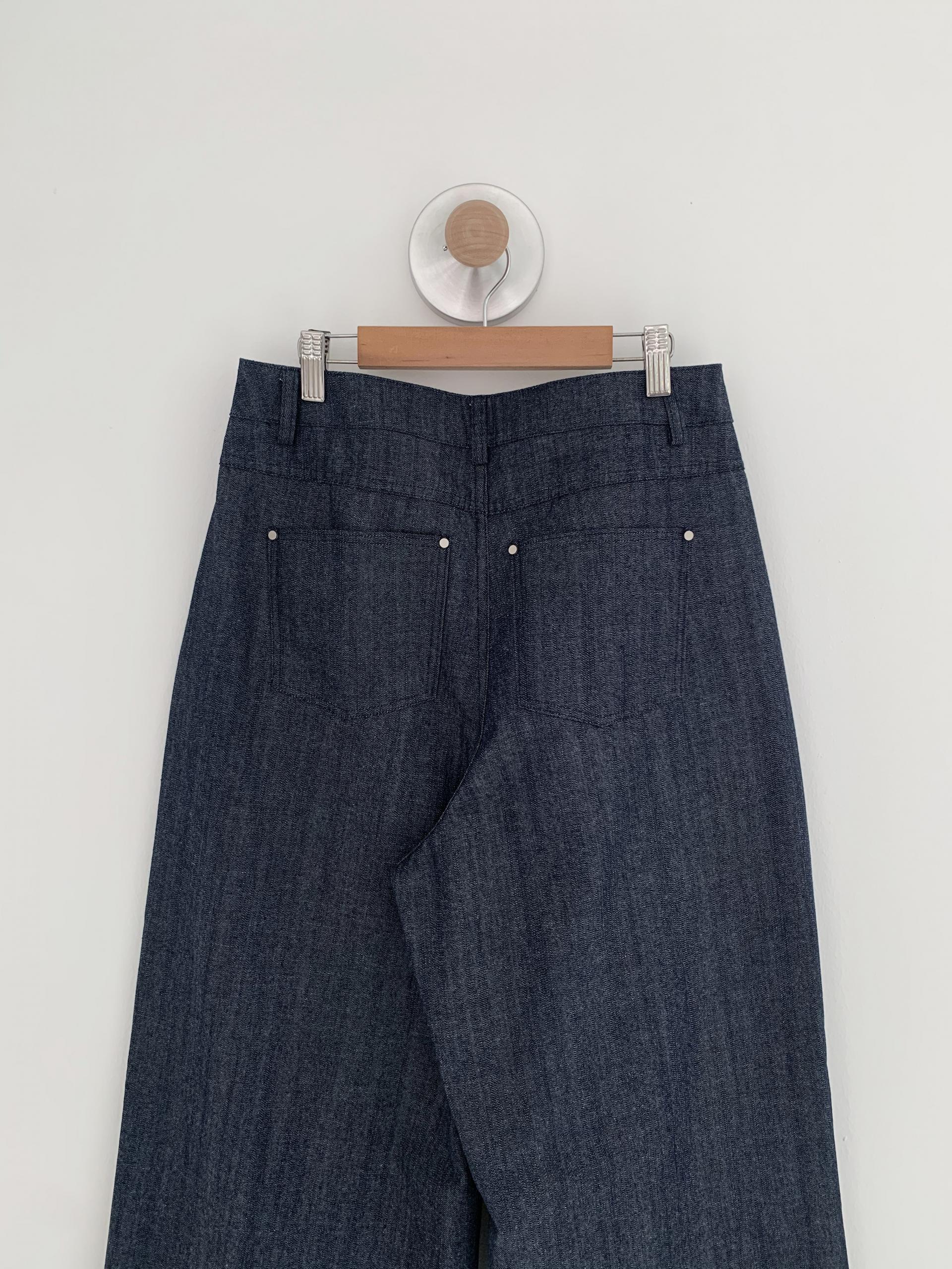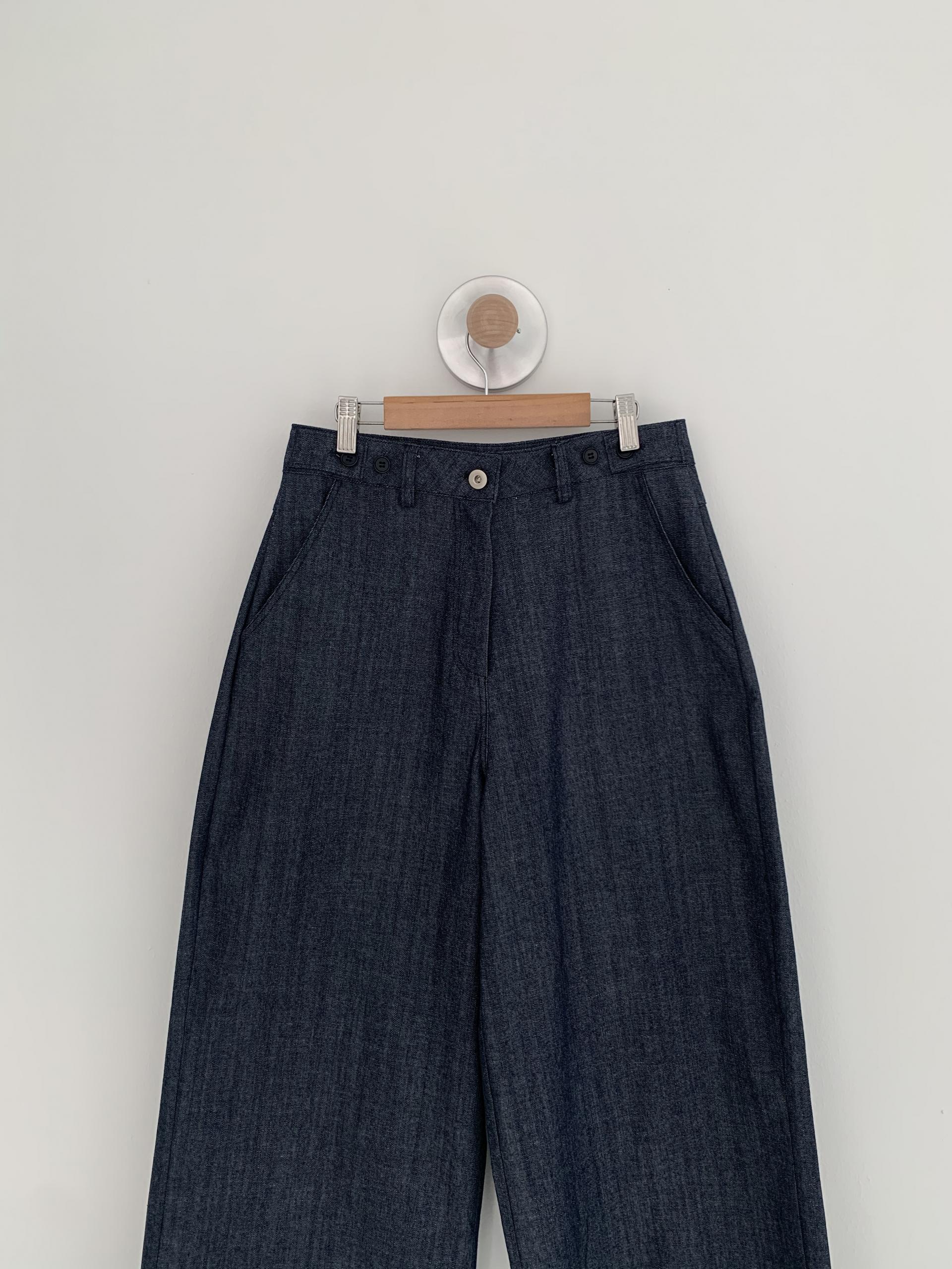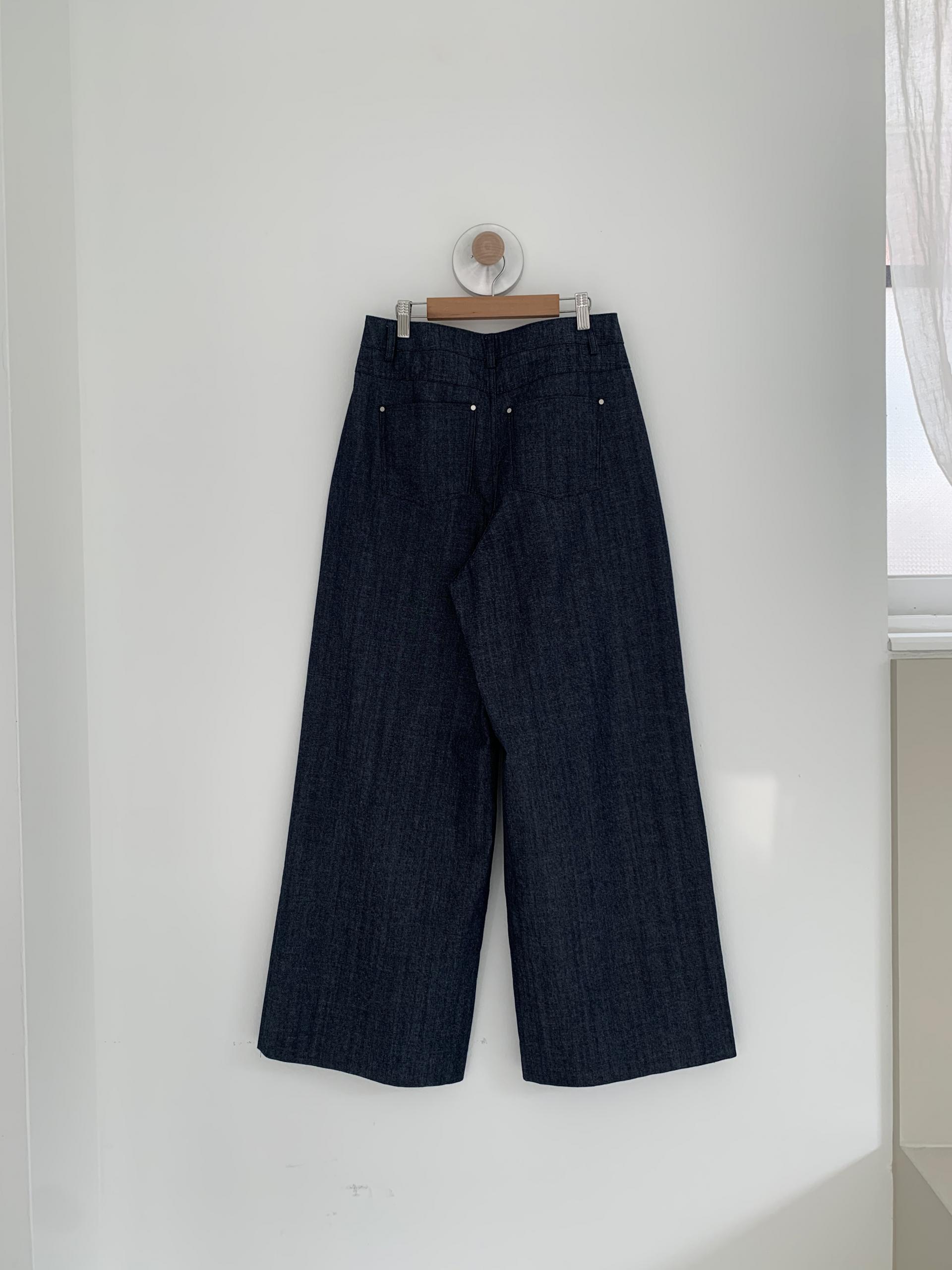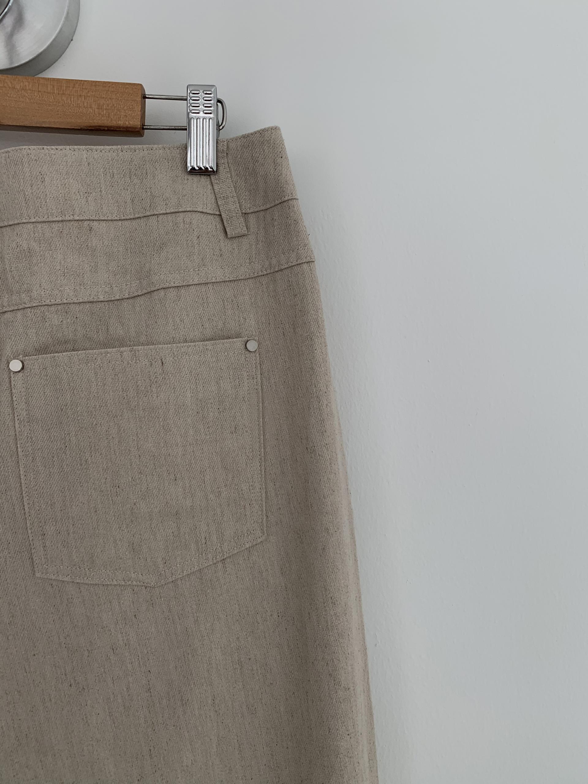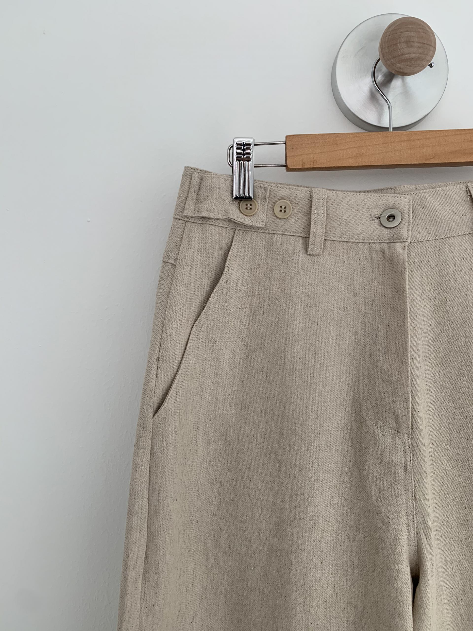 허리에 비죠 디테일이 있어 어느정도 사이즈 조절이 가능합니다. 허리는 깔끔하게 잡아주고, 와이드하게 떨어지는 실루엣이에요. 옆 라인이 특히나 더 예쁜 팬츠입니다. 하체 체형 커버에 탁월한 제품이라 꼭! 추천드리고 싶어요 :)