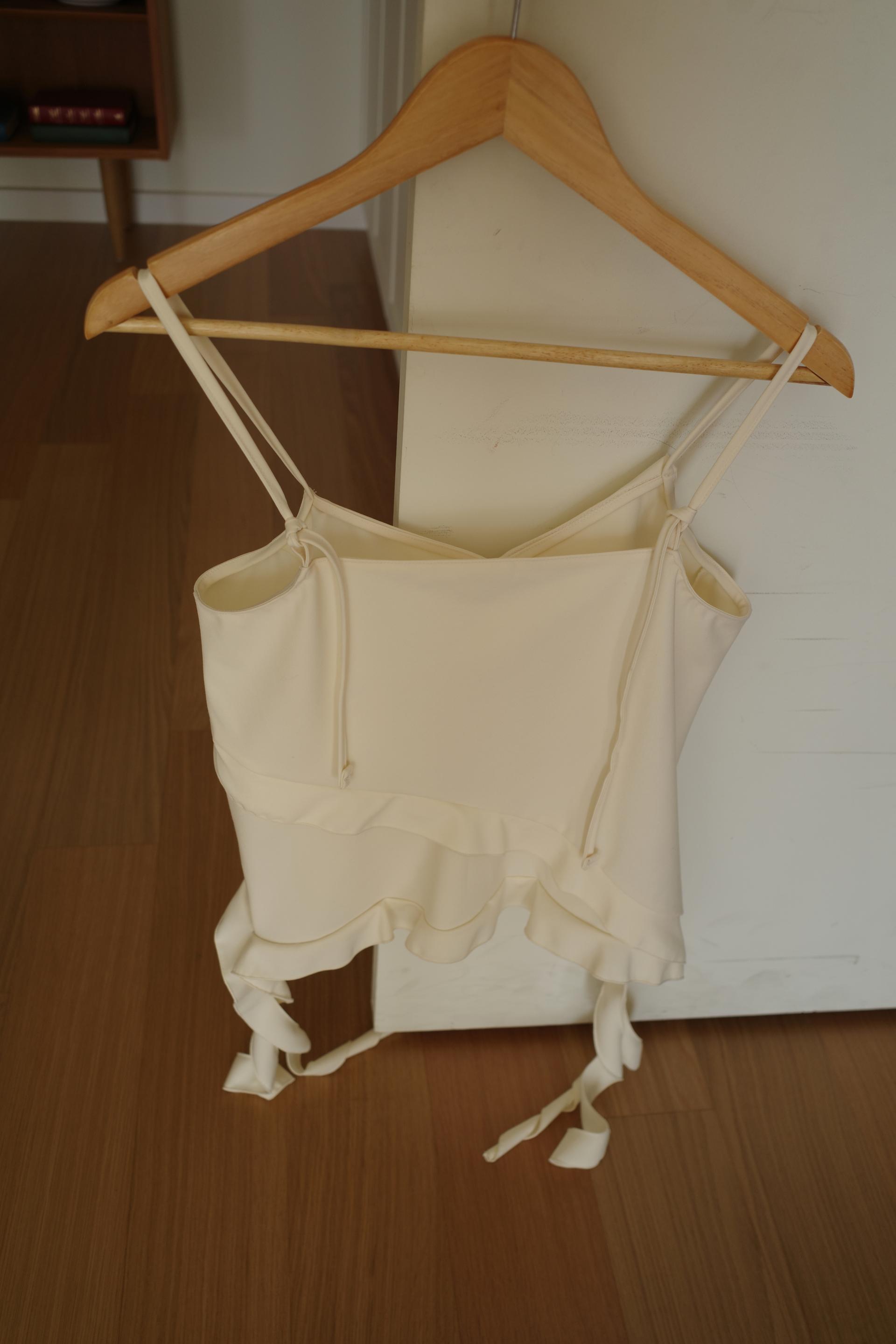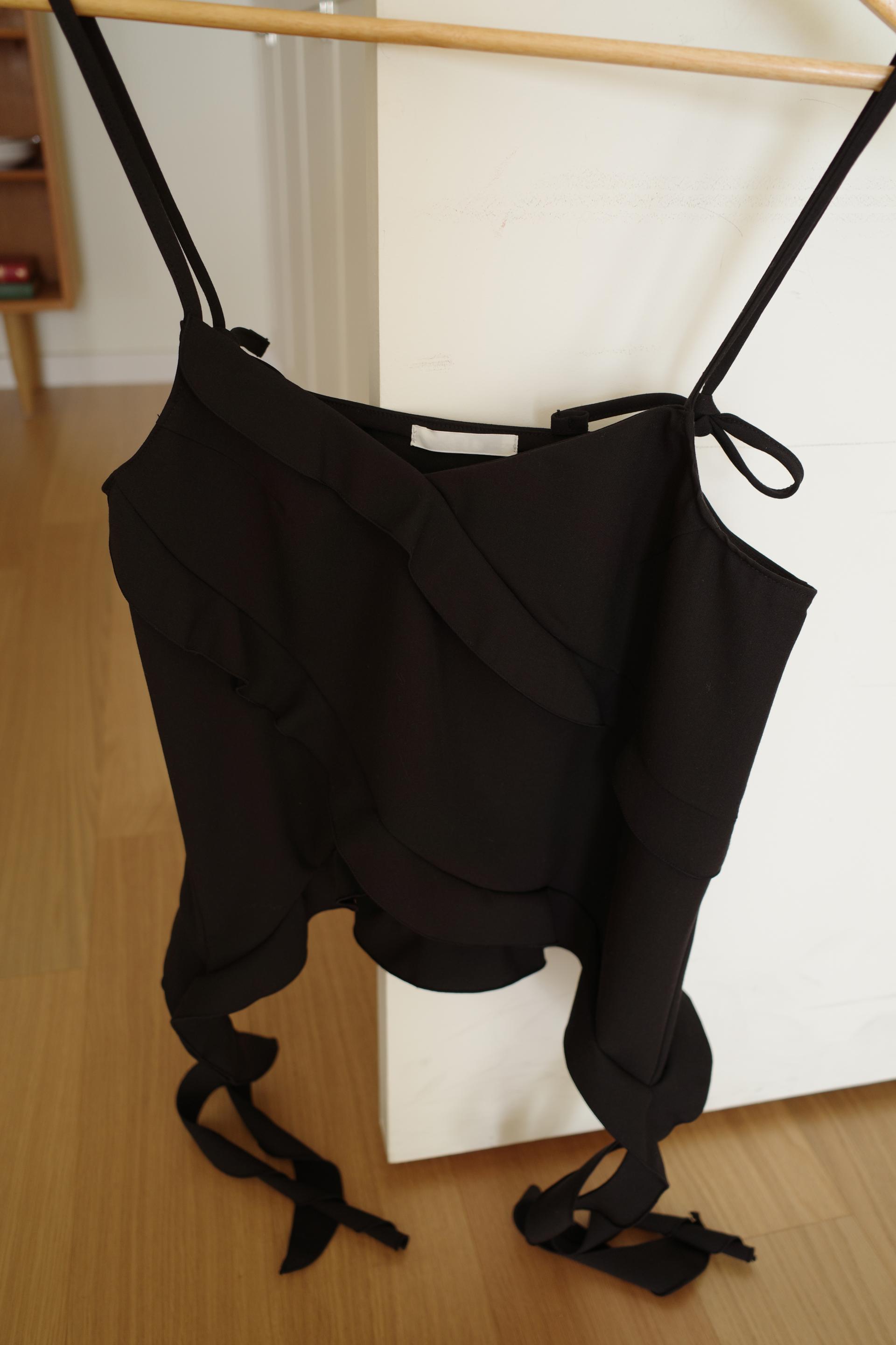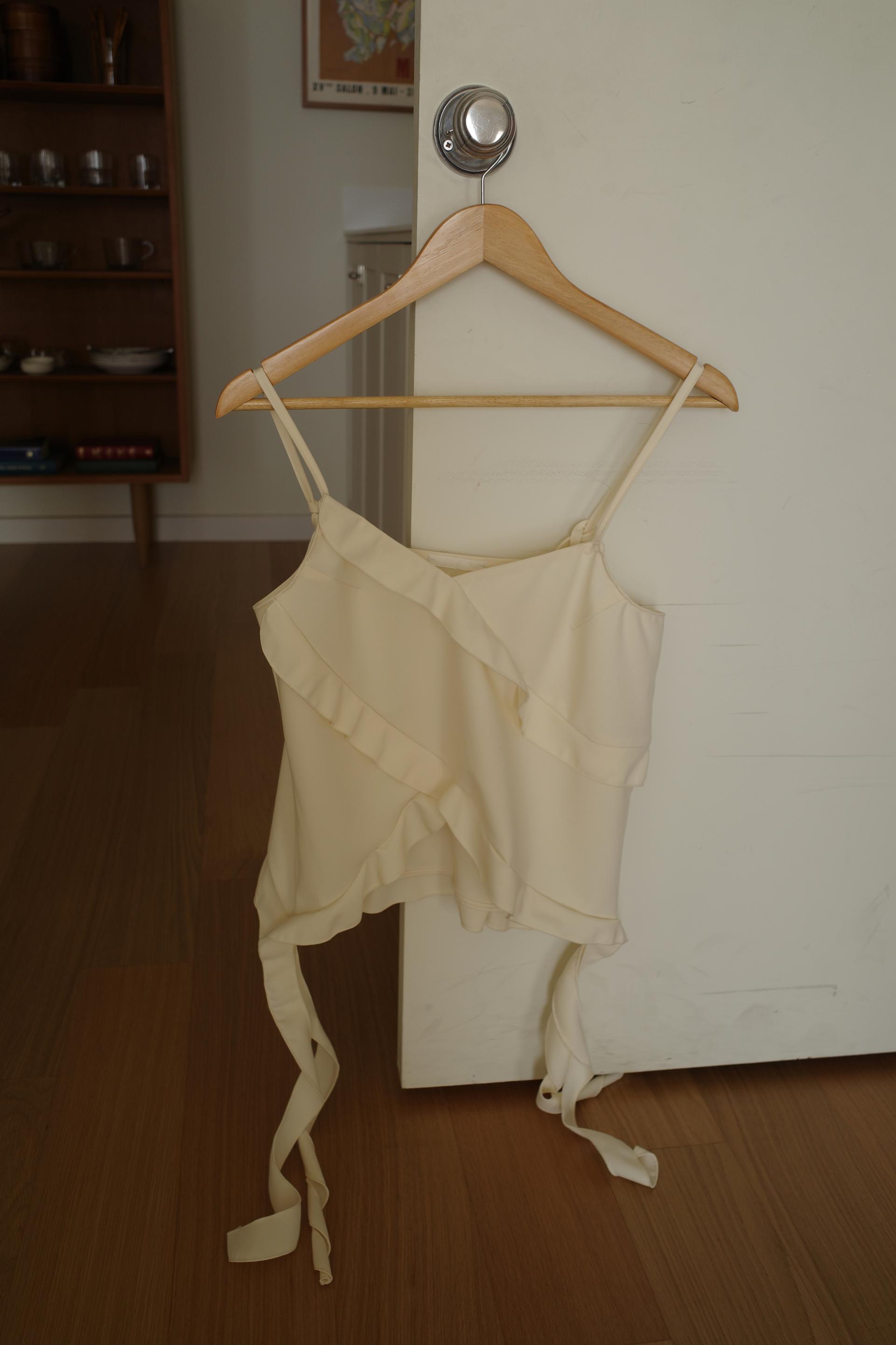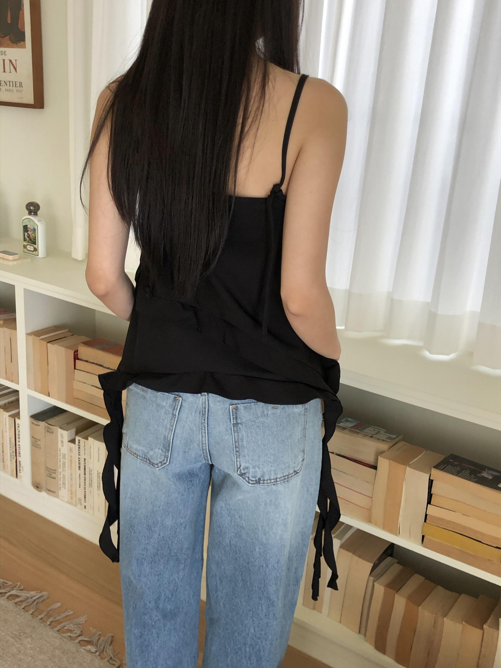 웨이브 헤어처럼 롤링 되어 있는 사이드의 프릴 스트랩이 눈에 띕니다.
