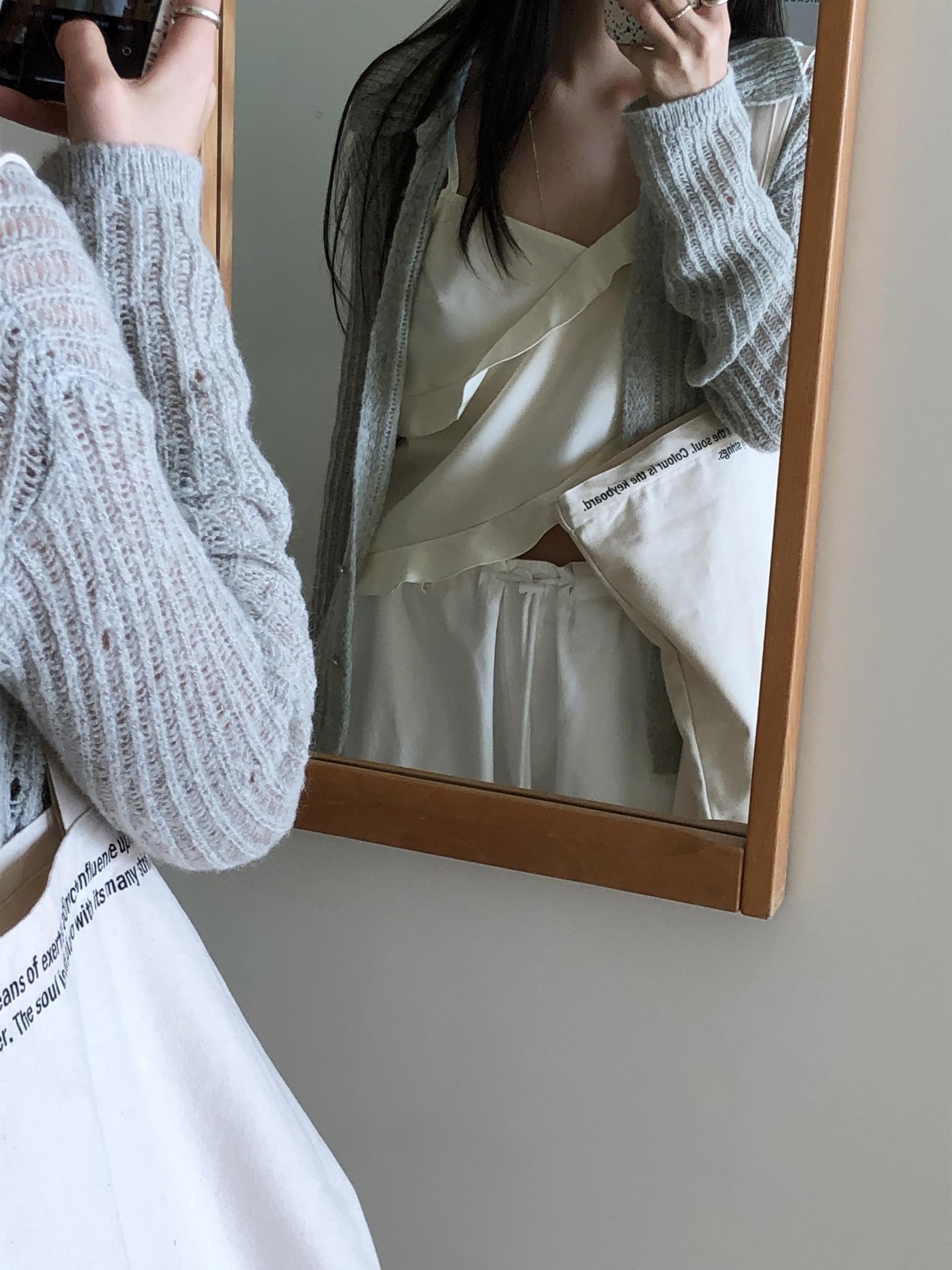 루즈한 핏의 가디건이 베스트로 잘어울렸고, 오버핏의 네트 짜임 브이넥 니트 안에 레이어드도 추천드려봅니다.