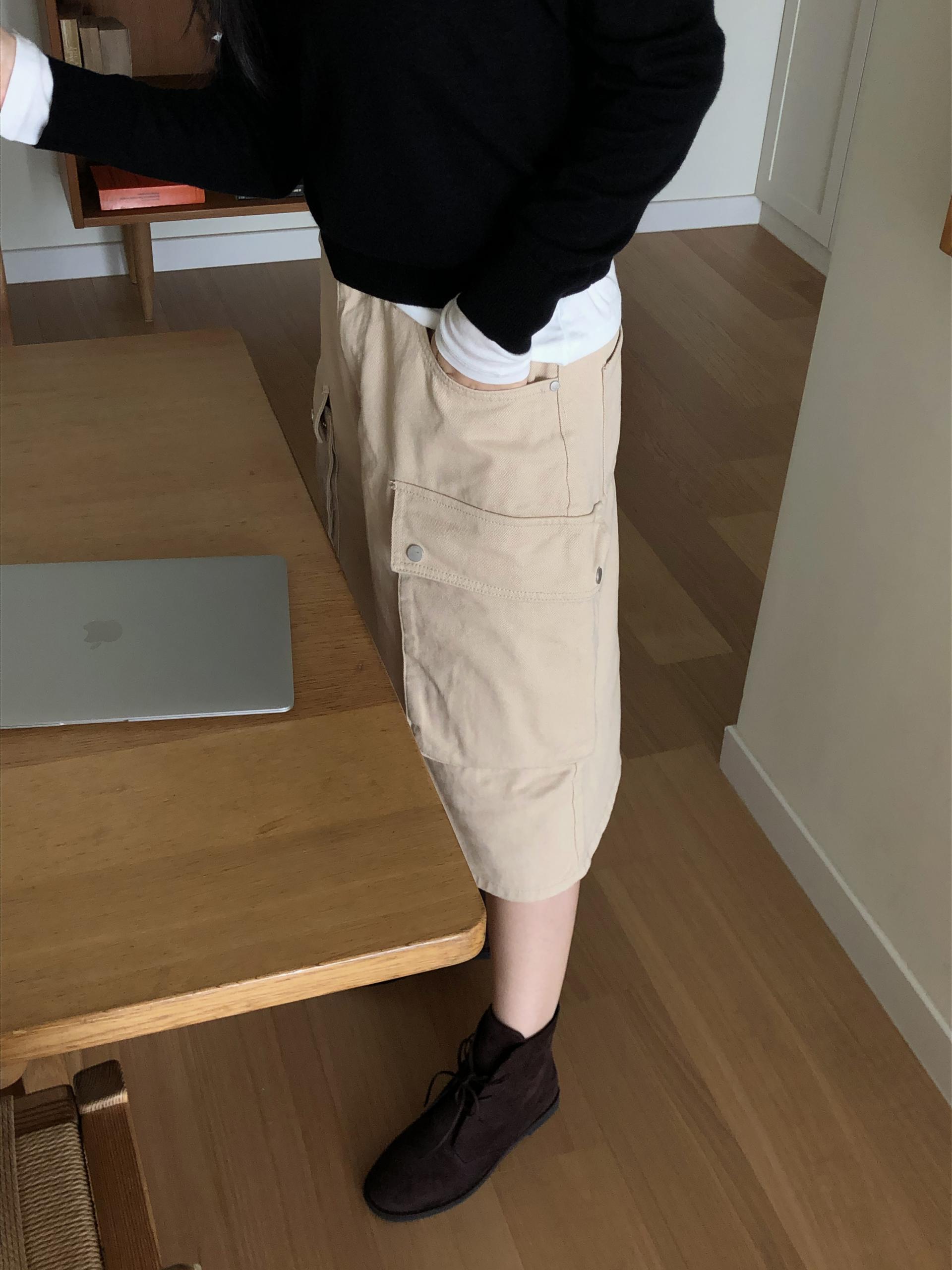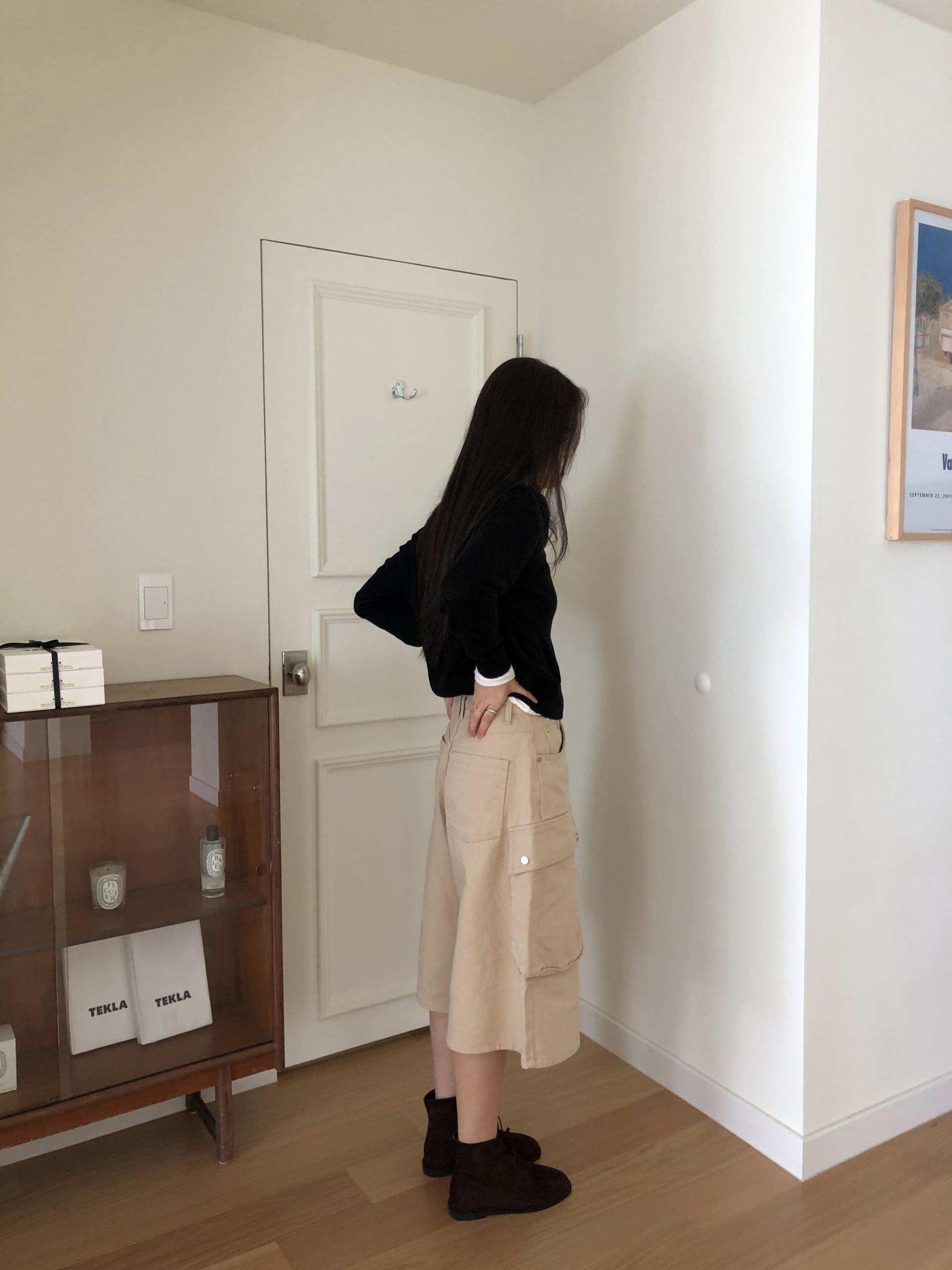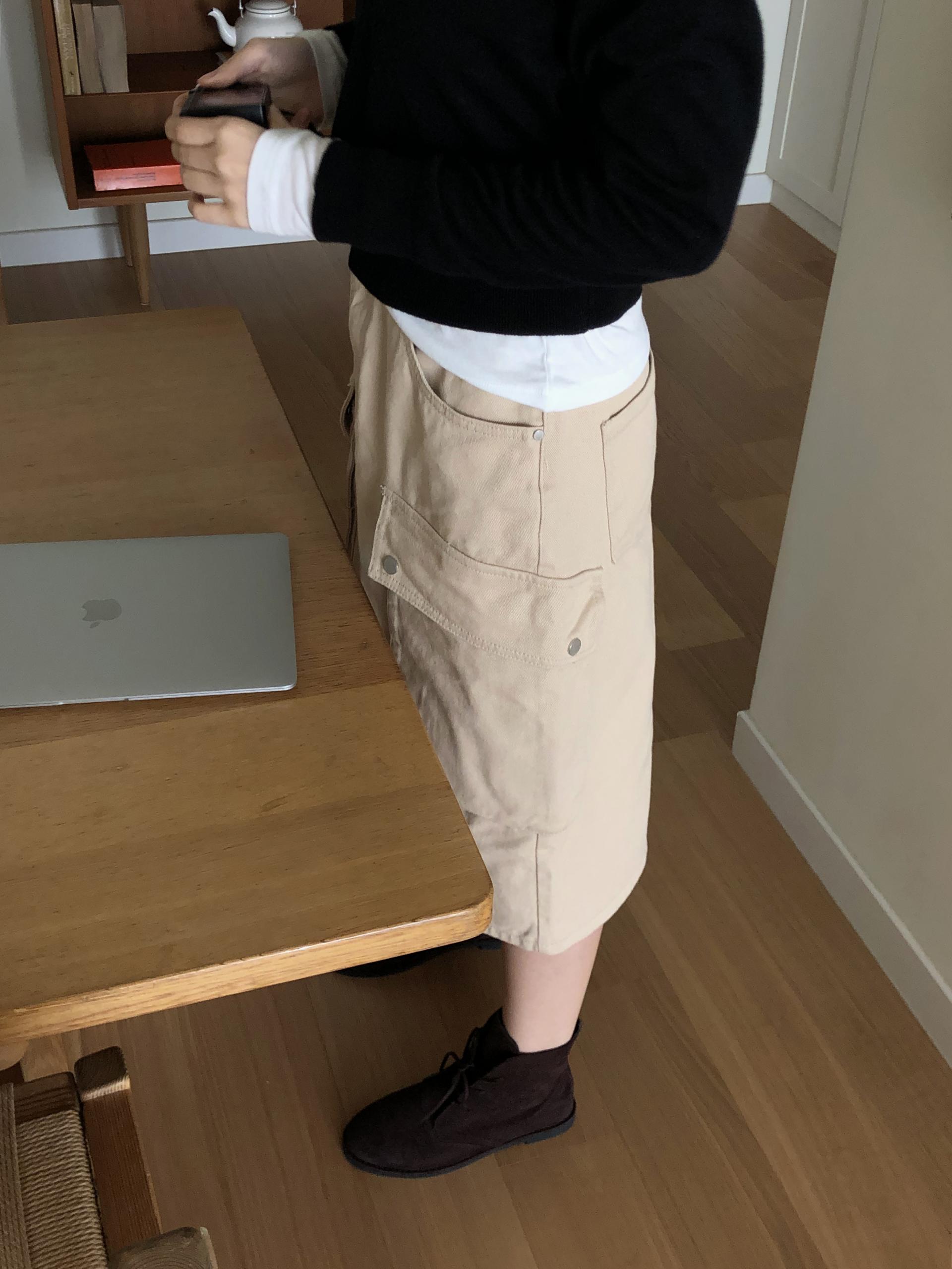 양쪽에 큰 입체 포켓이 자리해 캐주얼하고 귀여운 무드가 느껴집니다. 큐트한 무드를 살려 스트라이프 피케 티셔츠나 후드 아이템과 매치해도 좋고, 저희가 제안하는 코디처럼 차분한 무채색의 상의, 아우터와 함께해도 또다른 매력을 느끼실 수 있어요. 이번에 업데이트 된 트위드 자켓 또는 새틴 블루종과의 조합 추천드립니다 :)