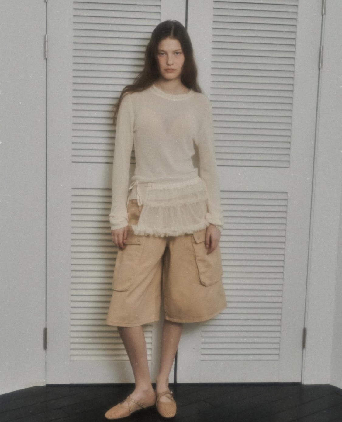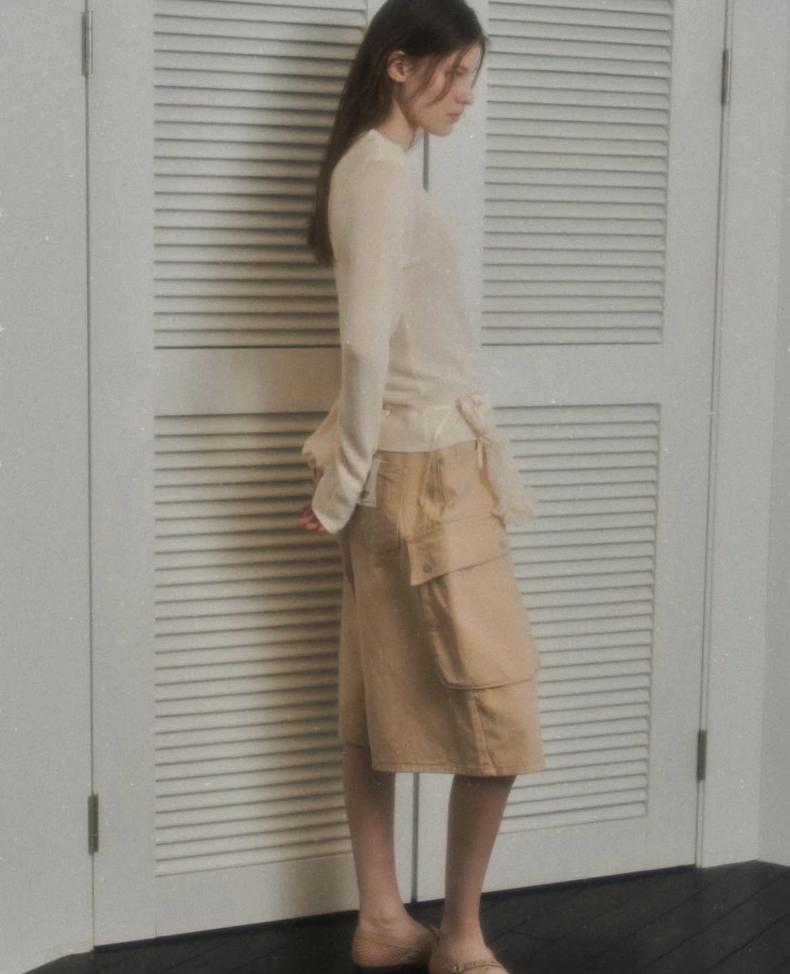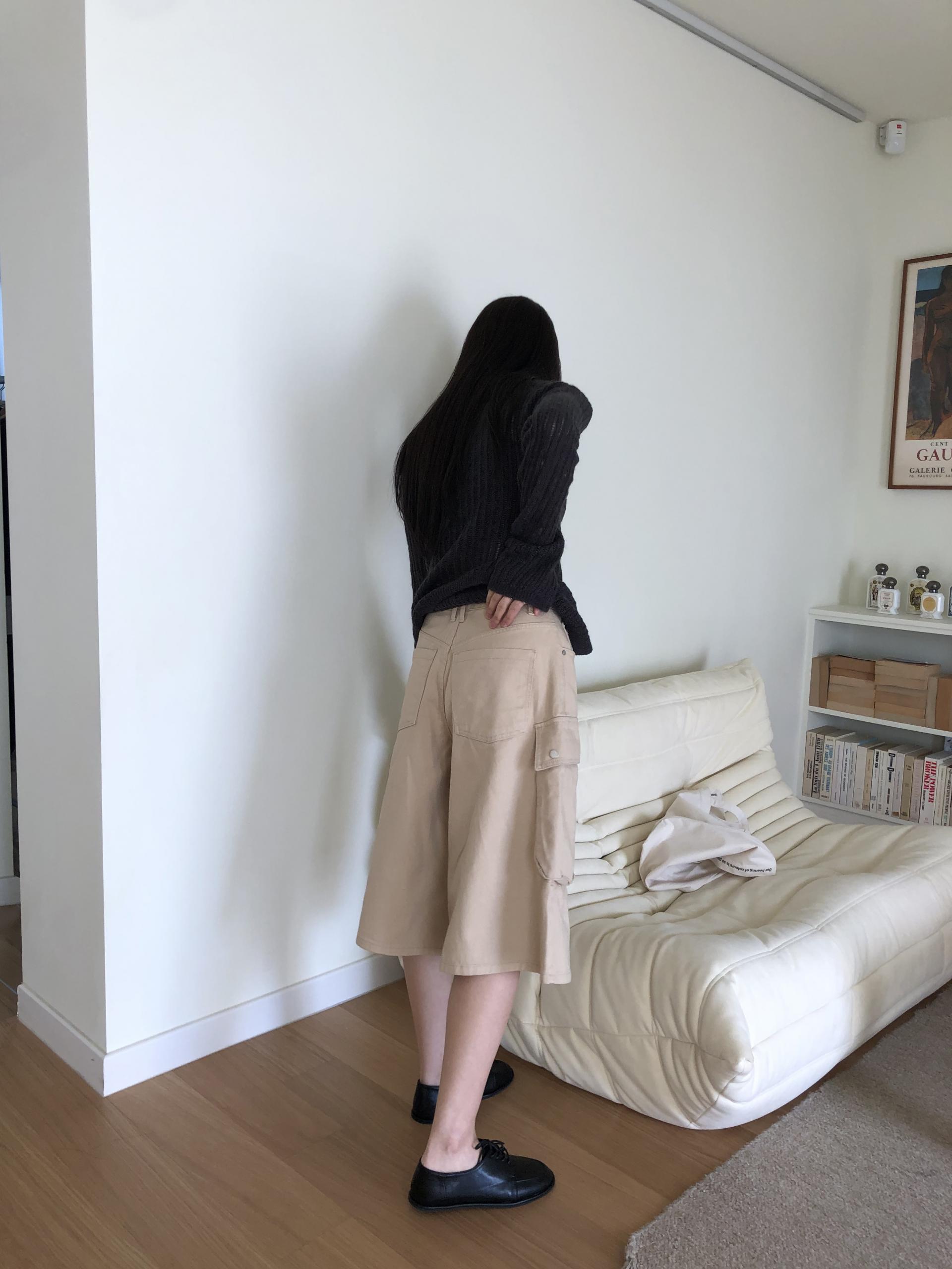 양쪽에 큰 입체 포켓이 자리해 캐주얼하고 귀여운 무드가 느껴집니다. 큐트한 무드를 살려 스트라이프 피케 티셔츠나 후드 아이템과 매치해도 좋고, 저희가 제안하는 코디처럼 차분한 무채색의 상의, 아우터와 함께해도 또다른 매력을 느끼실 수 있어요. 이번에 업데이트 된 트위드 자켓 또는 새틴 블루종과의 조합 추천드립니다 :)