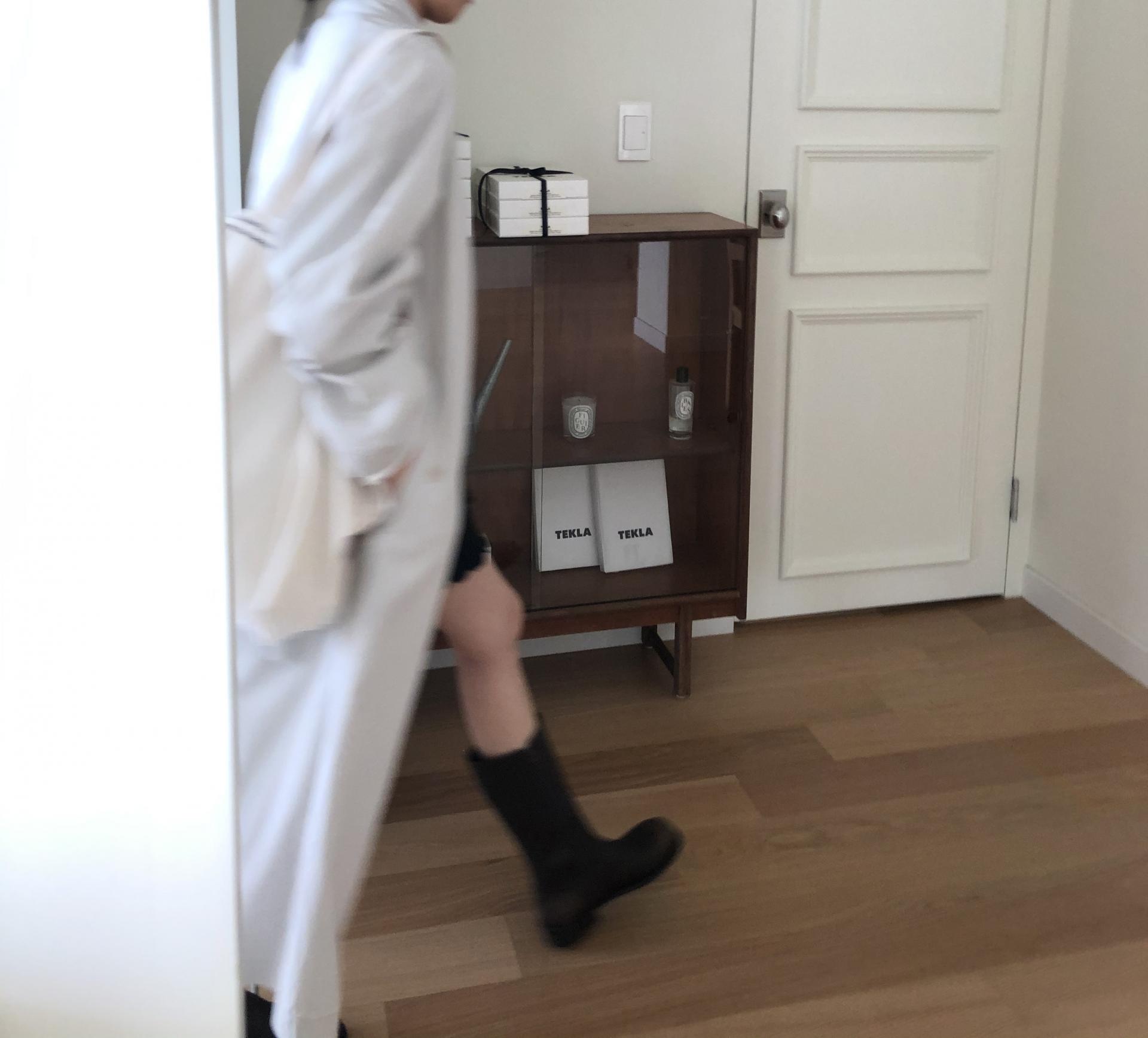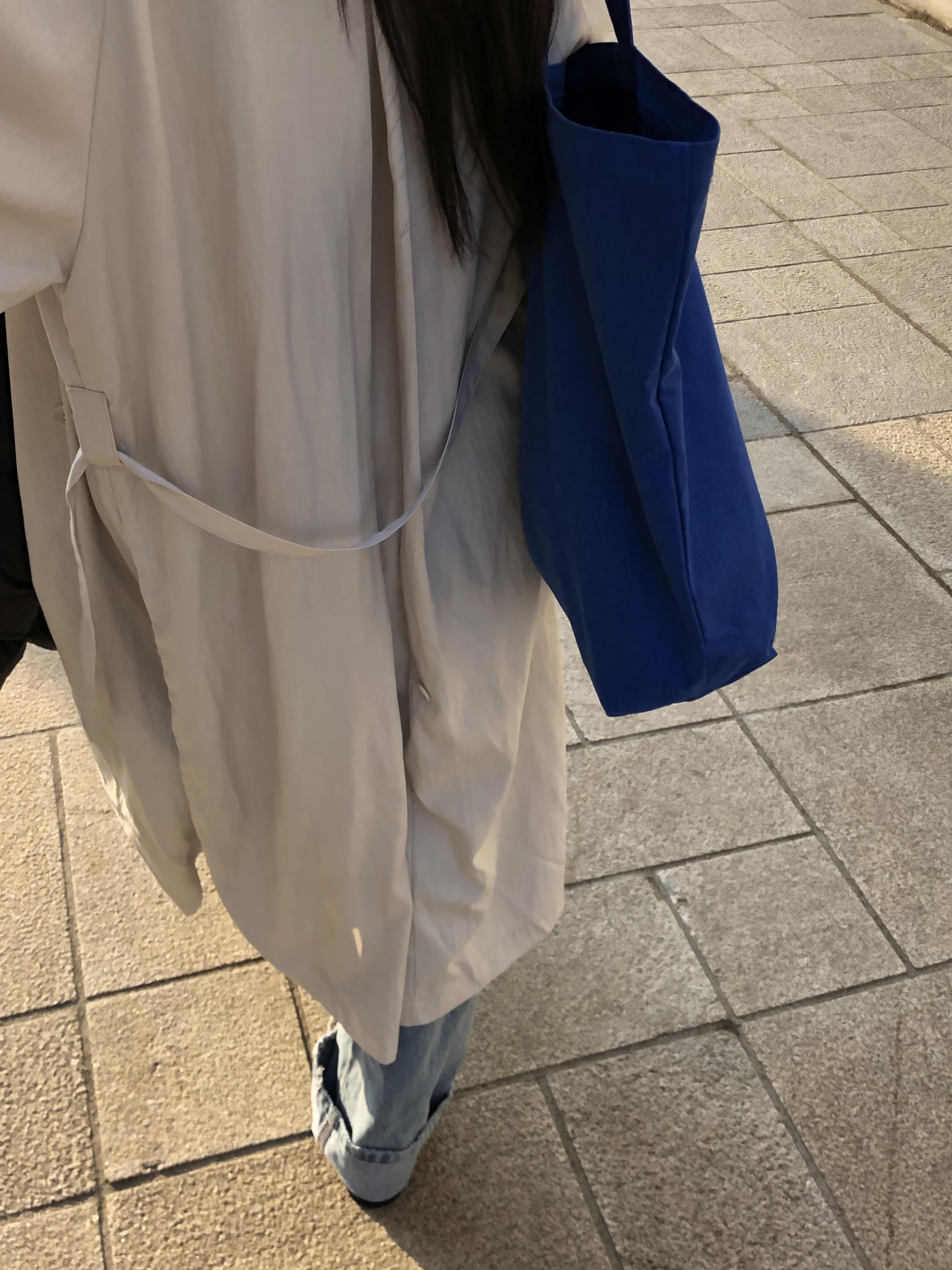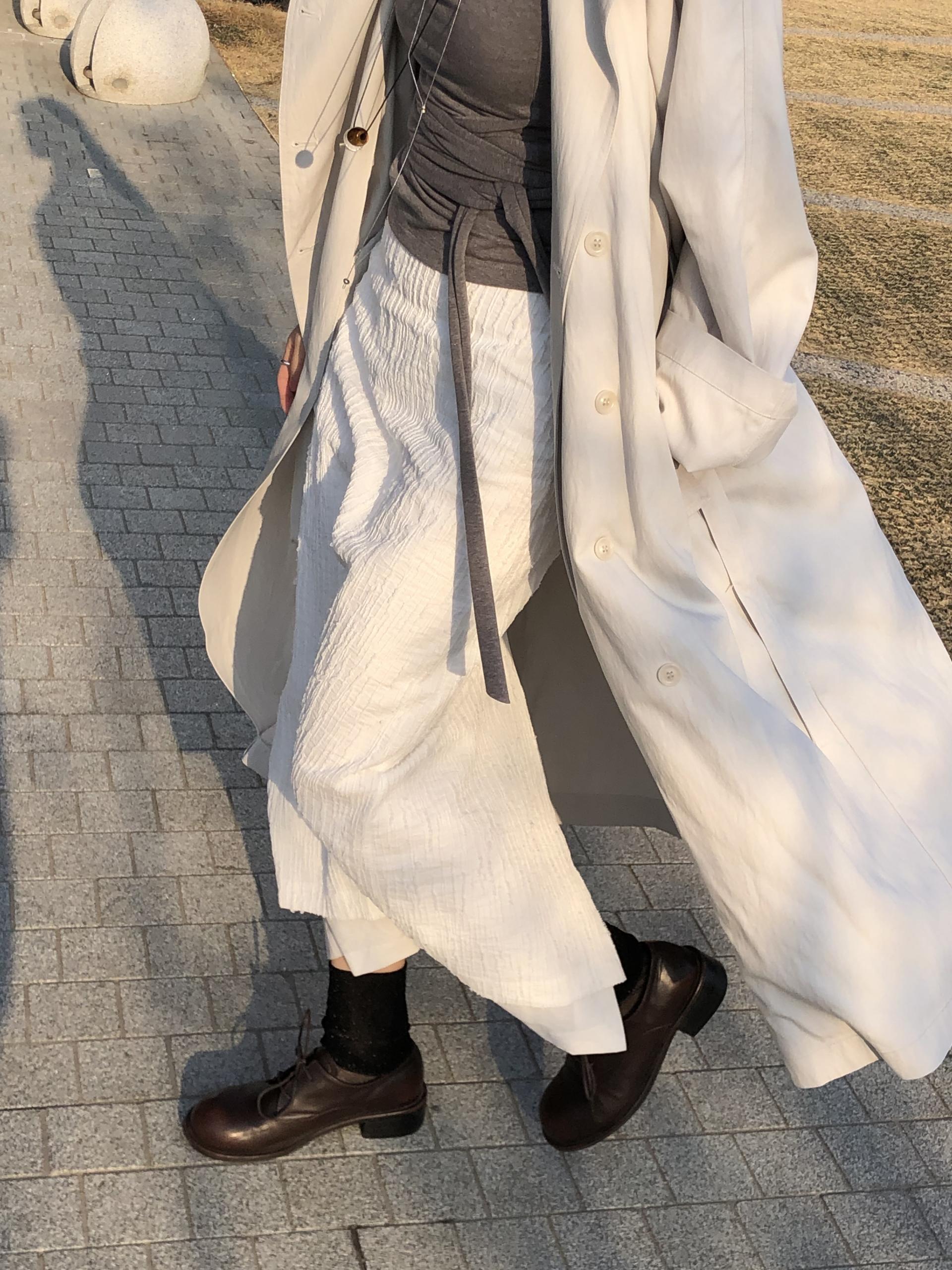 레이온, 나일론 혼방의 차가운 소재를 사용하여 제작되었습니다. 안감 없이 홑겹으로 만들어져 초여름까지도 거뜬할 것 같아요. 터치감이 시원합니다. 두께감도 얇은 편이긴 하지만 생각보다 꽤 탄탄해서 놀랐어요. 핏이 자연스럽고 유연하게 연출되면서도 형태가 쉽게 흐트러지지 않습니다.